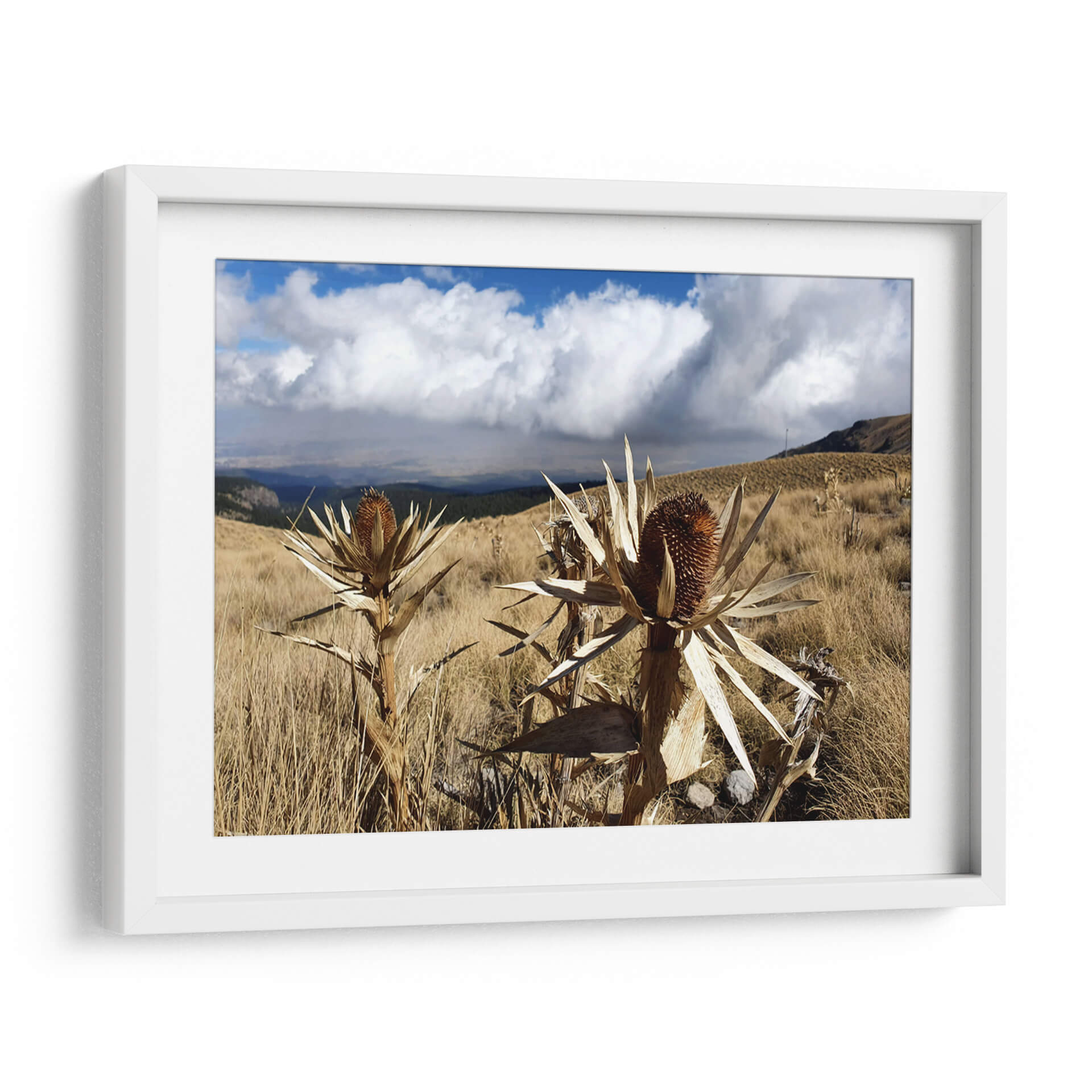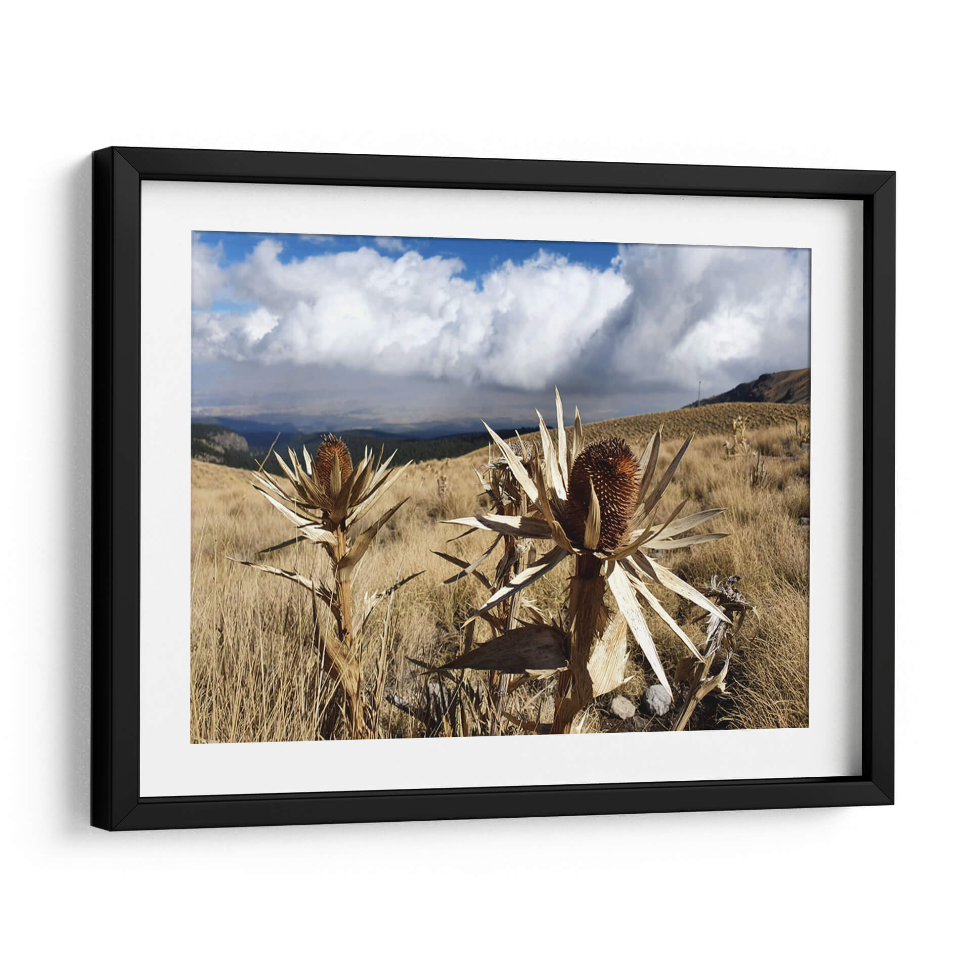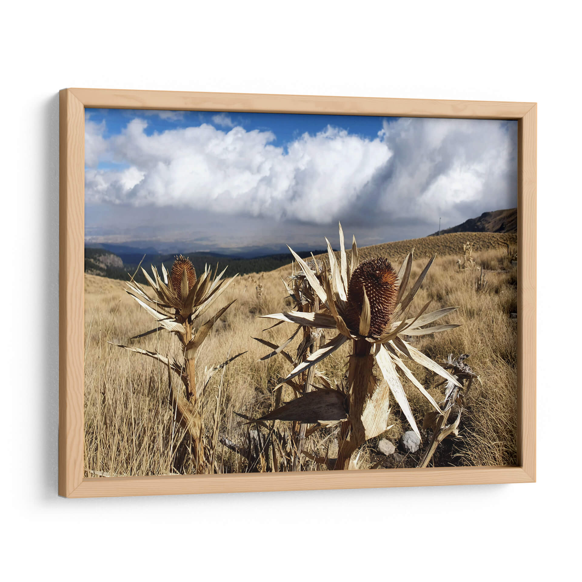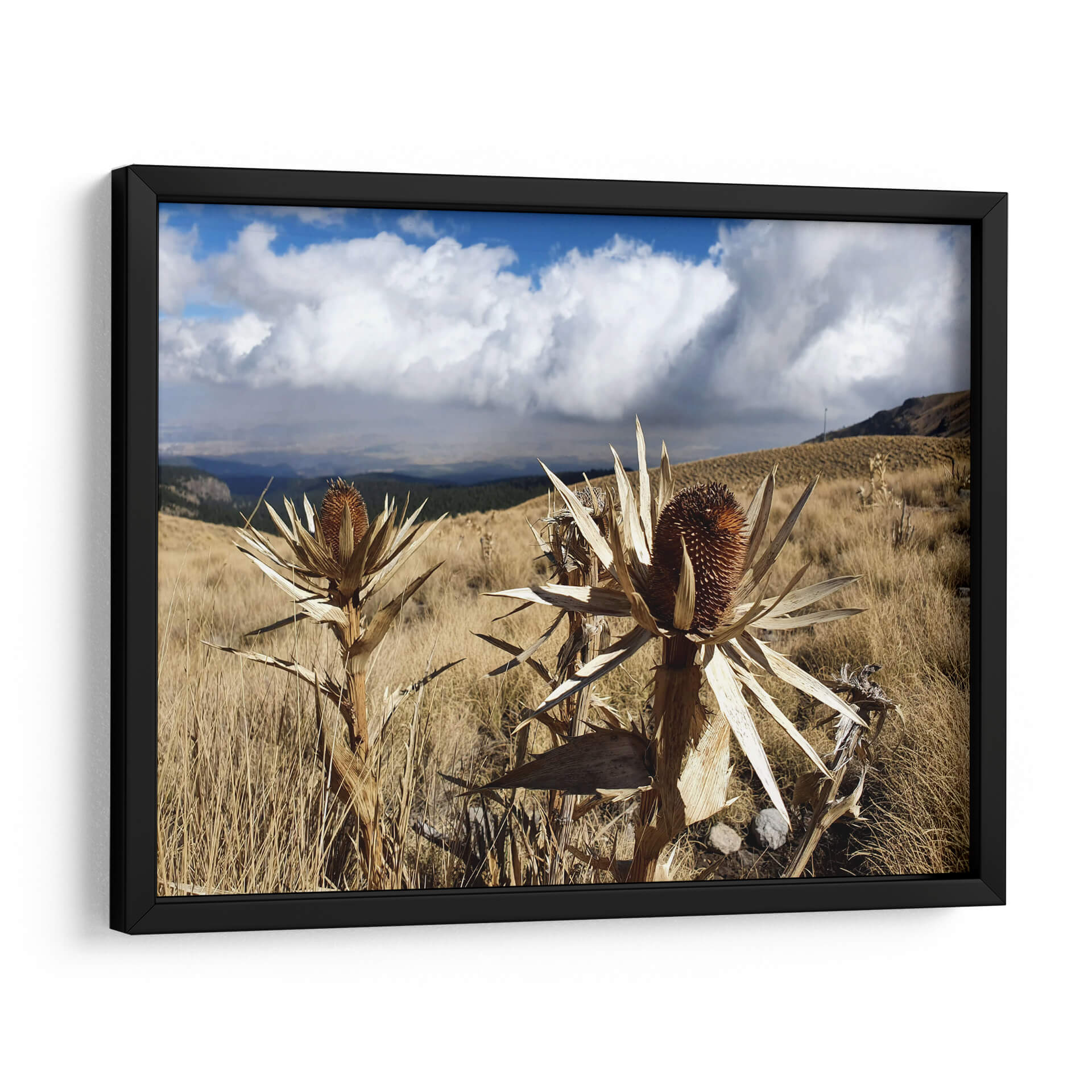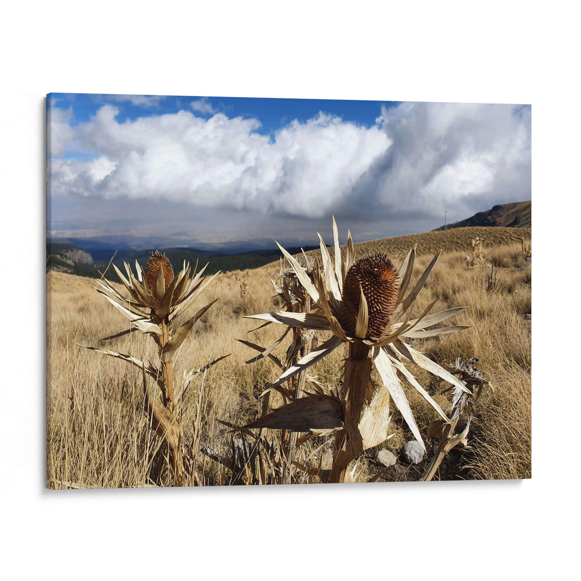 Sumérgete en la majestuosidad de la naturaleza con "Flora en el volcán Xinantécatl", una obra maestra de Salvador Gallardo que captura la esencia de la alta montaña mexicana. Este cuadro decorativo te transporta a un paisaje sereno donde dos imponentes plantas, con sus espinas texturizadas y centros pronunciados, se erigen como guardianes de un terreno árido. El fondo se despliega en una llanura dorada bajo un cielo azul vibrante, adornado con nubes algodonosas que añaden dramatismo y profundidad a la escena. La paleta de colores, dominada por tonos tierra, ocres y azules celestes, crea una atmósfera de calma y contemplación, ideal para aquellos que buscan infundir paz y conexión con la tierra en sus espacios. La composición fotográfica, con un enfoque nítido en la flora desértica, resalta la belleza cruda y la resistencia de la vida en entornos extremos. Este cuadro es perfecto para añadir un toque de naturaleza indómita y elegancia a tu salón, estudio u oficina, invitando a la reflexión y al aprecio por los detalles más sutiles del mundo natural. Descubre la fuerza silenciosa de "Flora en el volcán Xinantécatl" y transforma tu hogar en un santuario de serenidad.