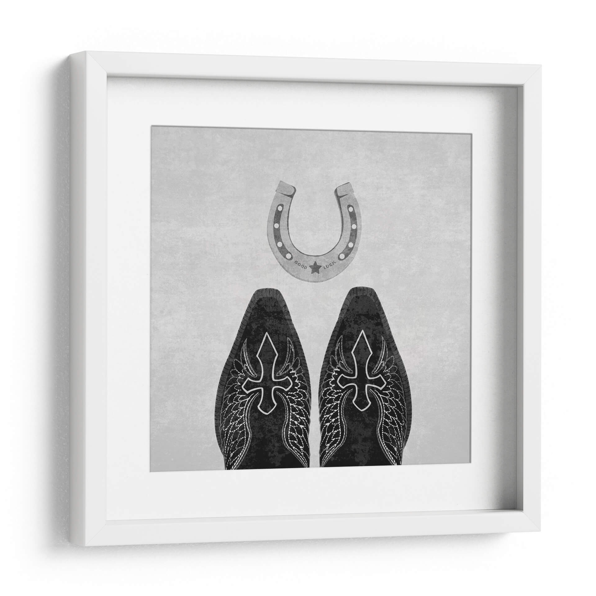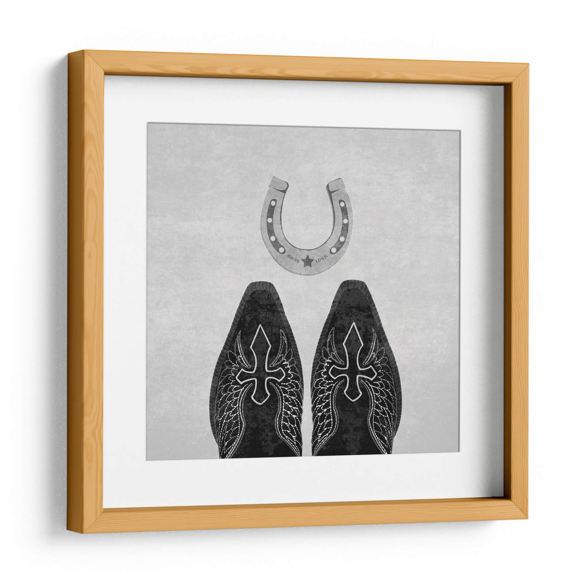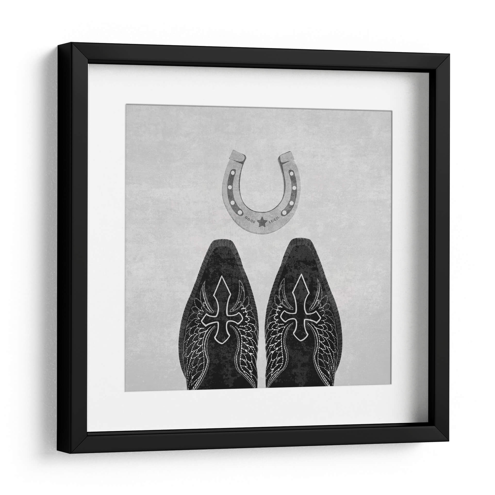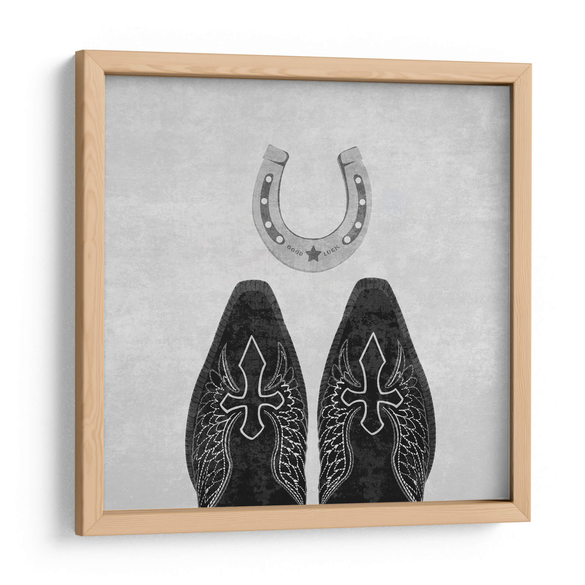 Sumérgete en la simbología y el estilo audaz con "Fortuna Occidental" de Emel Tunaboylu. Esta impactante obra de arte presenta un primer plano de dos botas de vaquero con intrincados detalles de alas y cruces, coronada por una herradura de la suerte. La paleta de colores monocromática, con tonos grises y negros, crea una atmósfera potente y atemporal, ideal para añadir un toque de carácter y misticismo a cualquier espacio. El contraste entre los elementos rústicos del oeste y los detalles etéreos de las alas evoca una sensación de fuerza y protección. "Fortuna Occidental" es perfecta para salones modernos, oficinas con carácter o cualquier rincón que busque una declaración visual audaz y llena de significado. Esta pieza contemporánea no solo decora, sino que también cuenta una historia de resiliencia, aventura y buena fortuna, resonando con aquellos que aprecian el arte con profundidad y estilo.