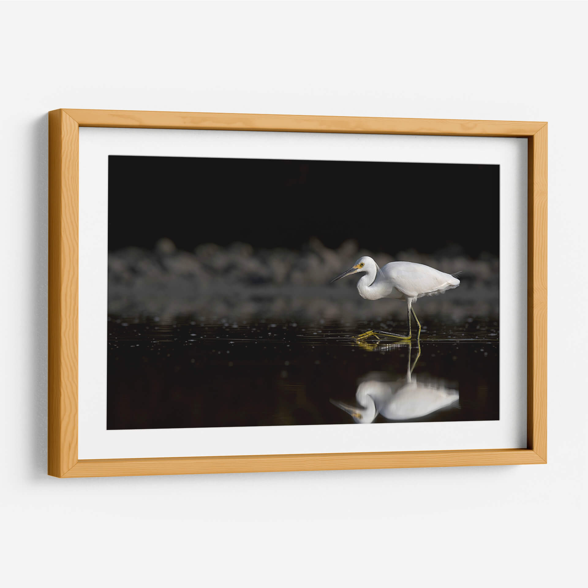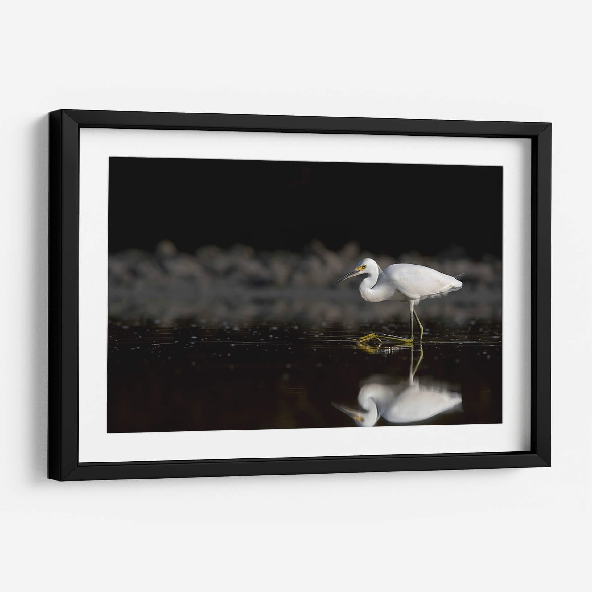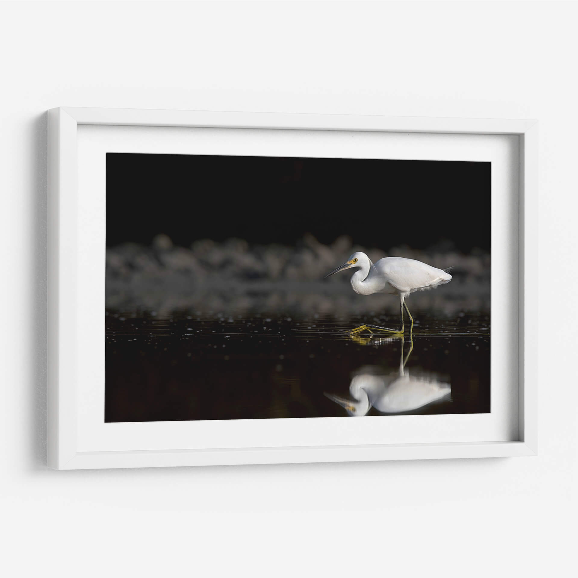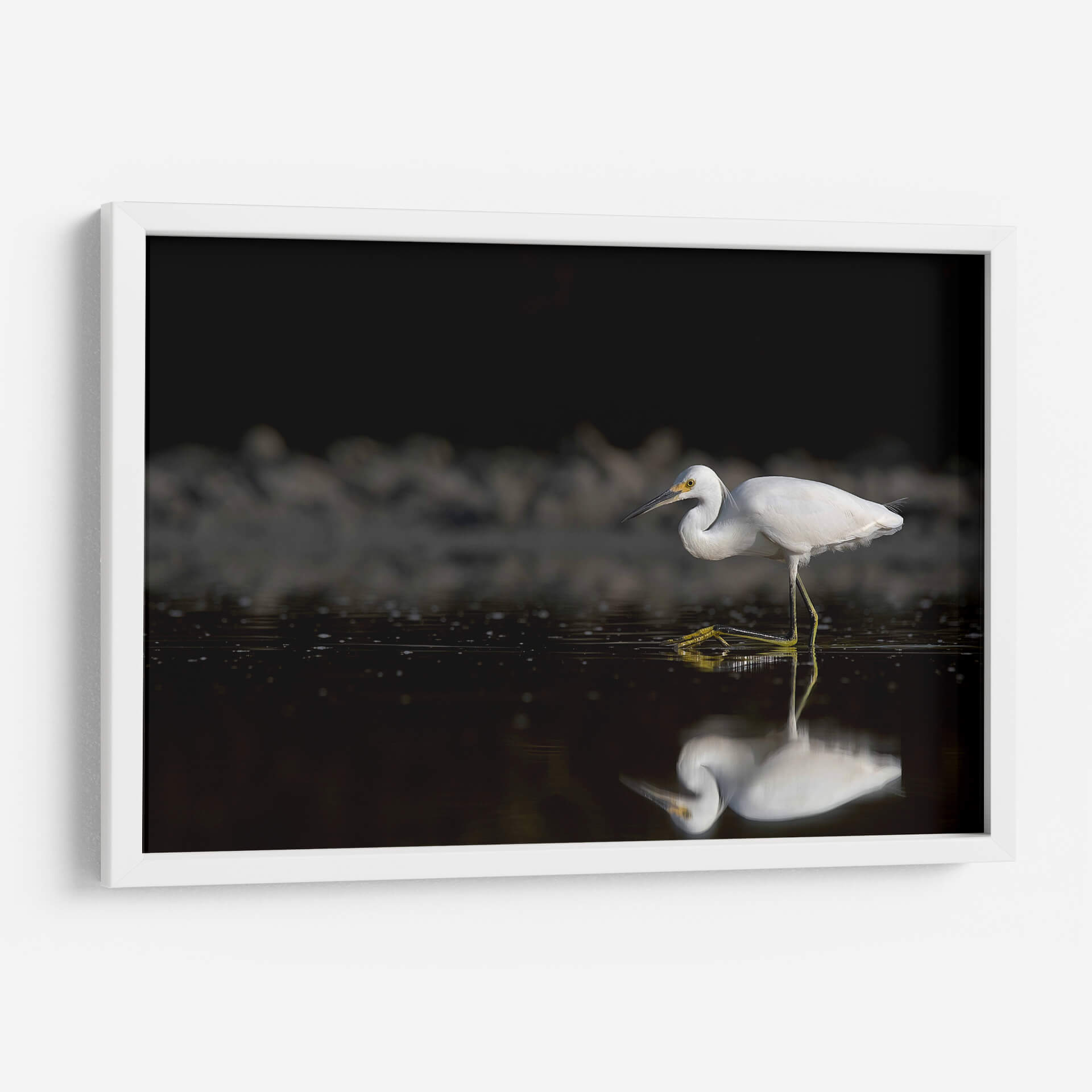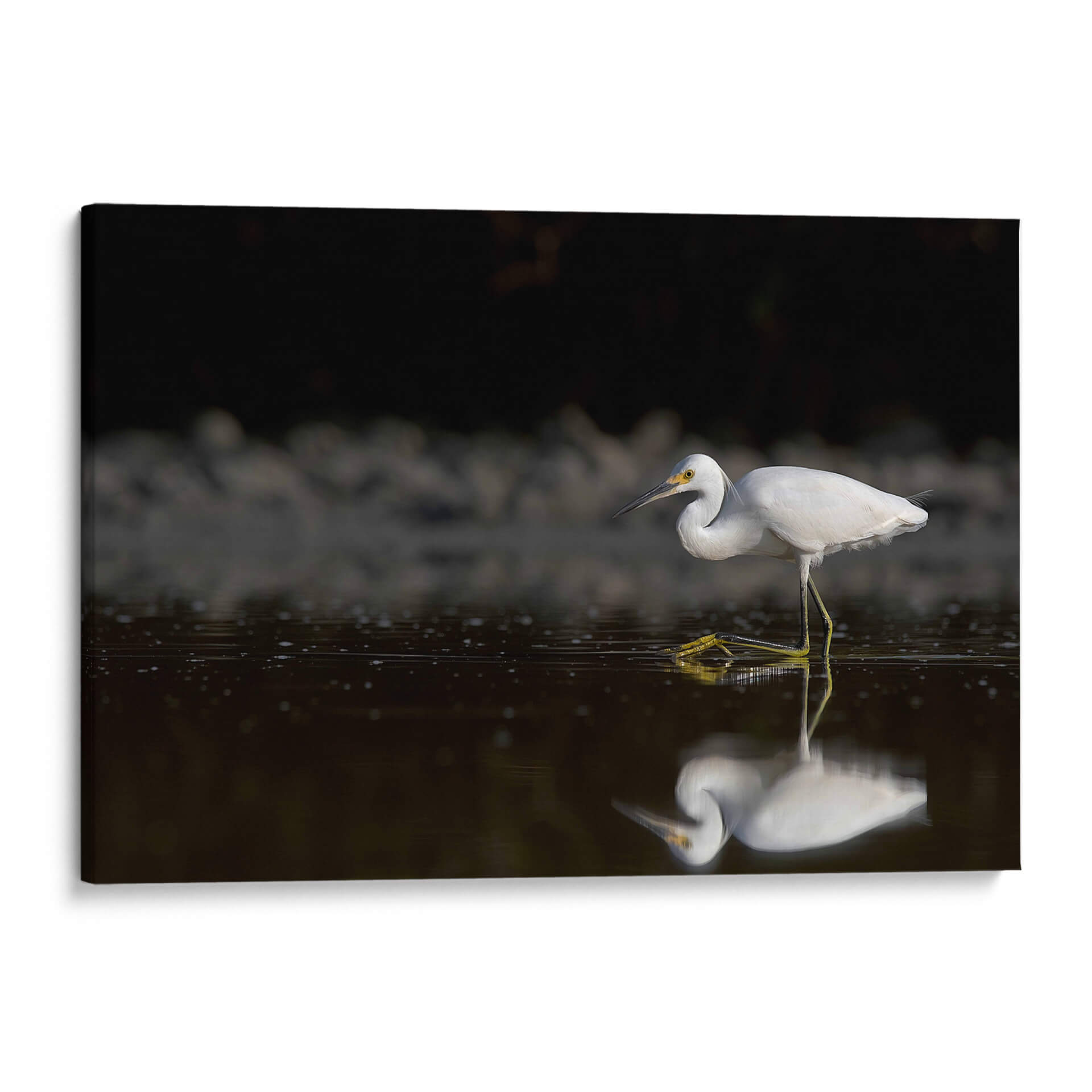 Captura la esencia de la serenidad y la naturaleza con esta obra de arte "Garza cazando". La fotografía de Cuauhtli.foto presenta una garza blanca inmaculada en pleno acto de cazar en aguas tranquilas. La composición maestra resalta la elegancia del ave, con sus patas amarillas vibrantes contrastando sobre el oscuro y reflectante espejo de agua. El fondo, sombreado y con texturas sutiles, dirige toda la atención al sujeto principal, creando una atmósfera de calma y concentración. Los detalles finos, desde las plumas de la garza hasta las pequeñas ondas en el agua, invitan a la contemplación. Esta pieza es ideal para añadir un toque de sofisticación natural a cualquier espacio, ya sea un salón moderno, una oficina que busca inspiración o un dormitorio que anhela paz. El juego de luces y sombras, junto con la pureza del blanco de la garza, aporta una sensación de pureza y tranquilidad. Este cuadro decorativo es una ventana a un momento efímero en la naturaleza, capturado con maestría para traer la belleza del mundo salvaje a tu hogar. Su estilo fotográfico realista y la temática de fauna lo convierten en una adición atemporal y elegante a tu decoración.