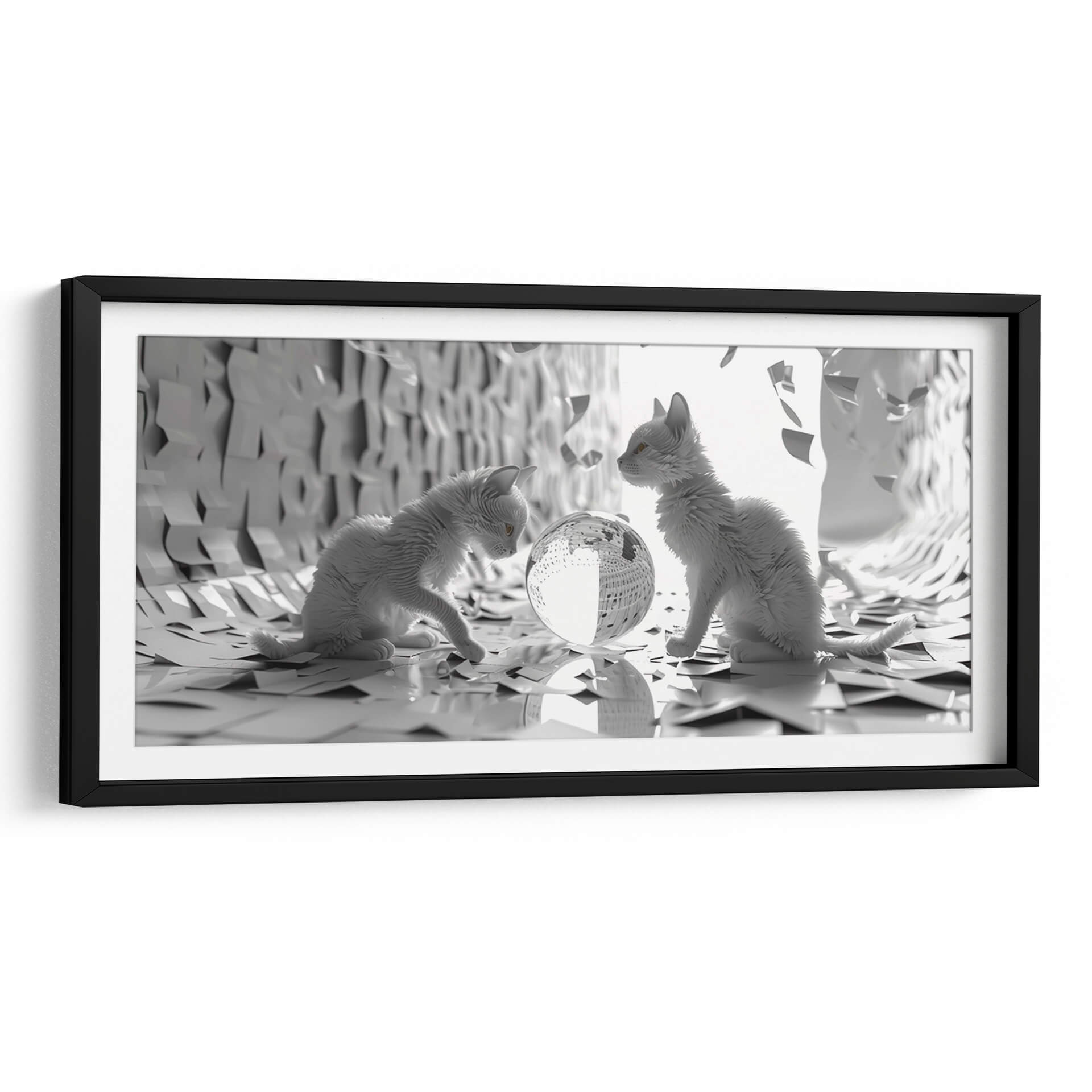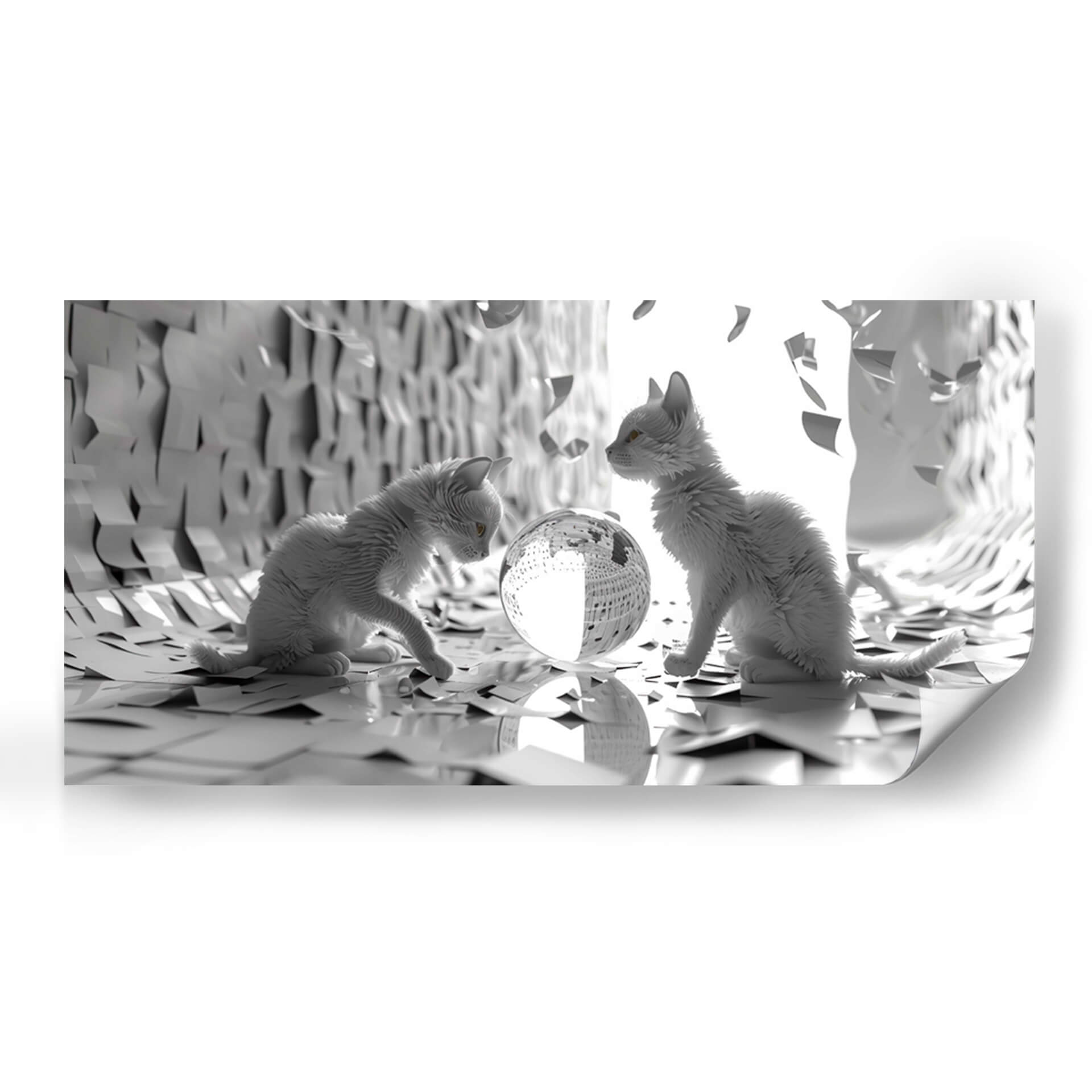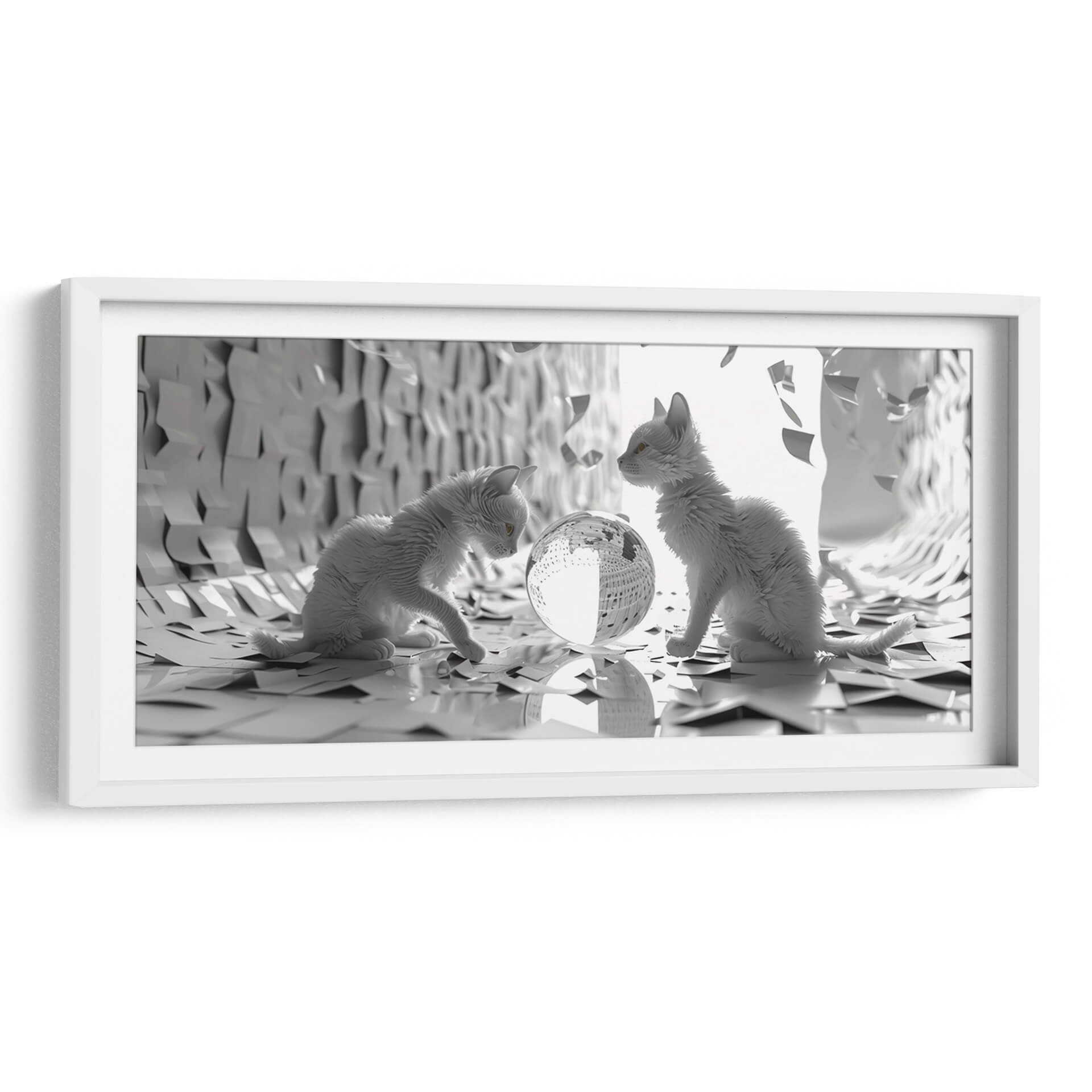 Adéntrate en un mundo de curiosidad felina con "Gatos y Papel", una cautivadora obra de arte de Cecilia Flores. Esta pieza visualmente intrigante presenta dos gatos blancos sentados en un entorno surrealista, rodeados de fragmentos de papel y un misterioso orbe que refleja el entorno de manera intrigante. La paleta de colores monocromática, con sutiles toques de ámbar en los ojos de los felinos, crea una atmósfera etérea y a la vez juguetona. La composición, con su simetría sutil y el juego de luces y sombras, invita a la contemplación. "Gatos y Papel" es más que una simple representación; es una invitación a explorar la imaginación y la relación entre la inocencia y el misterio. Este cuadro decorativo es perfecto para añadir un toque de originalidad y sofisticación a tu sala de estar, estudio u oficina. Su estilo único lo convierte en un punto focal que inspira conversaciones y admiración, ideal para amantes de los gatos y del arte contemporáneo que buscan piezas que desafíen lo convencional y aporten una dimensión onírica a sus espacios. Deja que esta obra te transporte a un universo de fantasía y encanto.