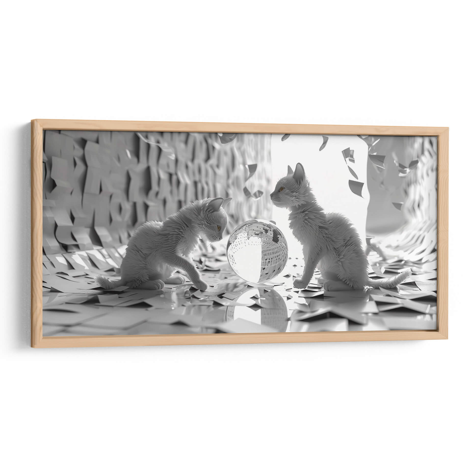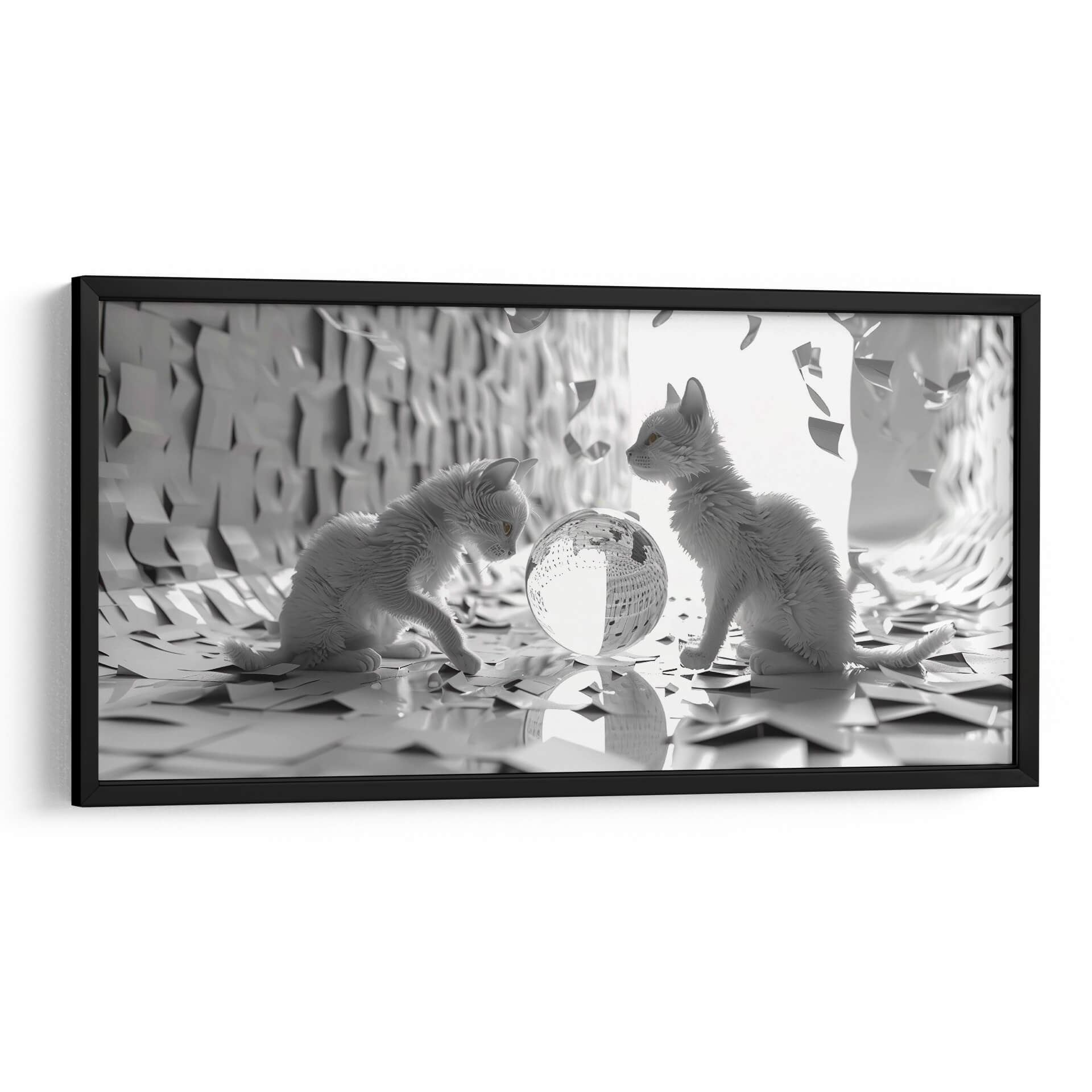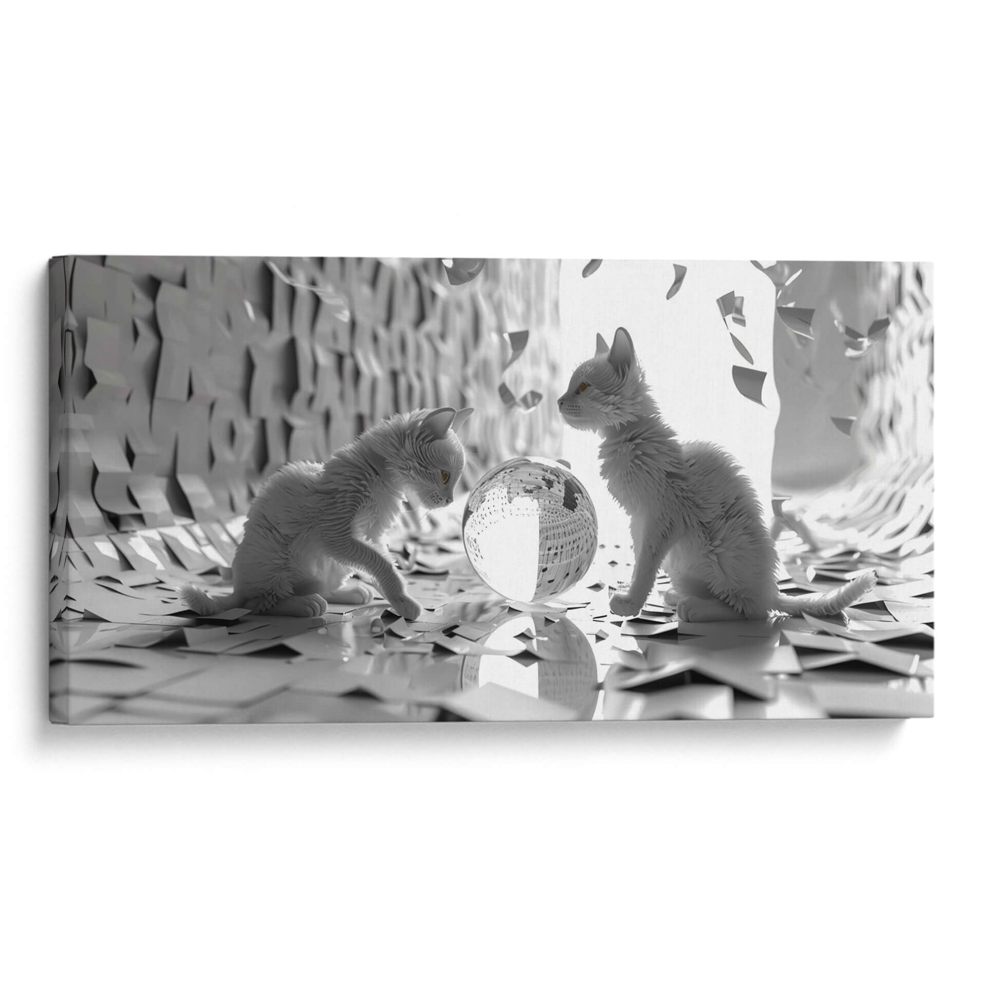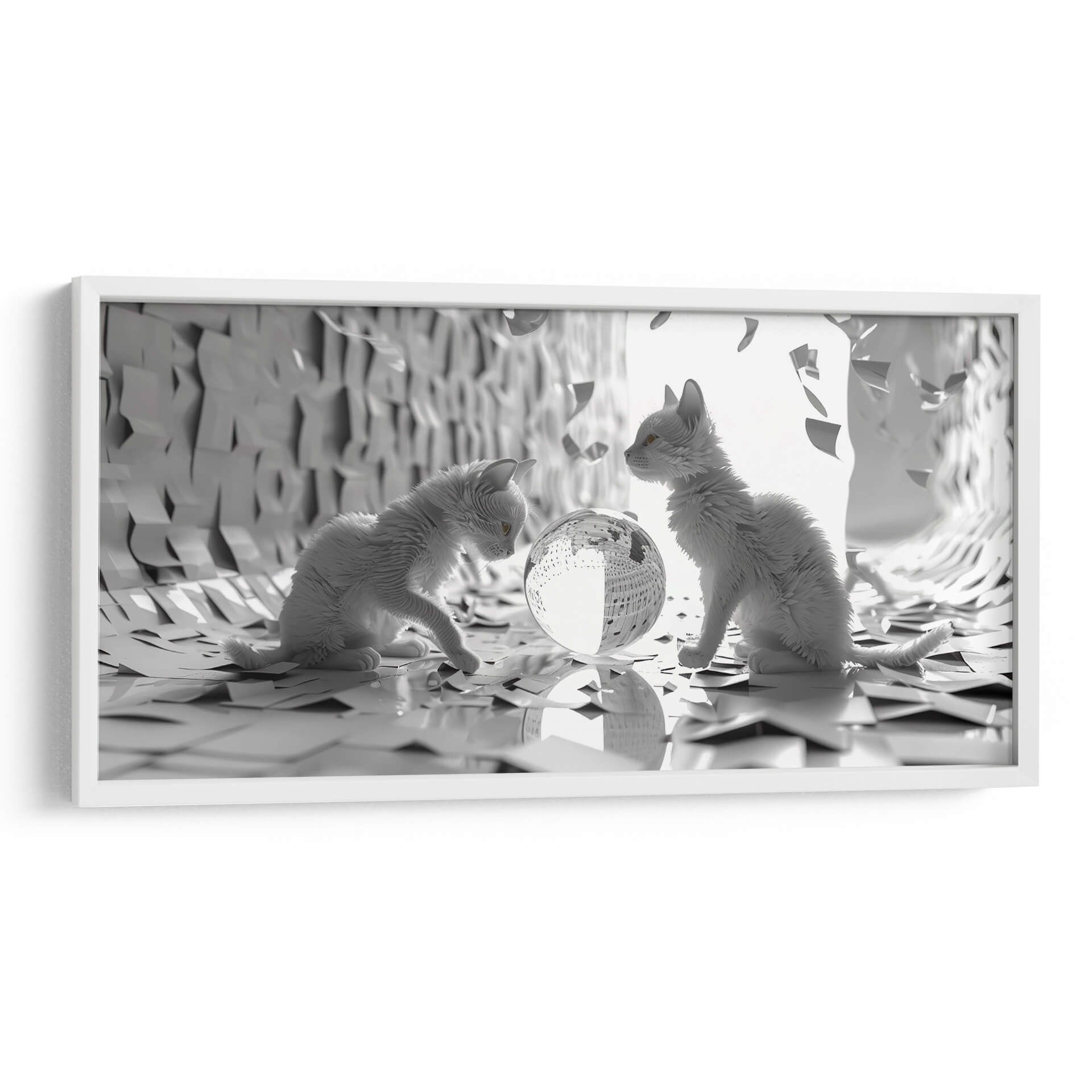 Adéntrate en un mundo de curiosidad felina con "Gatos y Papel", una cautivadora obra de arte de Cecilia Flores. Esta pieza visualmente intrigante presenta dos gatos blancos sentados en un entorno surrealista, rodeados de fragmentos de papel y un misterioso orbe que refleja el entorno de manera intrigante. La paleta de colores monocromática, con sutiles toques de ámbar en los ojos de los felinos, crea una atmósfera etérea y a la vez juguetona. La composición, con su simetría sutil y el juego de luces y sombras, invita a la contemplación. "Gatos y Papel" es más que una simple representación; es una invitación a explorar la imaginación y la relación entre la inocencia y el misterio. Este cuadro decorativo es perfecto para añadir un toque de originalidad y sofisticación a tu sala de estar, estudio u oficina. Su estilo único lo convierte en un punto focal que inspira conversaciones y admiración, ideal para amantes de los gatos y del arte contemporáneo que buscan piezas que desafíen lo convencional y aporten una dimensión onírica a sus espacios. Deja que esta obra te transporte a un universo de fantasía y encanto.