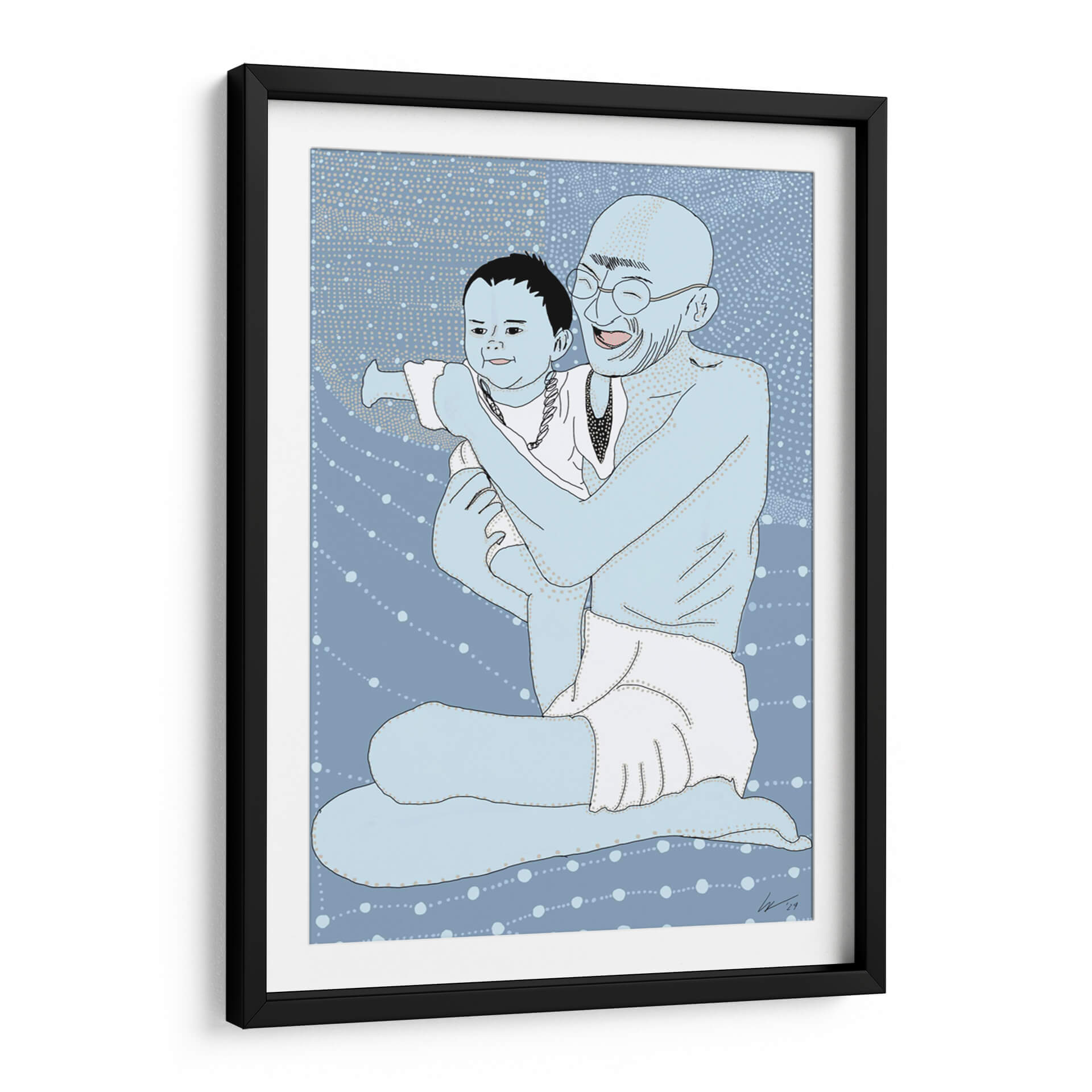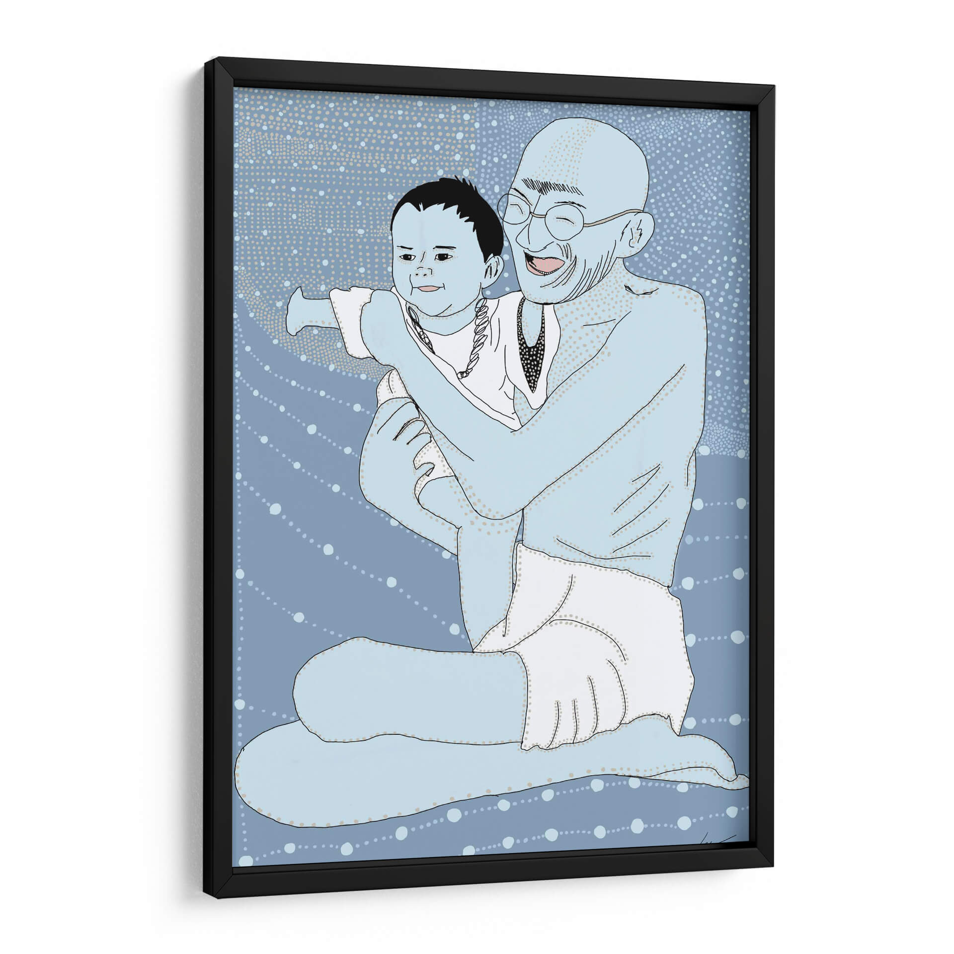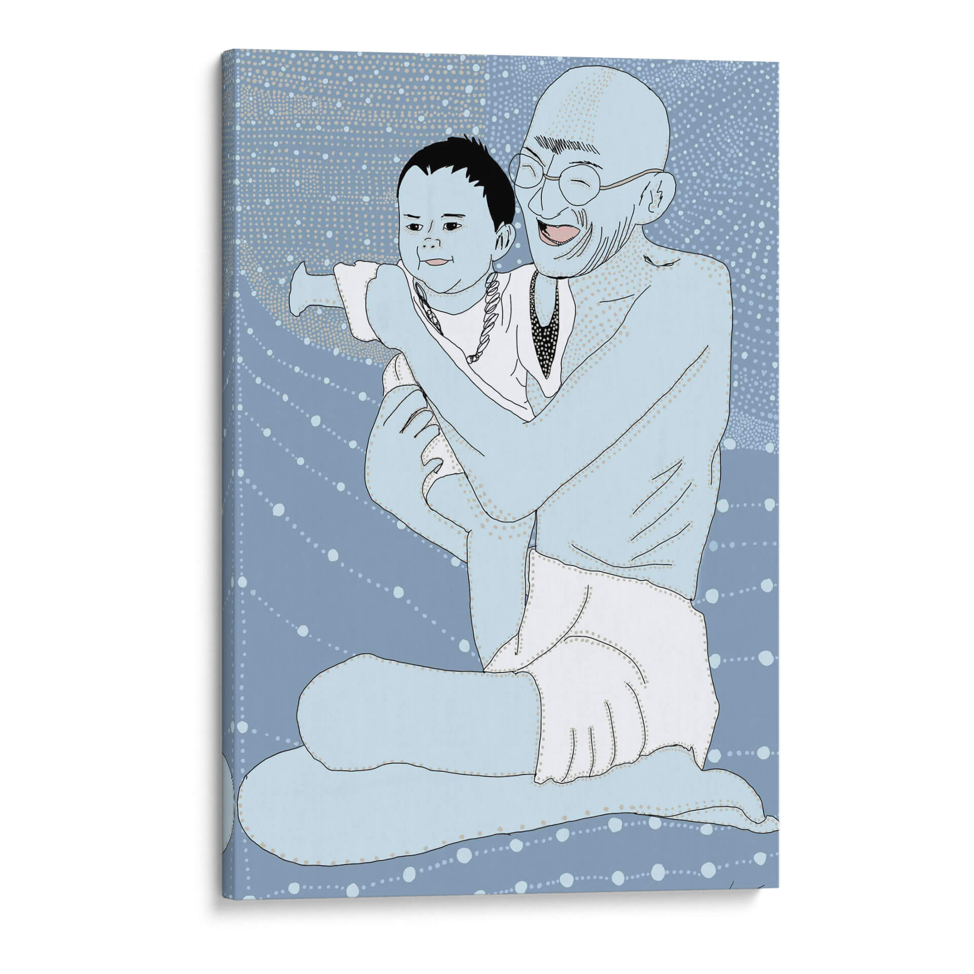 Sumérgete en la ternura y la paz con este cautivador cuadro decorativo que representa a Mahatma Gandhi abrazando a un bebé. La obra, titulada 'Ghandi Puntillismo', utiliza una paleta de colores serenos en tonos azules y blancos, con sutiles toques dorados que crean un efecto punteado, aportando profundidad y un aire etéreo. El estilo puntillista, aplicado de forma delicada, otorga a la figura una suavidad única, mientras que las líneas sencillas pero expresivas definen los contornos y las emociones. Gandhi, con su característica expresión sonriente y sus gafas, irradia calma y sabiduría, mientras que el bebé, con su mirada curiosa, transmite inocencia y futuro. La composición, centrada en la entrañable interacción entre ambos, evoca sentimientos de amor incondicional, protección y la transmisión de valores a las nuevas generaciones. Este cuadro decorativo es una pieza inspiradora, perfecta para añadir un toque de serenidad y significado a cualquier espacio. Ideal para salones, dormitorios o estudios, su mensaje universal de paz y humanidad lo convierte en un punto focal que invita a la reflexión y al bienestar. Decora tu hogar con arte que nutre el alma y celebra la conexión humana.