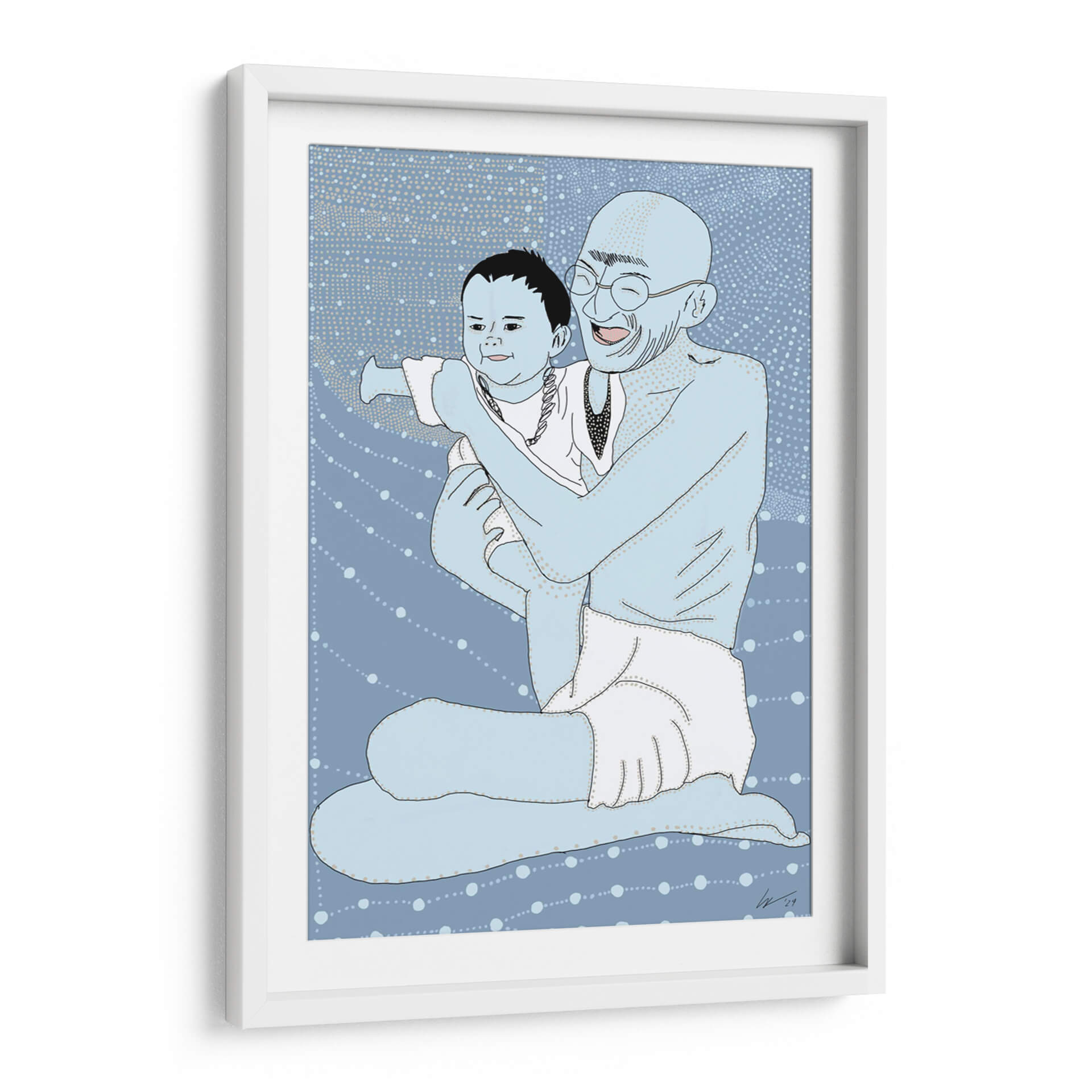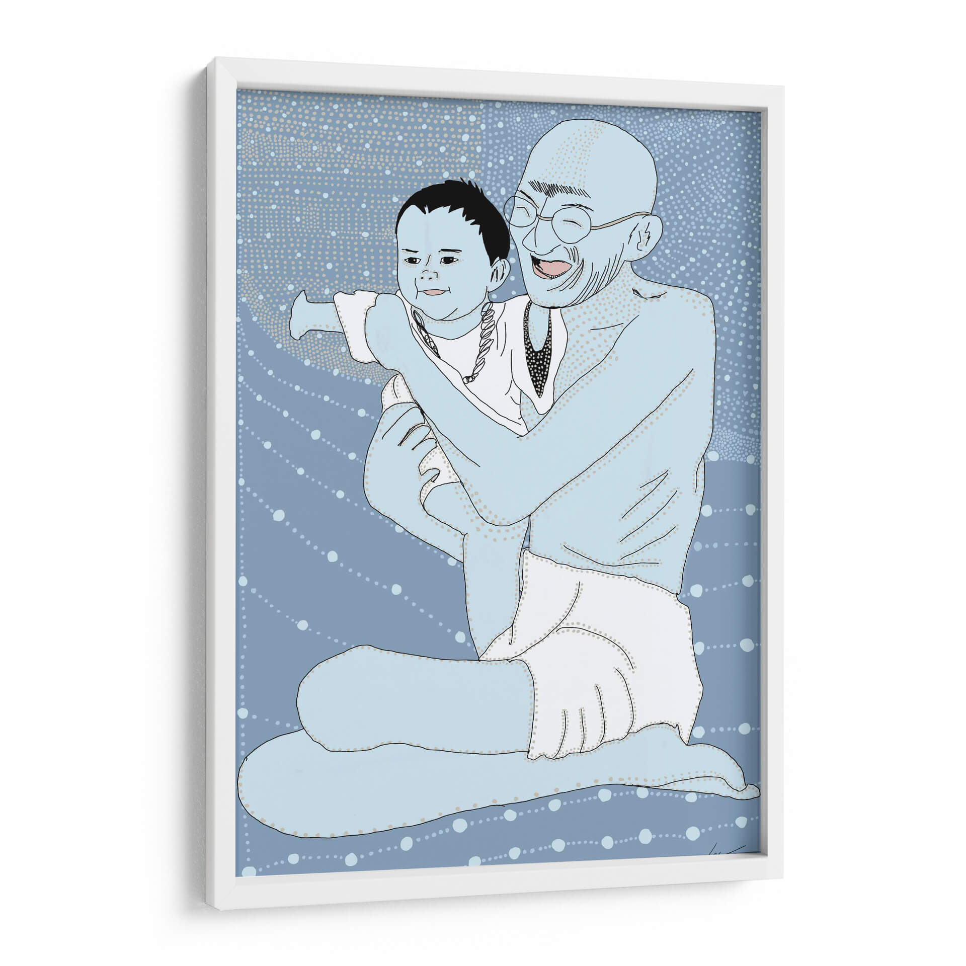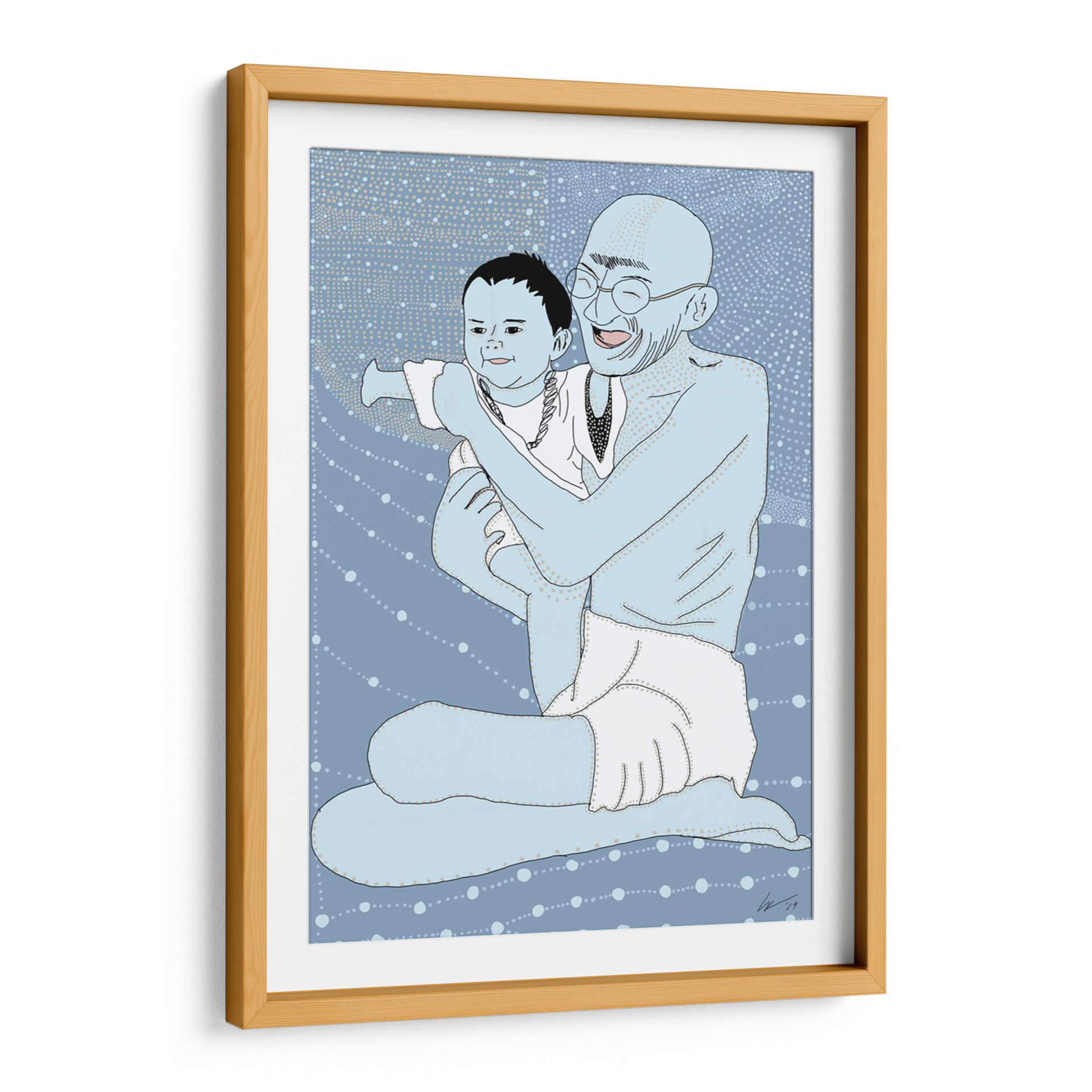 Sumérgete en la ternura y la paz con este cautivador cuadro decorativo que representa a Mahatma Gandhi abrazando a un bebé. La obra, titulada 'Ghandi Puntillismo', utiliza una paleta de colores serenos en tonos azules y blancos, con sutiles toques dorados que crean un efecto punteado, aportando profundidad y un aire etéreo. El estilo puntillista, aplicado de forma delicada, otorga a la figura una suavidad única, mientras que las líneas sencillas pero expresivas definen los contornos y las emociones. Gandhi, con su característica expresión sonriente y sus gafas, irradia calma y sabiduría, mientras que el bebé, con su mirada curiosa, transmite inocencia y futuro. La composición, centrada en la entrañable interacción entre ambos, evoca sentimientos de amor incondicional, protección y la transmisión de valores a las nuevas generaciones. Este cuadro decorativo es una pieza inspiradora, perfecta para añadir un toque de serenidad y significado a cualquier espacio. Ideal para salones, dormitorios o estudios, su mensaje universal de paz y humanidad lo convierte en un punto focal que invita a la reflexión y al bienestar. Decora tu hogar con arte que nutre el alma y celebra la conexión humana.