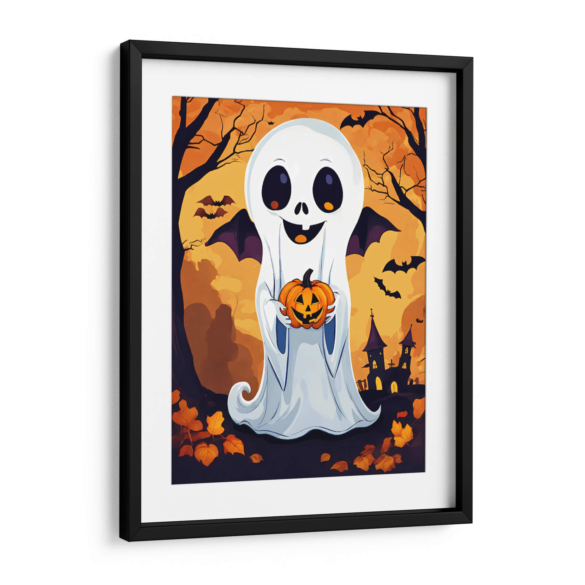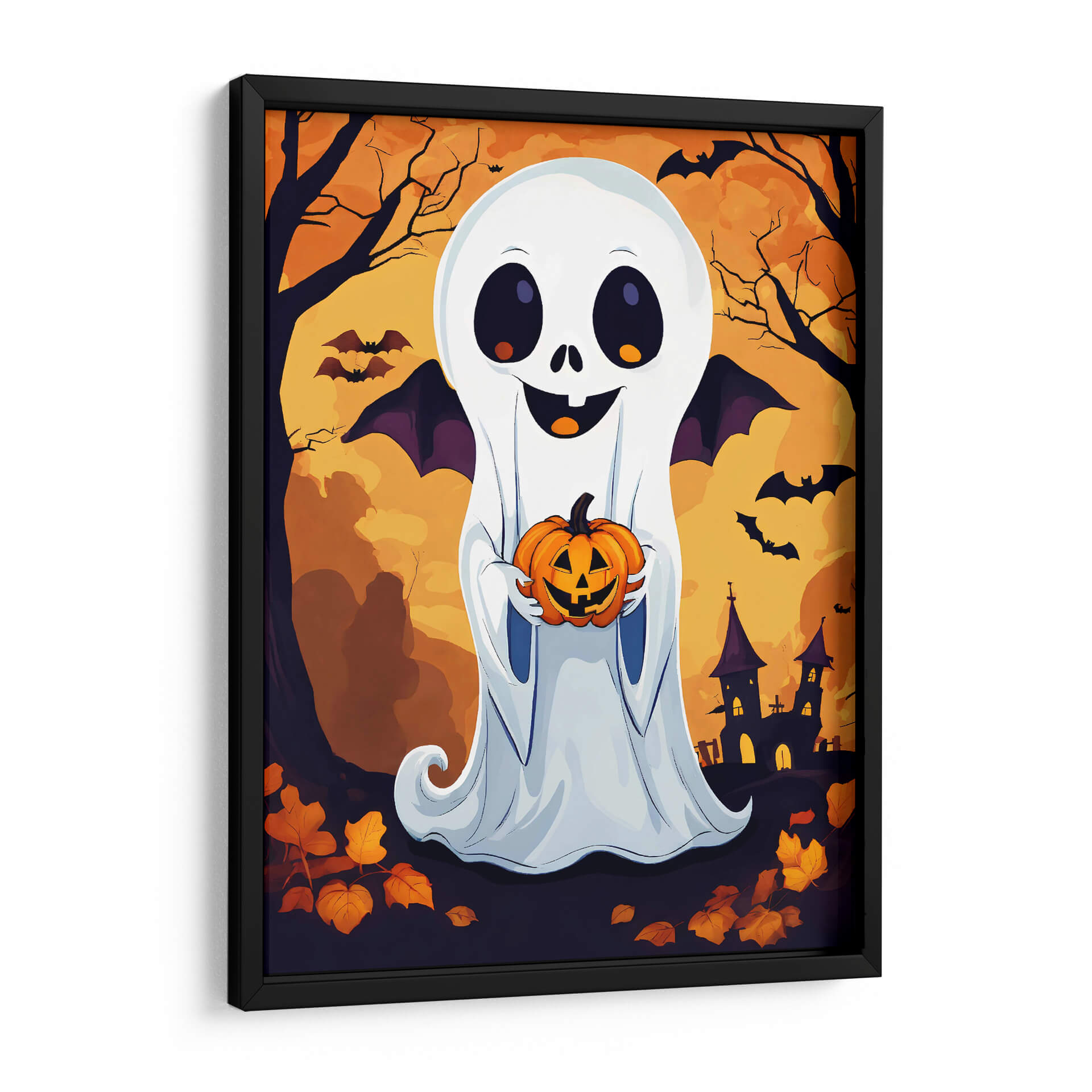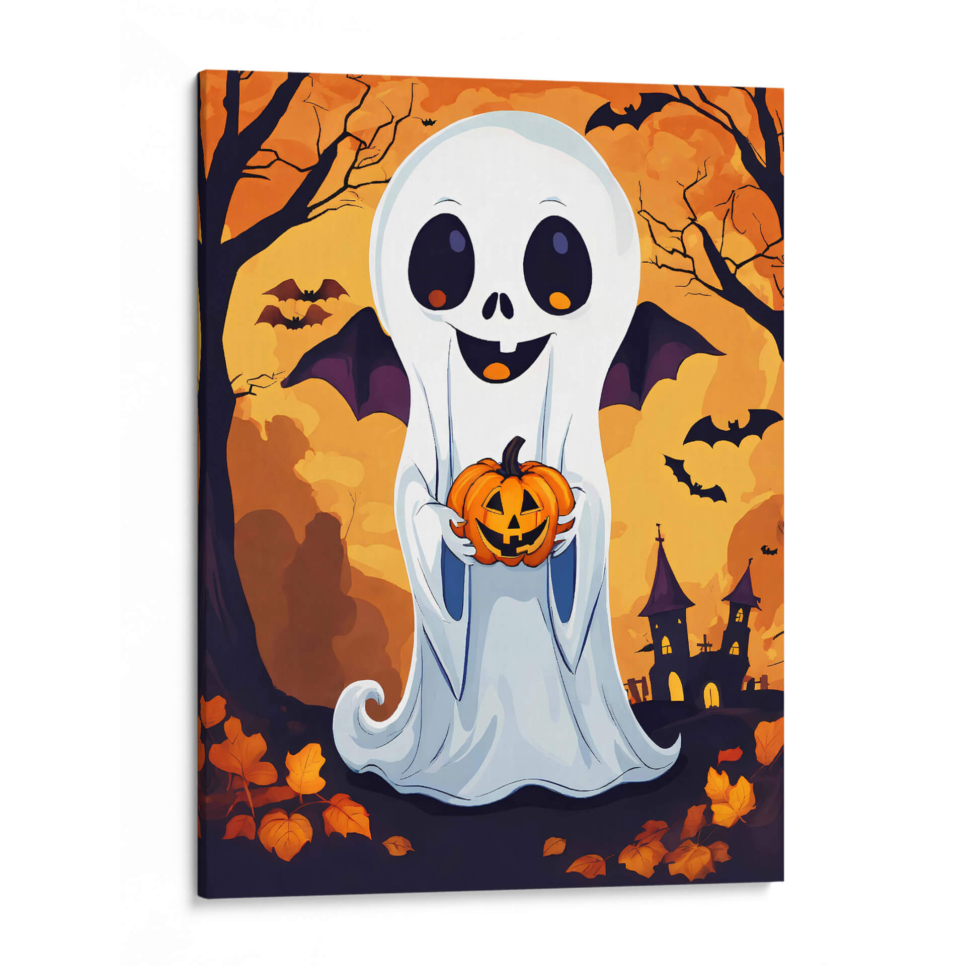Sumérgete en la magia y el misterio de Halloween con esta cautivadora obra de arte digital. La pieza presenta a un adorable fantasma amigable, con sus grandes ojos y una sonrisa juguetona, sosteniendo una calabaza de Jack-o'-lantern. Detrás de él, se despliega un paisaje nocturno de ensueño, con siluetas de árboles oscuros, murciélagos revoloteando en un cielo anaranjado vibrante y una casa embrujada a lo lejos, todo ello realzado por las hojas de otoño que alfombran el suelo. Los colores cálidos y vibrantes, dominados por naranjas, amarillos y tonos oscuros, crean una atmósfera festiva y ligeramente espeluznante, perfecta para la temporada de Halloween. Este cuadro decorativo, con su estilo caricaturesco y su encanto lúdico, es ideal para añadir un toque de diversión y espíritu festivo a cualquier habitación, ya sea una sala de estar, un dormitorio o incluso un espacio de juegos. Su composición equilibrada y sus personajes entrañables lo convierten en una pieza versátil para decorar durante todo el otoño, o para celebrar la festividad más espeluznante del año. Añade un toque de fantasía y alegría a tu hogar con esta representación única de Halloween.