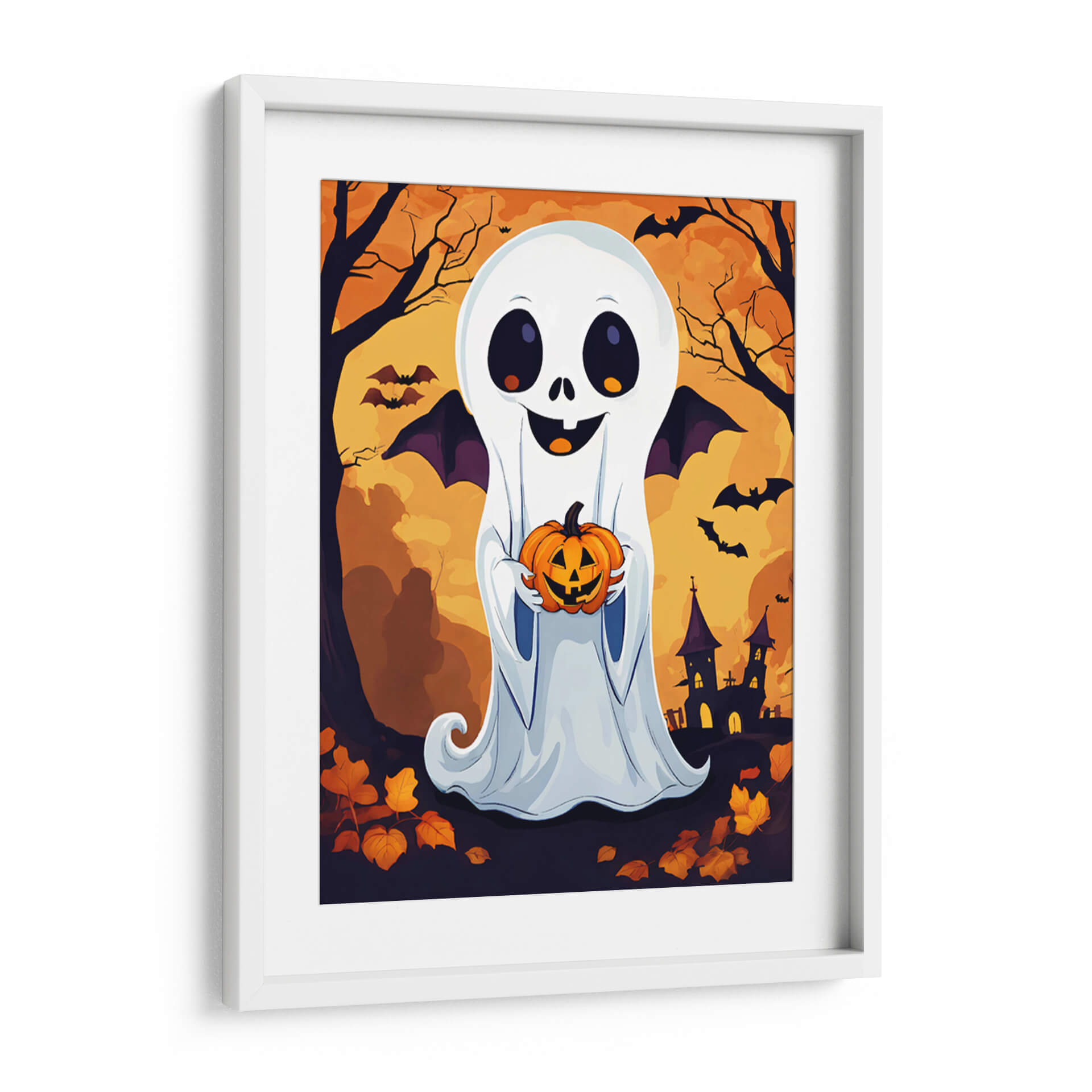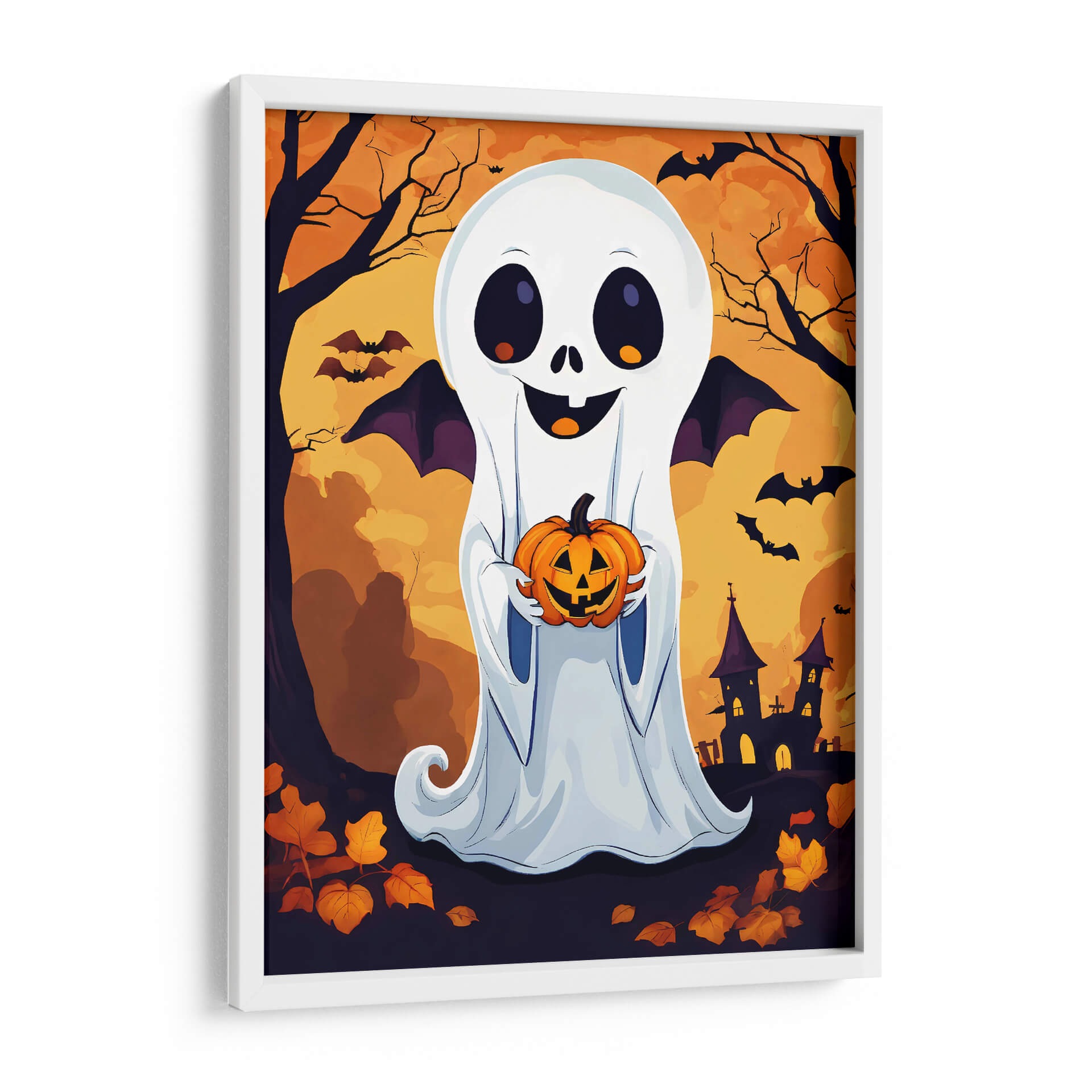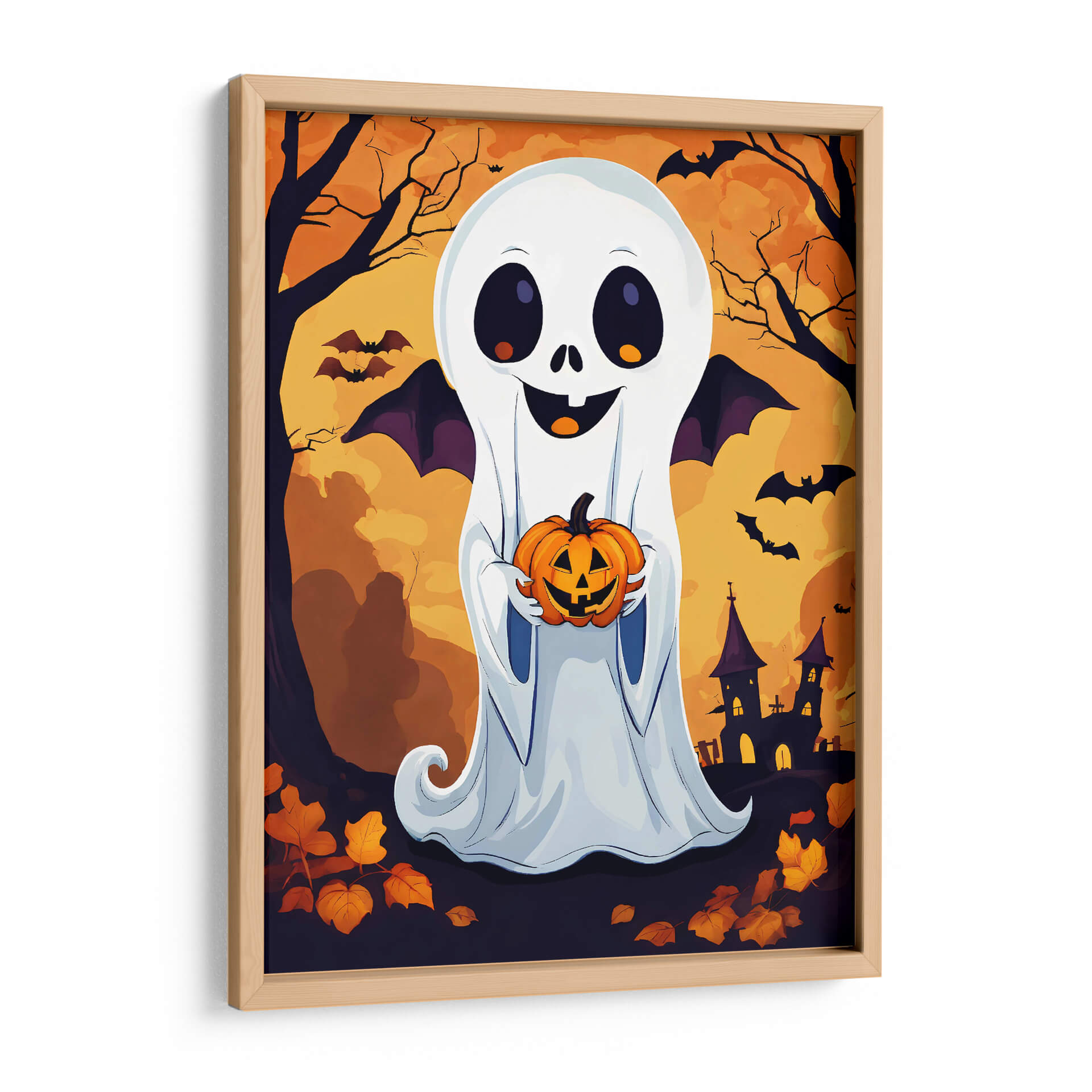 Sumérgete en la magia y el misterio de Halloween con esta cautivadora obra de arte digital. La pieza presenta a un adorable fantasma amigable, con sus grandes ojos y una sonrisa juguetona, sosteniendo una calabaza de Jack-o'-lantern. Detrás de él, se despliega un paisaje nocturno de ensueño, con siluetas de árboles oscuros, murciélagos revoloteando en un cielo anaranjado vibrante y una casa embrujada a lo lejos, todo ello realzado por las hojas de otoño que alfombran el suelo. Los colores cálidos y vibrantes, dominados por naranjas, amarillos y tonos oscuros, crean una atmósfera festiva y ligeramente espeluznante, perfecta para la temporada de Halloween. Este cuadro decorativo, con su estilo caricaturesco y su encanto lúdico, es ideal para añadir un toque de diversión y espíritu festivo a cualquier habitación, ya sea una sala de estar, un dormitorio o incluso un espacio de juegos. Su composición equilibrada y sus personajes entrañables lo convierten en una pieza versátil para decorar durante todo el otoño, o para celebrar la festividad más espeluznante del año. Añade un toque de fantasía y alegría a tu hogar con esta representación única de Halloween.