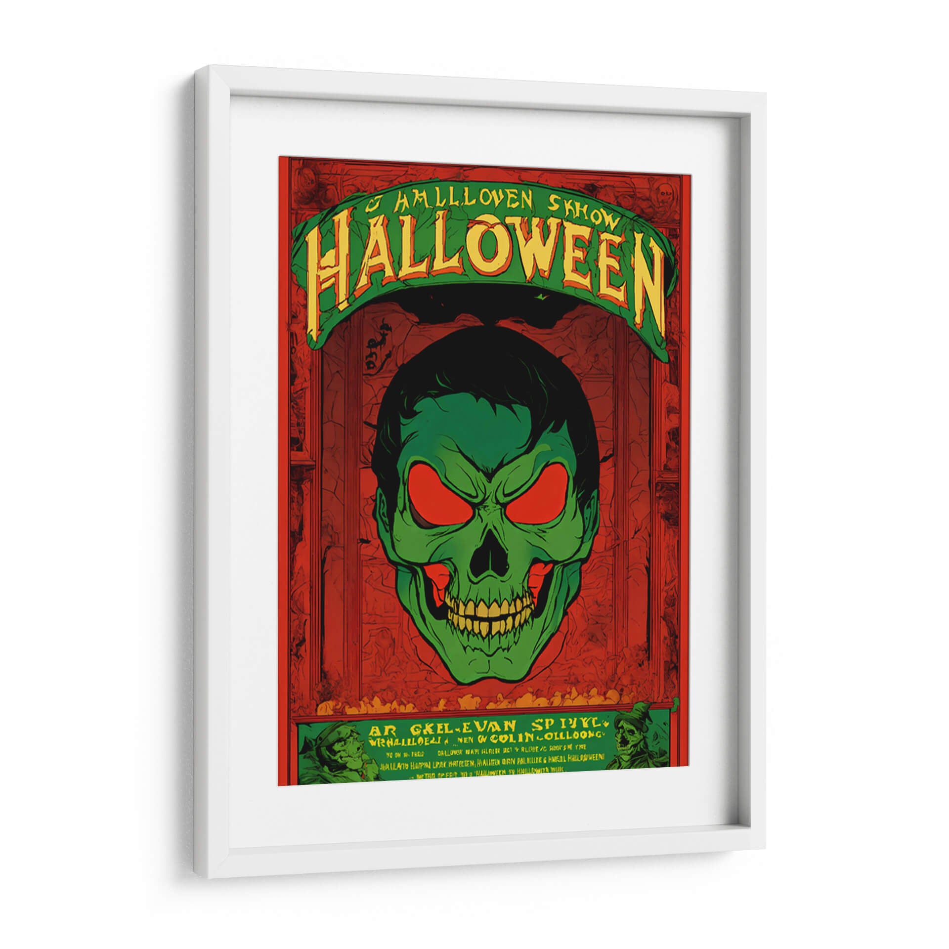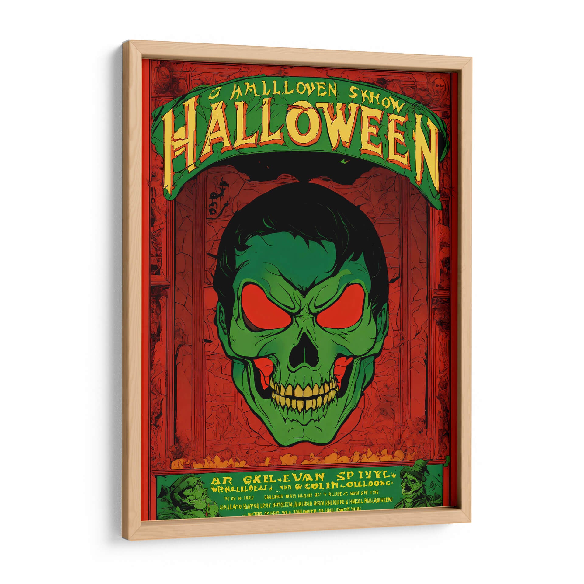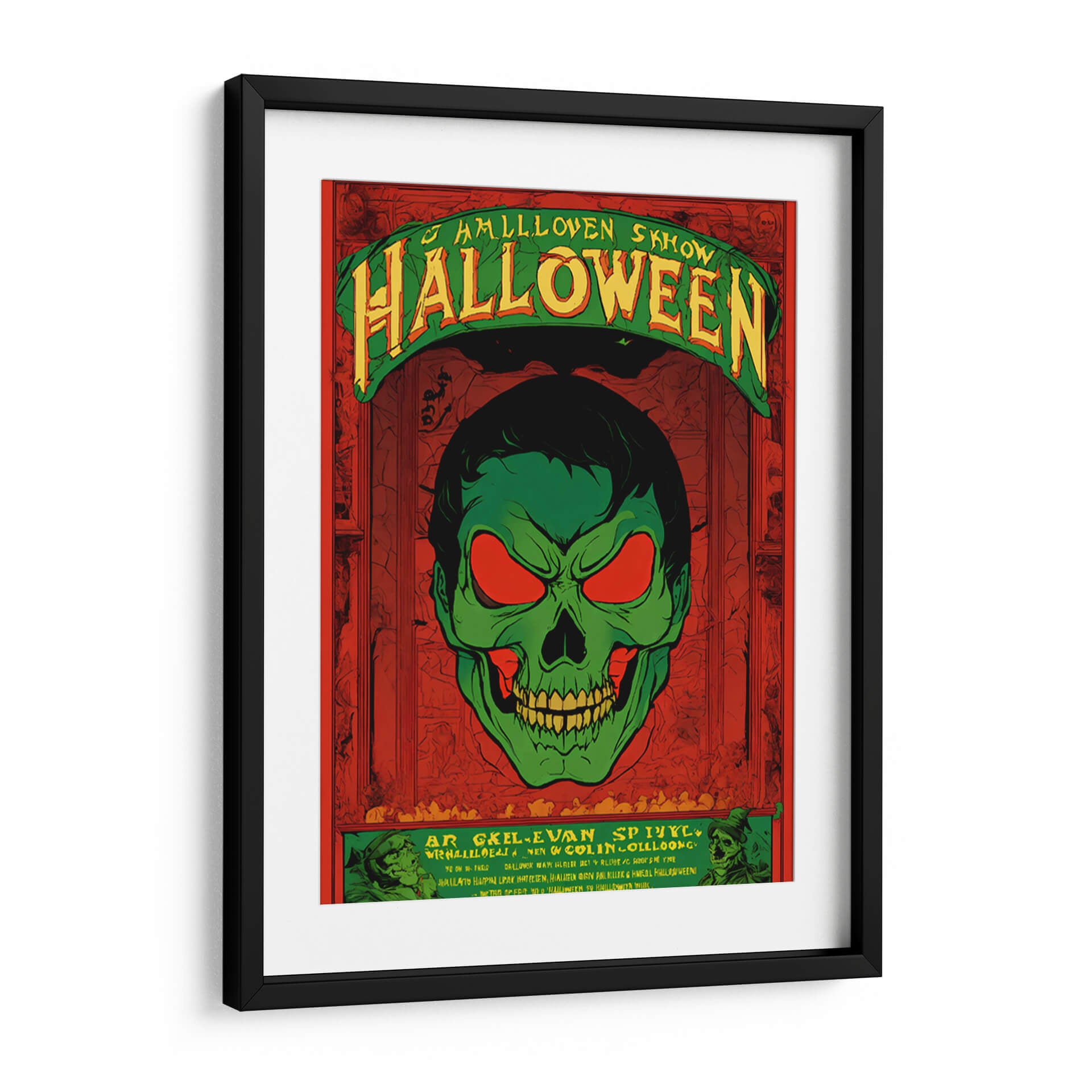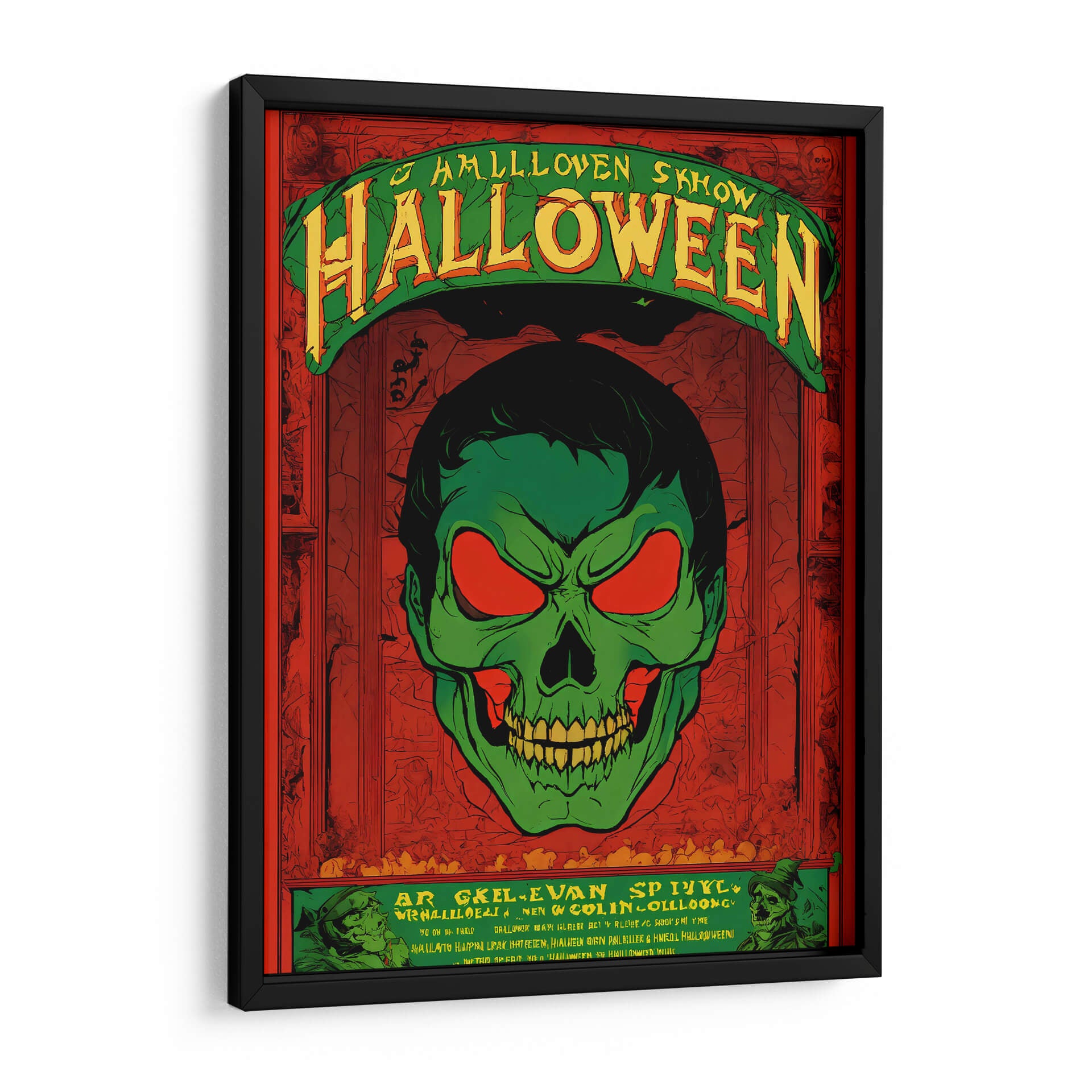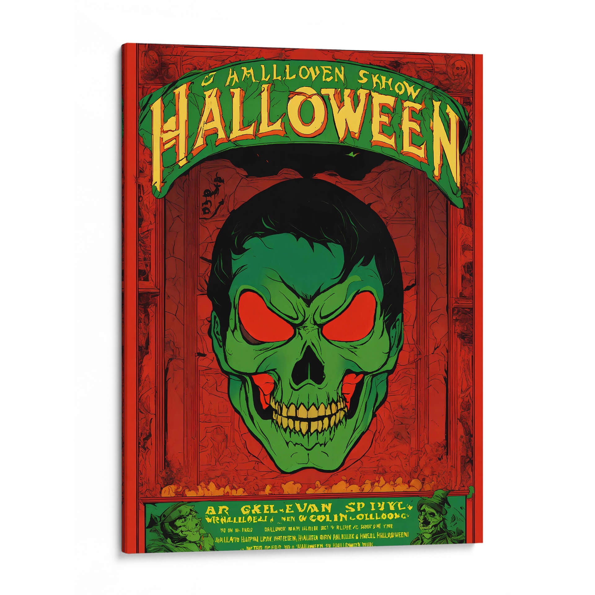 Sumérgete en la atmósfera icónica de Halloween con este impactante cuadro decorativo, una obra de arte digital que captura la esencia de la festividad con un estilo audaz y cautivador. La pieza central presenta una calavera en un vibrante tono verde, con ojos intensos en rojo que parecen penetrar la mirada, enmarcada por un estilo retro reminiscentes de carteles de cine de terror clásicos. Los colores dominantes, un rojo profundo y un verde eléctrico, se combinan para crear una sensación de misterio y energía, perfecta para añadir un toque dramático a cualquier espacio. La composición, centrada en la figura de la calavera y el titular 'Halloween', evoca un sentimiento de nostalgia y emoción por esta época del año. Ideal para salones, estudios o cualquier rincón que busque un punto focal audaz y temático, este cuadro decorativo es una elección perfecta para los amantes del arte con un gusto por lo macabro y lo estilizado, asegurando que tu decoración de Halloween sea inolvidable y llena de carácter. Añade este toque de espeluznante elegancia a tu hogar.