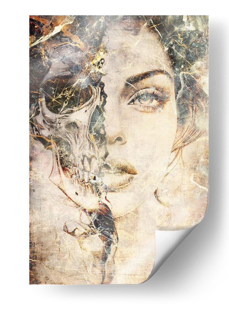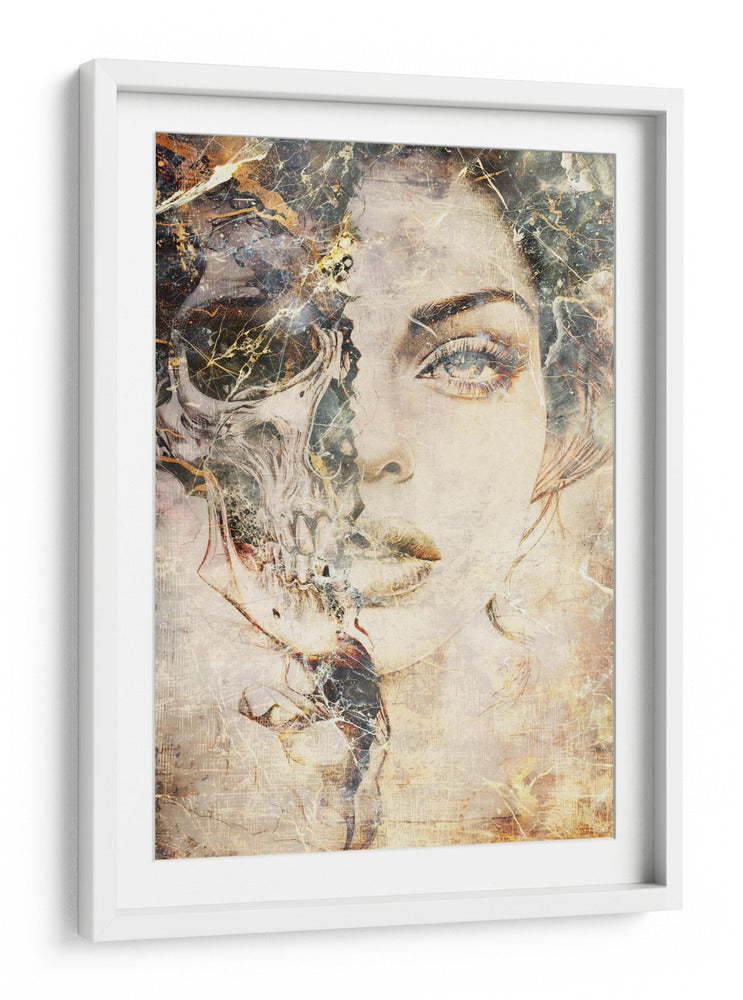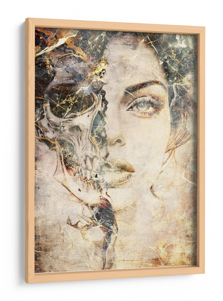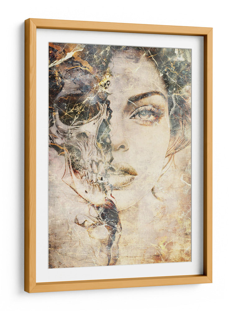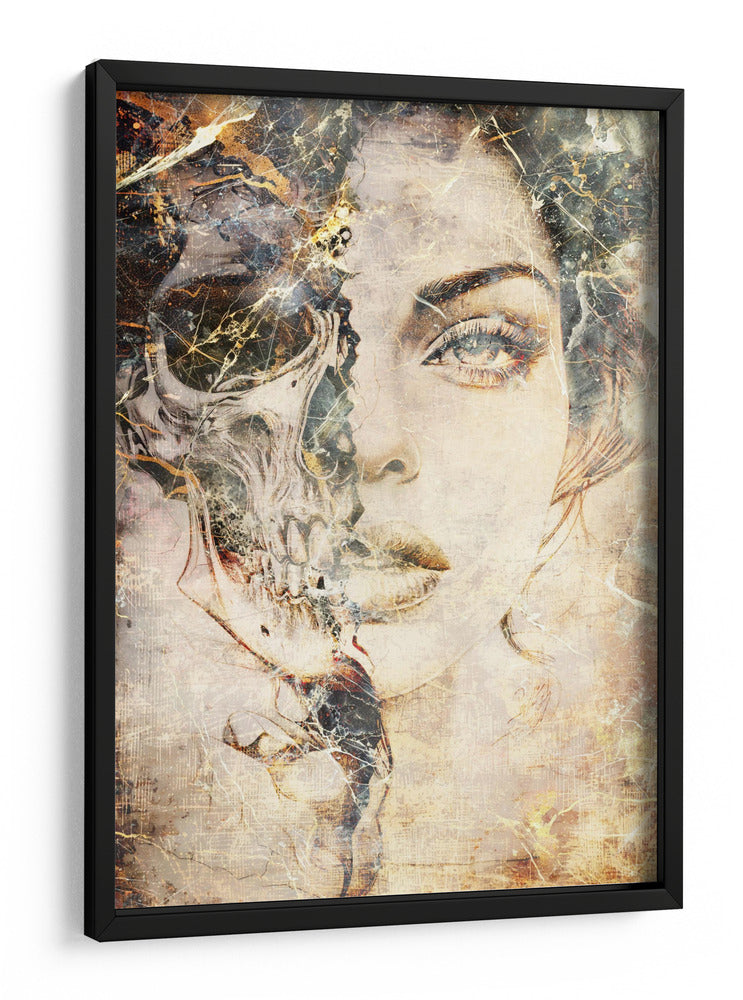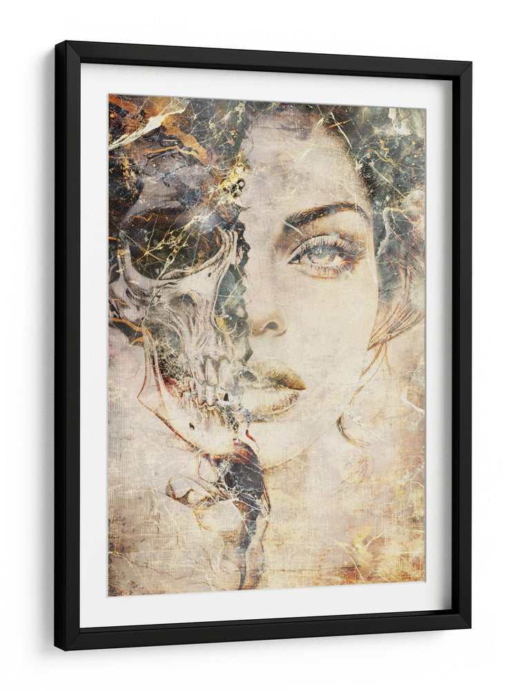 Adéntrate en el enigmático mundo de Rafal Kulik con esta impactante obra de arte que fusiona la dualidad de la vida y la muerte. El cuadro decorativo presenta un rostro femenino delicadamente retratado, cuyos rasgos suaves y mirada penetrante contrastan con la presencia inquietante de una calavera que emerge de un lado, revelando la fragilidad de la existencia. La paleta de colores se centra en tonos tierra, ocres y dorados, con texturas que evocan la antigüedad y lo etéreo, creando una atmósfera de misterio y reflexión. Las pinceladas detalladas y el estilo neo-expresionista añaden profundidad y emoción a la composición, invitando a una contemplación sobre la belleza transitoria y la naturaleza cíclica de la vida. Este cuadro decorativo es perfecto para aquellos que buscan una pieza de arte audaz y significativa para su hogar u oficina, añadiendo un toque de intriga y sofisticación a cualquier espacio moderno o contemporáneo. Ideal para salones, estudios o como un punto focal que genera conversación.