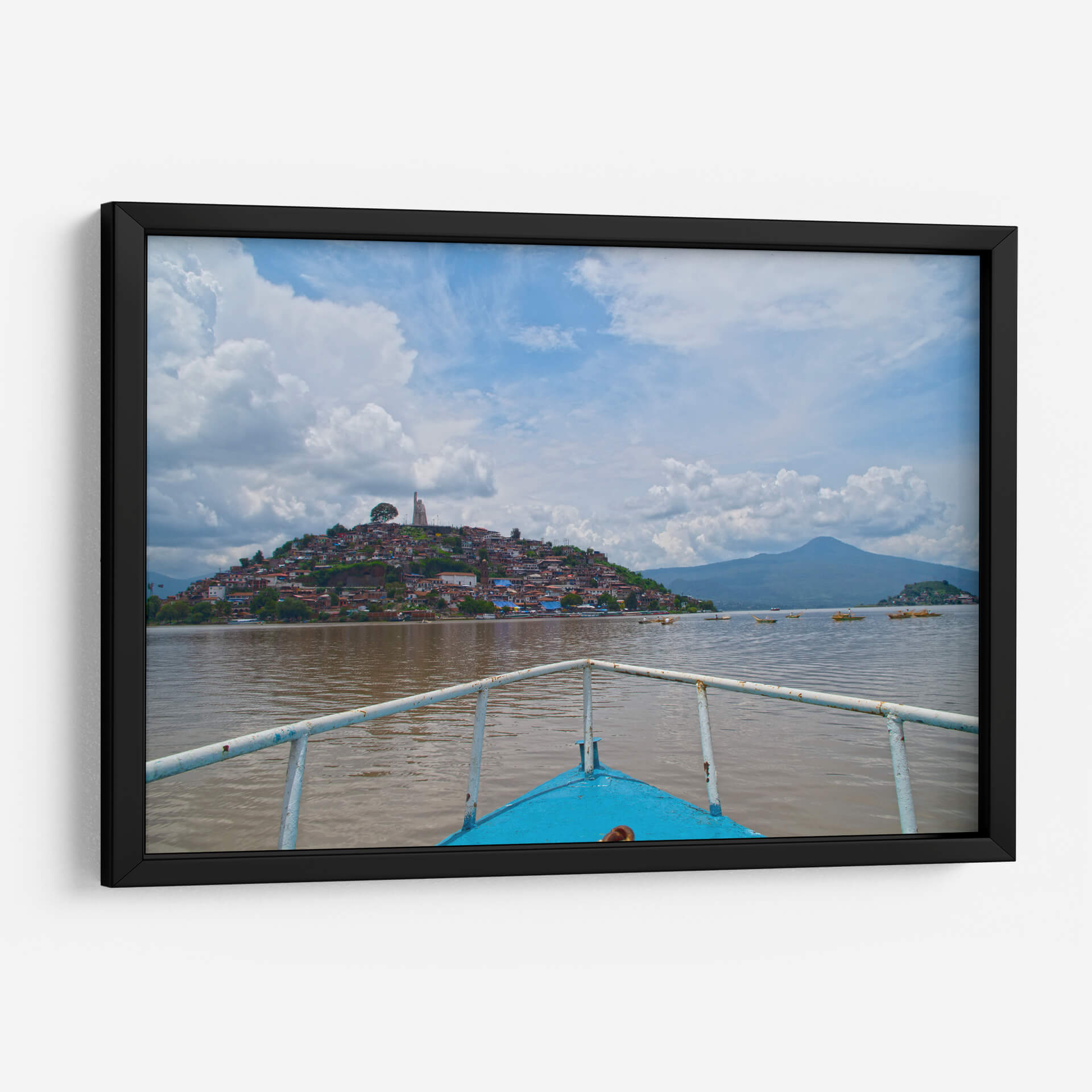 Captura la esencia de una escapada tranquila con este evocador cuadro decorativo 'Isla de Janitzio, Pesca'. La obra presenta una vibrante vista de la icónica isla, emergiendo majestuosamente de las aguas de un lago, coronada por un monumento distintivo y un denso caserío que desciende por la colina. La perspectiva desde la proa de una embarcación azul añade una dimensión dinámica, invitando al espectador a embarcarse en un viaje visual. El cielo, adornado con nubes algodonosas que juegan con la luz del día, crea una atmósfera serena pero viva. La paleta de colores, dominada por los tonos tierra de los edificios, el azul profundo del agua y el cielo, y los toques de verde de la vegetación, ofrece una sensación de calidez y autenticidad. Este cuadro es ideal para quienes buscan infundir a sus hogares u oficinas una conexión con la naturaleza, la cultura y la tranquilidad de un paisaje lacustre. Su composición fotográfica realista captura la belleza cotidiana de un momento de pesca, ofreciendo una pieza de arte de pared que es a la vez inspiradora y relajante, perfecta para salones, comedores o cualquier espacio que necesite un toque de serenidad y carácter.