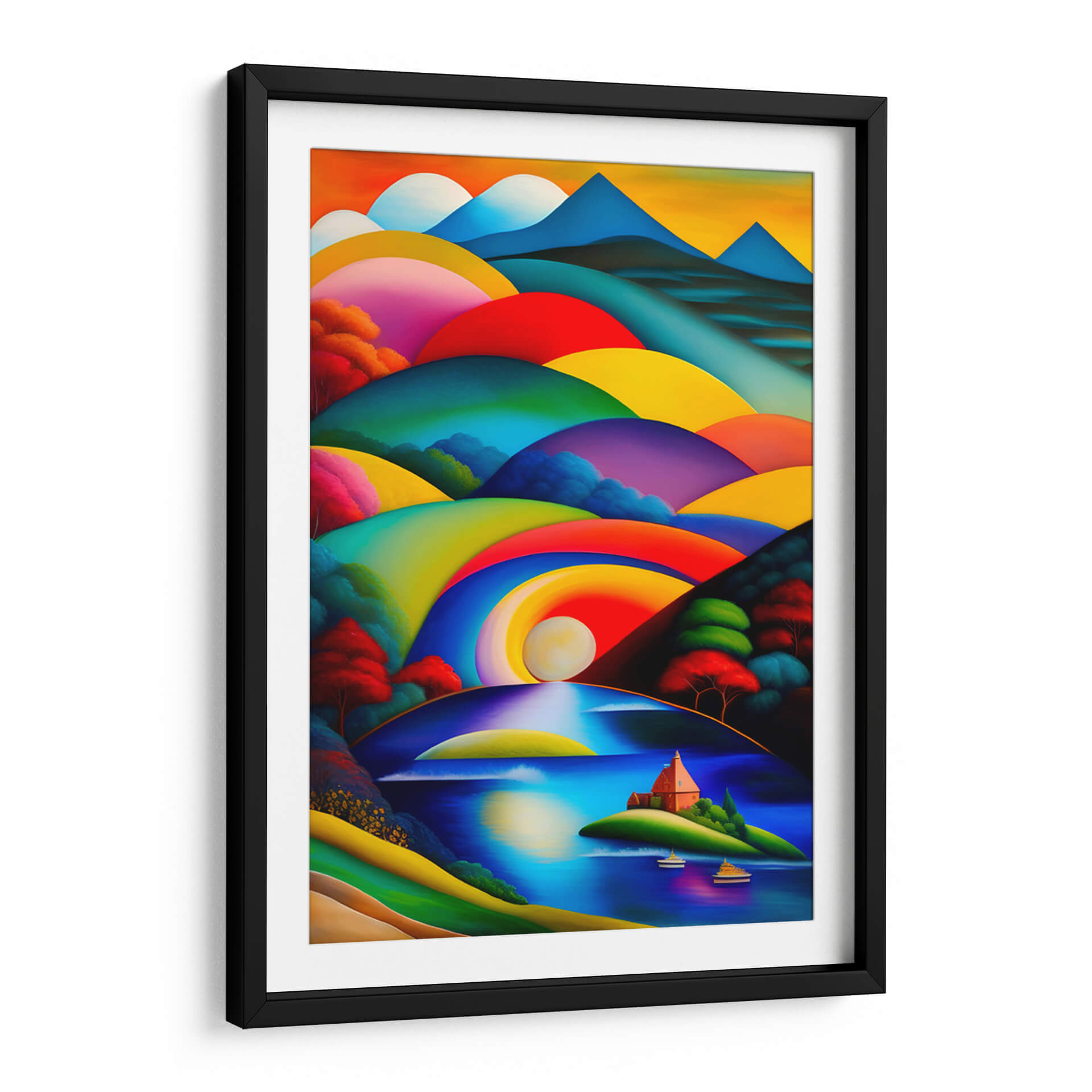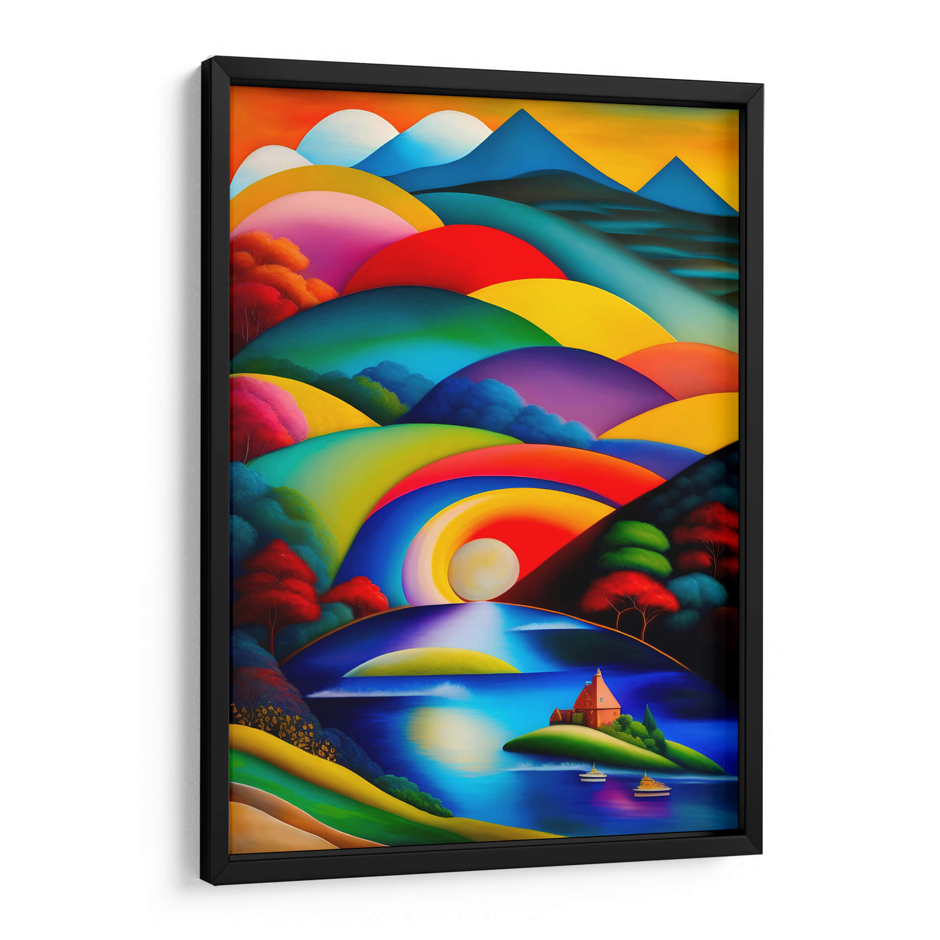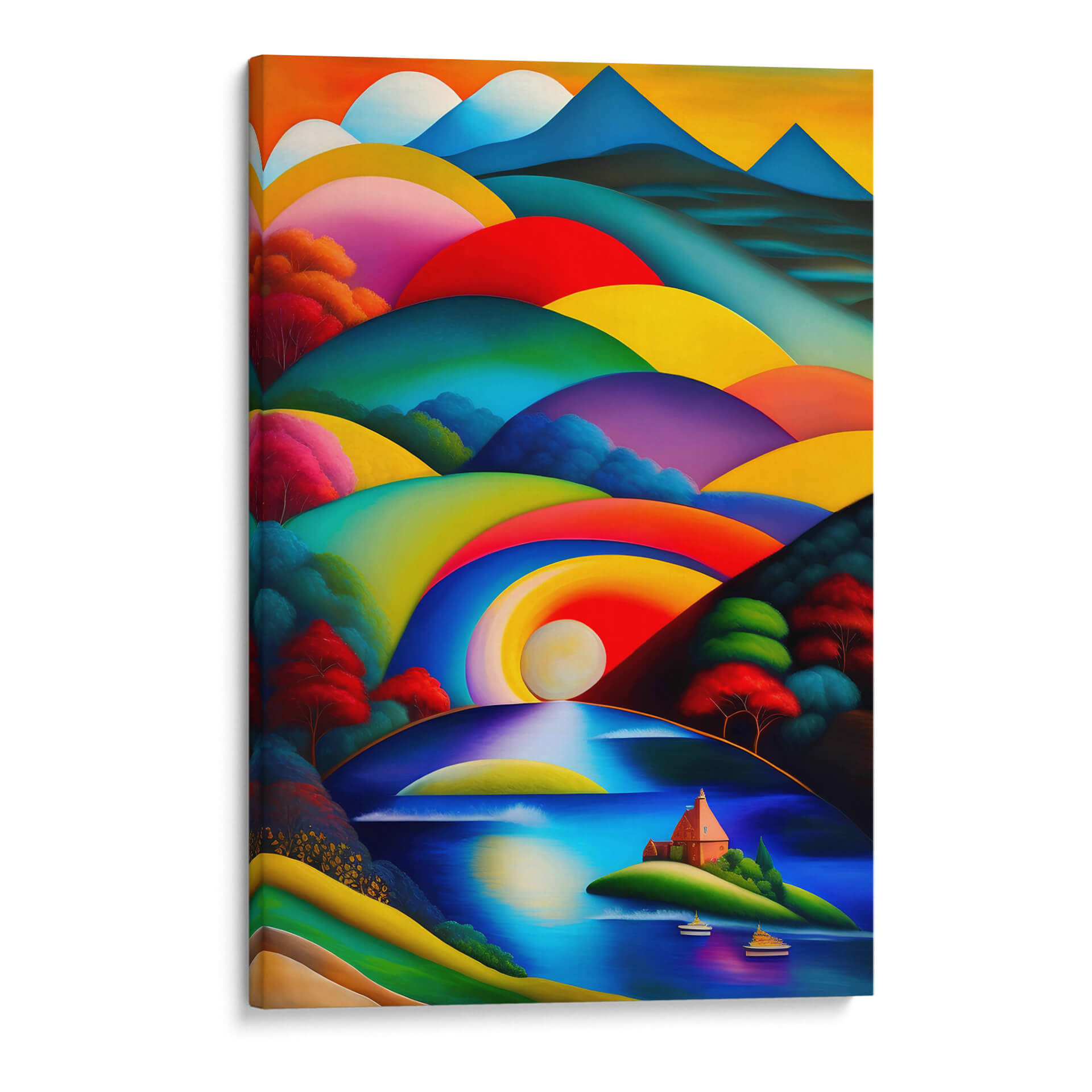 Sumérgete en la vibrante y onírica escena de "Isla Luminosa", una obra de arte digital que irradia una energía contagiosa y una belleza cautivadora. Este cuadro decorativo te transporta a un paisaje de ensueño donde las colinas ondulantes se visten con una paleta de colores psicodélicos, desde vibrantes naranjas y amarillos que evocan un atardecer surrealista, hasta profundos azules y púrpuras que pintan un cielo enigmático. El centro de la composición lo domina un sol radiante o una luna llena, reflejándose en un cuerpo de agua sereno que rodea una pequeña isla con una encantadora casa de arquitectura clásica. La escena se complementa con barcos navegando tranquilamente y árboles frondosos en tonos intensos de rojo y verde, creando una atmósfera de paz y asombro.
