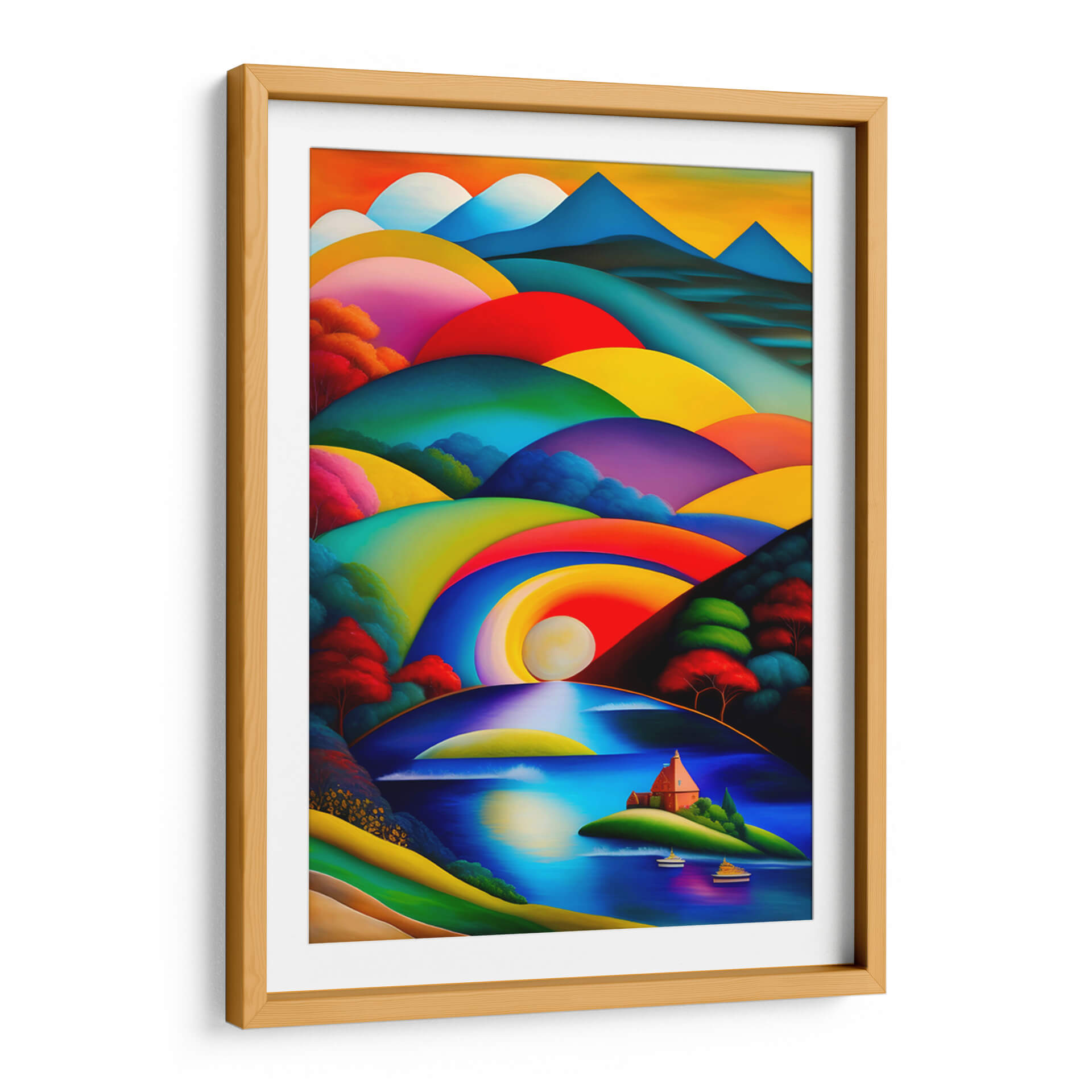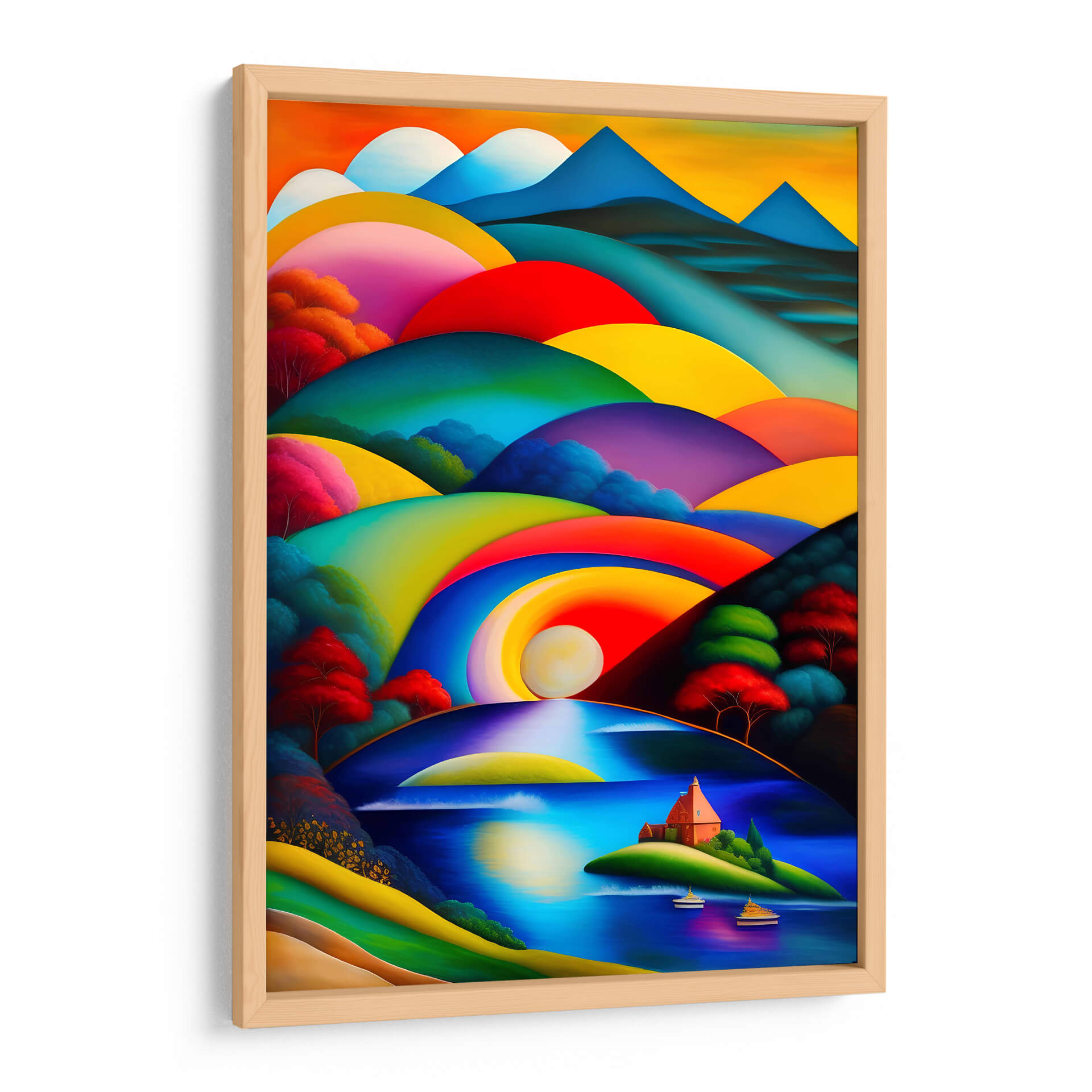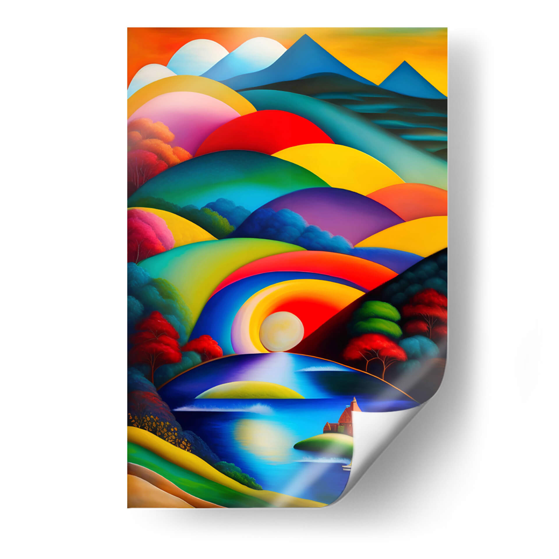 Sumérgete en la vibrante y onírica escena de "Isla Luminosa", una obra de arte digital que irradia una energía contagiosa y una belleza cautivadora. Este cuadro decorativo te transporta a un paisaje de ensueño donde las colinas ondulantes se visten con una paleta de colores psicodélicos, desde vibrantes naranjas y amarillos que evocan un atardecer surrealista, hasta profundos azules y púrpuras que pintan un cielo enigmático. El centro de la composición lo domina un sol radiante o una luna llena, reflejándose en un cuerpo de agua sereno que rodea una pequeña isla con una encantadora casa de arquitectura clásica. La escena se complementa con barcos navegando tranquilamente y árboles frondosos en tonos intensos de rojo y verde, creando una atmósfera de paz y asombro.