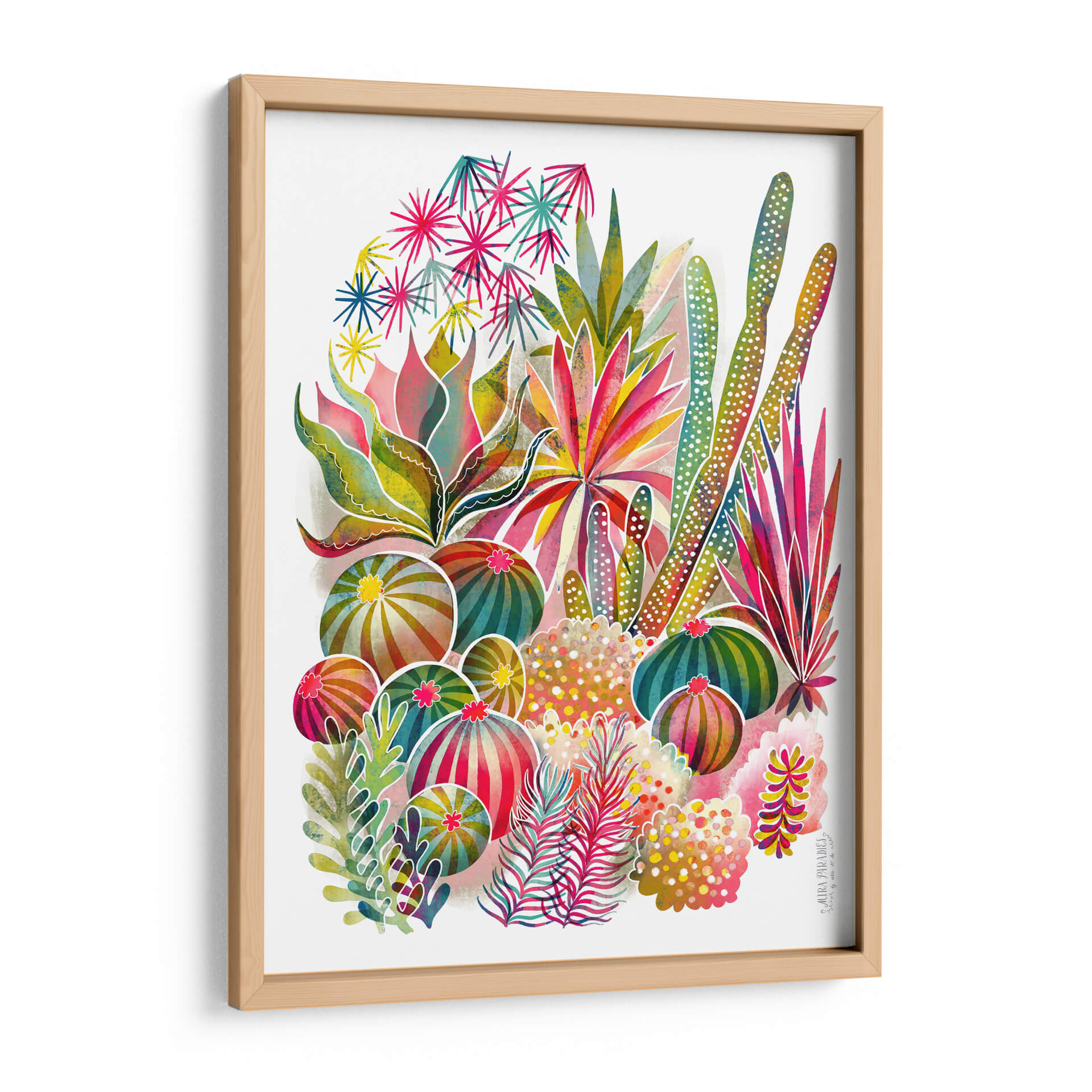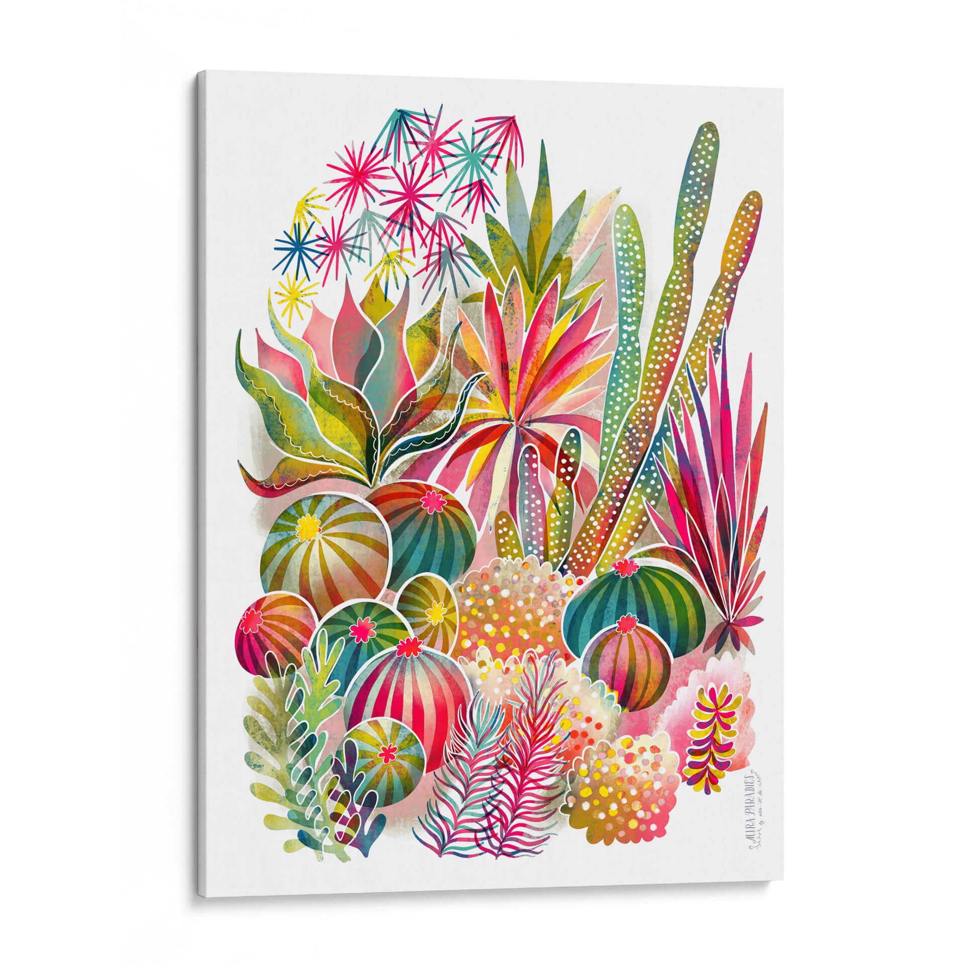 Sumérgete en un estallido de color y vida con nuestro cuadro decorativo 'Jardín de Suculentas Florecidas y Cactus'. Esta obra de arte, inspirada en el vibrante mundo botánico, presenta una composición exuberante de suculentas y cactus en una explosión de tonos que van desde el fucsia y el naranja hasta el verde esmeralda y el azul cielo. Cada planta está representada con un estilo moderno y detallado, con contornos definidos y texturas sugeridas que le dan profundidad y carácter. Las formas redondas y alargadas de las suculentas se entrelazan con las formas puntiagudas de los cactus, creando un equilibrio visual dinámico. La paleta de colores, intensamente saturada y alegre, evoca una sensación de vitalidad y optimismo, transformando cualquier espacio en un oasis de frescura. Ideal para quienes buscan añadir un toque de naturaleza estilizada y contemporánea a su hogar u oficina, este cuadro decorativo es una pieza que atrae miradas y transmite energía positiva. Su diseño versátil lo hace perfecto para salones modernos, dormitorios llenos de personalidad o incluso espacios de trabajo que necesiten un toque de inspiración botánica y artística. Un verdadero deleite visual que captura la belleza exuberante de la flora desértica con una sensibilidad artística única.