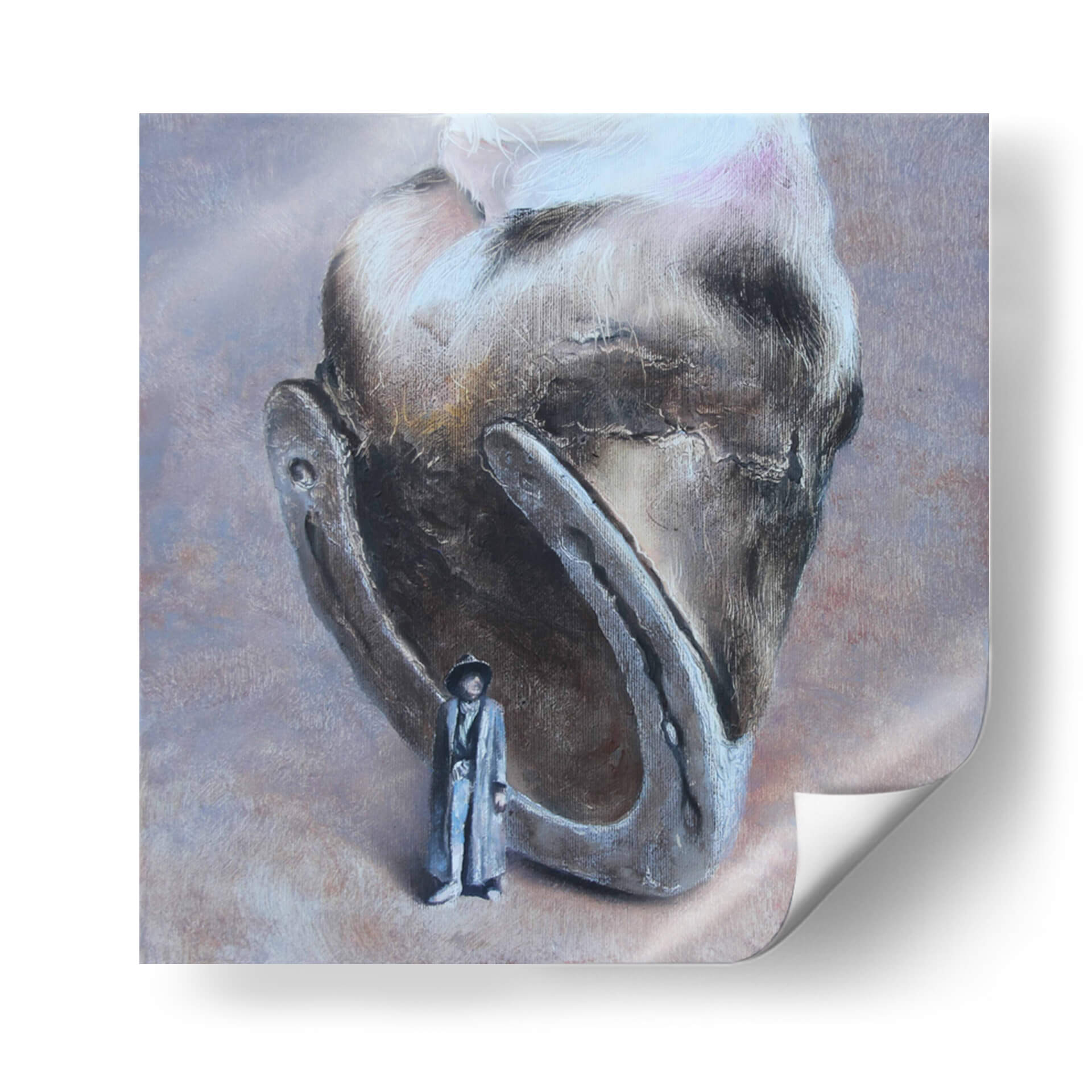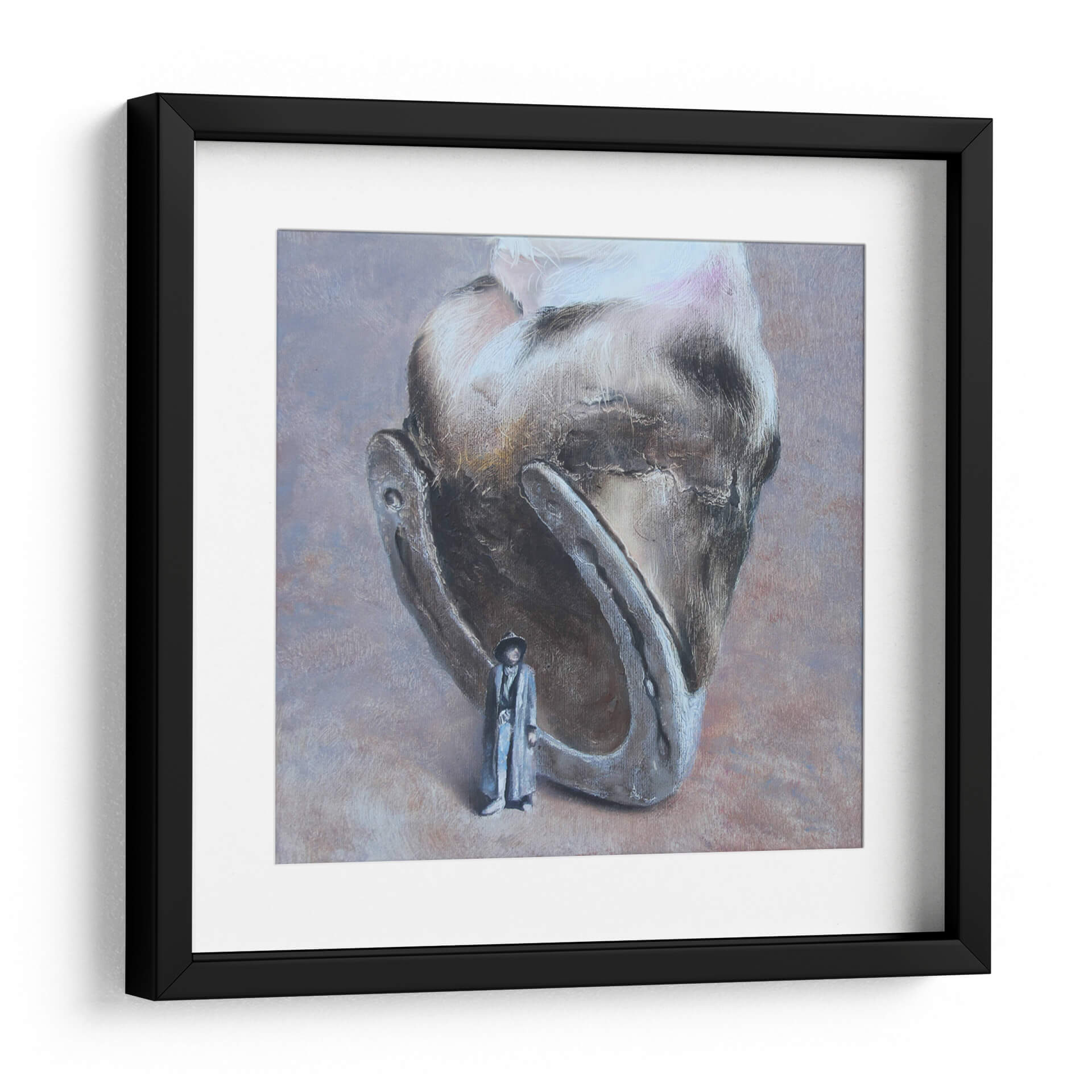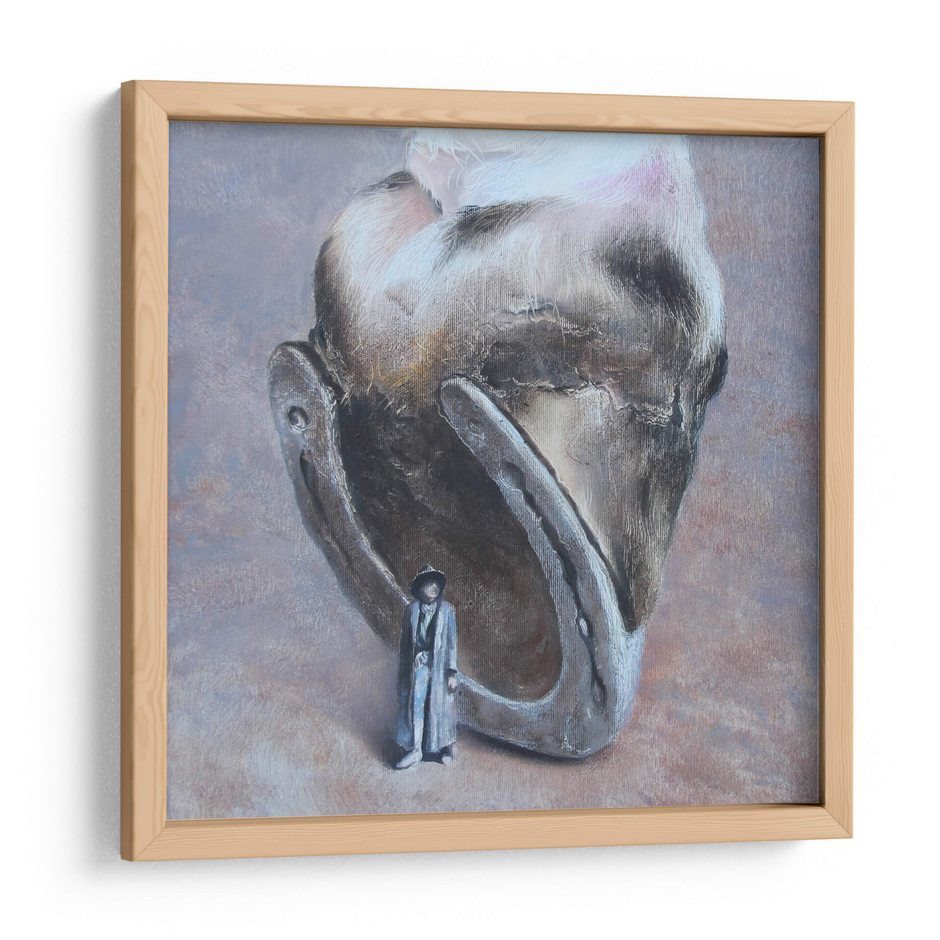 Sumérgete en el enigmático mundo de "Jefe", una obra de Rudolf Kosow que desafía las convenciones visuales. Este cuadro decorativo presenta una perspectiva audaz y surrealista, colocando una figura humana diminuta frente a una inmensa y detallada herradura, que domina el lienzo con su presencia metálica y texturizada. La paleta de colores, compuesta por tonos tierra, grises suaves y sutiles toques de rosa y blanco en la crin de lo que parece ser una bestia, crea una atmósfera introspectiva y misteriosa. La composición juega con las escalas, generando una sensación de asombro y reflexión sobre la relación entre el individuo y las fuerzas monumentales que lo rodean. El estilo pictórico, con pinceladas visibles que aportan profundidad y carácter, invita a contemplar los detalles intrincados de la herradura y la fragilidad de la figura humana. Este cuadro es ideal para espacios que buscan un punto de conversación, como una sala de estar moderna, un estudio o una oficina, aportando un toque de originalidad y pensamiento profundo. La obra de Kosow no solo decora, sino que también provoca y estimula la imaginación, convirtiéndose en una pieza central que invita a la interpretación personal y al diálogo.