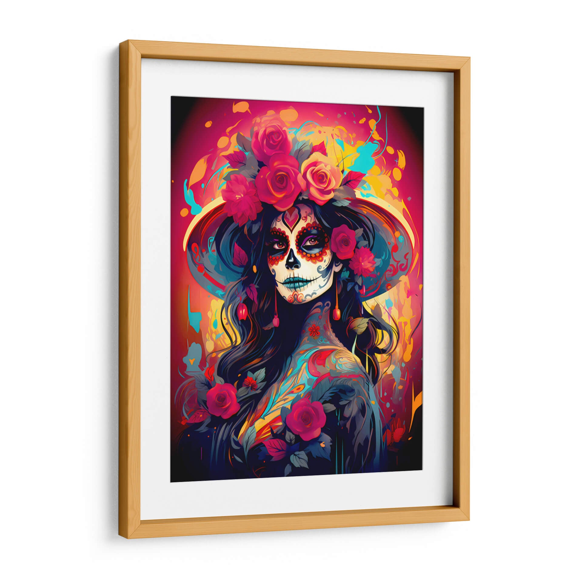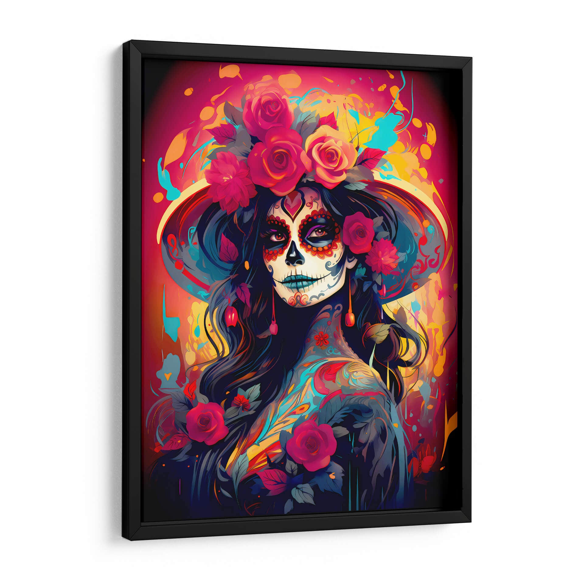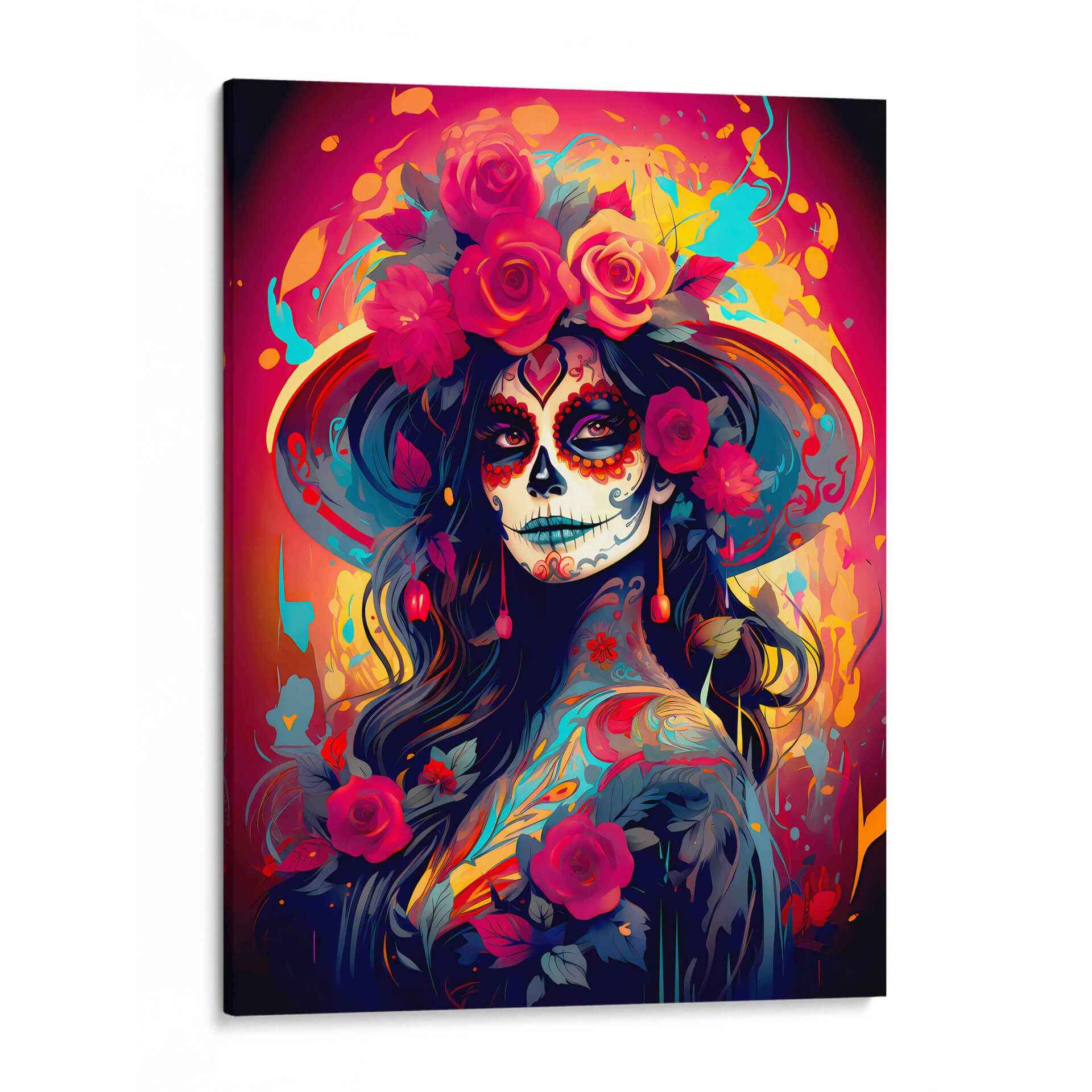 Sumérgete en la vibrante y enigmática representación de 'La Catrina - Día de Muertos - 7', una obra de arte contemporáneo que captura la esencia de una de las tradiciones más emblemáticas de México con un estilo visual impactante. Esta pieza, creada por DeLaVegaGaming, presenta una figura femenina adornada con el tradicional maquillaje de calavera, rodeada de exuberantes rosas rojas y un fondo abstracto lleno de energía y color. La paleta de colores, dominada por tonos intensos de fucsia, naranja, amarillo y azul eléctrico, crea una atmósfera de celebración y misterio, transformando lo macabro en una celebración de la vida y la memoria. El estilo artístico fusiona elementos digitales con un toque expresionista, donde las pinceladas audaces y las formas fluidas dan vida a la composición. Este cuadro decorativo es perfecto para quienes buscan añadir un toque de audacia, cultura y sofisticación a sus espacios, ya sea en una sala de estar moderna, un estudio creativo o un comedor con carácter. 'La Catrina - Día de Muertos - 7' no es solo una decoración, sino una ventana a una rica tradición cultural, invitando a la reflexión y al disfrute visual. Su composición dinámica y sus vibrantes colores la convierten en un punto focal inolvidable para cualquier ambiente que desee un toque de arte con significado y personalidad.