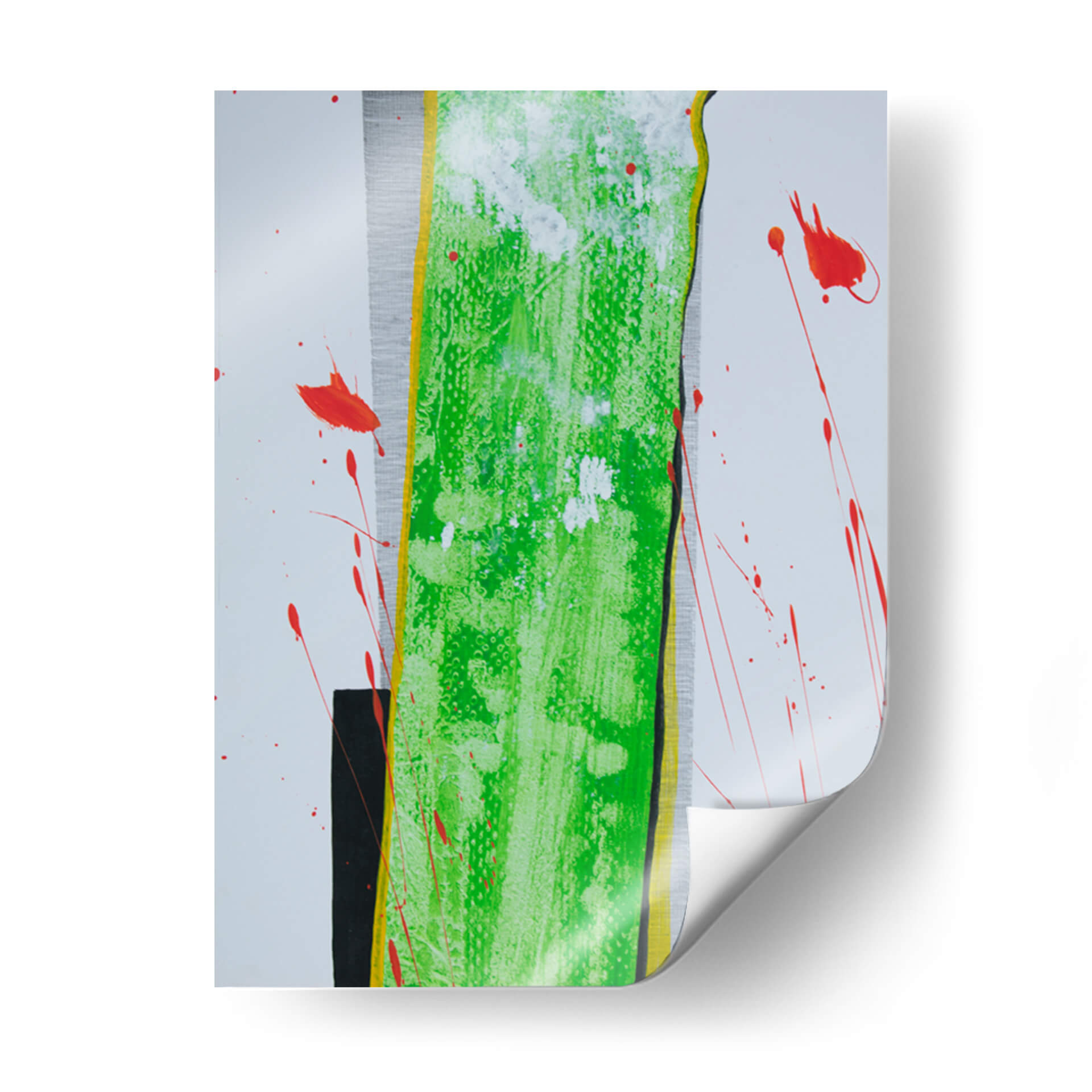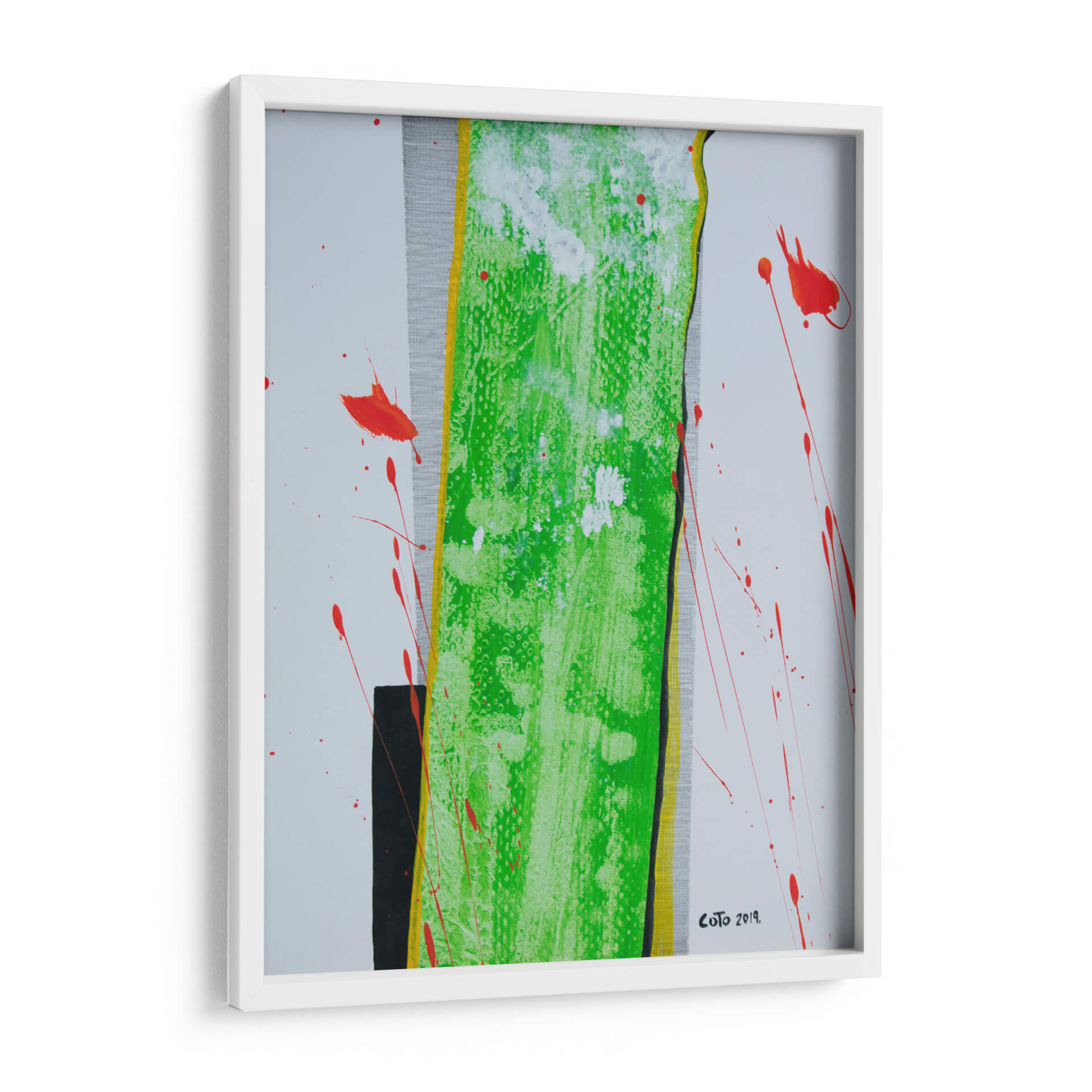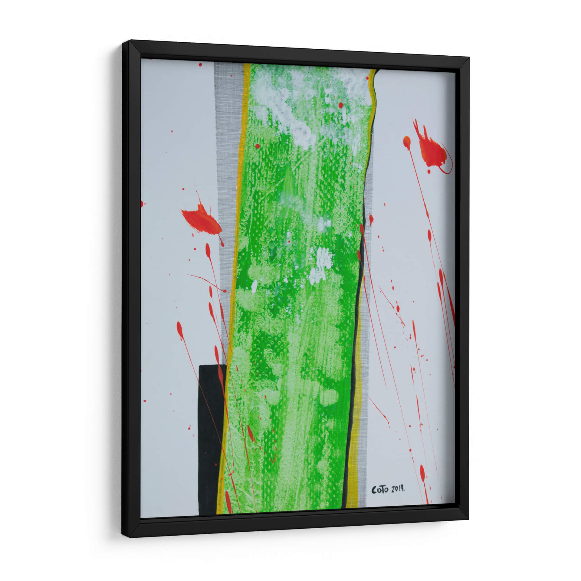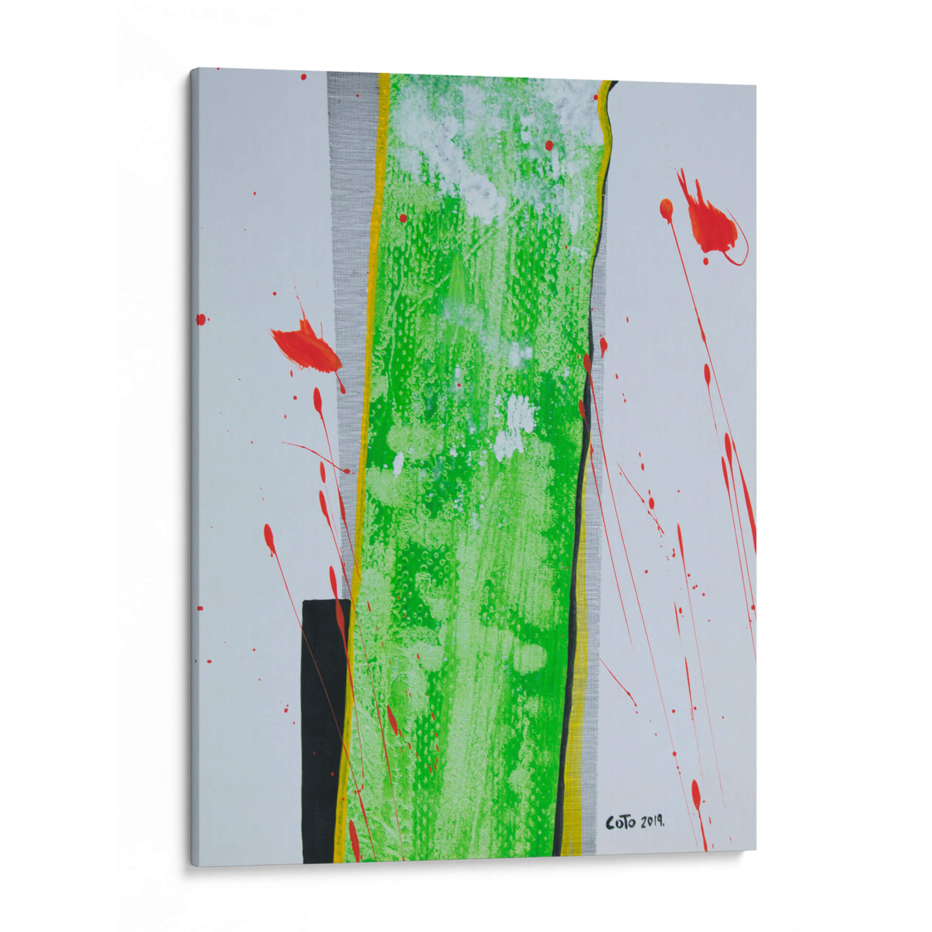 Sumérgete en la vibrante energía de "La Columna", una obra de arte contemporáneo que desafía las convenciones y cautiva la mirada. Este cuadro decorativo abstracto se caracteriza por su audaz uso del color, destacando una imponente franja central de un verde eléctrico y texturizado, bordeada por vibrantes toques de amarillo y negro. Salpicaduras de un rojo intenso rompen la serenidad del fondo blanco y gris texturizado, añadiendo un dinamismo inesperado y una sensación de movimiento que invita a la reflexión. La composición, aunque abstracta, evoca una estructura sólida y vertical, similar a una columna, que se ve acentuada por las líneas y contrastes. Es una pieza que combina la fuerza con una delicada explosión de color, perfecta para inyectar personalidad y un toque de arte moderno a cualquier espacio. Ideal para salas de estar, oficinas o cualquier lugar donde se busque un punto focal inspirador y lleno de vida. "La Columna" es más que una decoración; es una declaración de estilo y una invitación a experimentar la abstracción en su máxima expresión, aportando sofisticación y un toque de vanguardia a tu ambiente.