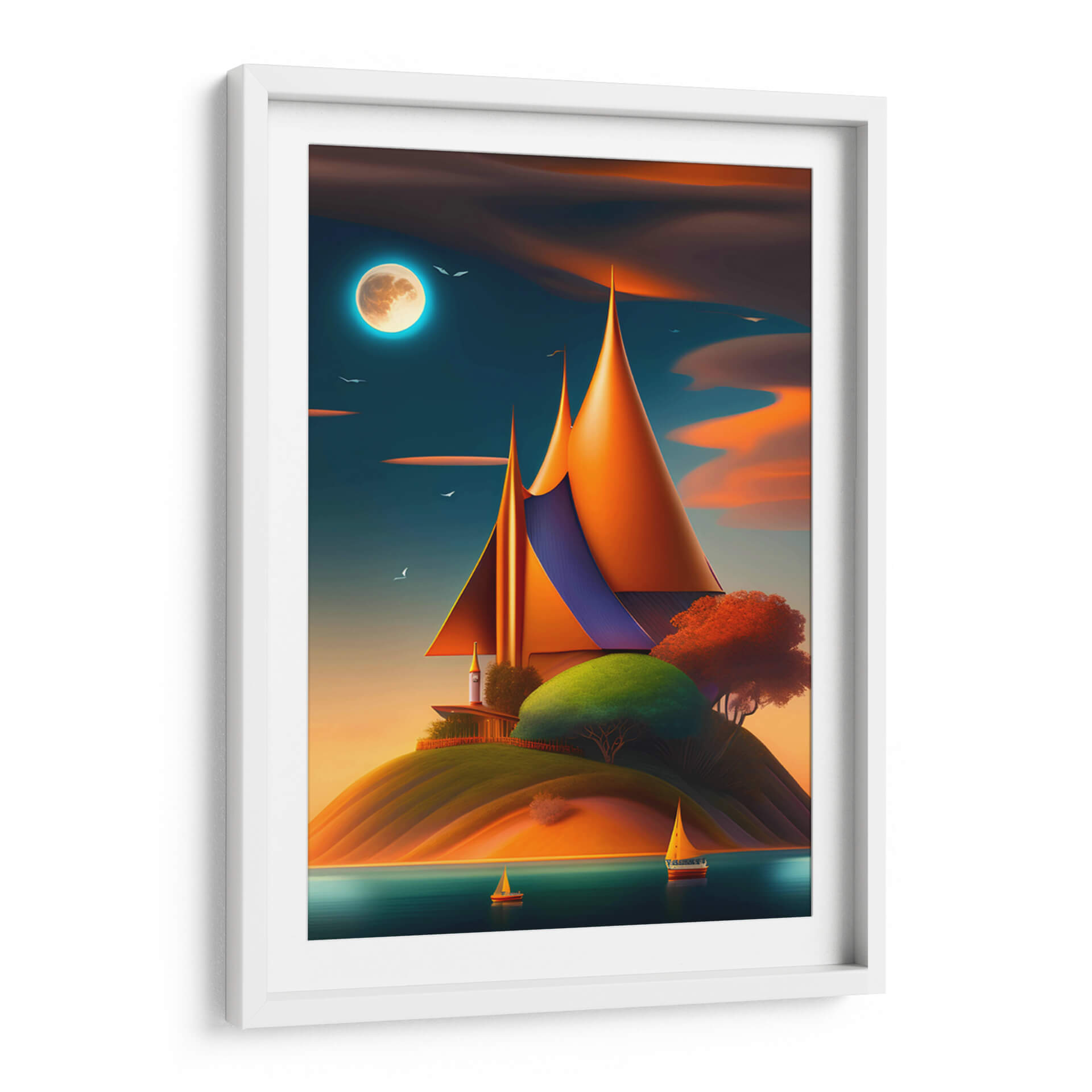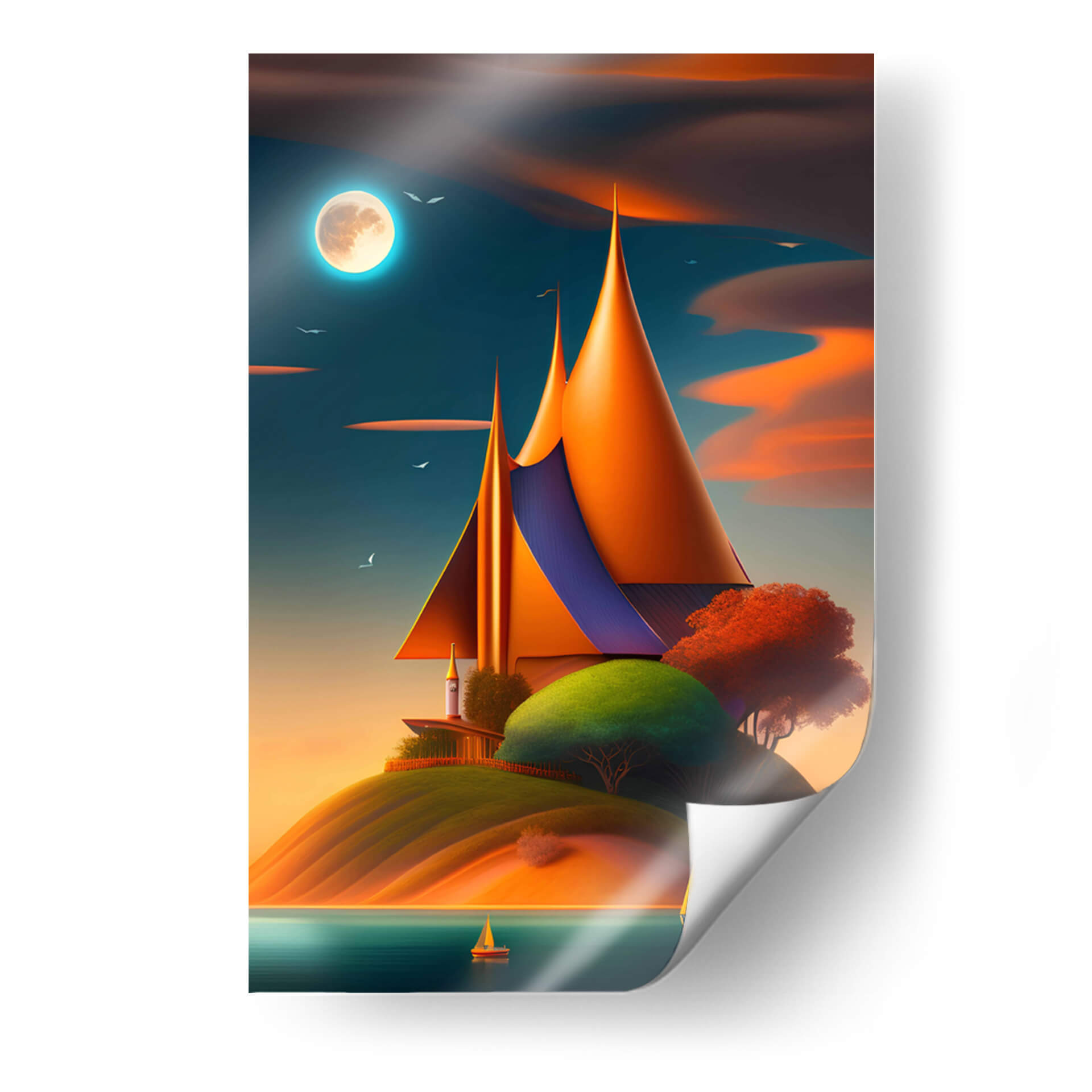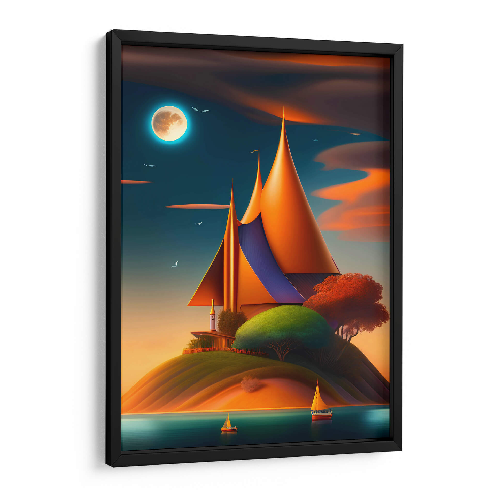 Sumérgete en la enigmática belleza de "Lago Astronomía", una obra de arte digital que evoca un sentido de maravilla y fantasía. La pieza presenta una arquitectura singular, con estructuras cónicas anaranjadas que se alzan majestuosamente sobre una colina verde y exuberante, bañada por la luz dorada de un atardecer o amanecer. Una luna llena, vibrante y luminosa, domina el cielo nocturno, salpicado por nubes dramáticas en tonos naranjas y morados, junto a pequeñas siluetas de aves que surcan el aire. En las aguas tranquilas de un lago o mar sereno, dos veleros amarillos navegan pacíficamente, añadiendo un toque de serenidad y aventura a la escena. El estilo artístico es claramente digital y surrealista, con una paleta de colores rica y contrastante que combina los cálidos tonos anaranjados del atardecer con los profundos azules del cielo y el turquesa del agua. Este cuadro decorativo es perfecto para quienes buscan añadir un toque de misterio, tranquilidad y originalidad a su hogar u oficina. Ideal para salones modernos, dormitorios o estudios, "Lago Astronomía" invita a la contemplación y a la evasión, transformando cualquier espacio en un portal a otro mundo. Un cuadro abstracto que estimula la imaginación y crea una atmósfera de ensueño.