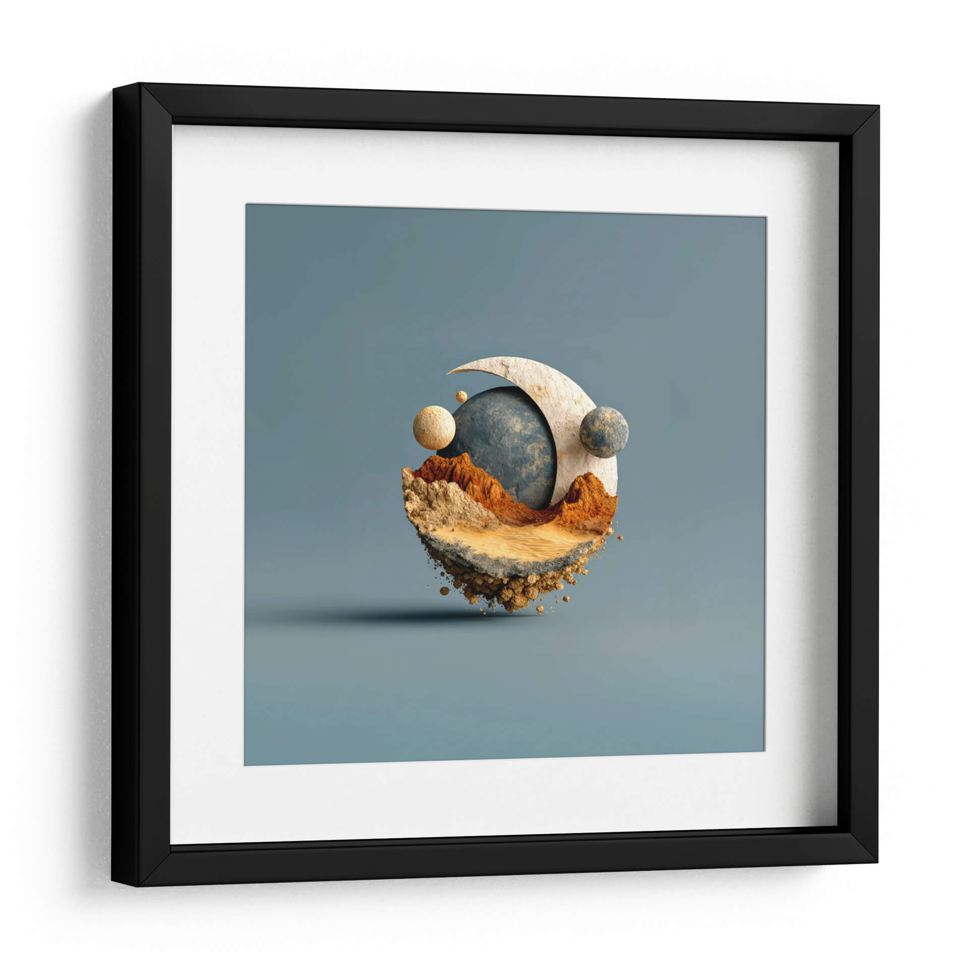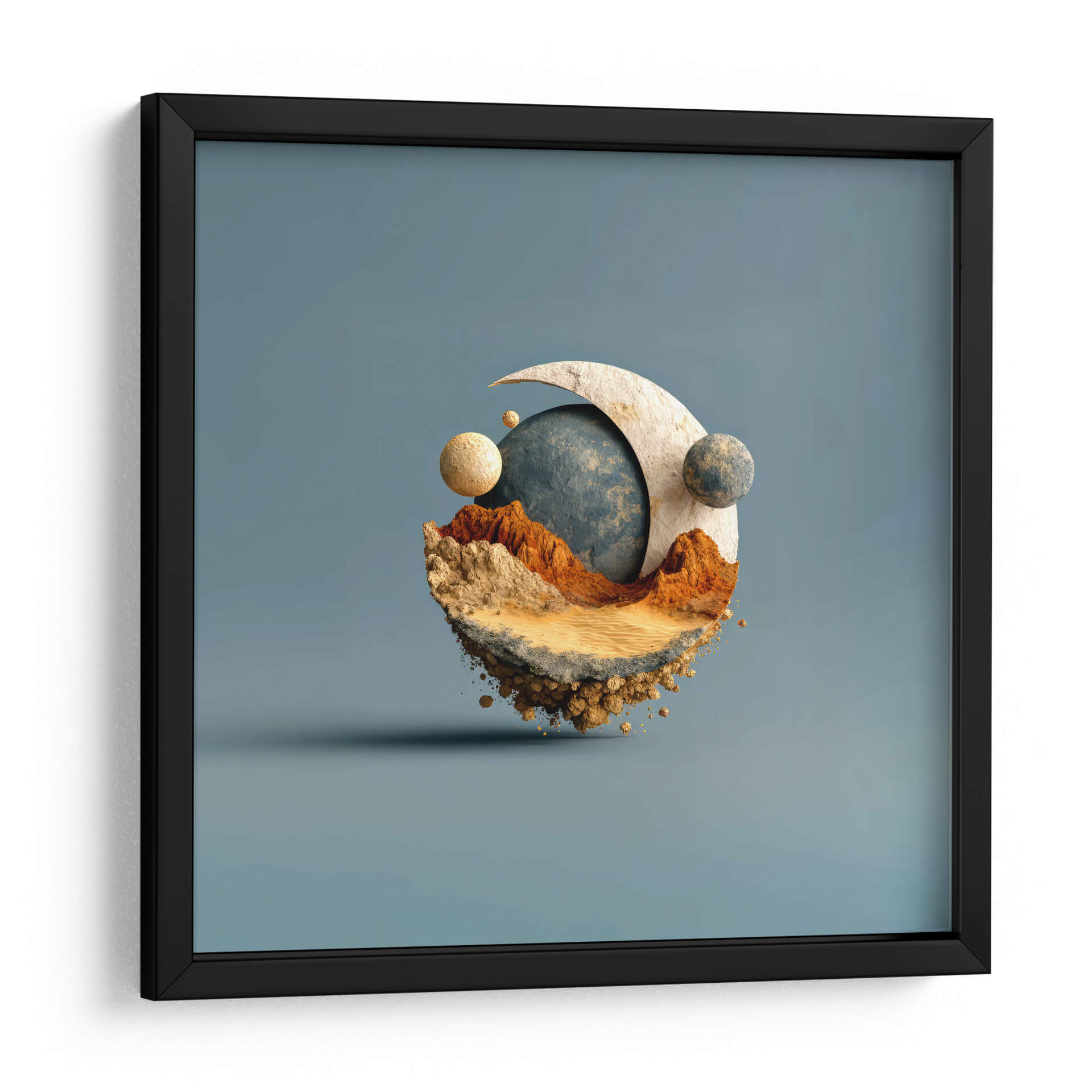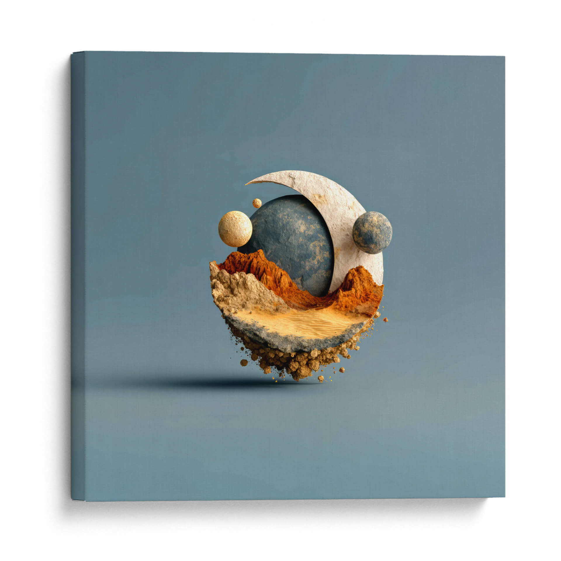 Adéntrate en un universo en miniatura con 'Lejos de Casa - 012', una obra de arte digital que evoca la exploración espacial y la fantasía. La pieza presenta un fragmento de tierra flotante, adornado con formaciones rocosas de tonos ocres y anaranjados, que contrasta con un cielo azul profundo y sereno. Elementos celestes como una luna creciente de textura rústica y orbes planetarios sutilmente texturizados completan la escena, invitando a la contemplación. La composición cuidadosa y el uso de una paleta de colores terrosos y celestes crean una atmósfera de misterio y asombro, perfecta para añadir un toque de originalidad y sofisticación a cualquier espacio moderno. Este cuadro decorativo es ideal para inspirar la imaginación en oficinas, salas de estar o estudios, fusionando elementos surrealistas con una estética contemporánea. Su diseño abstracto y conceptual lo convierte en una pieza única para quienes buscan arte que trascienda lo ordinario y provoque conversaciones.