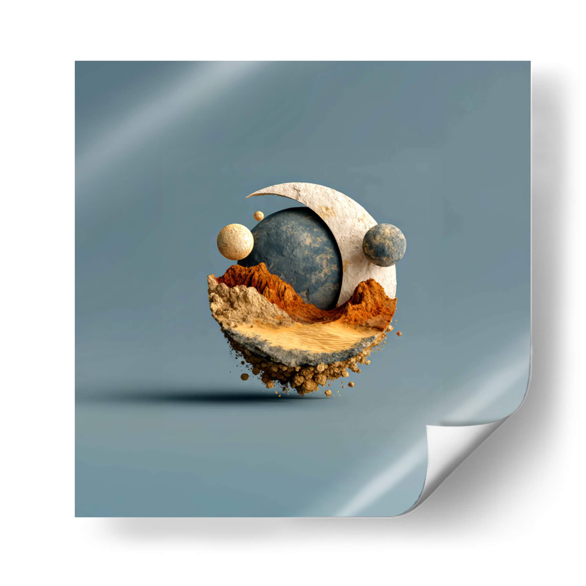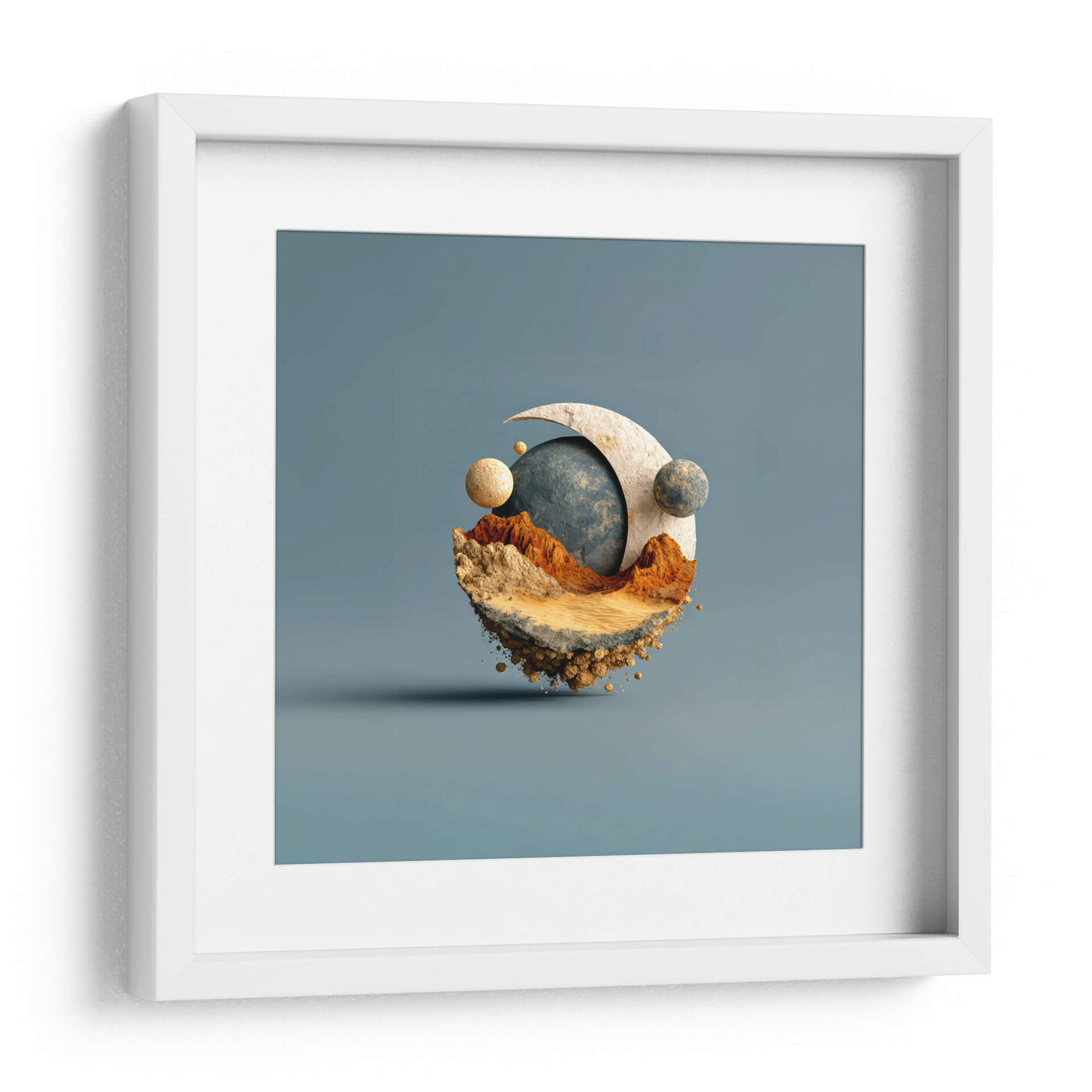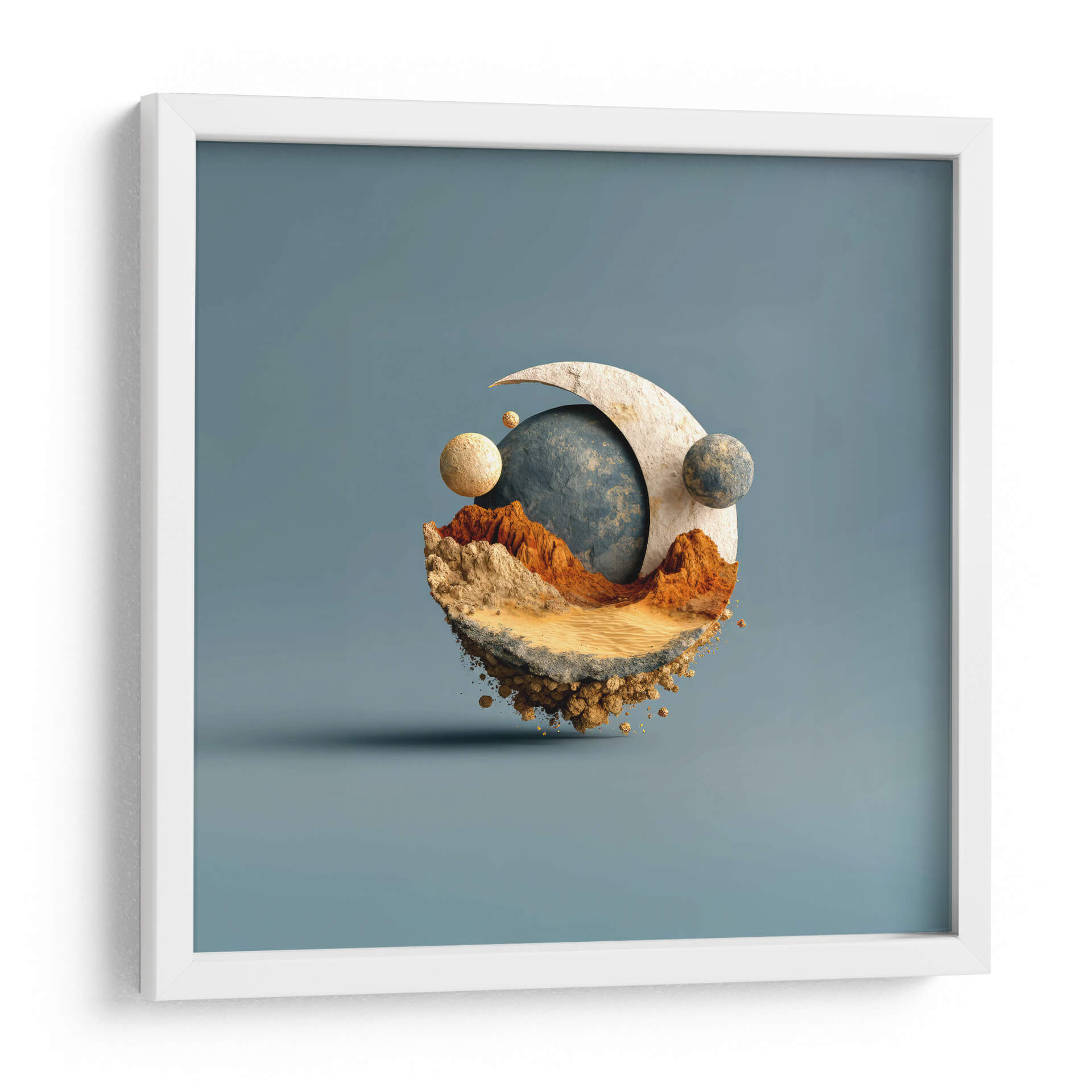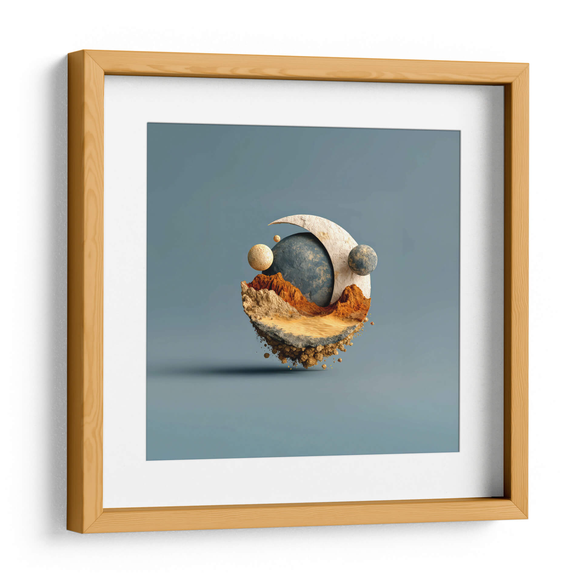 Adéntrate en un universo en miniatura con 'Lejos de Casa - 012', una obra de arte digital que evoca la exploración espacial y la fantasía. La pieza presenta un fragmento de tierra flotante, adornado con formaciones rocosas de tonos ocres y anaranjados, que contrasta con un cielo azul profundo y sereno. Elementos celestes como una luna creciente de textura rústica y orbes planetarios sutilmente texturizados completan la escena, invitando a la contemplación. La composición cuidadosa y el uso de una paleta de colores terrosos y celestes crean una atmósfera de misterio y asombro, perfecta para añadir un toque de originalidad y sofisticación a cualquier espacio moderno. Este cuadro decorativo es ideal para inspirar la imaginación en oficinas, salas de estar o estudios, fusionando elementos surrealistas con una estética contemporánea. Su diseño abstracto y conceptual lo convierte en una pieza única para quienes buscan arte que trascienda lo ordinario y provoque conversaciones.