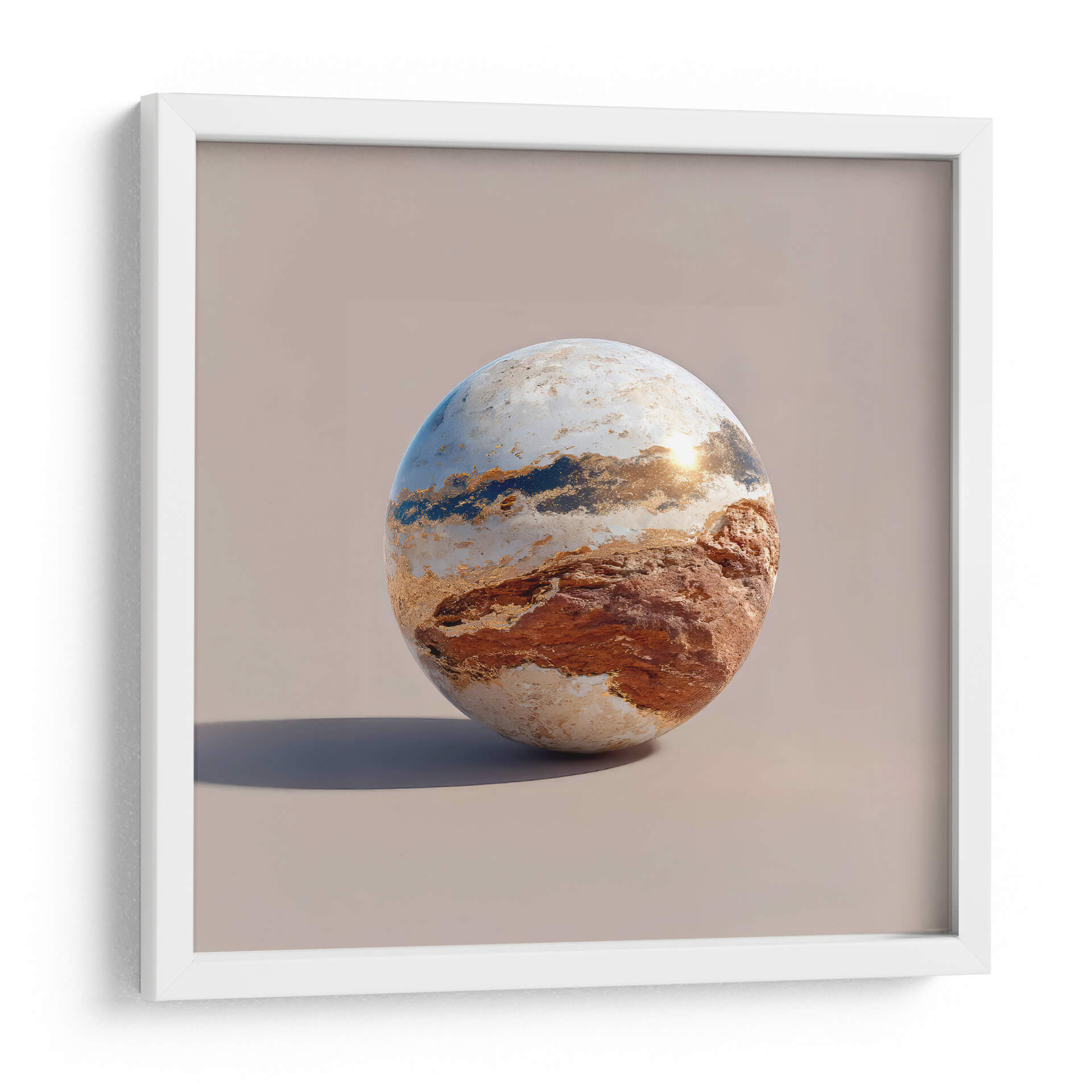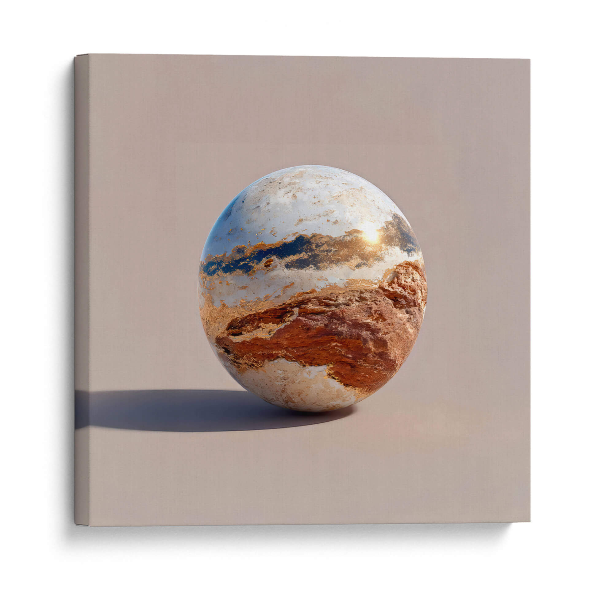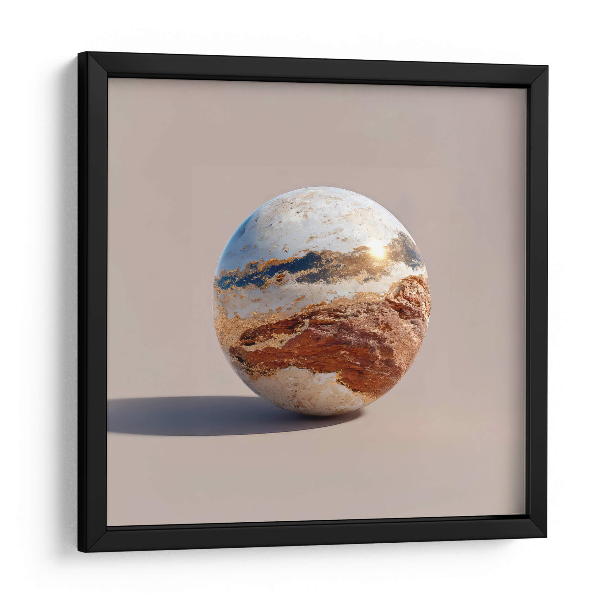 Sumérgete en la evocadora obra de arte 'Lejos de Casa - 032', una pieza que captura la esencia de la exploración y el misterio. Este cuadro decorativo presenta una esfera texturizada que recuerda a un planeta o a una formación geológica intrincada, con una superficie que combina tonos de blanco y gris claro con profundos toques de azul oscuro y vetas doradas relucientes. Las texturas rocosas y terrosas en tonos óxido y marrón se entrelazan con áreas más lisas y reflectantes, creando un contraste visual fascinante y una sensación de profundidad. La luz parece incidir en un punto de la esfera, generando un brillo cálido que añade realismo y un toque de esperanza. La composición minimalista, con la esfera central sobre un fondo neutro y liso en tono beige, permite que la obra hable por sí sola, convirtiéndose en un punto focal cautivador en cualquier espacio. 'Lejos de Casa - 032' es ideal para quienes buscan añadir un elemento de intriga y sofisticación a su hogar u oficina, evocando la vastedad del universo o la belleza de paisajes desconocidos. Este cuadro decorativo contemporáneo es perfecto para salas de estar modernas, estudios o dormitorios, aportando un aire de descubrimiento y reflexión.