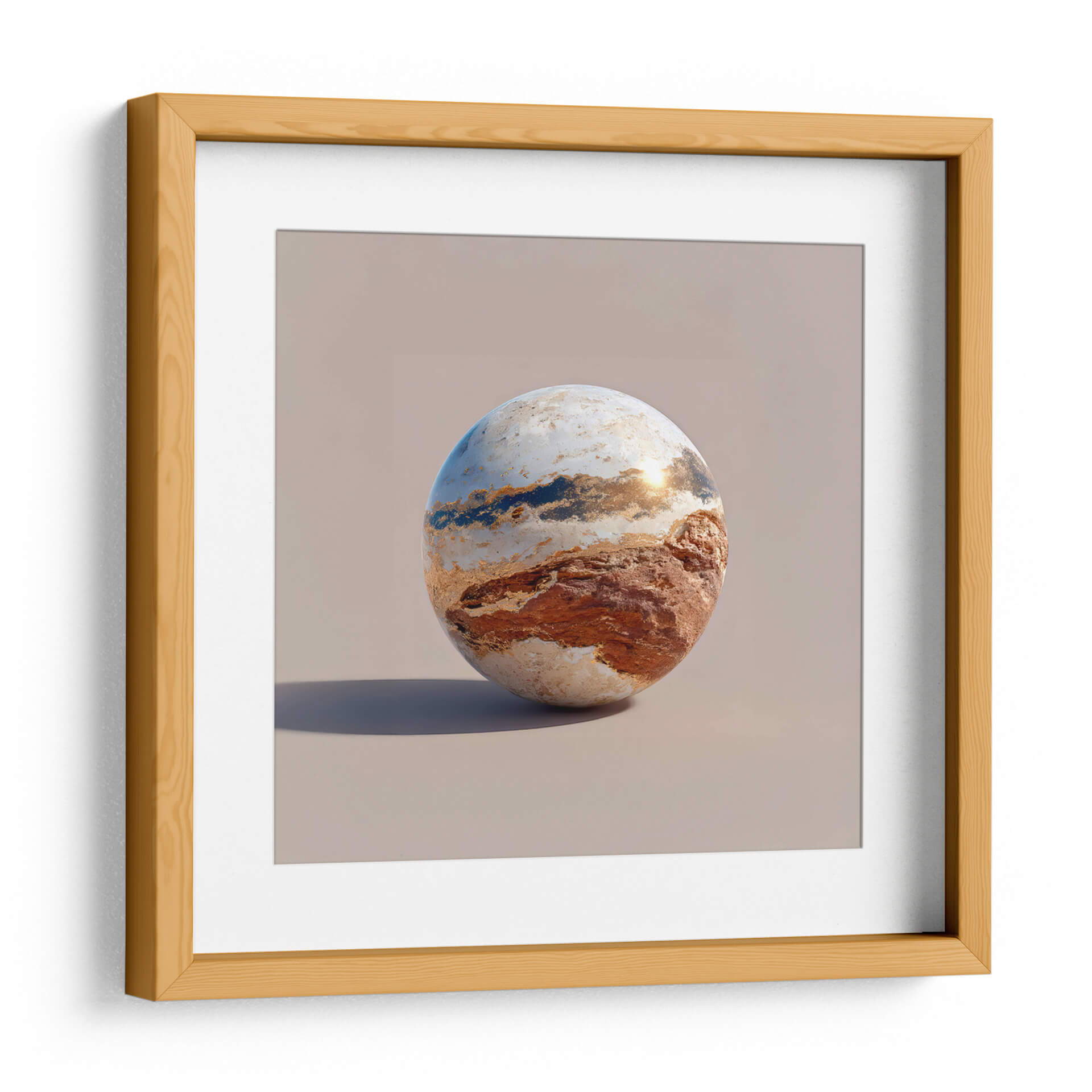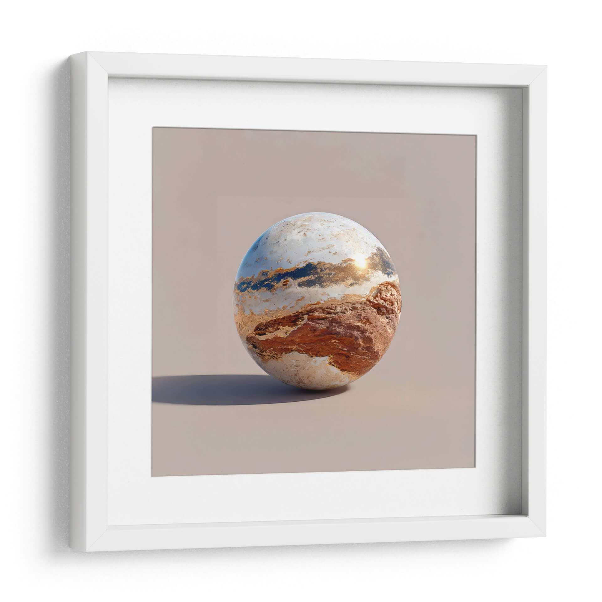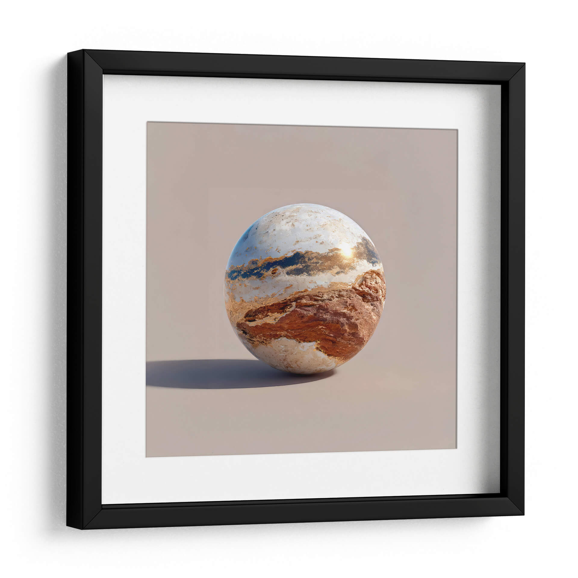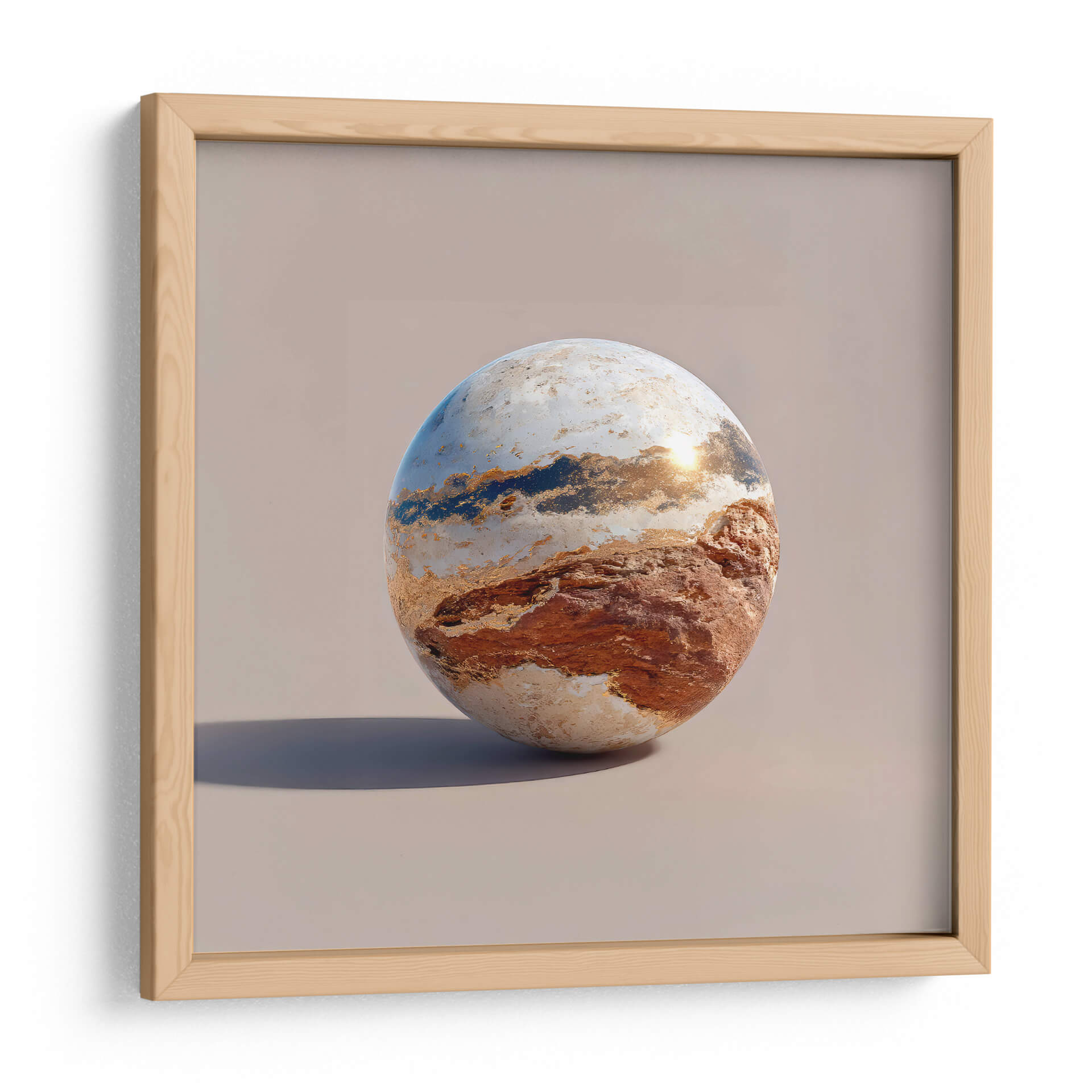 Sumérgete en la evocadora obra de arte 'Lejos de Casa - 032', una pieza que captura la esencia de la exploración y el misterio. Este cuadro decorativo presenta una esfera texturizada que recuerda a un planeta o a una formación geológica intrincada, con una superficie que combina tonos de blanco y gris claro con profundos toques de azul oscuro y vetas doradas relucientes. Las texturas rocosas y terrosas en tonos óxido y marrón se entrelazan con áreas más lisas y reflectantes, creando un contraste visual fascinante y una sensación de profundidad. La luz parece incidir en un punto de la esfera, generando un brillo cálido que añade realismo y un toque de esperanza. La composición minimalista, con la esfera central sobre un fondo neutro y liso en tono beige, permite que la obra hable por sí sola, convirtiéndose en un punto focal cautivador en cualquier espacio. 'Lejos de Casa - 032' es ideal para quienes buscan añadir un elemento de intriga y sofisticación a su hogar u oficina, evocando la vastedad del universo o la belleza de paisajes desconocidos. Este cuadro decorativo contemporáneo es perfecto para salas de estar modernas, estudios o dormitorios, aportando un aire de descubrimiento y reflexión.