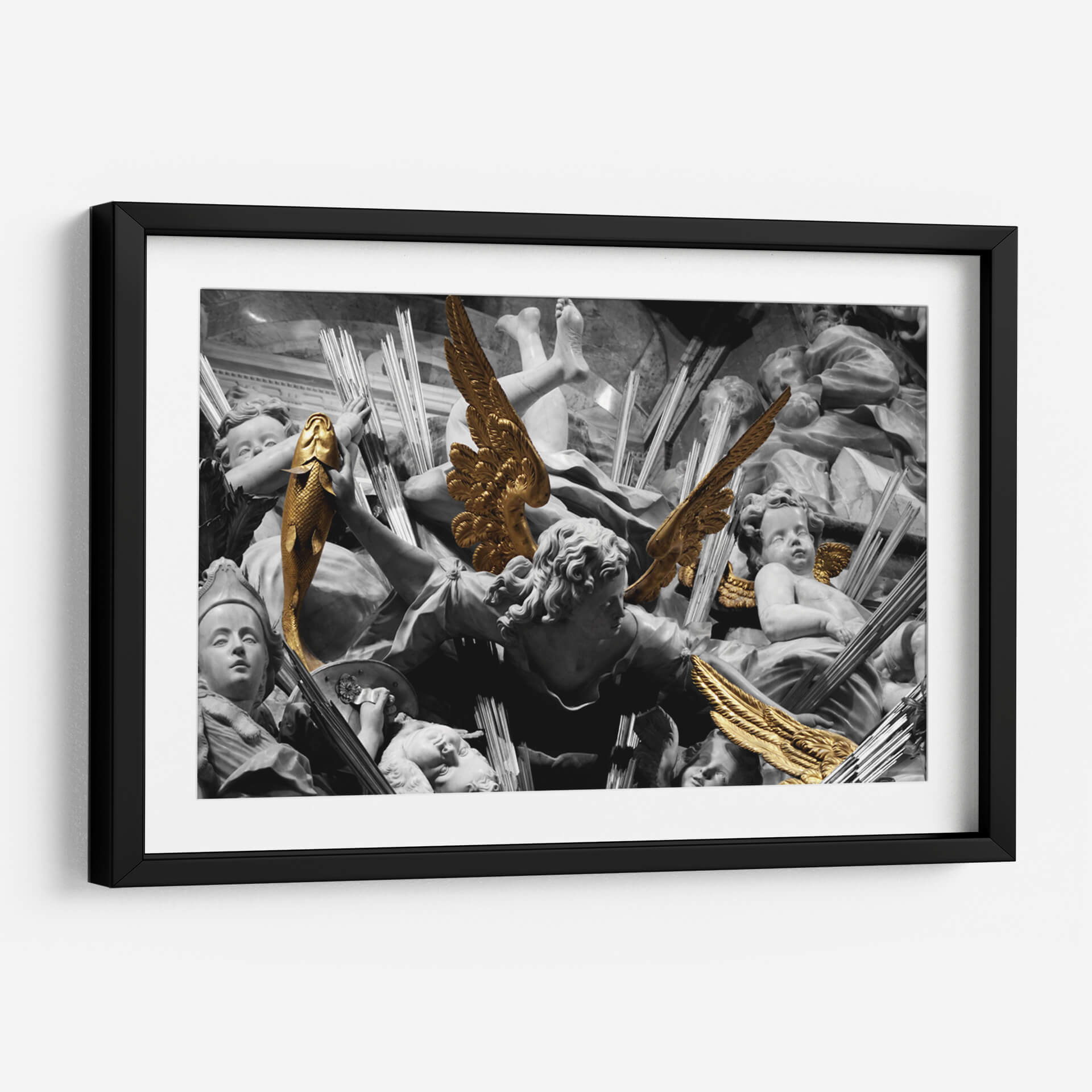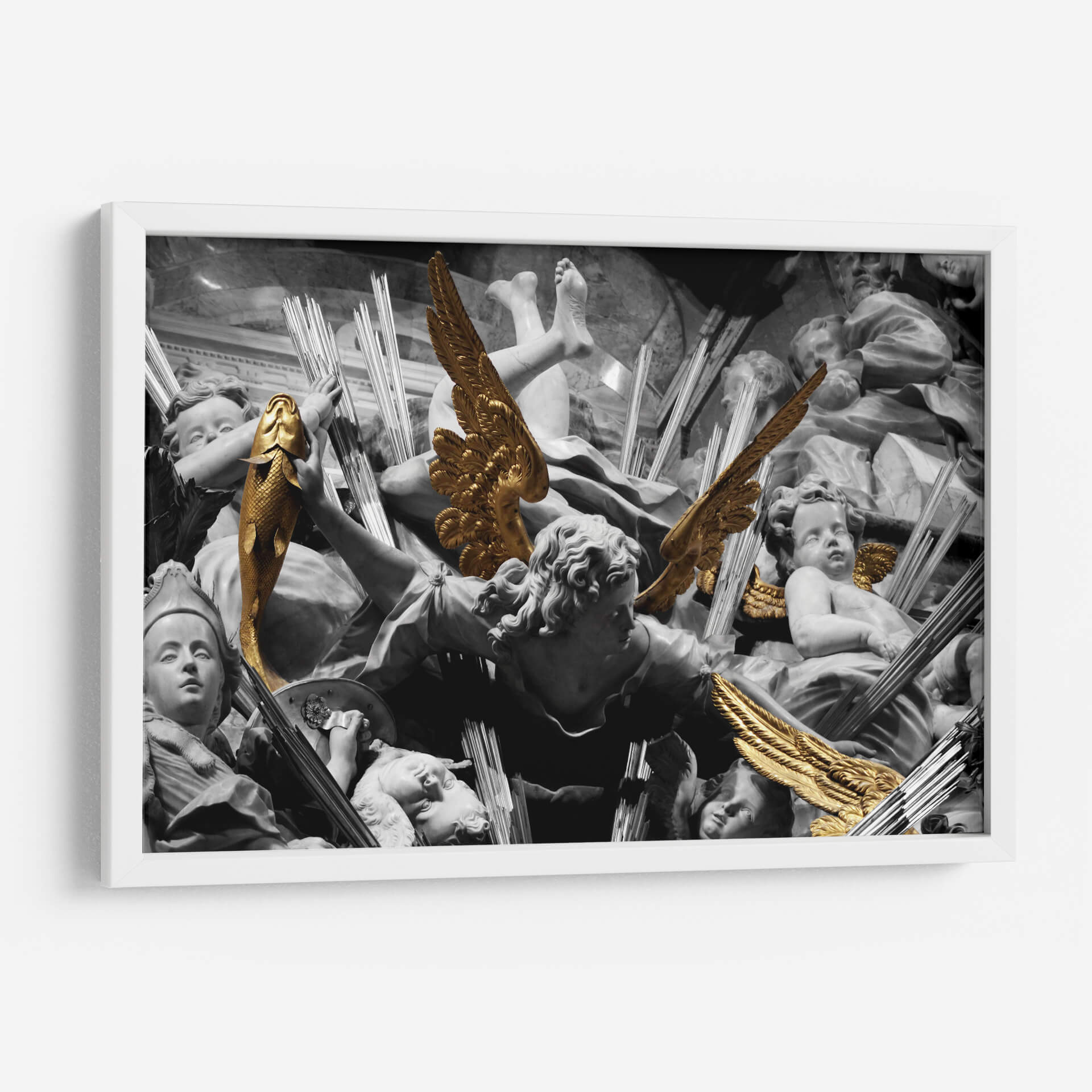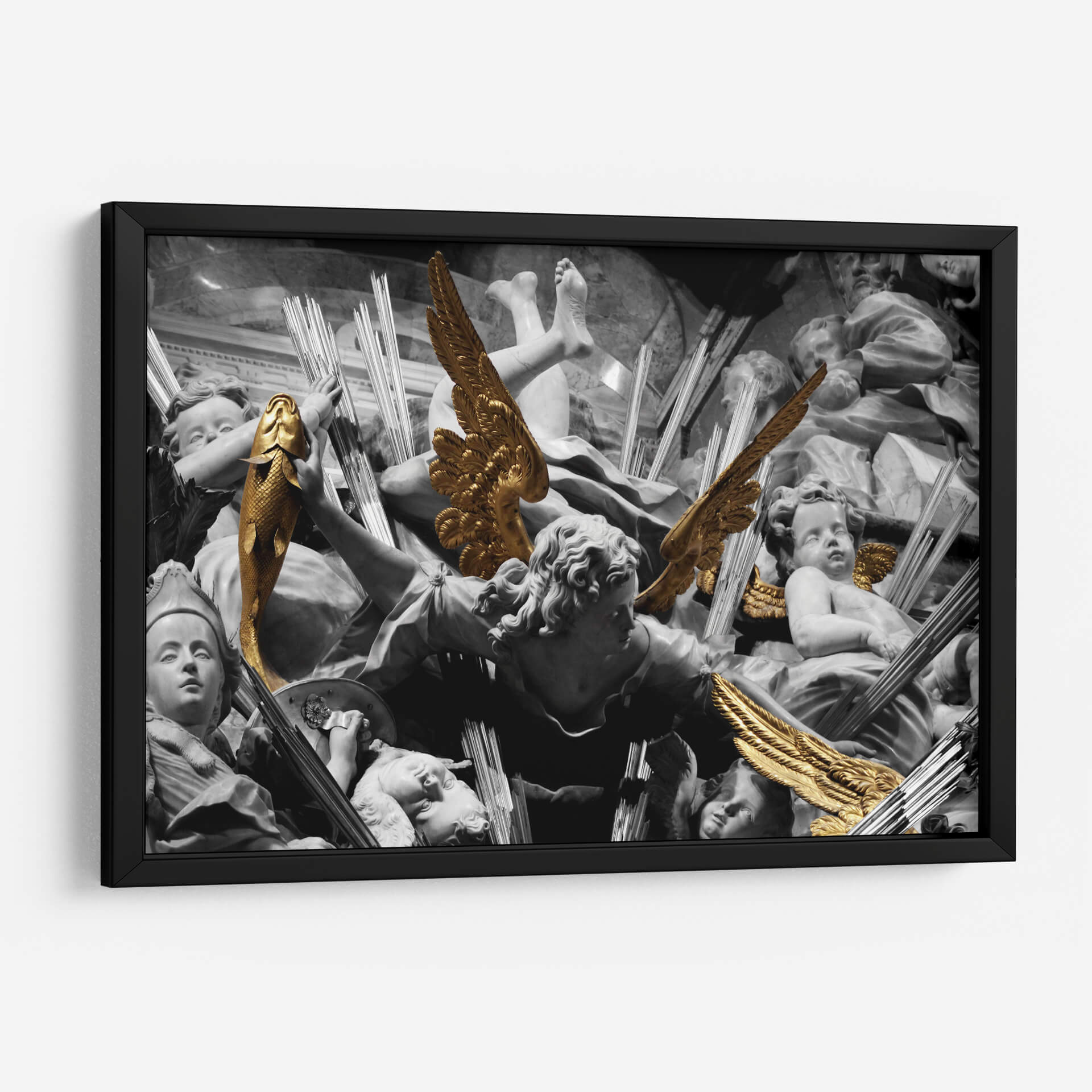 Sumérgete en la opulencia y el misterio con 'Los Arcángeles en Toledo', una obra de arte digital que redefine la decoración de paredes. Esta pieza, inspirada en la grandiosidad de la escultura clásica, fusiona elementos arquitectónicos en blanco y negro con toques dorados vibrantes. La composición intrincada presenta figuras angélicas y querubines, rodeados por haces de luz que añaden un dramatismo celestial. El detalle dorado de las alas de querubín y el pez capturan la mirada, creando un contraste impactante contra el fondo monocromático. El estilo barroco, reimaginado con una sensibilidad contemporánea, confiere a esta obra una profundidad y una narrativa visual cautivadora. Es el cuadro decorativo perfecto para quienes buscan añadir un elemento de sofisticación y espiritualidad a su hogar u oficina. Imagina este cuadro decorativo como el punto focal de tu sala de estar, aportando una atmósfera de reverencia y esplendor, o como una pieza que inspire reflexión en un espacio de estudio. "Los Arcángeles en Toledo" no es solo arte, es una invitación a contemplar la belleza eterna, transformando cualquier ambiente en una galería de arte personal. Añade esta obra maestra digital a tu colección y eleva tu decoración a nuevas alturas de elegancia y significado.