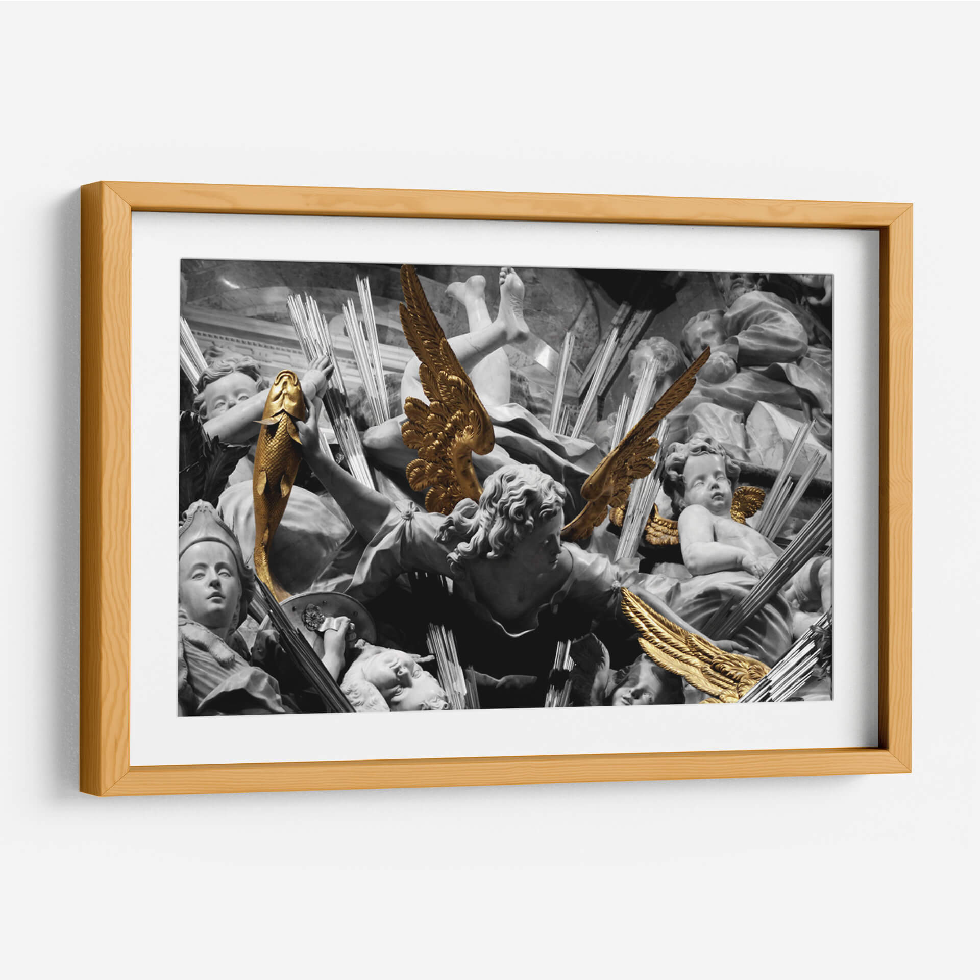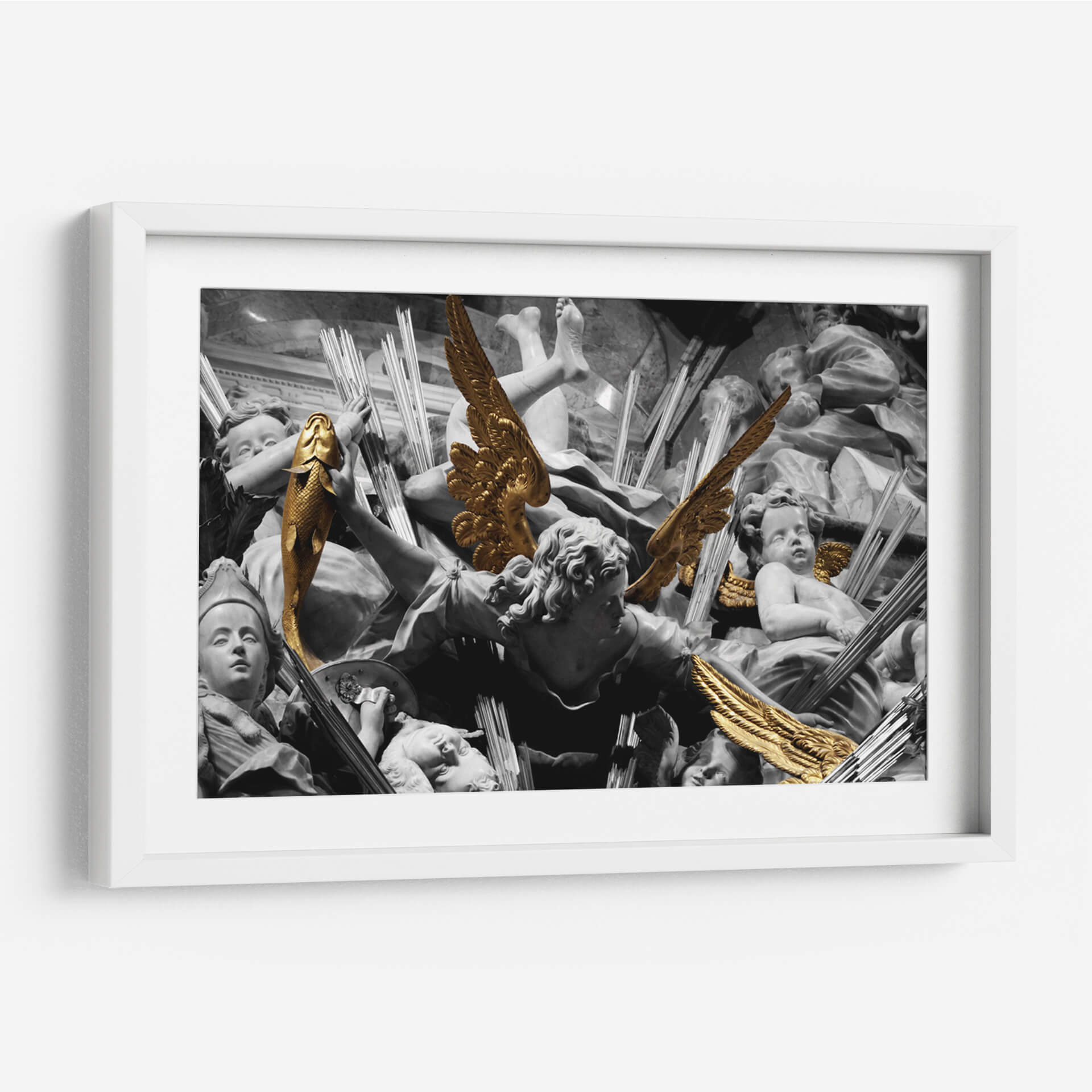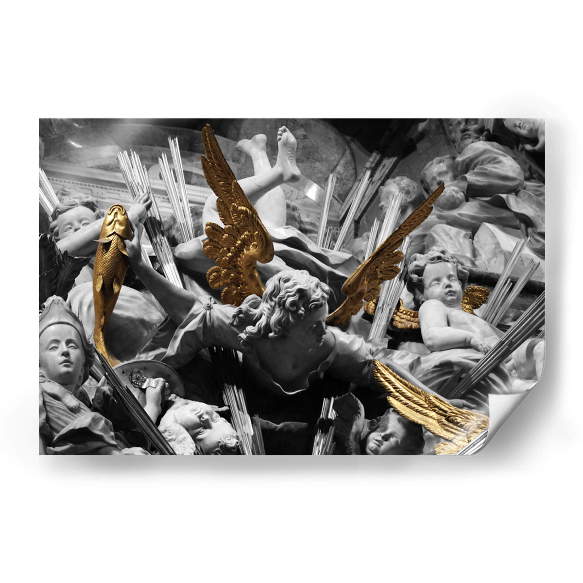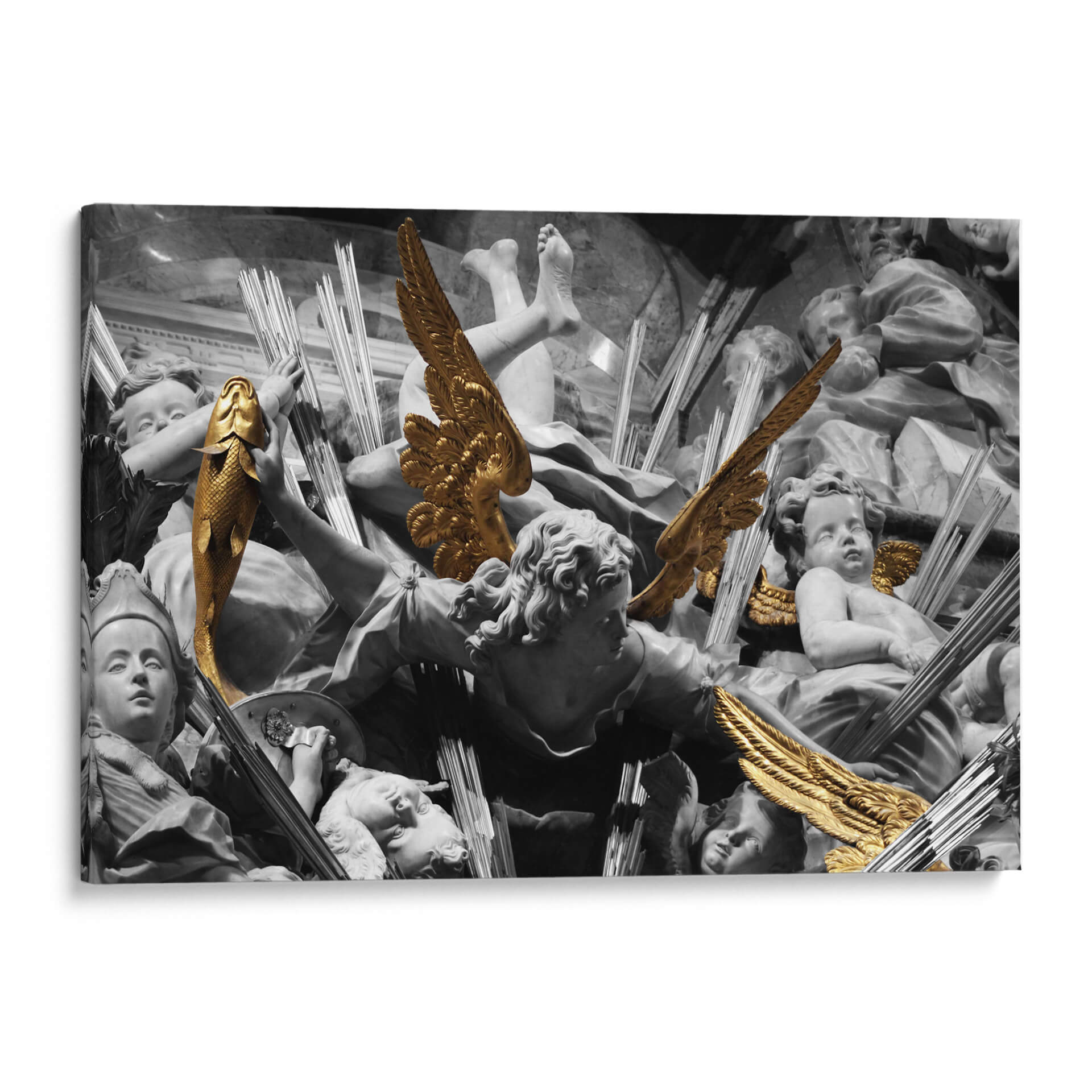 Sumérgete en la opulencia y el misterio con 'Los Arcángeles en Toledo', una obra de arte digital que redefine la decoración de paredes. Esta pieza, inspirada en la grandiosidad de la escultura clásica, fusiona elementos arquitectónicos en blanco y negro con toques dorados vibrantes. La composición intrincada presenta figuras angélicas y querubines, rodeados por haces de luz que añaden un dramatismo celestial. El detalle dorado de las alas de querubín y el pez capturan la mirada, creando un contraste impactante contra el fondo monocromático. El estilo barroco, reimaginado con una sensibilidad contemporánea, confiere a esta obra una profundidad y una narrativa visual cautivadora. Es el cuadro decorativo perfecto para quienes buscan añadir un elemento de sofisticación y espiritualidad a su hogar u oficina. Imagina este cuadro decorativo como el punto focal de tu sala de estar, aportando una atmósfera de reverencia y esplendor, o como una pieza que inspire reflexión en un espacio de estudio. "Los Arcángeles en Toledo" no es solo arte, es una invitación a contemplar la belleza eterna, transformando cualquier ambiente en una galería de arte personal. Añade esta obra maestra digital a tu colección y eleva tu decoración a nuevas alturas de elegancia y significado.