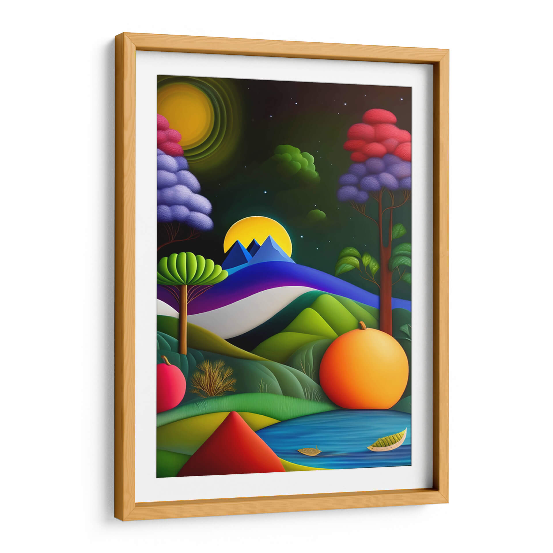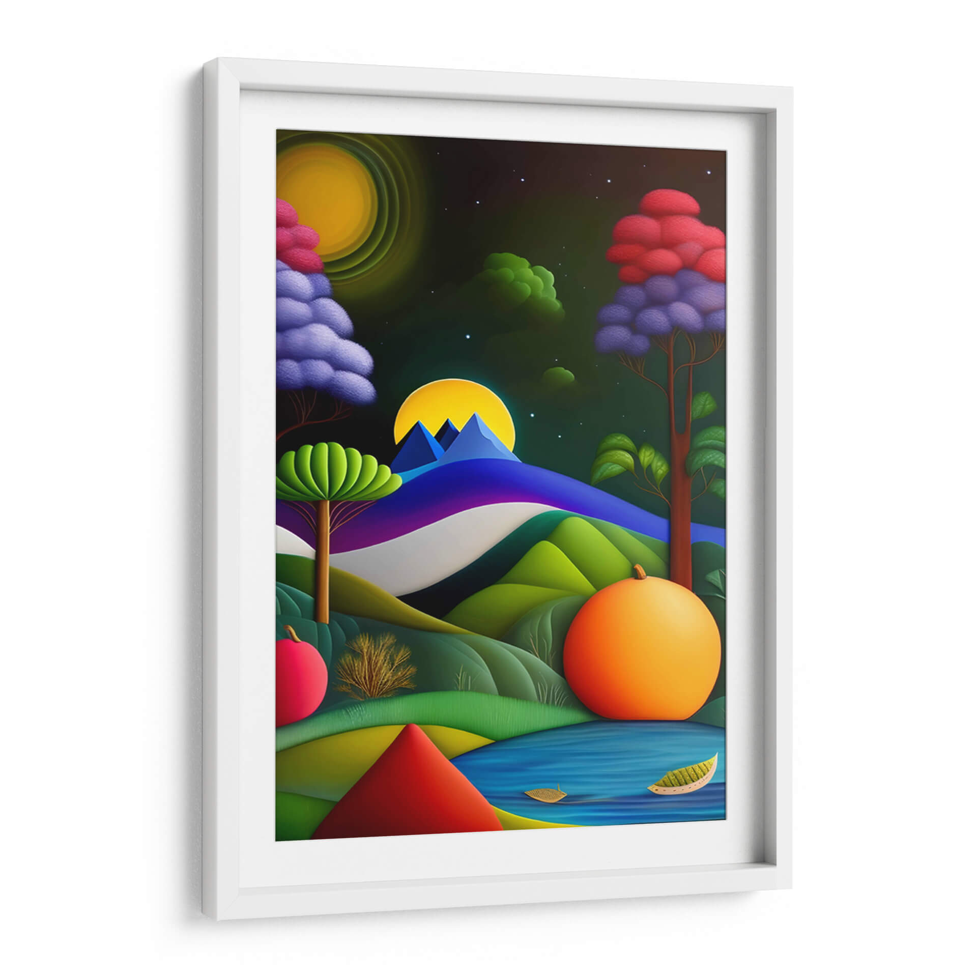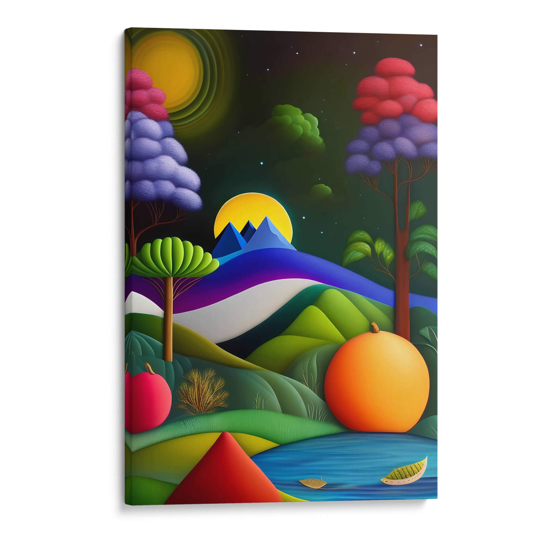 Sumérgete en la exuberante y enigmática visión de "Los Frutos de la Naturaleza", una obra de arte digital que desafía la percepción y celebra la abundancia del mundo natural a través de una lente surrealista y vibrante. Esta pieza cautivadora presenta un paisaje onírico donde las colinas ondulantes se tiñen de una paleta de colores vivos, desde verdes intensos hasta transiciones de púrpura y blanco, bajo un cielo nocturno salpicado de estrellas. La luna amarilla y radiante ilumina la escena, destacando siluetas montañosas y formaciones arbóreas fantásticas con copas de colores etéreos como el rosa, azul y rojo. Elementos simbólicos como una manzana escarlata y una gran fruta naranja flotan en un estanque sereno de aguas azules, acompañado por una pequeña embarcación dorada, evocando una sensación de misterio y abundancia. El estilo único de DEA Digital Esoteric Art combina lo orgánico con lo fantástico, creando una atmósfera mágica y contemplativa. Este cuadro decorativo es perfecto para añadir un toque de originalidad y color a cualquier espacio, ya sea una sala de estar moderna, un estudio creativo o un dormitorio que busque inspiración. "Los Frutos de la Naturaleza" no es solo una decoración, sino una invitación a explorar los misterios de la vida y la generosidad del universo.