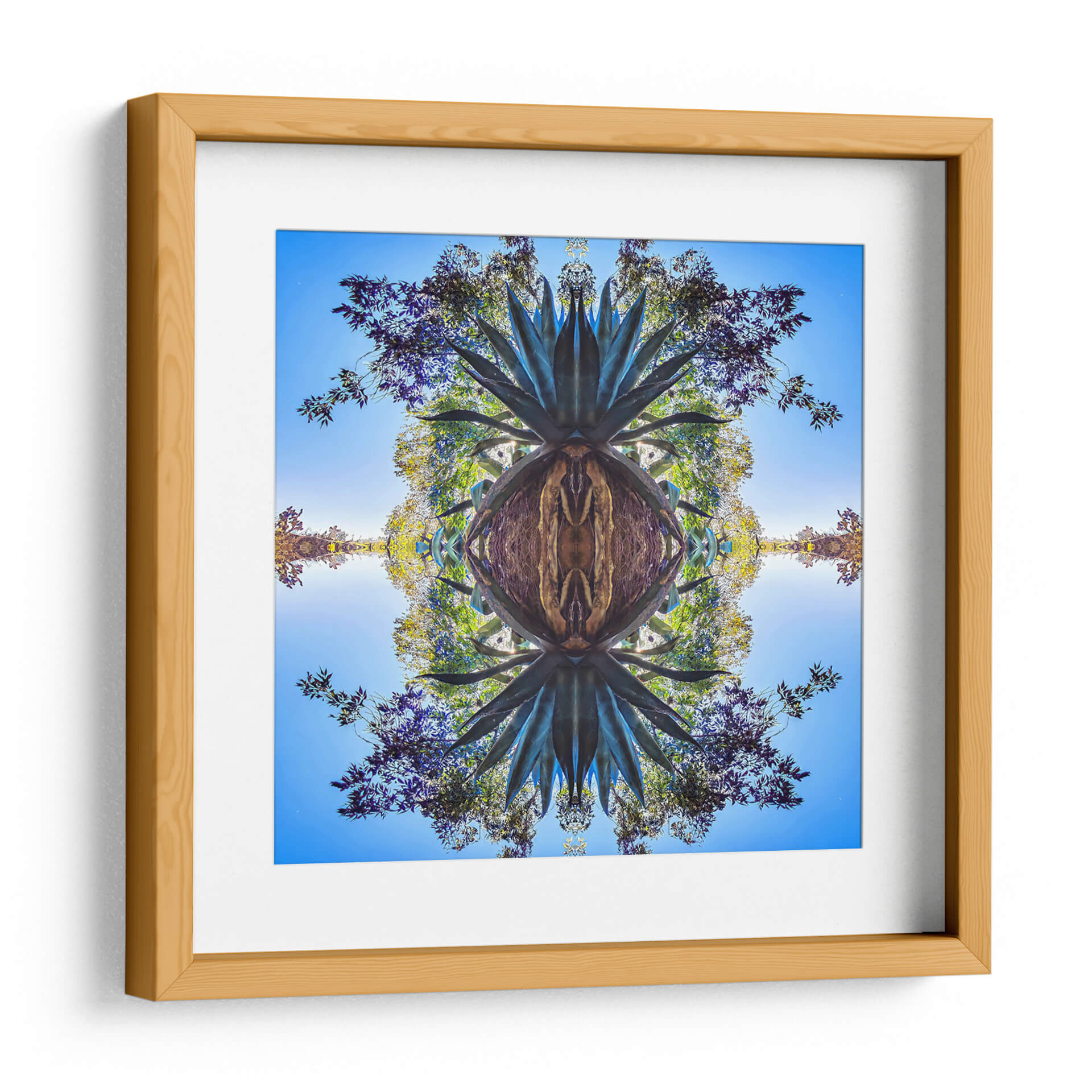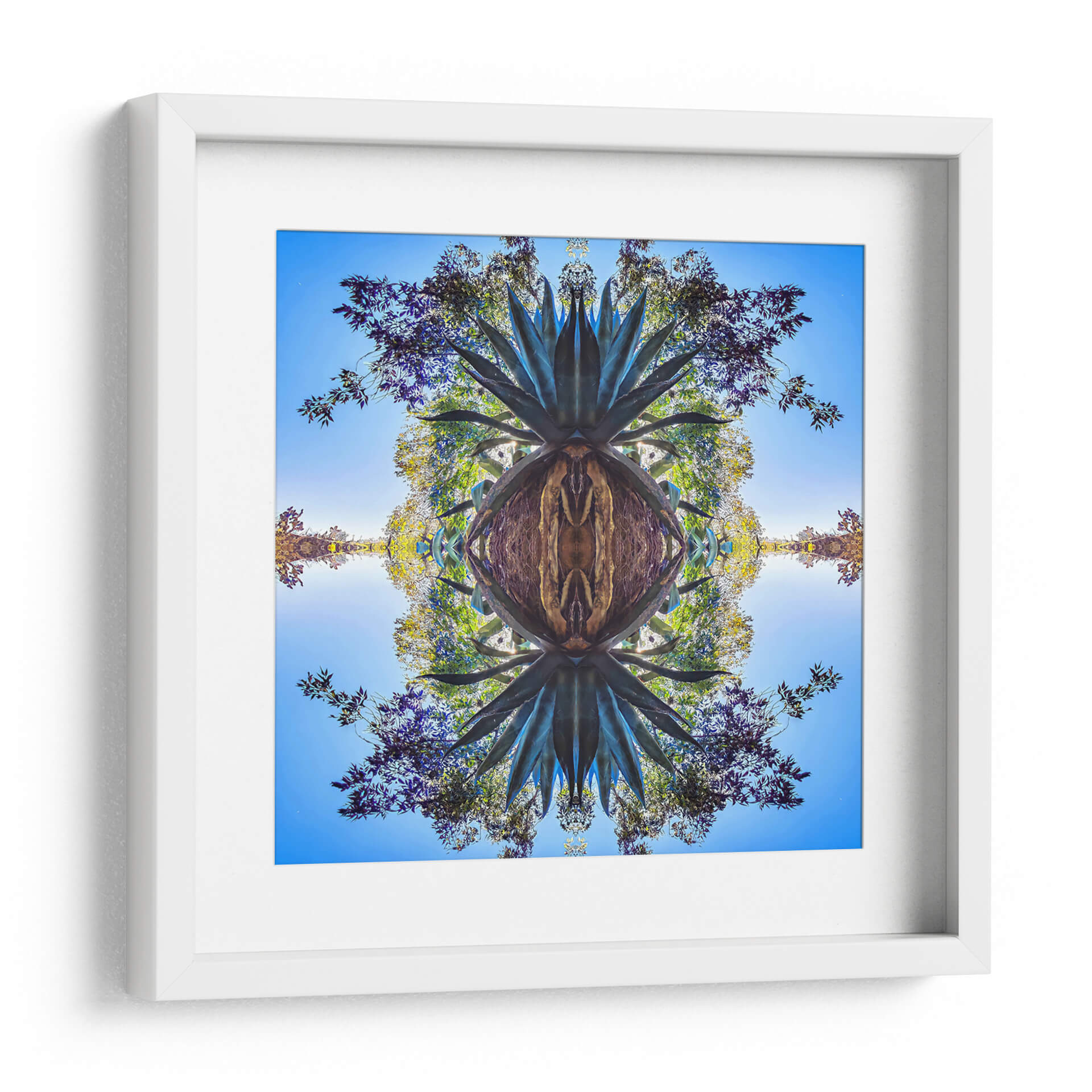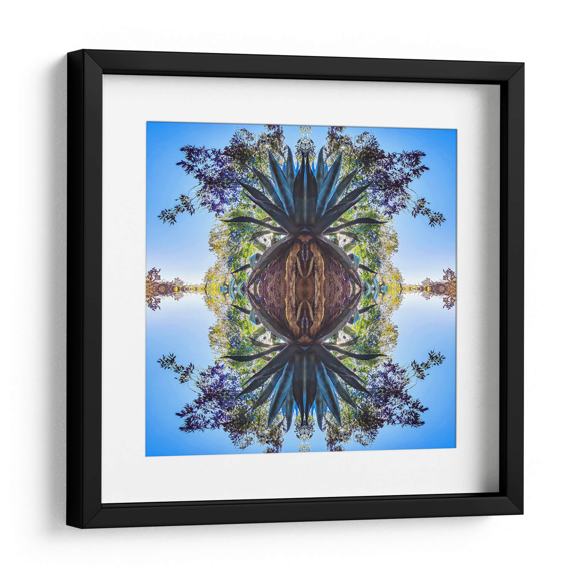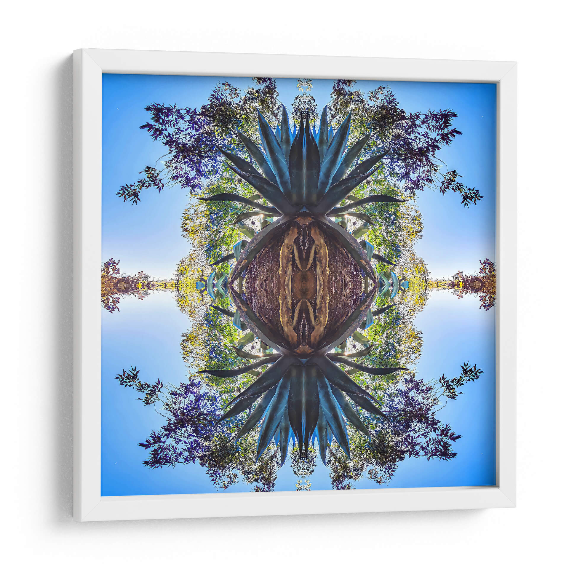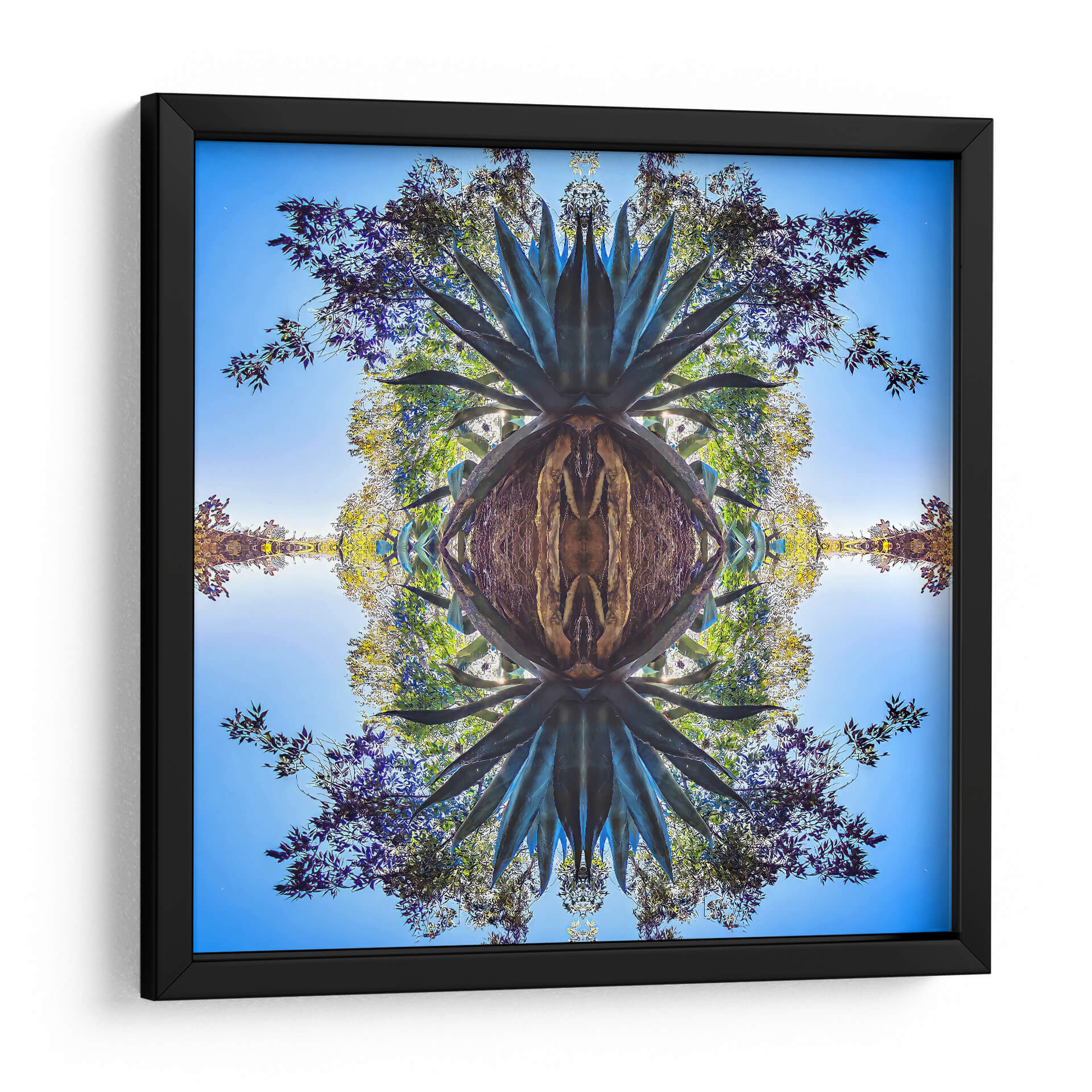 Sumérgete en la belleza orgánica y simétrica de "Maguey1", una obra de arte digital que captura la esencia de la naturaleza con un toque contemporáneo. Este cuadro decorativo presenta una reinterpretación hipnótica de un agave, cuyas espinosas hojas se expanden en un patrón fractal que invita a la contemplación. Los tonos profundos de verde azulado del maguey contrastan con un cielo azul brillante y el vibrante follaje de árboles circundantes, creando una paleta de colores rica y cautivadora. La composición, dividida simétricamente, genera un efecto de espejo que añade profundidad y un aire de misterio, transformando lo familiar en algo etéreo. Ideal para espacios que buscan un punto focal natural pero con un giro artístico moderno, "Maguey1" aportará una sensación de equilibrio y conexión con el entorno. Transforma tu hogar u oficina en un oasis de calma y estilo con este impresionante cuadro decorativo, una pieza que fusiona la botánica con la abstracción geométrica para crear una atmósfera única y envolvente. Es una elección perfecta para amantes de la naturaleza y el arte vanguardista, añadiendo un toque de sofisticación y serenidad a cualquier ambiente.