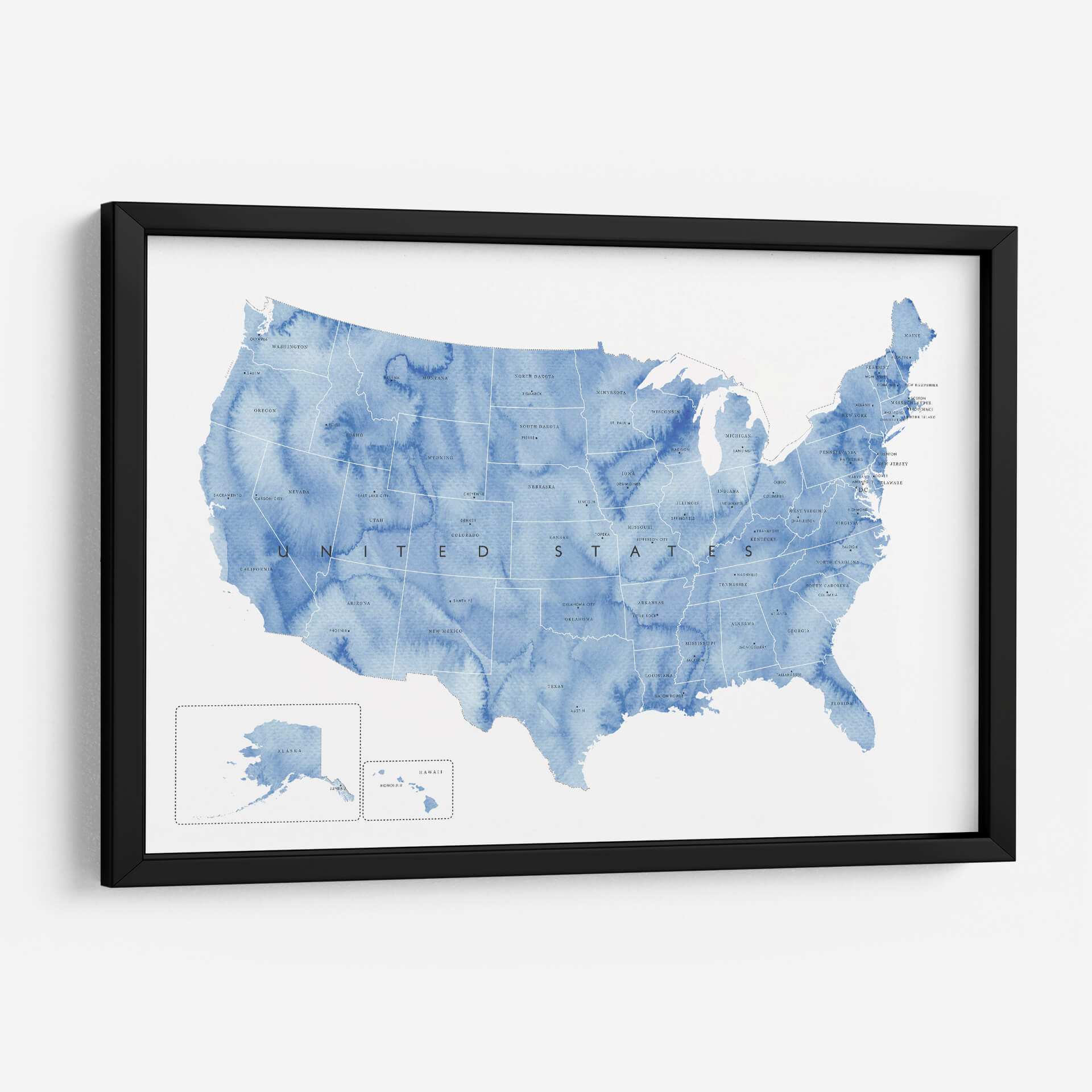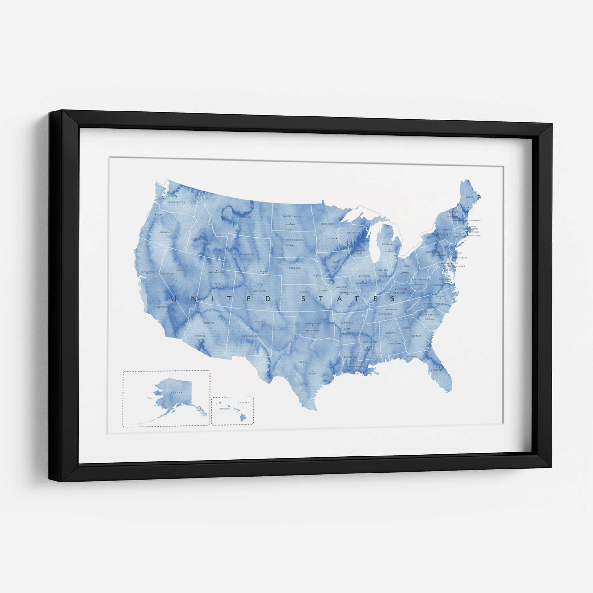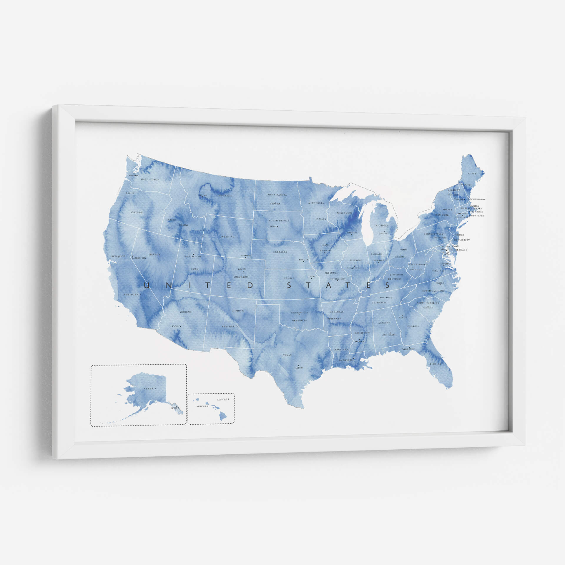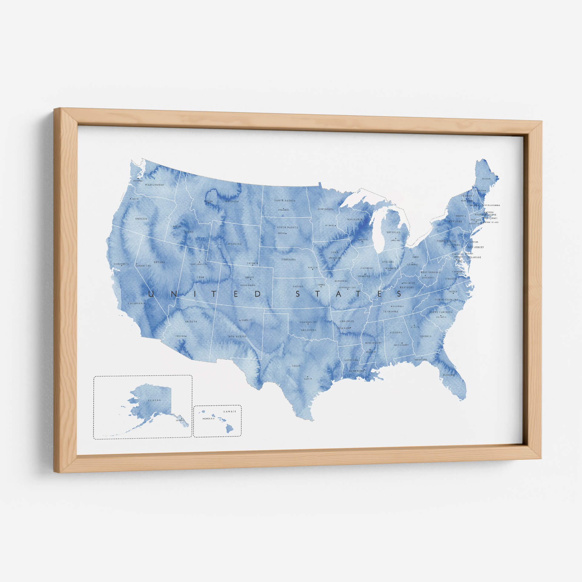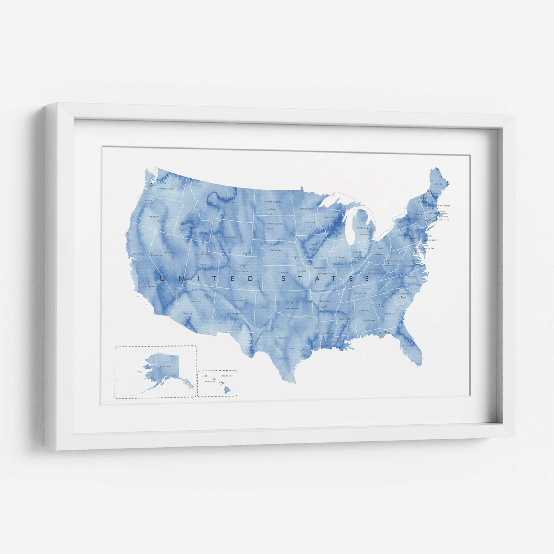 Mapa acuarela azul de EUA con estados y capitales de estado - Rosana Laiz Blursbyai