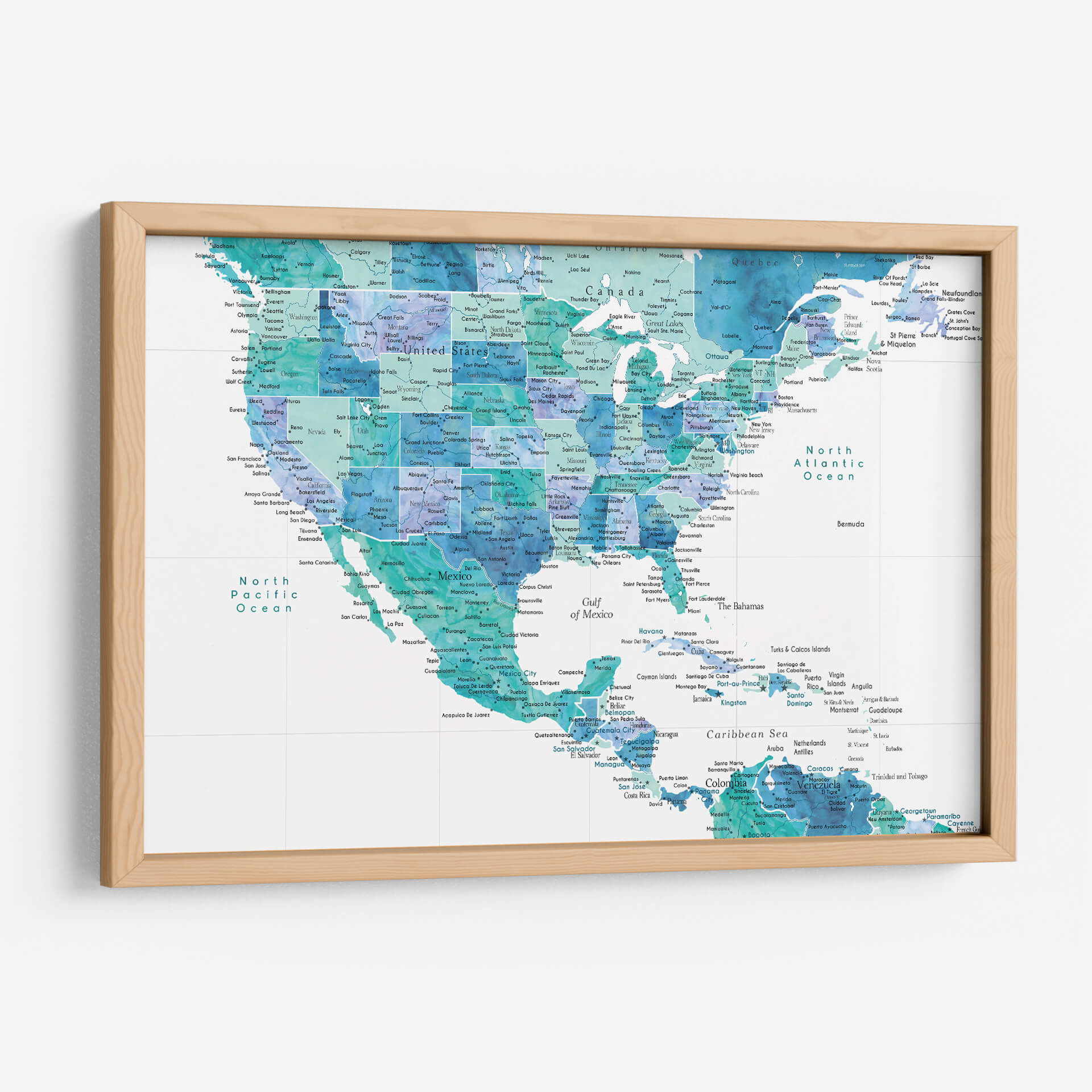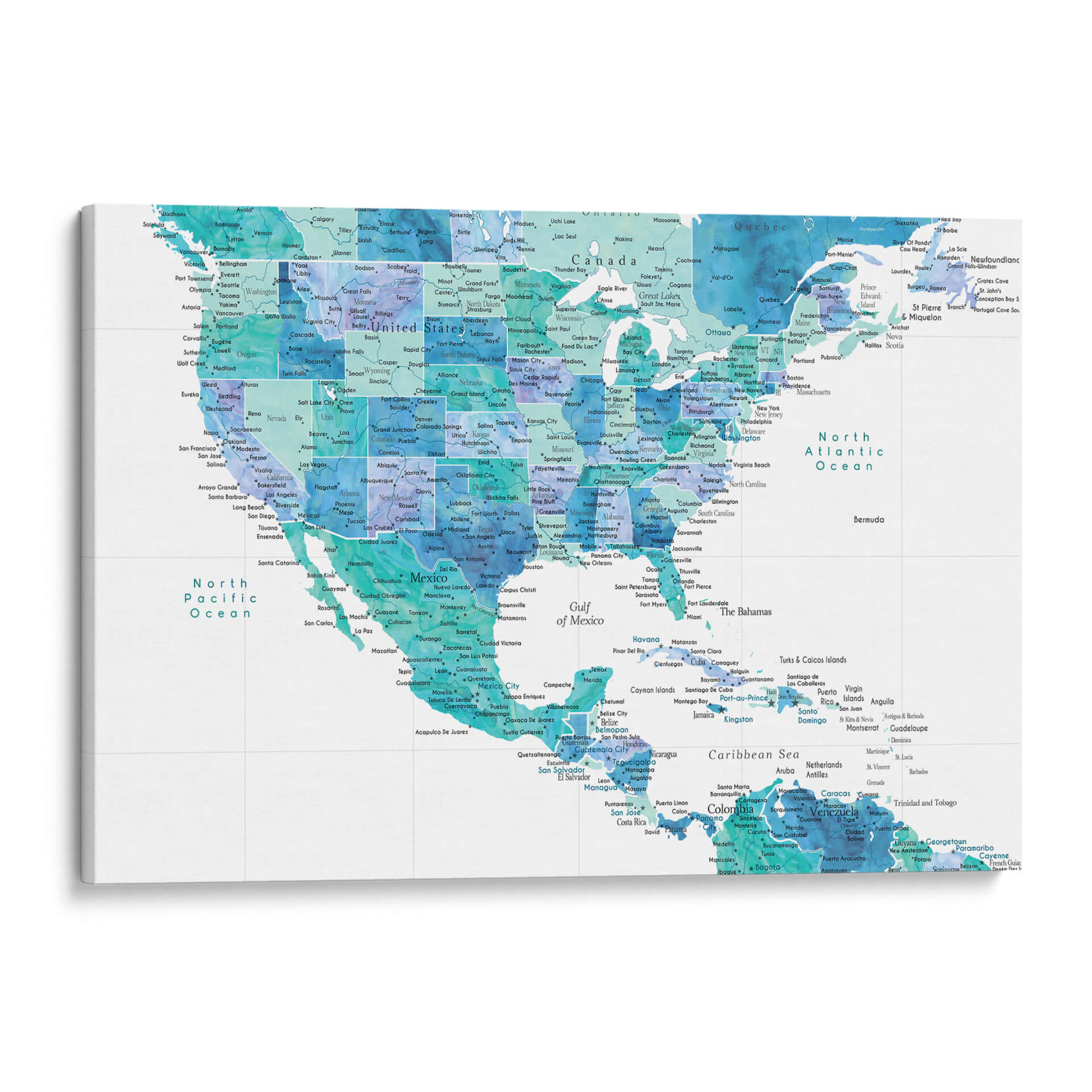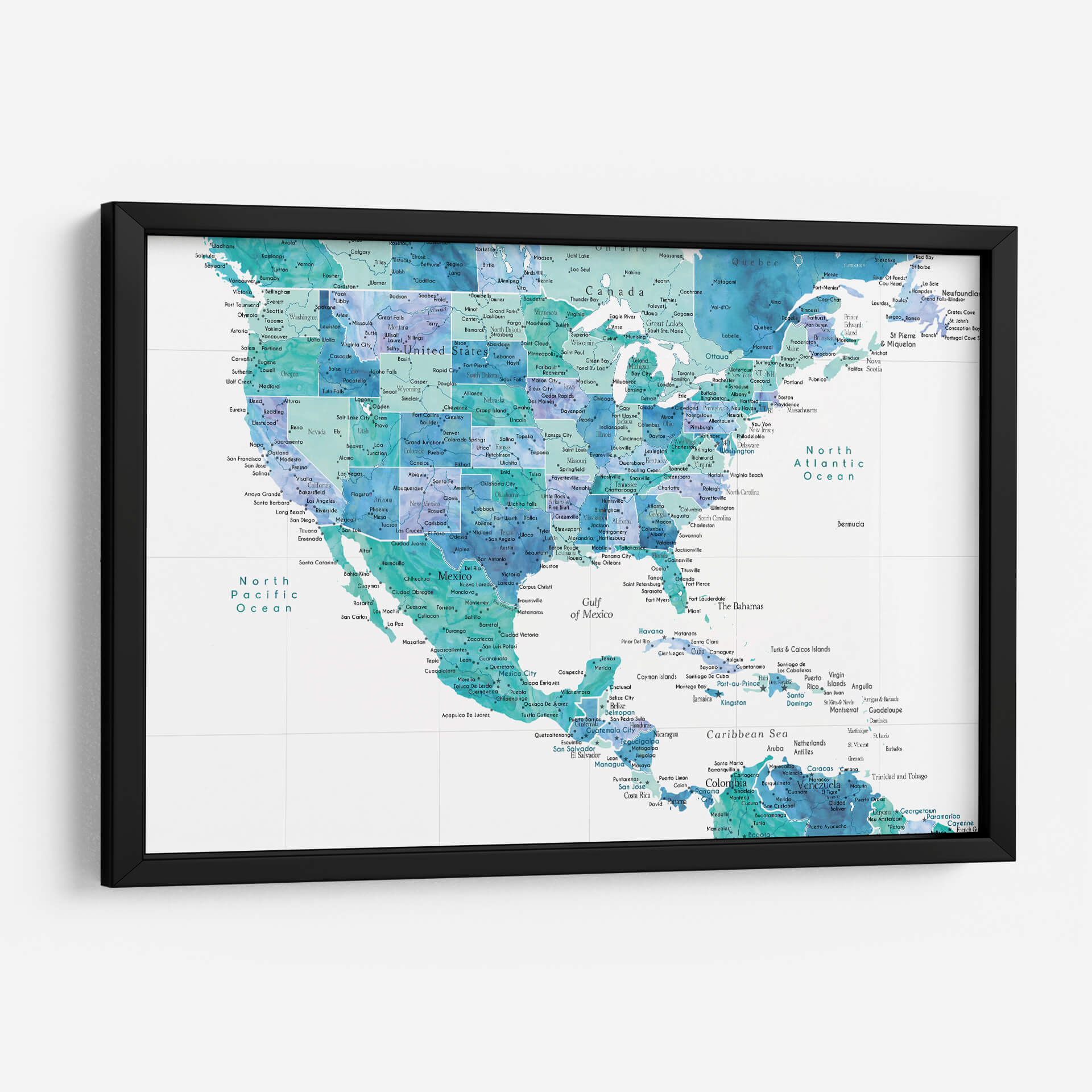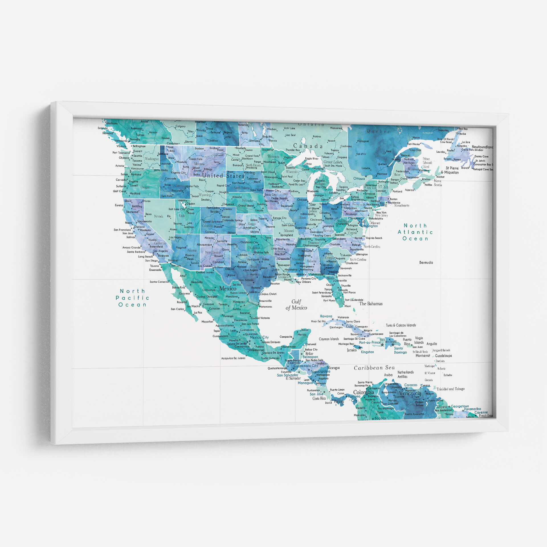 Embárcate en un viaje visual a través del continente americano con nuestro cautivador cuadro decorativo "Mapa acuático de los Estados Unidos y el mar Caribe". Esta obra de arte, inspirada en la técnica de acuarela, fusiona la precisión geográfica con una estética fluida y etérea. Las aguas del Pacífico, el Atlántico, el Golfo de México y el Caribe cobran vida en vibrantes tonos de azul turquesa, índigo y aguamarina, creando un efecto dinámico y envolvente que evoca la inmensidad y la belleza de nuestros océanos. Cada ciudad, estado y país está delineado con delicadeza, invitando a la exploración y la contemplación de la geografía de una manera artística y moderna. La paleta de colores, predominantemente acuática, aporta una sensación de calma y serenidad, perfecta para cualquier espacio que busque un toque de tranquilidad y sofisticación. Este mapa decorativo es ideal para salas de estar, estudios u oficinas, transformando cualquier pared en un punto focal de conversación y admiración. Descubre la conexión entre la tierra y el mar a través de una perspectiva artística única, aportando un aire de frescura y aventura a tu hogar u oficina.