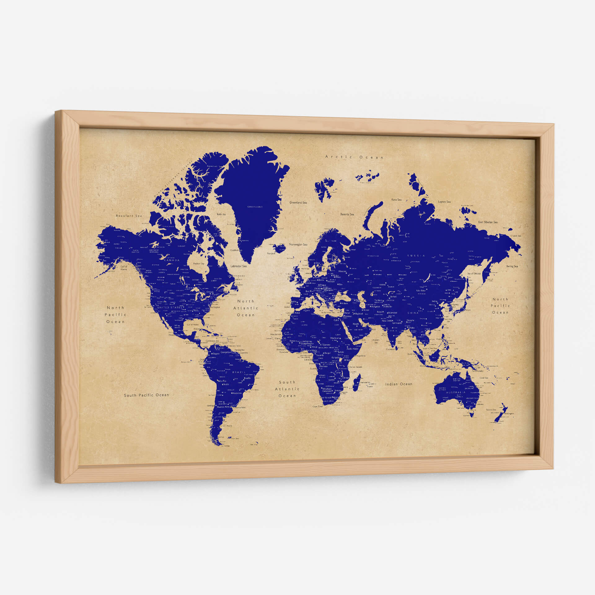 Descubre nuestro cautivador cuadro decorativo del mapa del mundo rústico con ciudades, una pieza que combina la geografía con un estilo artístico único. La obra presenta una representación detallada del globo terráqueo, con las masas continentales y los océanos delineados en un vibrante azul cobalto sobre un fondo texturizado que evoca el papel antiguo o el pergamino desgastado. Esta paleta de colores, con sus tonos tierra y el contraste nítido del azul, crea una atmósfera a la vez clásica y contemporánea, perfecta para cualquier espacio. Los nombres de las ciudades están sutilmente integrados, añadiendo un toque de conocimiento y detalle para los curiosos. El estilo, aunque basado en un mapa, posee una cualidad artística que trasciende la mera cartografía, sugiriendo viajes, descubrimientos y una conexión global. Este cuadro es ideal para despertar la conversación en tu sala de estar, añadir un toque de sofisticación a tu oficina o inspirar sueños de aventura en tu dormitorio. Su diseño versátil se adapta a decoraciones modernas, rústicas o eclécticas, convirtiéndose en un punto focal que invita a la contemplación y la exploración. Añade un toque de aventura y cultura a tu hogar con esta obra de arte excepcional que celebra la vastedad de nuestro mundo.