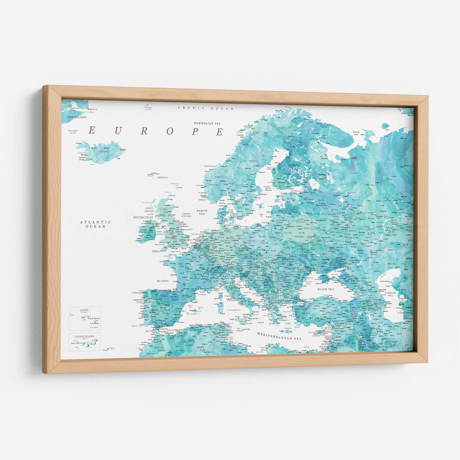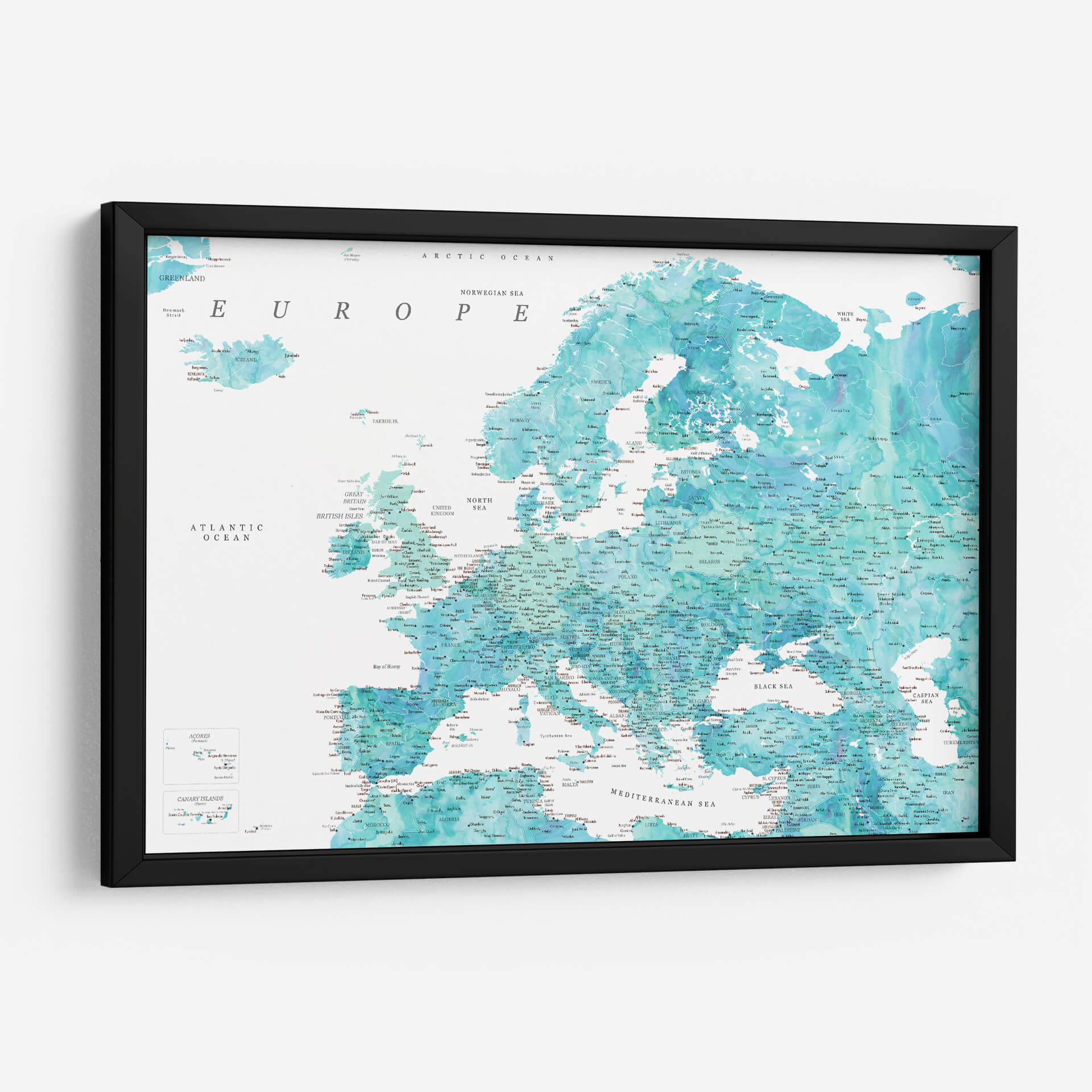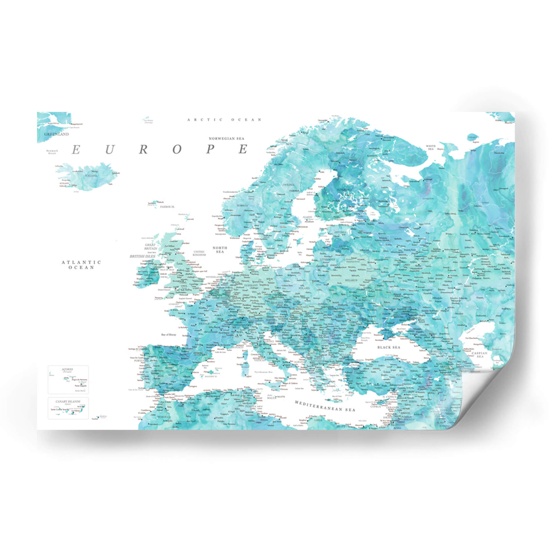 Sumérgete en la belleza cartográfica con este detallado mapa de Europa en tonos aguamarina. La obra de arte de Rosana Laiz Blursbyai captura la esencia del continente europeo a través de una paleta de colores serenos y vibrantes que evocan la profundidad del océano y la claridad del cielo. Cada país, ciudad y accidente geográfico está representado con una precisión exquisita, invitando a la exploración visual y al descubrimiento. Los sutiles degradados y las texturas acuosas añaden una dimensión artística única, transformando un elemento geográfico en una pieza decorativa cautivadora. Este cuadro decorativo es ideal para infundir una sensación de calma y conocimiento en cualquier espacio, ya sea tu hogar u oficina. Su estilo contemporáneo y su temática universal lo convierten en una elección perfecta para quienes aprecian tanto la geografía como el arte. Añade un toque de elegancia y sofisticación a tus paredes, y deja que este mapa detallado de Europa sea el punto de partida para conversaciones inspiradoras y una fuente continua de admiración. Transforma tu entorno con esta representación artística del viejo continente, perfecta para amantes de los viajes y la decoración de interiores.