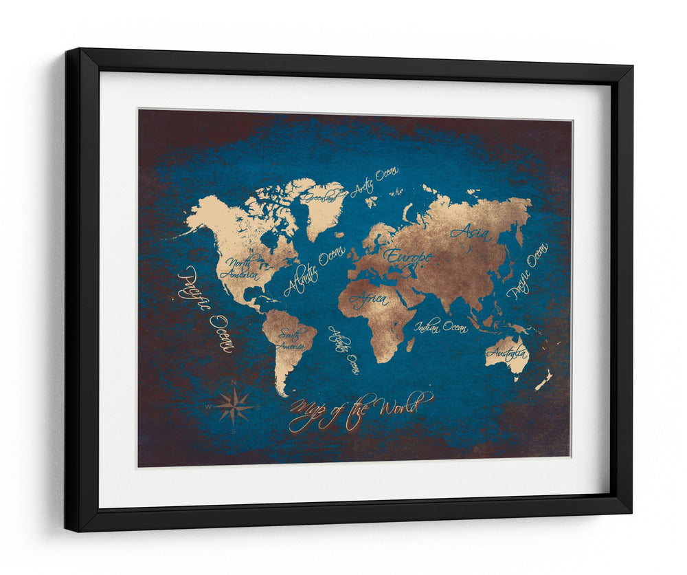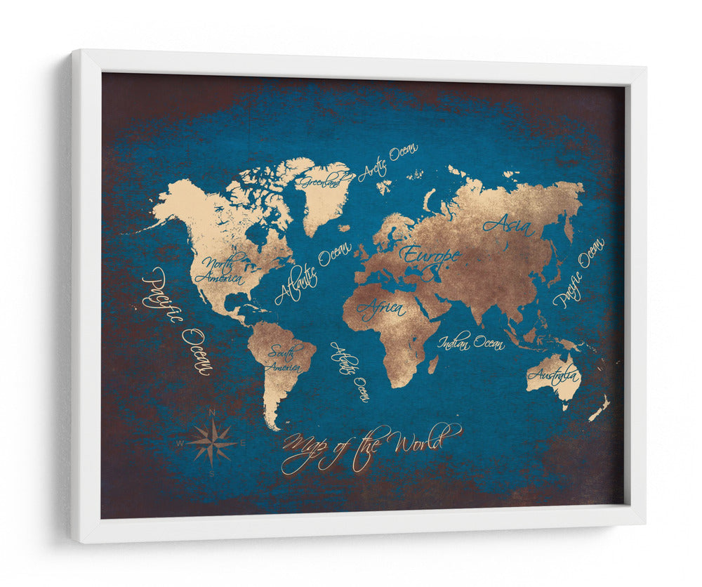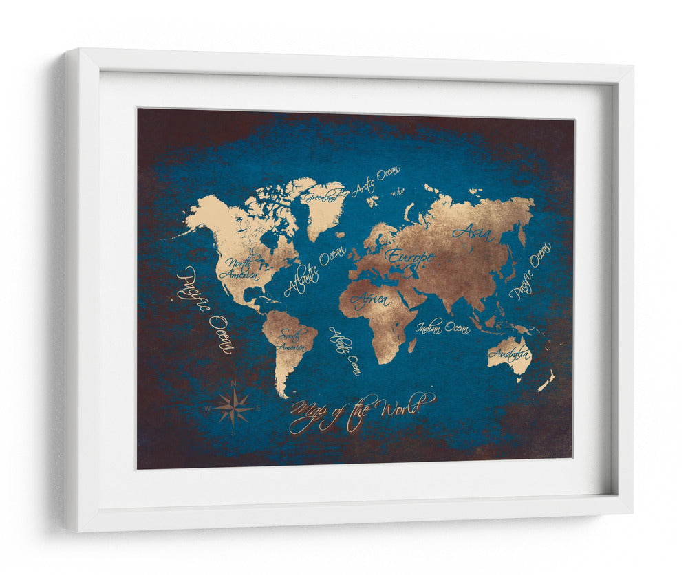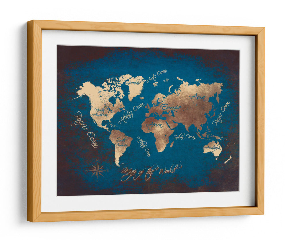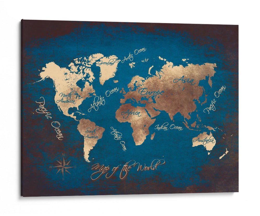 Embárcate en un viaje visual con este cautivador cuadro decorativo del "Mapa mundial 15" de Justyna Jaszke. Esta obra de arte traslada la geografía del mundo a tu hogar con un estilo único y sofisticado. La pieza presenta una representación estilizada del globo terráqueo, donde los continentes se destacan en tonos dorados y ocre sobre un profundo y texturizado fondo azul marino, salpicado de matices terrosos. La elección de colores crea un contraste dramático y elegante, evocando una sensación de profundidad y misterio. Las fuentes caligráficas utilizadas para nombrar continentes y océanos añaden un toque de clasicismo y aventura. Este mapa no es solo una representación geográfica, sino una invitación a la exploración y al descubrimiento, ideal para quienes sueñan con viajar o para añadir un punto de interés intelectual a cualquier estancia. Su diseño atemporal y su paleta de colores rica lo convierten en una adición perfecta para oficinas, salas de estar o estudios, aportando carácter y sofisticación a la decoración.