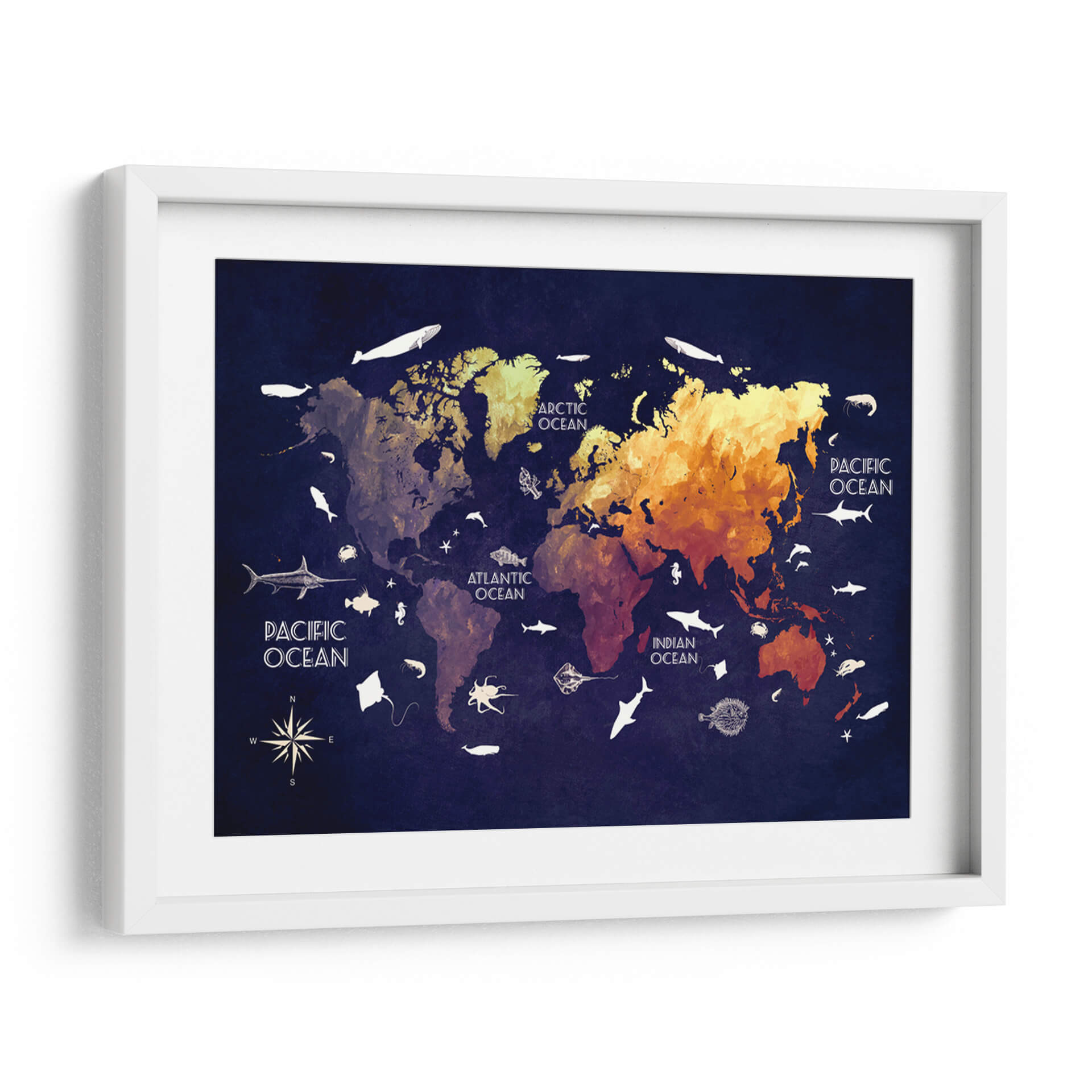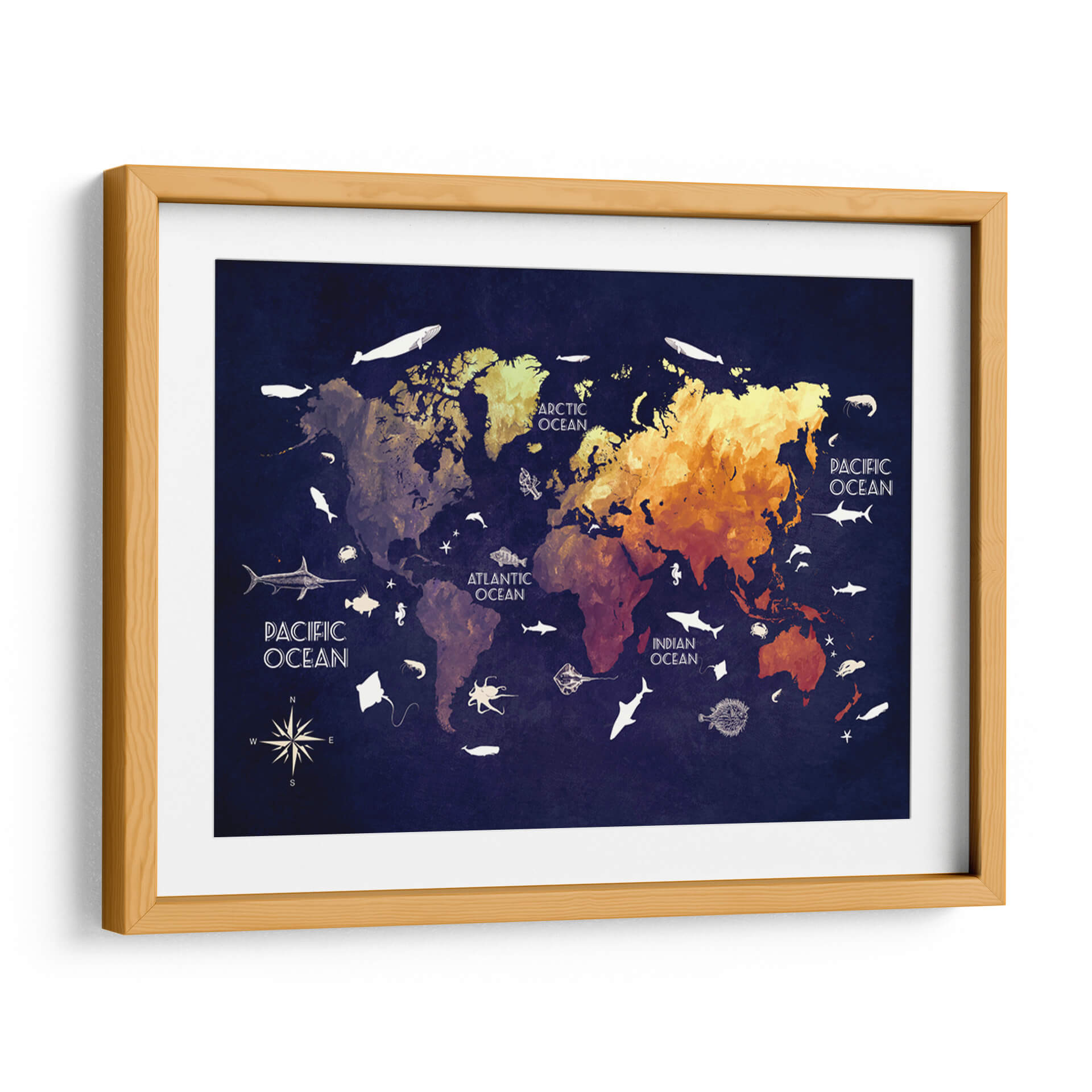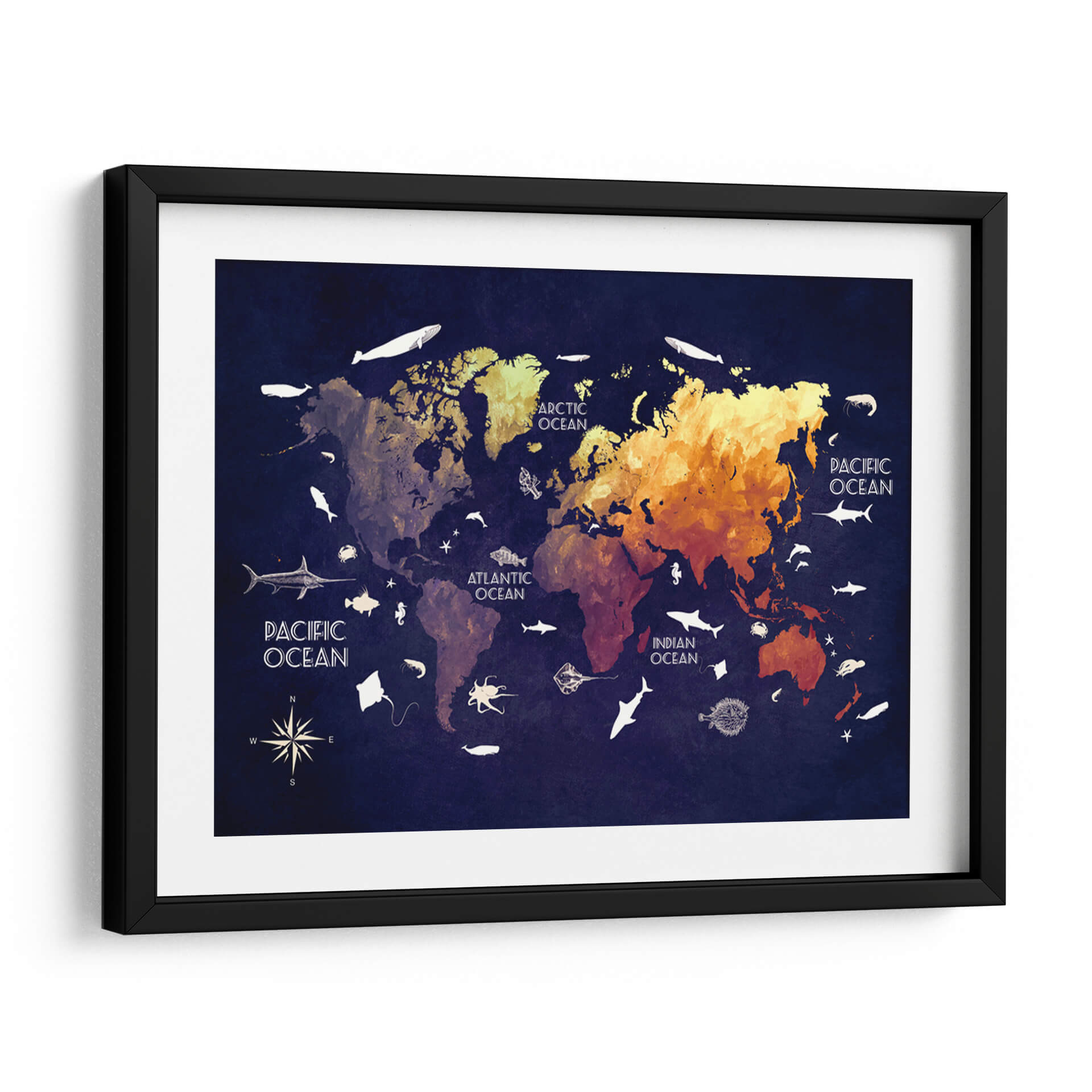 Emb rquese en un viaje visual a través de los continentes y oc anos con "Mapa mundial 6", una obra de arte digital que combina la geograf fa con la vida marina de una manera nicamente cautivadora. Este cuadro decorativo presenta un mapa del mundo estilizado, donde los continentes se visten con una paleta de colores que va desde tonos ocres y dorados hasta p rpuras profundos, contrastando maravillosamente con un fondo azul scuro y texturizado que evoca la inmensidad del oc ano. Dispersas por los oc eos, figuras blancas y minimalistas de ballenas, tiburones, peces y otras criaturas marinas añaden un toque l dico y de descubrimiento. La composici es equilibrada, con la informaci de los oc eos y una rosa de los vientos que anclan la pieza. Ideal para oficinas, salas de estudio o cualquier espacio que inspire exploraci y curiosidad. "Mapa mundial 6" no es solo una pieza decorativa, sino una invitaci a so nar con aventuras y a reflexionar sobre nuestro planeta. Su dise o rtstico lo convierte en un punto focal interesante y educativo, perfecto para quienes aprecian el arte contempor eo con un toque de ciencia y naturaleza.