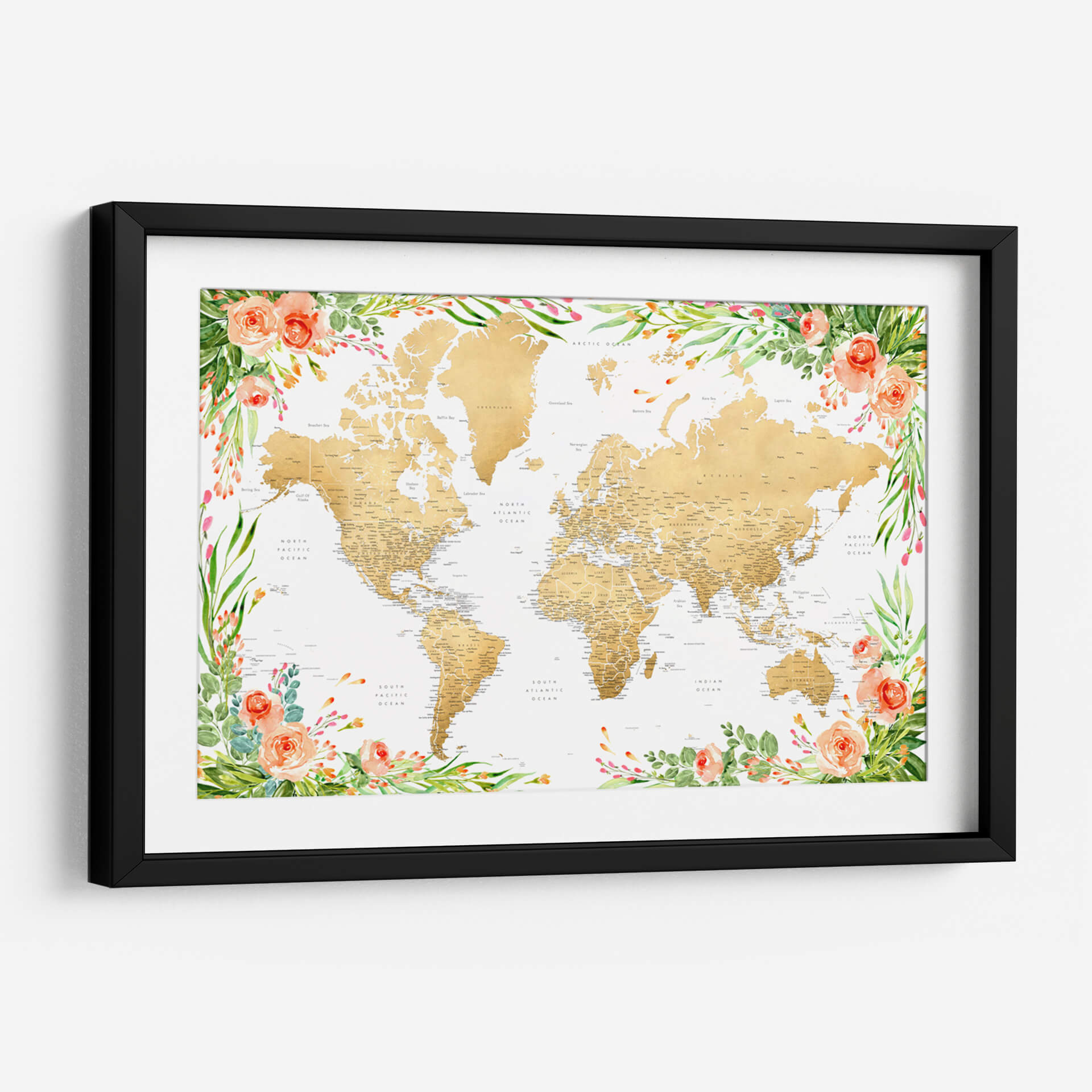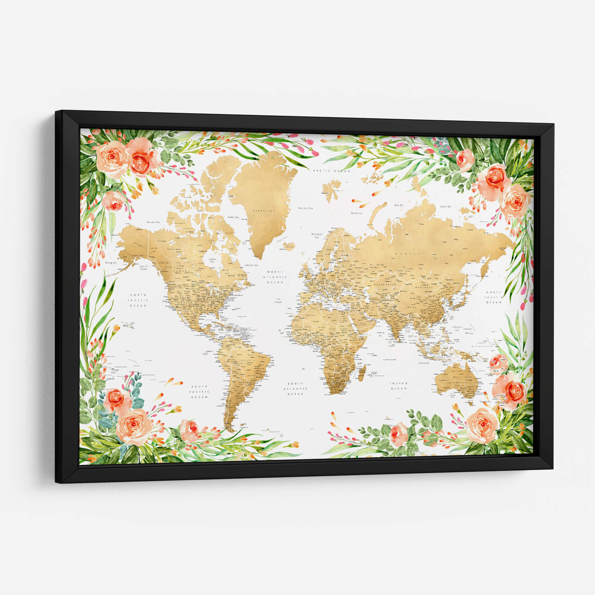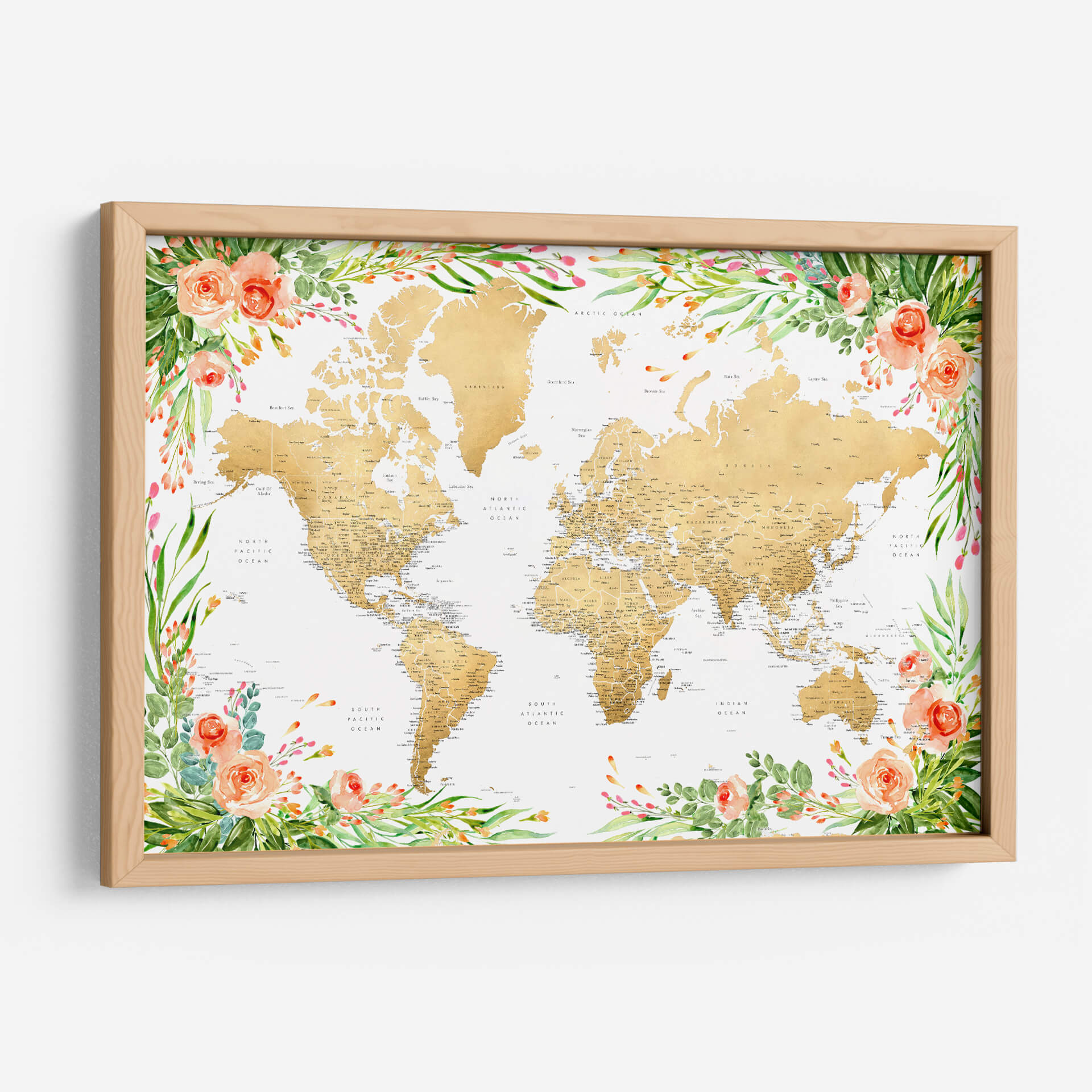 Descubre un viaje visual a través de nuestro exquisito cuadro decorativo 'Mapa mundial bohemio floral con ciudades Blythe'. Esta obra de arte contemporánea presenta un mapa del mundo detallado en tonos dorados, cuidadosamente enmarcado por un vibrante y delicado diseño floral en acuarela. Las suaves tonalidades de melocotón de las rosas y los verdes frescos de las hojas crean una atmósfera de serenidad y sofisticación, fusionando la geografía con la belleza orgánica de la naturaleza. Ideal para añadir un toque de inspiración y color a cualquier espacio, desde una sala de estar moderna hasta una oficina acogedora. Este mapa decorativo no solo embellece tus paredes, sino que también evoca un sentido de aventura y conexión global. Es la pieza perfecta para soñadores, viajeros y amantes del arte que buscan una decoración de pared única que combine elegancia, detalle y un toque bohemio chic. Transforma tu hogar u oficina con este mapa del mundo floral que promete ser un punto focal inspirador y una conversación.