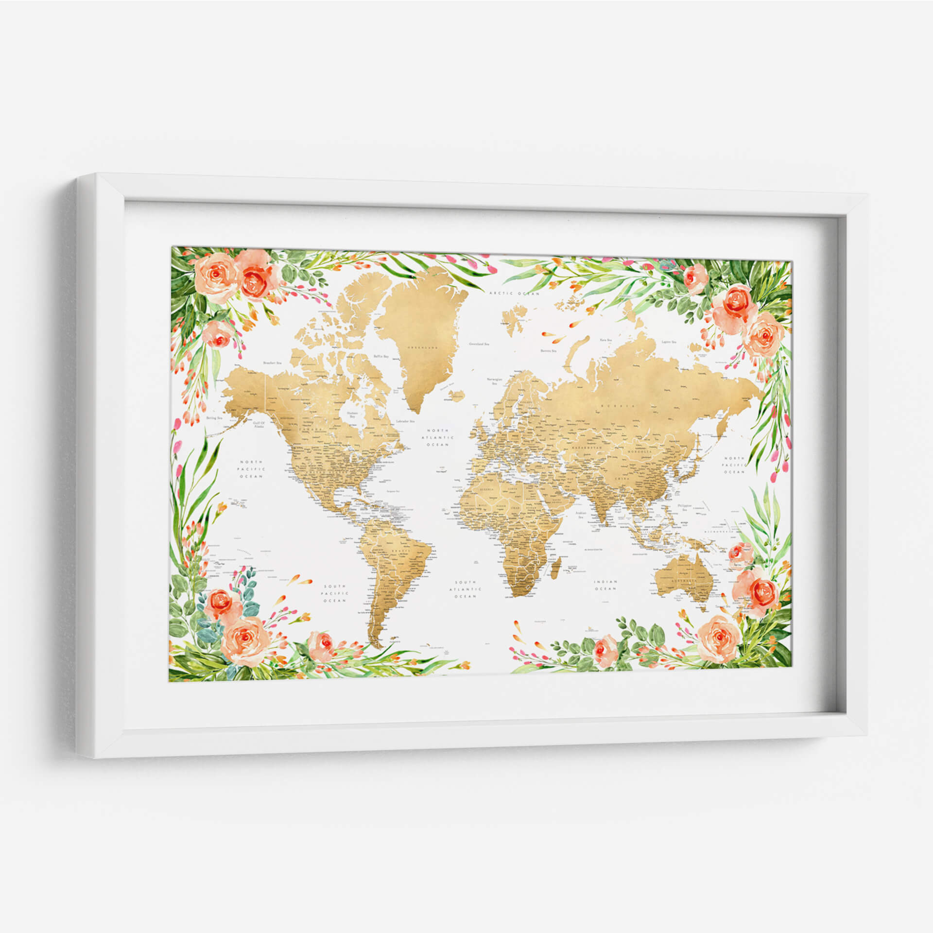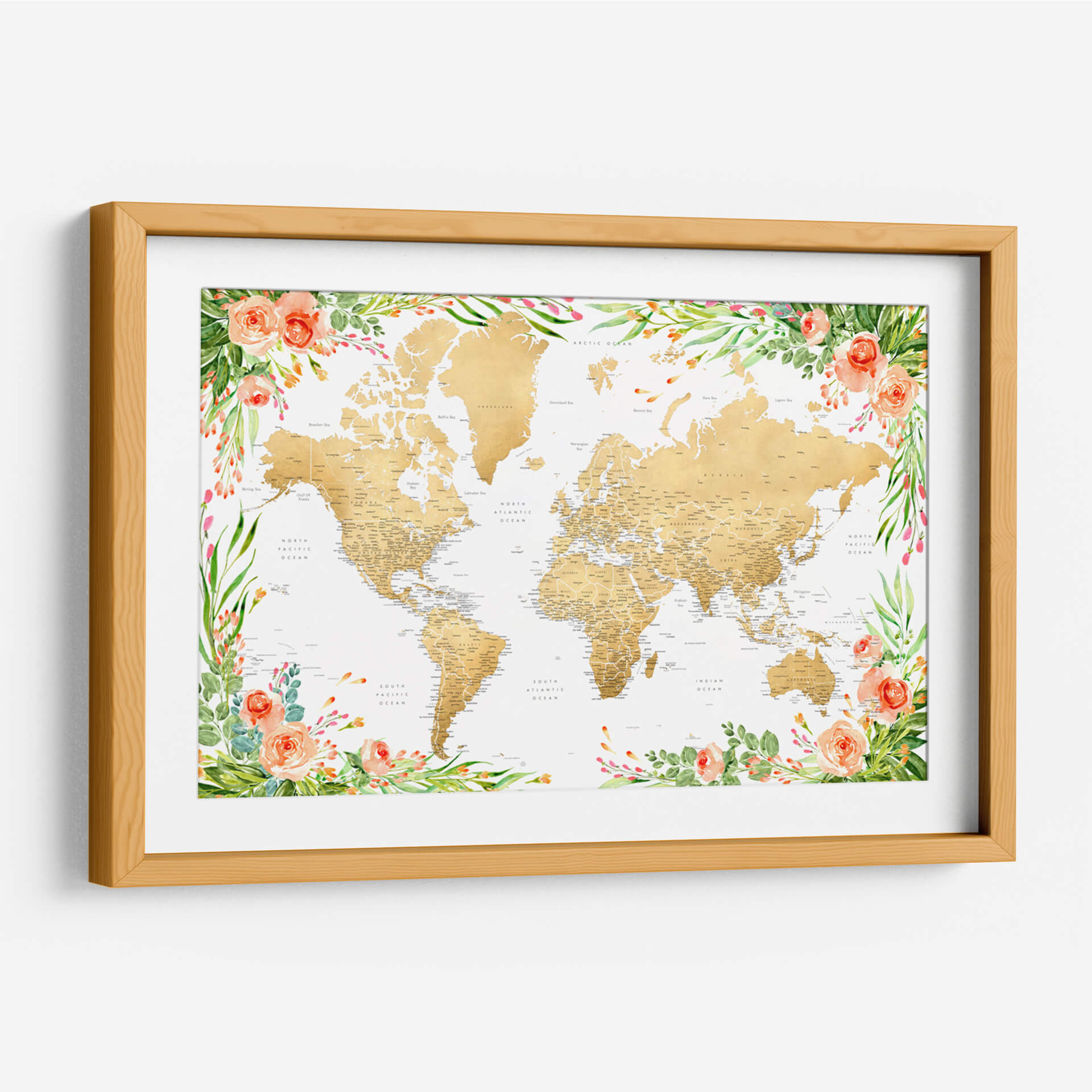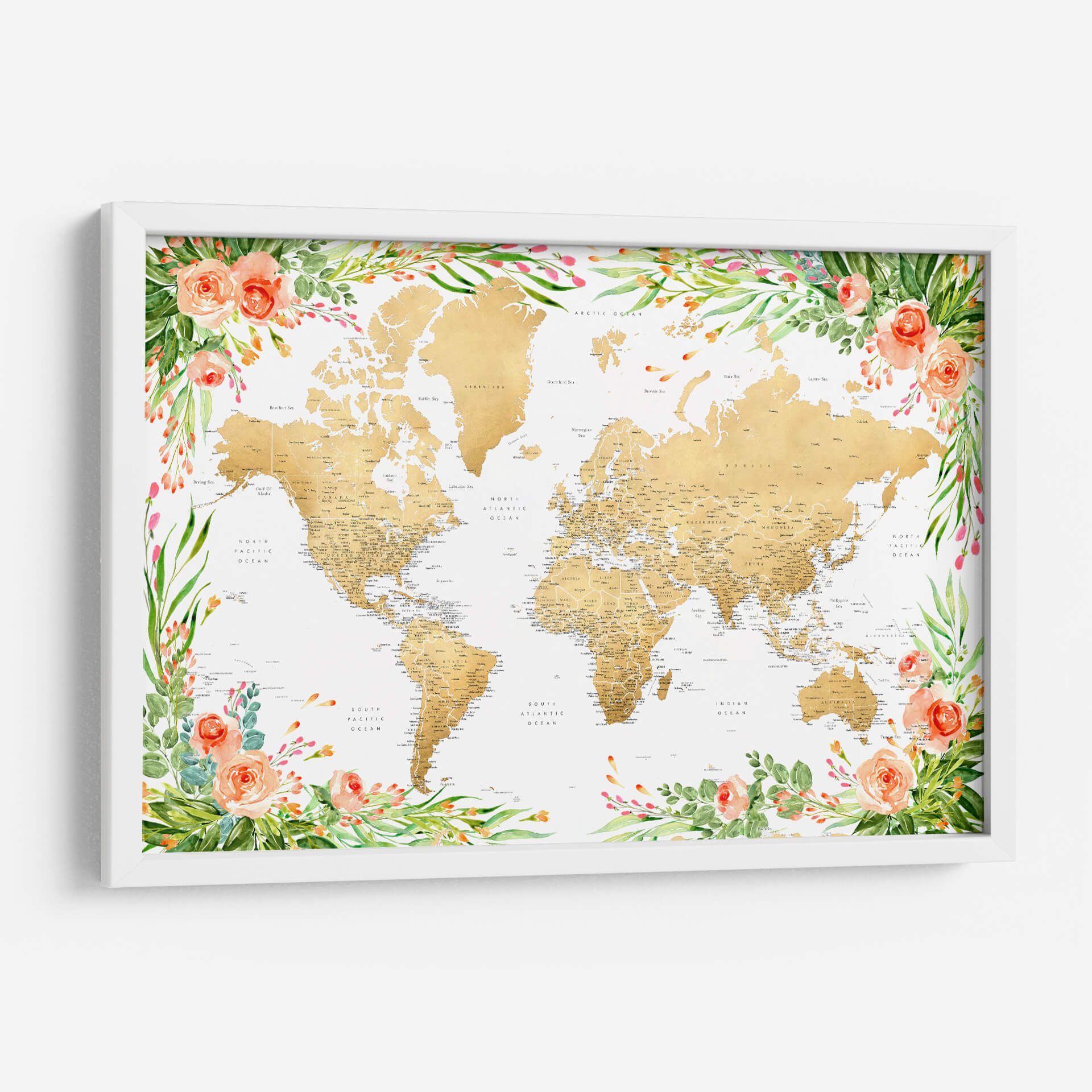 Descubre un viaje visual a través de nuestro exquisito cuadro decorativo 'Mapa mundial bohemio floral con ciudades Blythe'. Esta obra de arte contemporánea presenta un mapa del mundo detallado en tonos dorados, cuidadosamente enmarcado por un vibrante y delicado diseño floral en acuarela. Las suaves tonalidades de melocotón de las rosas y los verdes frescos de las hojas crean una atmósfera de serenidad y sofisticación, fusionando la geografía con la belleza orgánica de la naturaleza. Ideal para añadir un toque de inspiración y color a cualquier espacio, desde una sala de estar moderna hasta una oficina acogedora. Este mapa decorativo no solo embellece tus paredes, sino que también evoca un sentido de aventura y conexión global. Es la pieza perfecta para soñadores, viajeros y amantes del arte que buscan una decoración de pared única que combine elegancia, detalle y un toque bohemio chic. Transforma tu hogar u oficina con este mapa del mundo floral que promete ser un punto focal inspirador y una conversación.