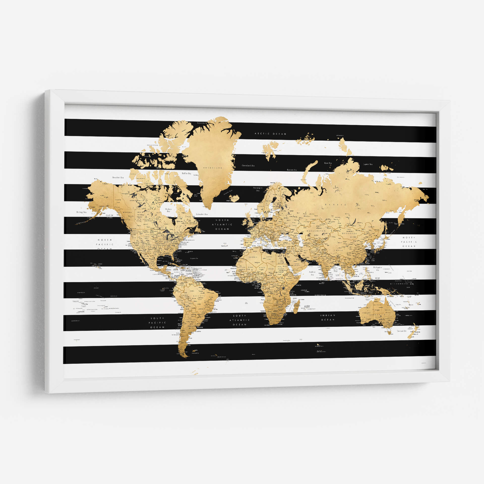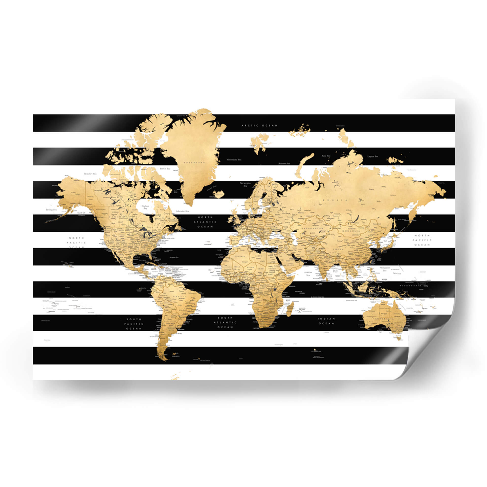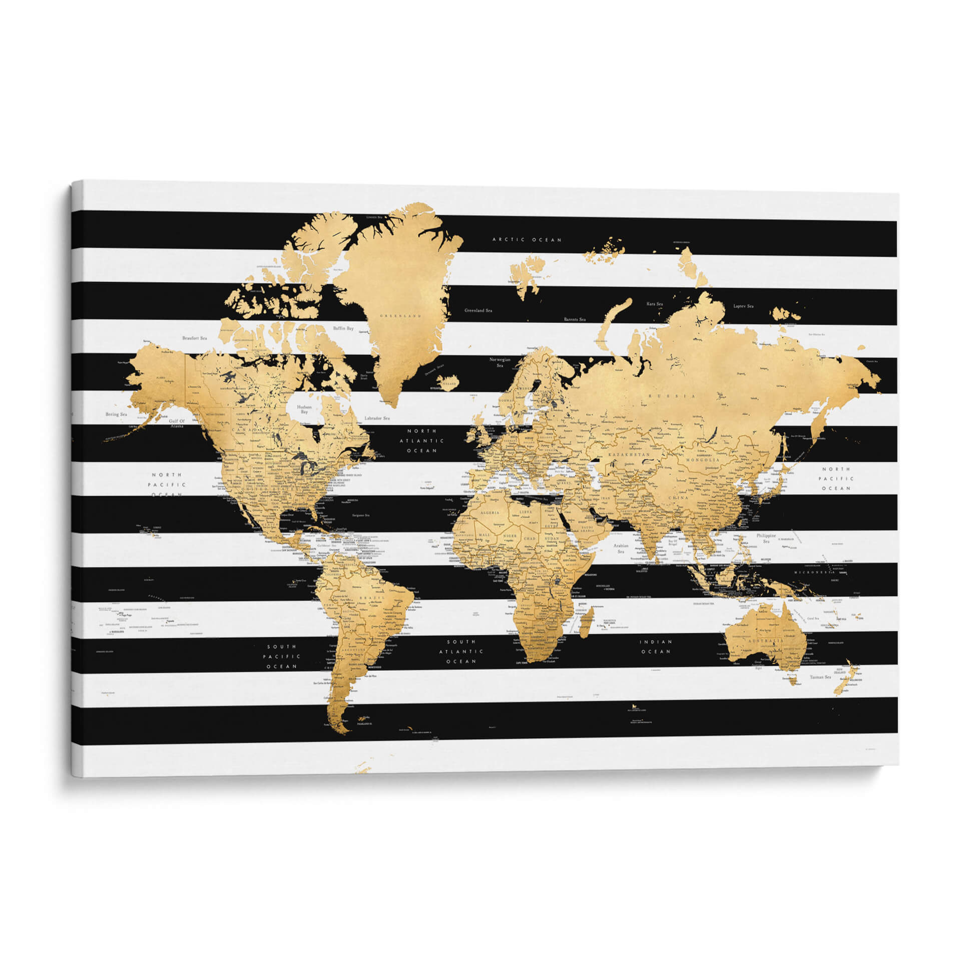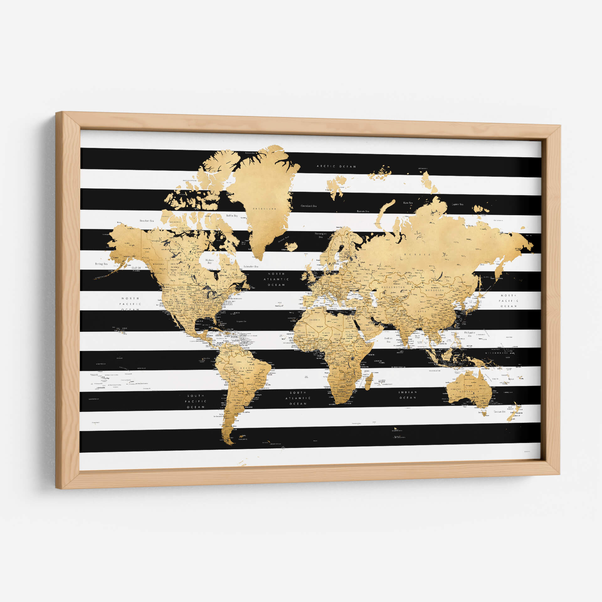 Embárcate en un viaje visual con este detallado mapa mundial, una obra de arte contemporáneo que combina la elegancia del dorado con un audaz fondo de rayas blancas y negras. Cada rincón del planeta se despliega con precisión, invitando a la exploración y al descubrimiento desde la comodidad de tu hogar u oficina. Los continentes y océanos están representados con una riqueza de detalles, haciendo de este cuadro decorativo no solo una pieza estética sino también una herramienta educativa y una fuente de inspiración para los amantes de la geografía y los viajeros empedernidos. La paleta de colores, dominada por el contraste entre el dorado brillante y el negro profundo, aporta un toque de sofisticación y modernidad, capaz de adaptarse a diversos estilos decorativos, desde el minimalista hasta el más ecléctico. Ideal para crear un punto focal impactante en salas de estar, estudios o despachos, este mapa mundial detallado es una invitación a soñar con nuevas aventuras y a conectar con el vasto mundo que nos rodea. Su diseño gráfico distintivo y la claridad de su información lo convierten en una adición excepcional a cualquier espacio que busque reflejar un espíritu cosmopolita y un aprecio por el conocimiento global. Transforma tus paredes en una ventana al mundo con esta pieza única.