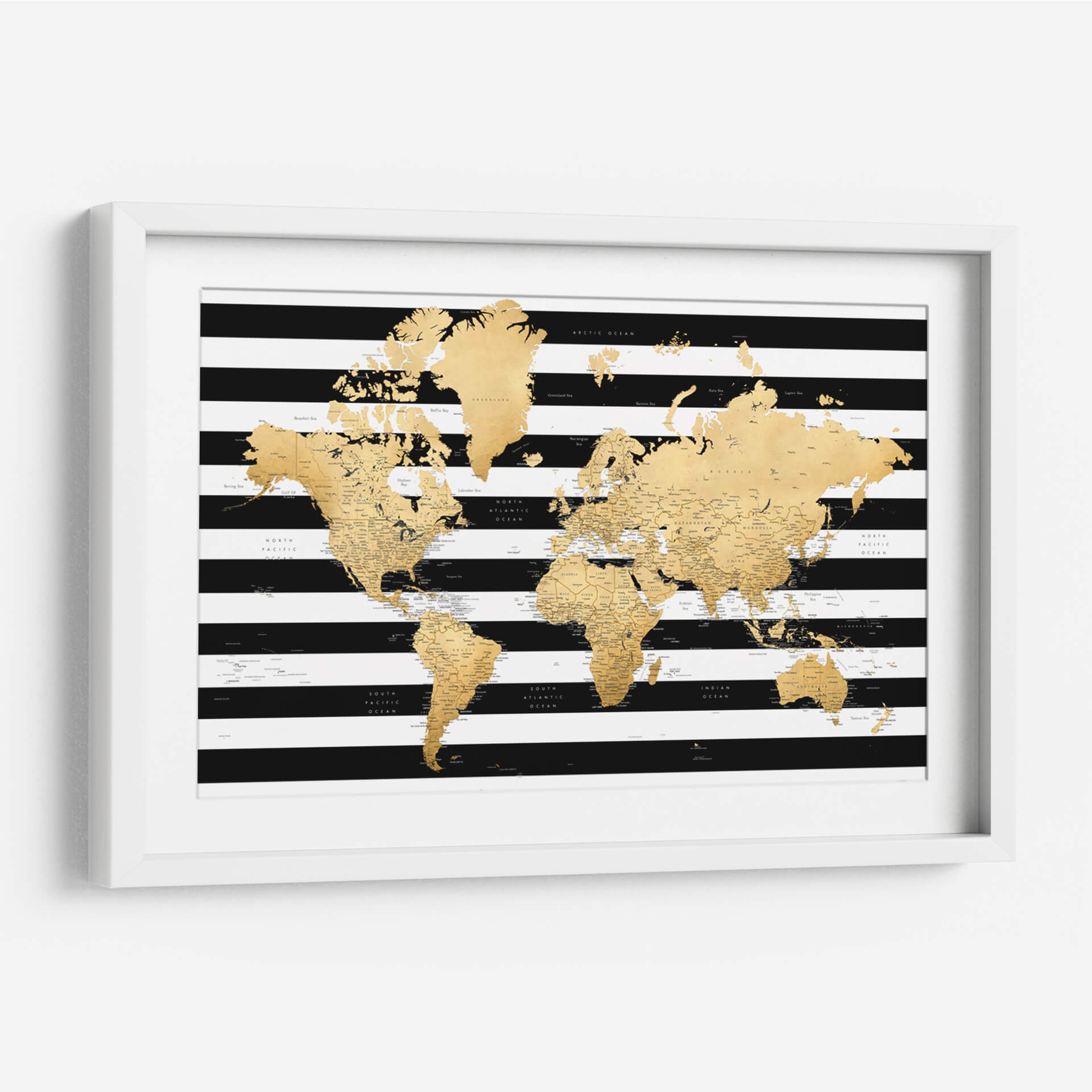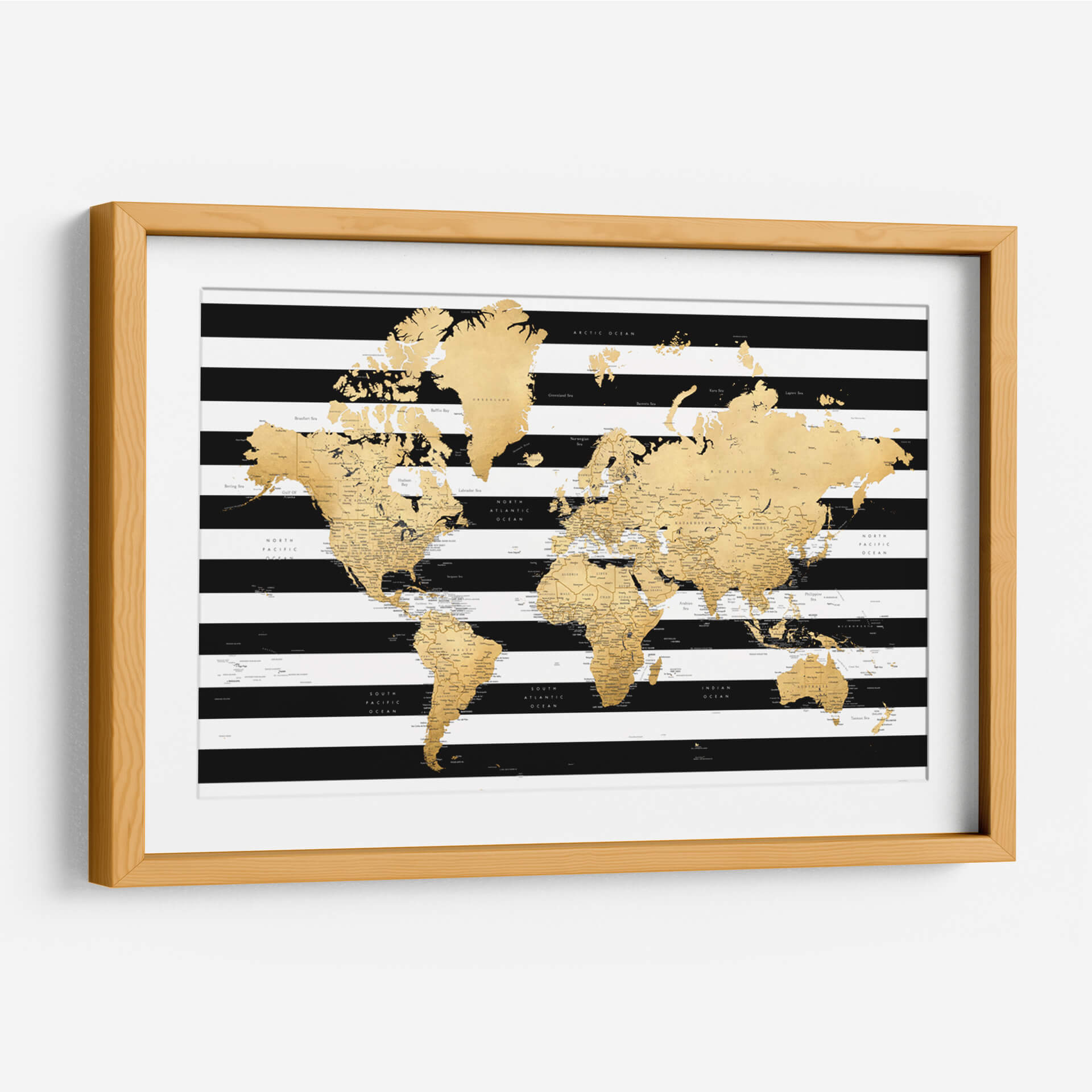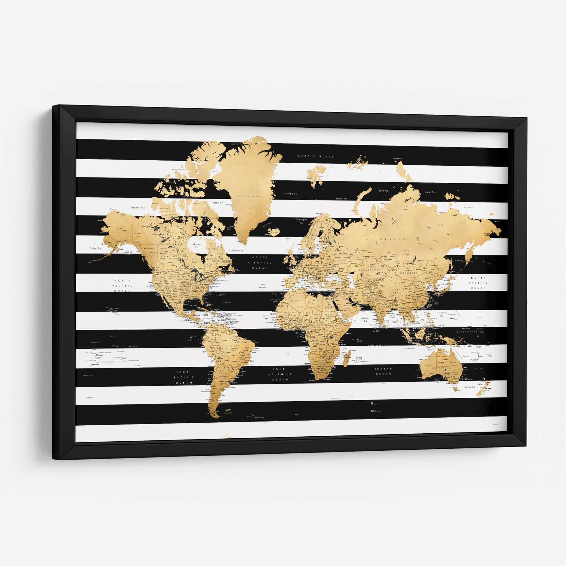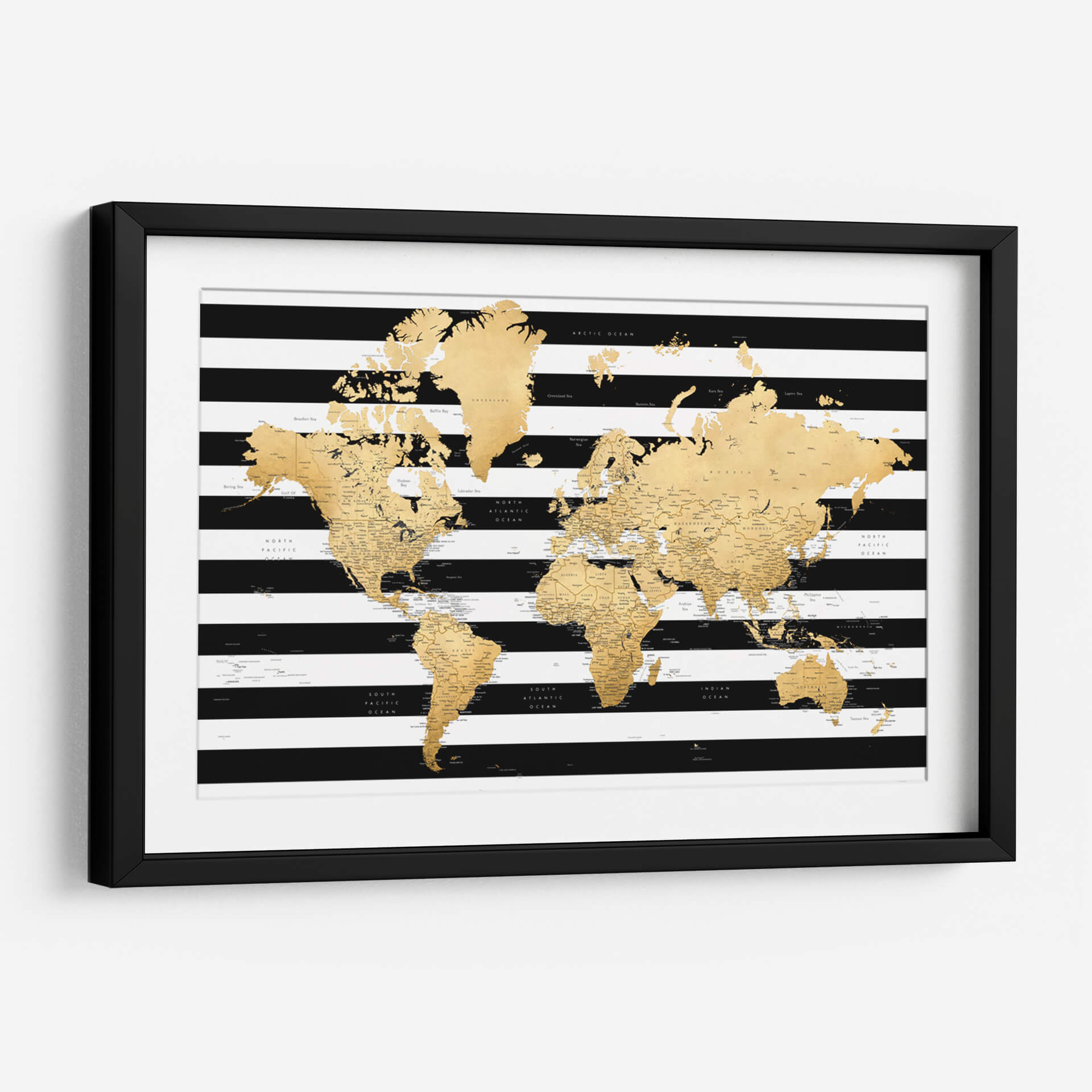 Embárcate en un viaje visual con este detallado mapa mundial, una obra de arte contemporáneo que combina la elegancia del dorado con un audaz fondo de rayas blancas y negras. Cada rincón del planeta se despliega con precisión, invitando a la exploración y al descubrimiento desde la comodidad de tu hogar u oficina. Los continentes y océanos están representados con una riqueza de detalles, haciendo de este cuadro decorativo no solo una pieza estética sino también una herramienta educativa y una fuente de inspiración para los amantes de la geografía y los viajeros empedernidos. La paleta de colores, dominada por el contraste entre el dorado brillante y el negro profundo, aporta un toque de sofisticación y modernidad, capaz de adaptarse a diversos estilos decorativos, desde el minimalista hasta el más ecléctico. Ideal para crear un punto focal impactante en salas de estar, estudios o despachos, este mapa mundial detallado es una invitación a soñar con nuevas aventuras y a conectar con el vasto mundo que nos rodea. Su diseño gráfico distintivo y la claridad de su información lo convierten en una adición excepcional a cualquier espacio que busque reflejar un espíritu cosmopolita y un aprecio por el conocimiento global. Transforma tus paredes en una ventana al mundo con esta pieza única.