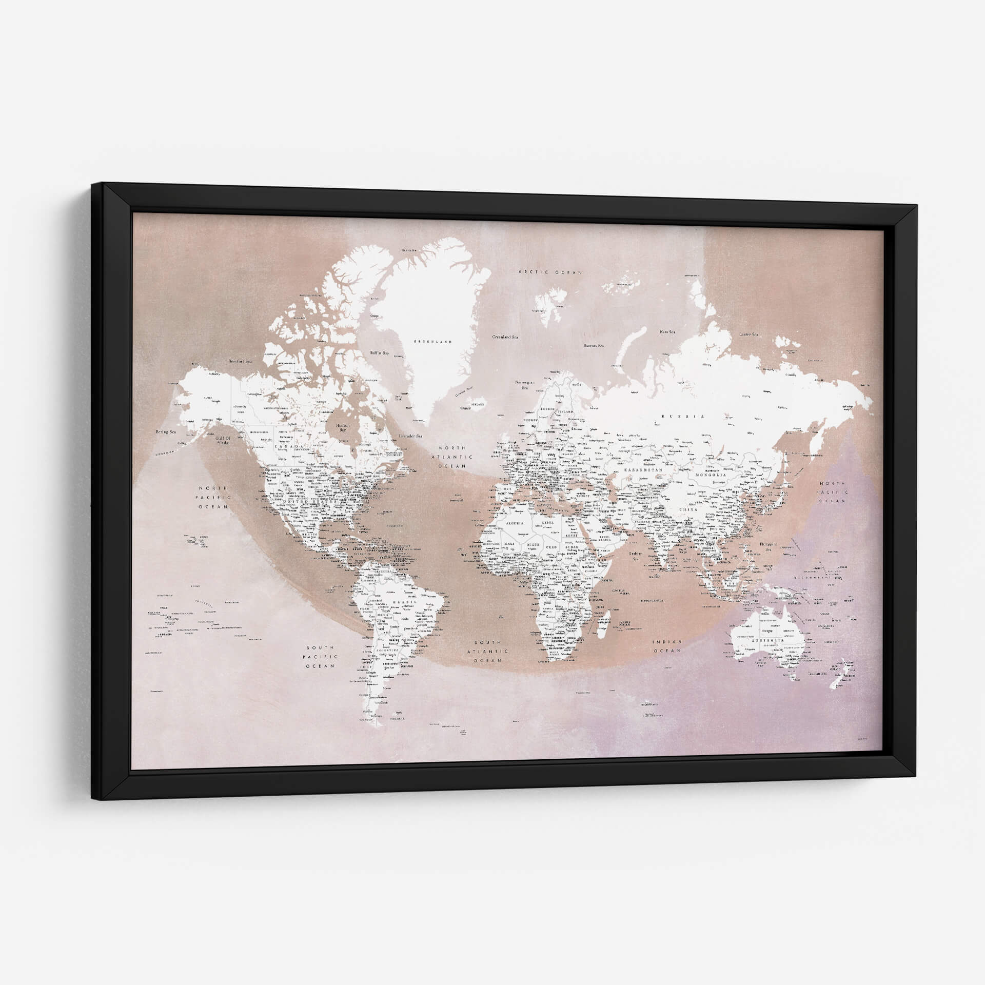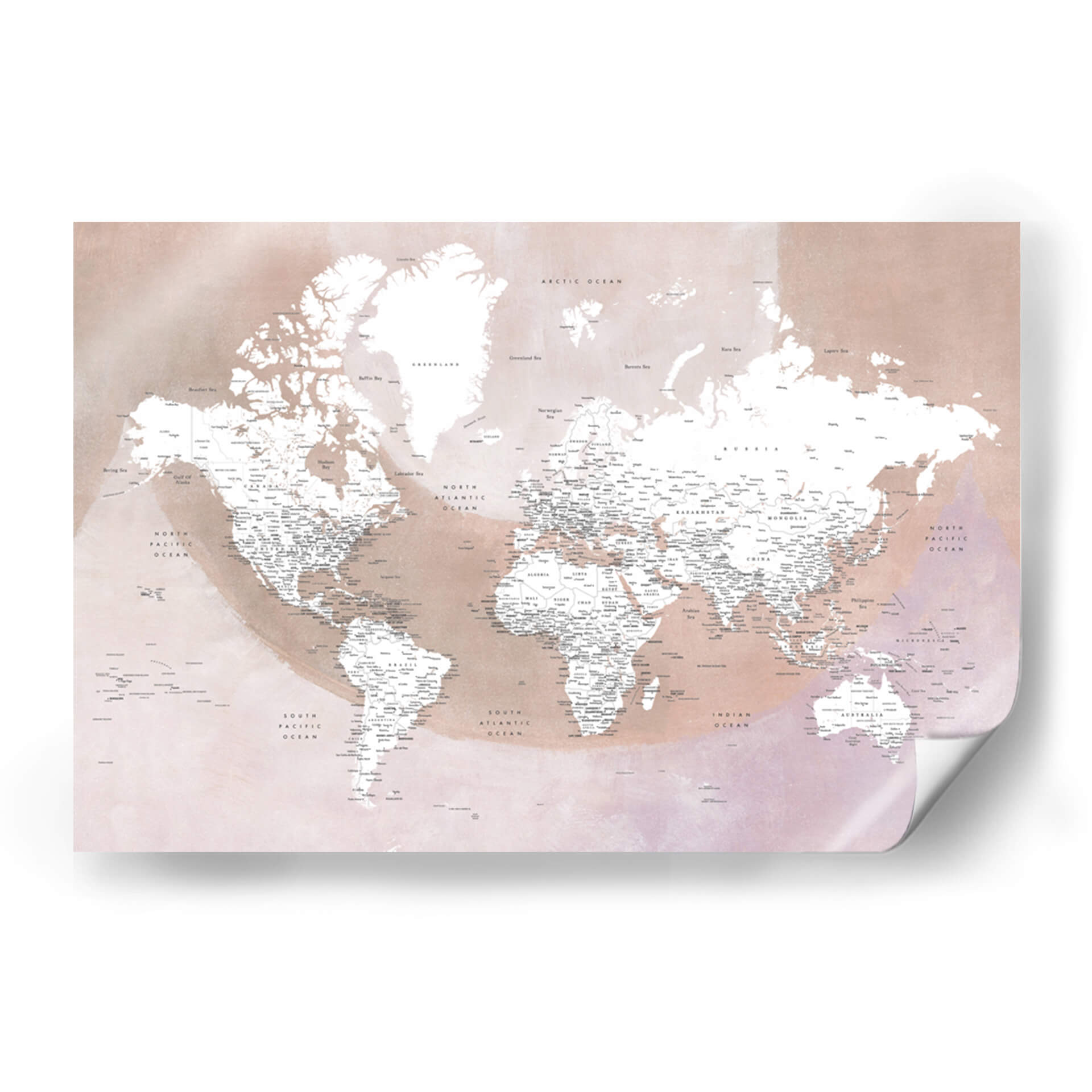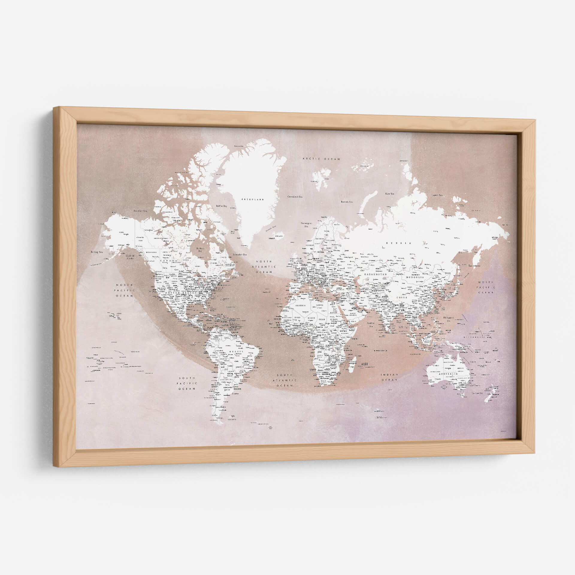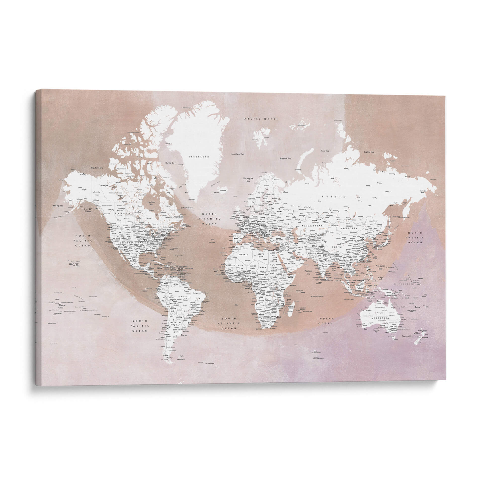 Descubre el mundo con este detallado mapa mundial en tonos empolvados, una obra de arte que combina la geografía con un diseño contemporáneo. La paleta de colores suaves, que van desde el beige rosado hasta toques de lavanda sutil, crea una atmósfera serena y sofisticada, perfecta para enriquecer cualquier espacio del hogar u oficina. Cada país y ciudad está representado con una claridad excepcional, invitando a la exploración y al descubrimiento. Este cuadro decorativo no solo es una pieza informativa, sino también un elemento de diseño que aporta profundidad y carácter. Ideal para los amantes de los viajes, la geografía, o simplemente para aquellos que buscan una decoración de pared elegante y atemporal. Su estilo moderno y minimalista asegura que se integre armoniosamente en diversos estilos decorativos, desde el escandinavo hasta el contemporáneo. Transforma tu sala de estar, estudio o dormitorio en un centro de inspiración global con este mapa mundial de alta calidad, una pieza que fomenta la curiosidad y añade un toque de distinción.