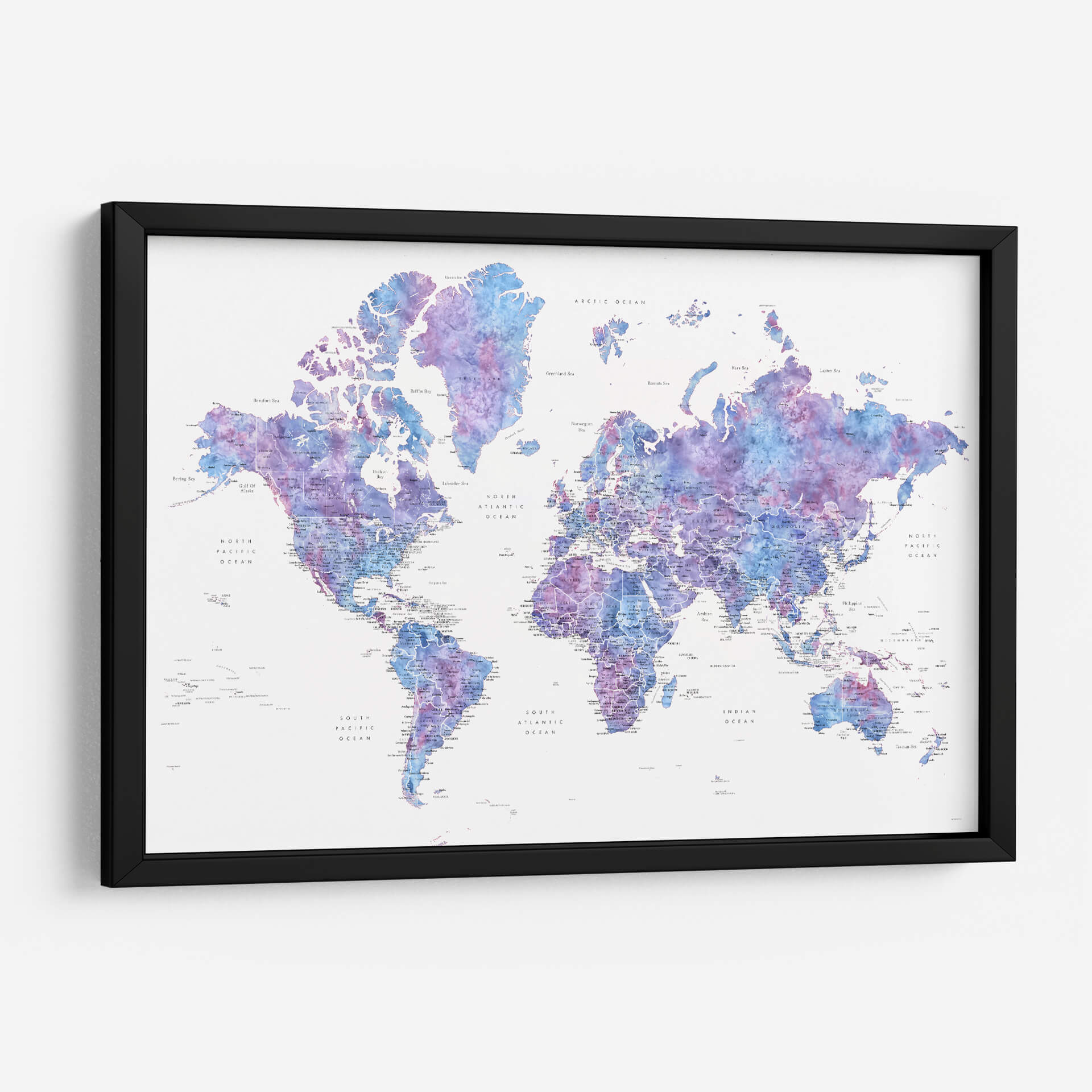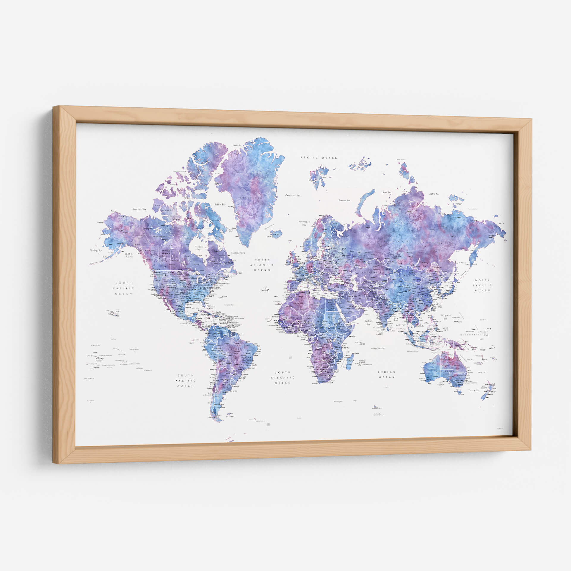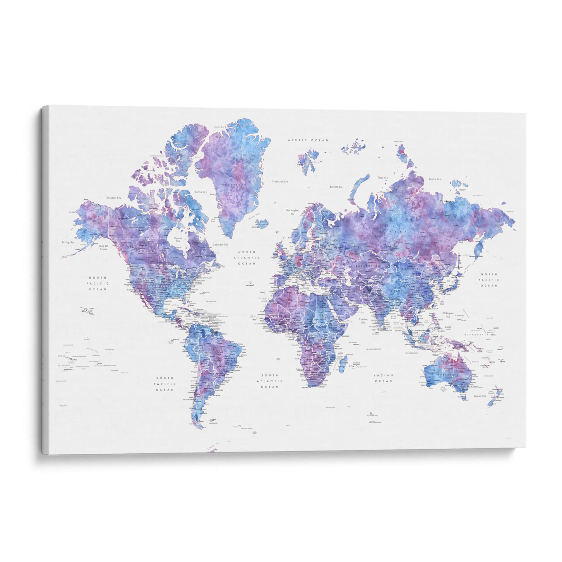 Descubre un mundo de color y detalle con este cautivador cuadro decorativo de mapa mundial. La obra "Mapa mundial detallado con ciudades Raúl" de Rosana Laiz Blursbyai transforma la geografía en una obra de arte etérea, utilizando una paleta de acuarela que fusiona delicados tonos de azul y púrpura. Cada continente y océano cobra vida con pinceladas suaves y fluidas, creando una atmósfera serena y a la vez intrigante. Este mapa abstracto no solo es una representación del planeta, sino una invitación a la exploración y al descubrimiento, evocando una sensación de asombro y conexión global. Las sutiles texturas y las variaciones de color añaden profundidad y dinamismo, haciendo que cada mirada revele un nuevo matiz. Ideal para cualquier espacio que busque un toque de sofisticación y serenidad, este cuadro decorativo es perfecto para salas de estar modernas, estudios o incluso oficinas, aportando un aire de inspiración viajera y elegancia contemporánea. Añade una perspectiva única a tu decoración y deja que este mapa te transporte a lugares lejanos.