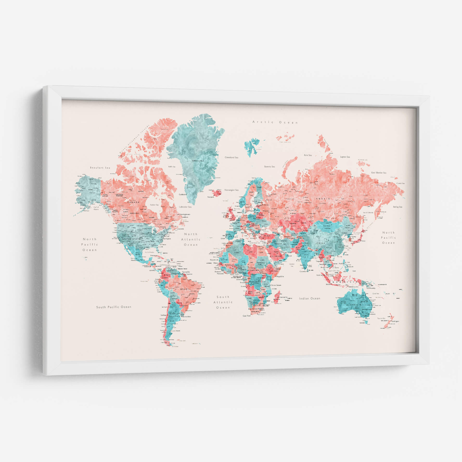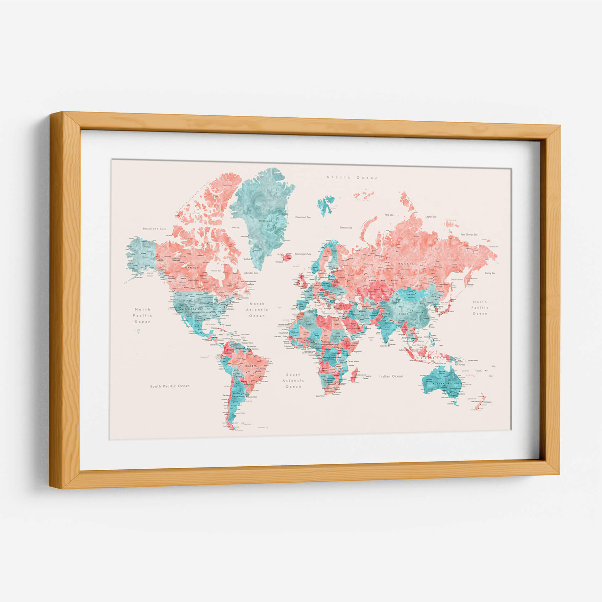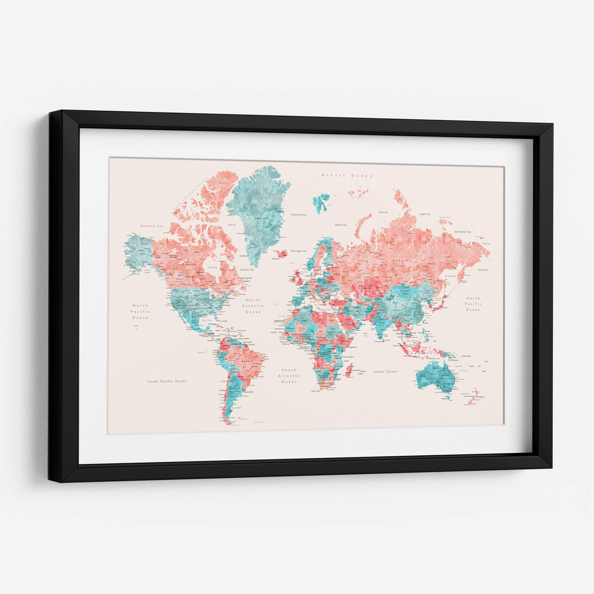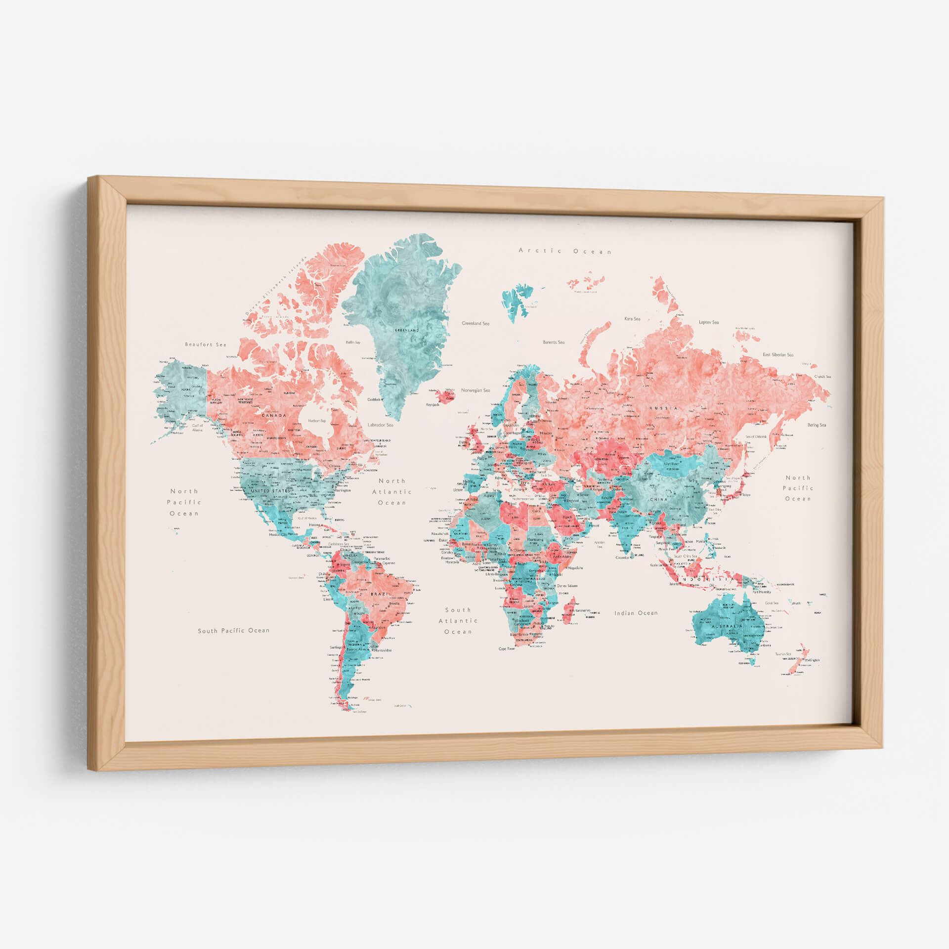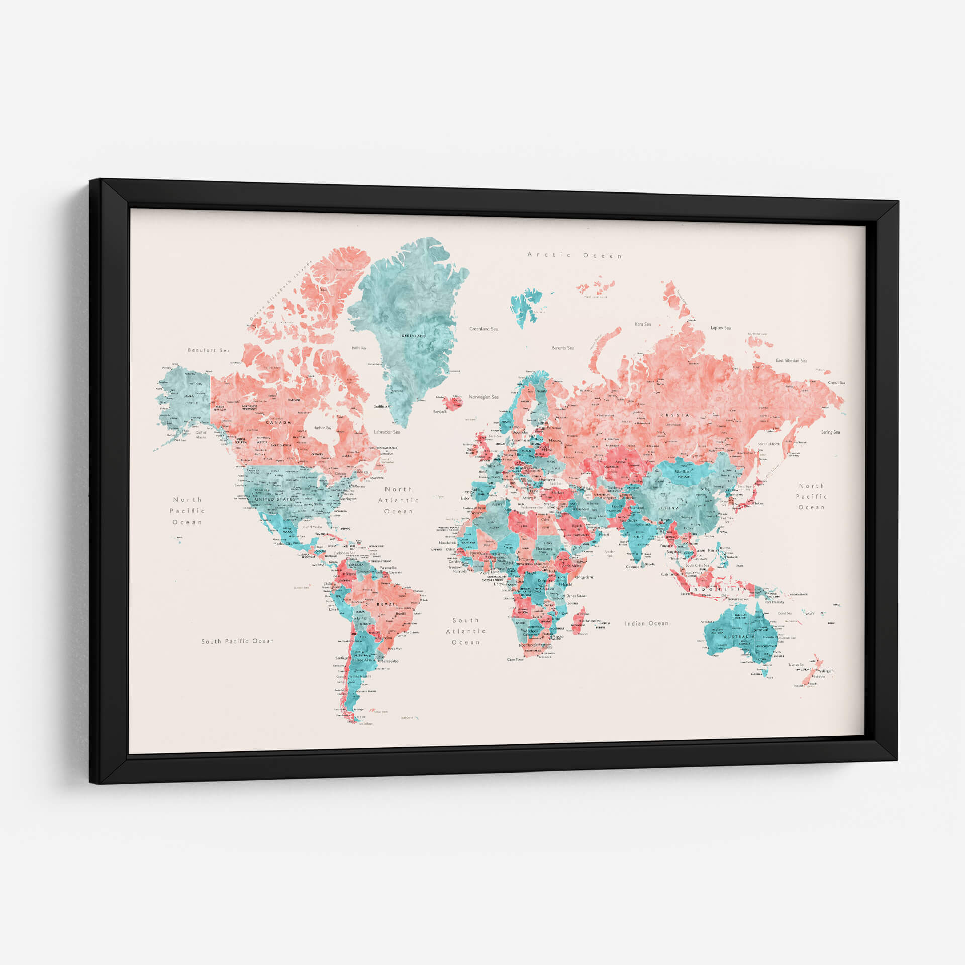 Descubre el mundo con este cautivador cuadro decorativo de mapa mundial en acuarela, una obra de arte que combina la geografía con un toque artístico delicado. Los continentes se despliegan en una paleta de colores suaves que fusiona tonos coral y turquesa, evocando una sensación de tranquilidad y exploración. Cada país y ciudad está sutilmente delineado, invitando a la contemplación y al descubrimiento de lugares lejanos. La técnica de acuarela, con sus sutiles gradaciones y texturas, añade una profundidad y un carácter orgánico a la representación cartográfica tradicional, transformándola en una pieza decorativa vibrante y llena de personalidad. Este mapa mundial es ideal para inspirar sueños de viaje, añadir un punto focal educativo a un estudio o sala de estar, o simplemente como un recordatorio de la belleza y diversidad de nuestro planeta. Su estilo contemporáneo y su ejecución artística lo convierten en una adición versátil a cualquier hogar u oficina, aportando un aire de sofisticación y aventura. Ideal para quienes buscan arte de pared con significado y estética refinada, este cuadro es una ventana al mundo lista para ser admirada cada día, fomentando la curiosidad y el deseo de explorar nuevos horizontes. Transforma tus espacios con esta representación única y evocadora de la Tierra, fusionando el arte con la pasión por el descubrimiento y la geografía.