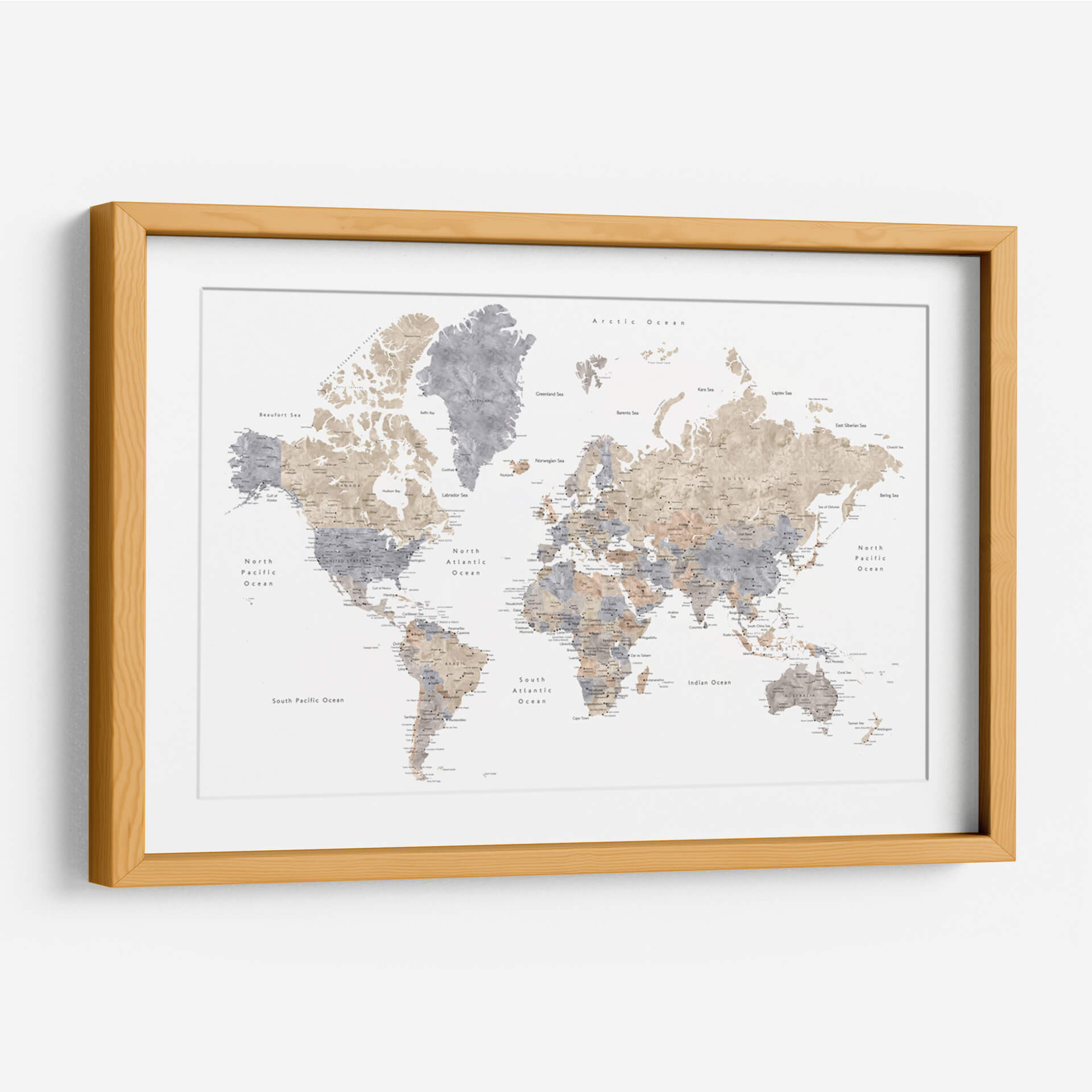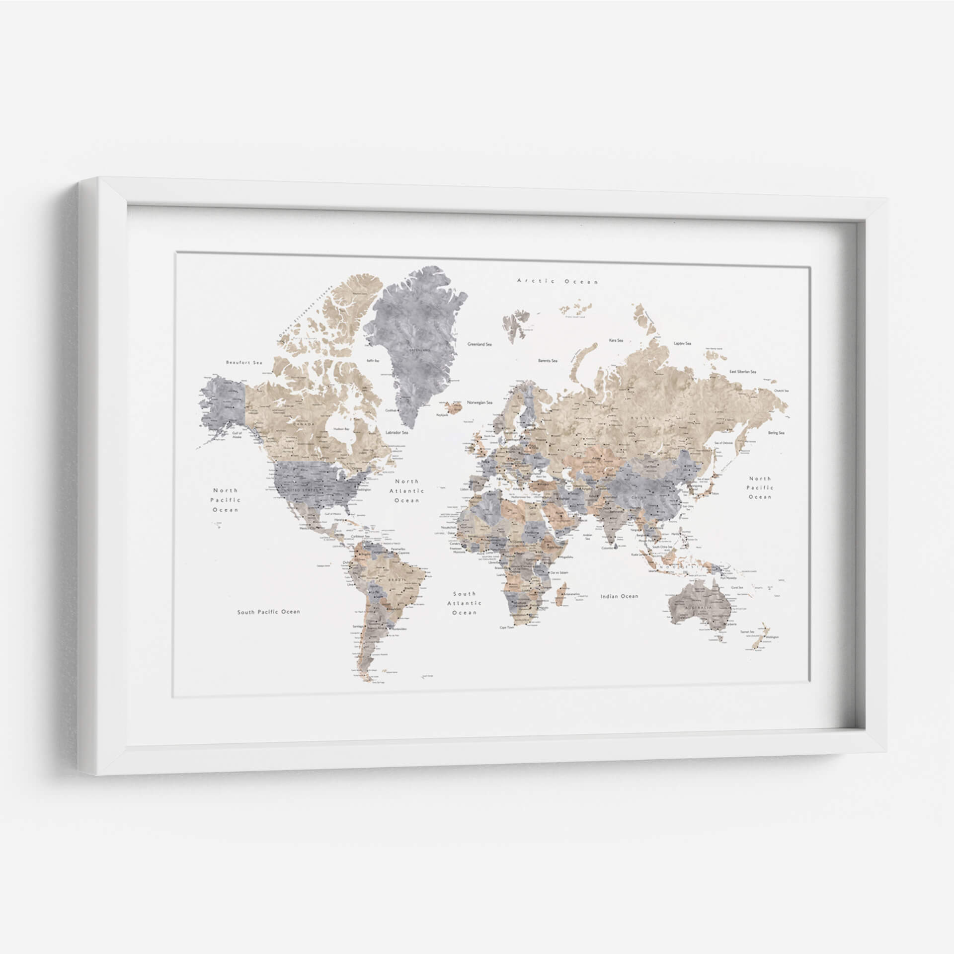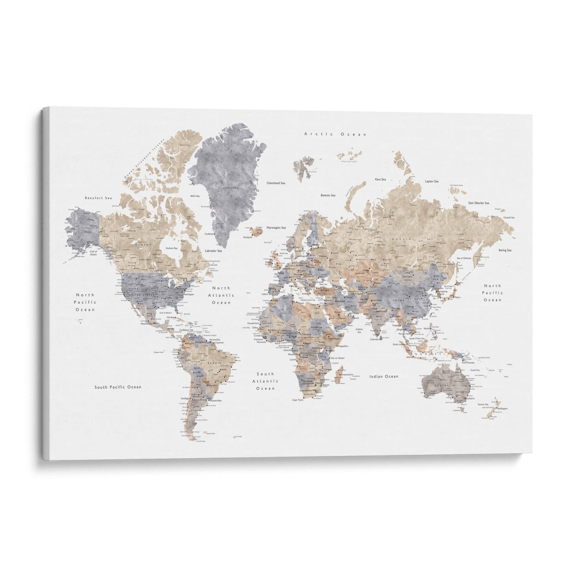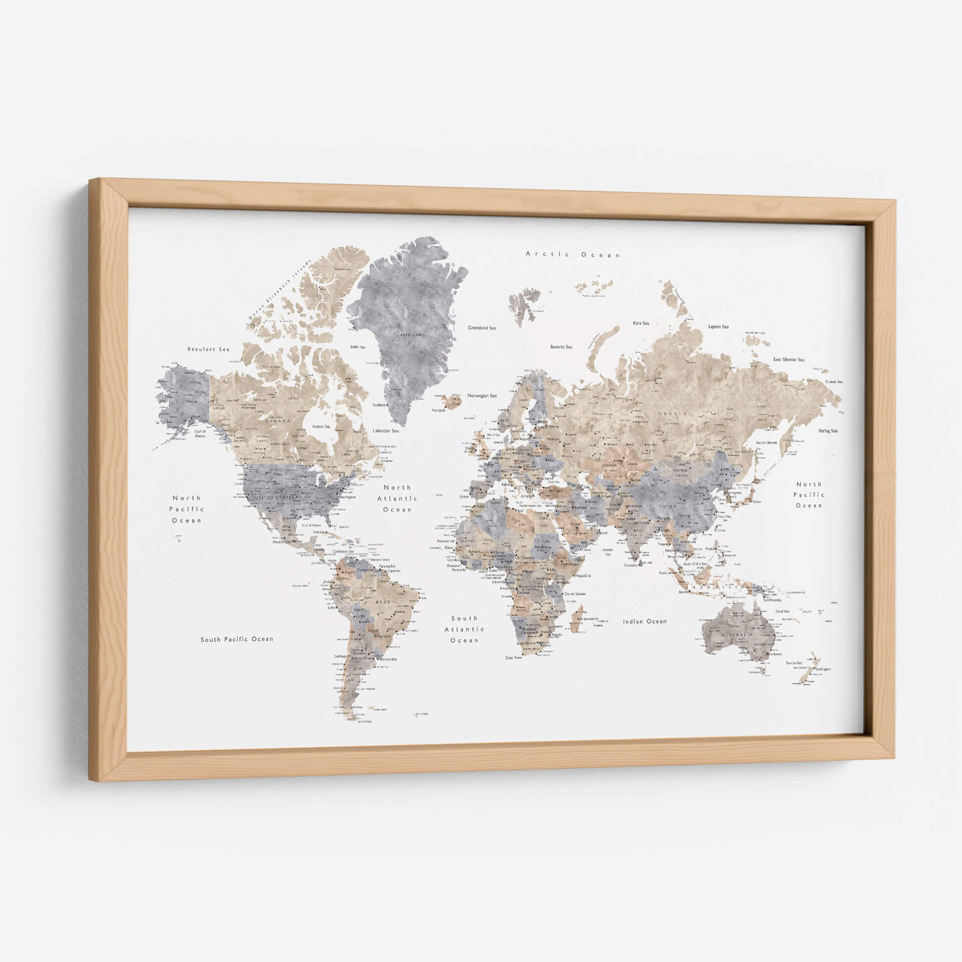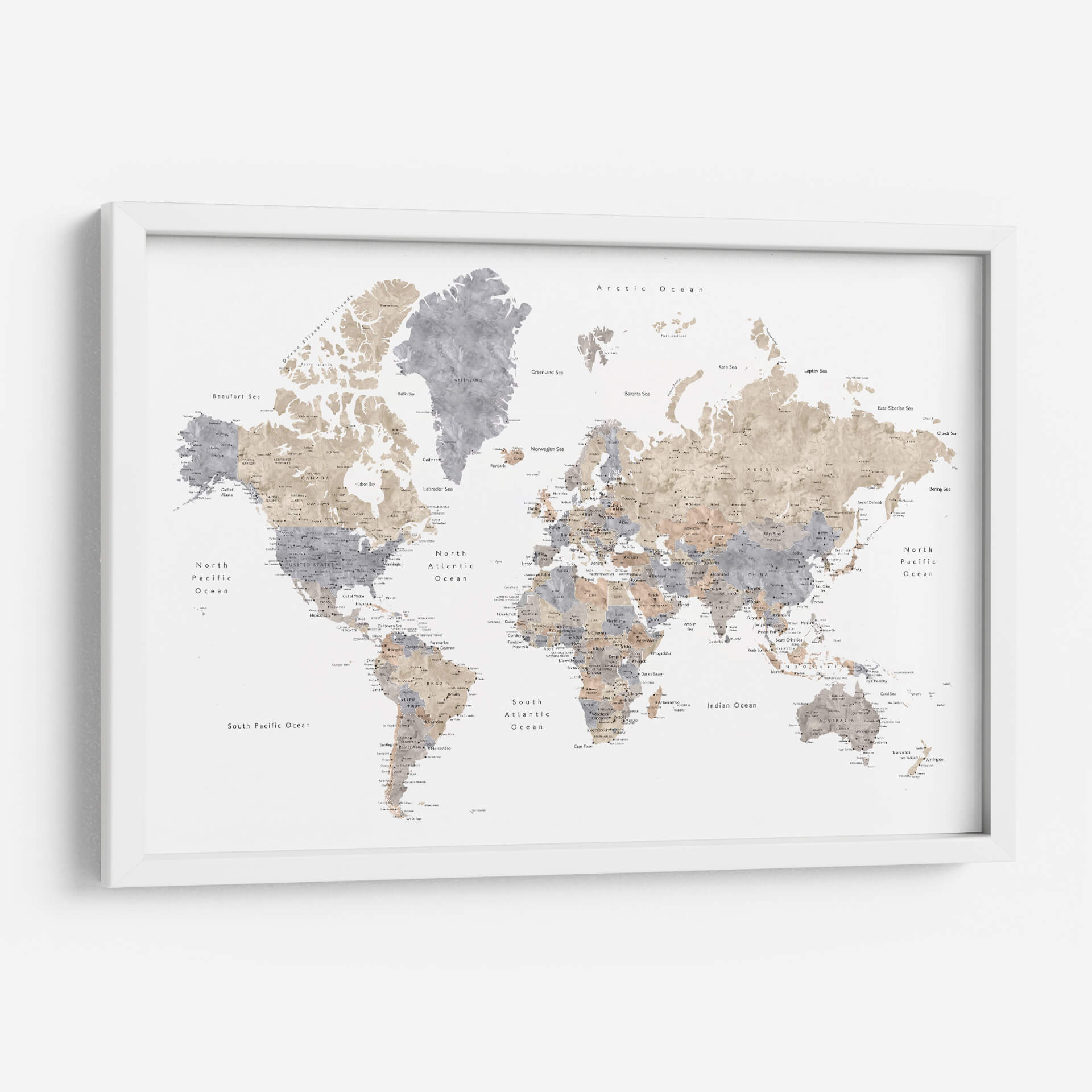 Emb rquez en un viaje visual alrededor del globo con este cautivador cuadro decorativo de mapa mundial en acuarela. La obra de arte de Rosana Laiz Blursbyai presenta un estilo de acuarela sutil y etéreo, donde continentes y océanos cobran vida con pinceladas delicadas y una paleta de colores que evoca serenidad y sofisticación. Los tonos tierra y grises se entrelazan, creando un contraste suave que resalta la geografía del planeta de una manera artística y moderna. Cada ciudad y característica geográfica está representada con un detalle sutil, invitando a la contemplación y al descubrimiento. Este mapa mundial no es solo una pieza decorativa, sino una ventana a la diversidad y la interconexión de nuestro mundo. Es una adición perfecta para cualquier espacio que busque un toque de elegancia, inspiración y una conexión global. Ideal para salas de estar, estudios u oficinas, este cuadro decorativo de mapa mundial en acuarela añadirá profundidad y carácter a su decoración, funcionando como un punto focal inspirador que fomenta la conversación y la curiosidad sobre el vasto y fascinante mundo que habitamos. Permita que la belleza de la cartografía artística transforme su entorno.