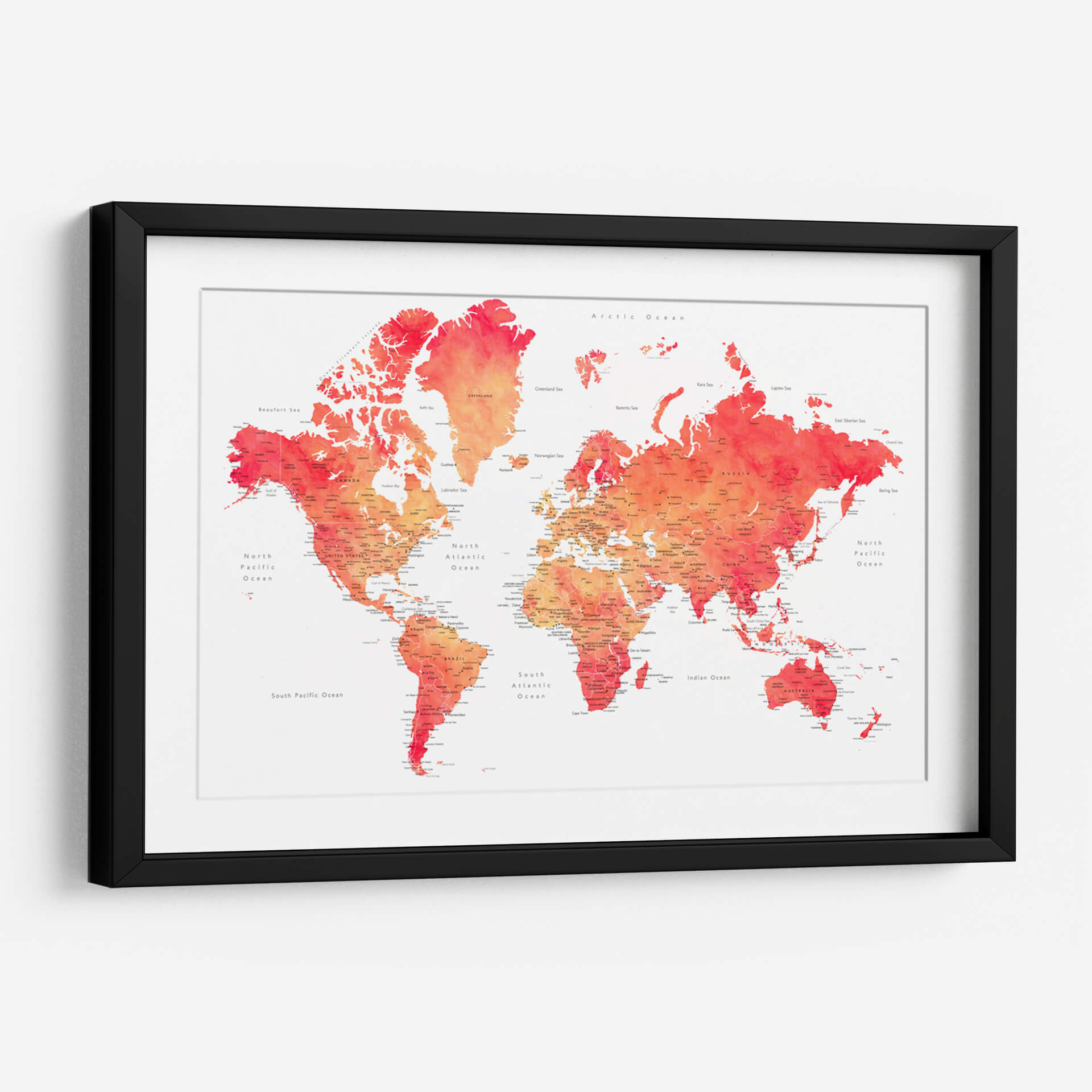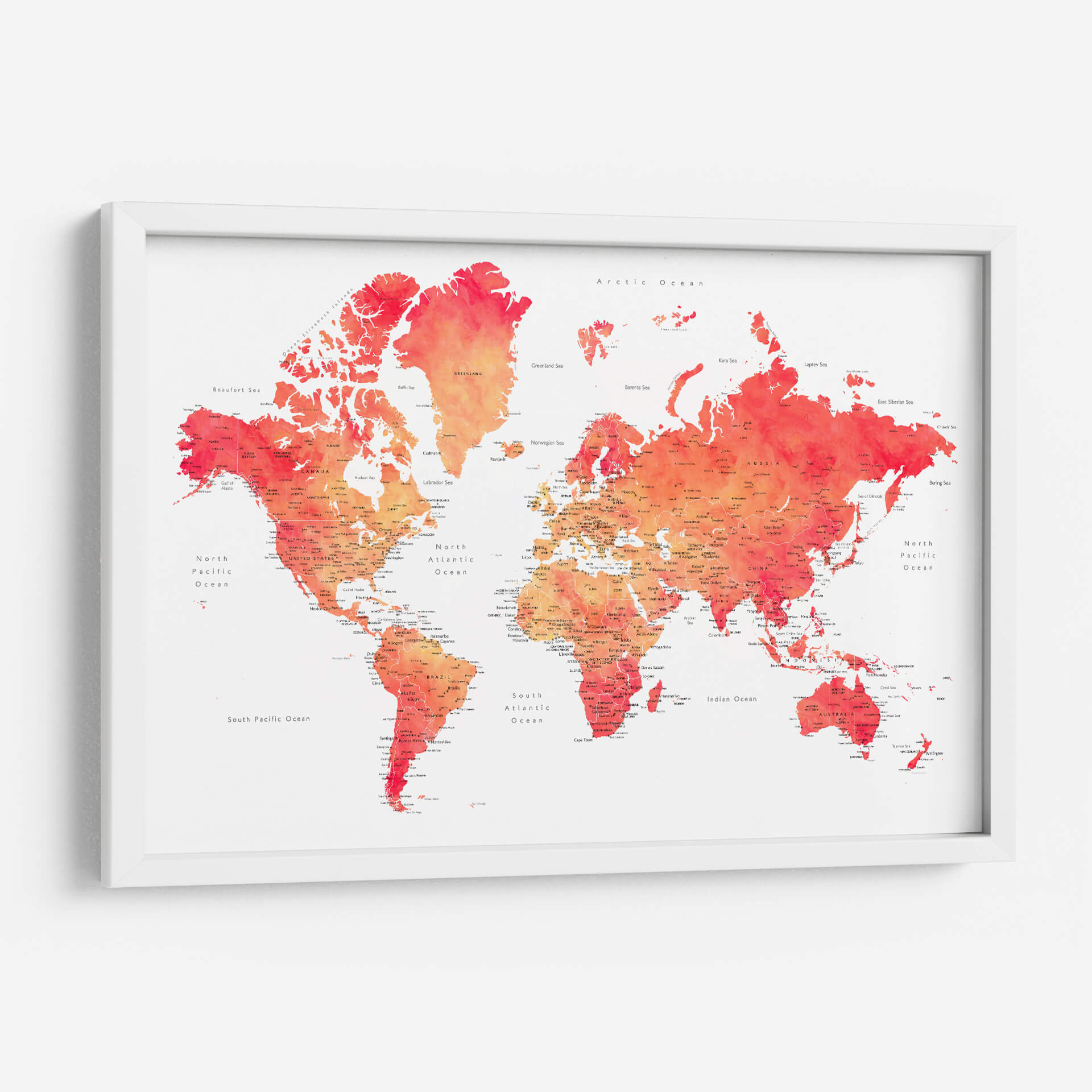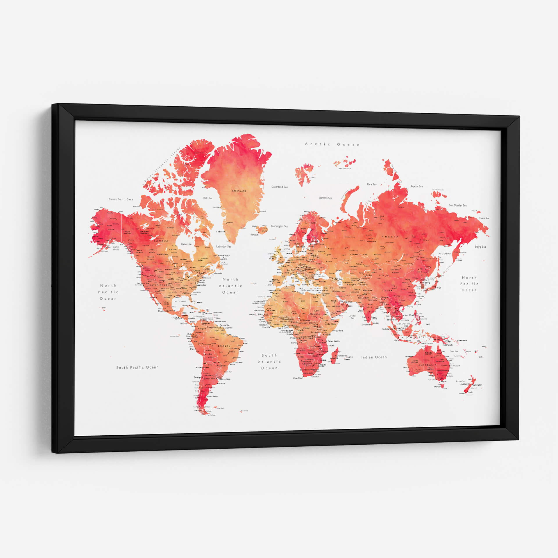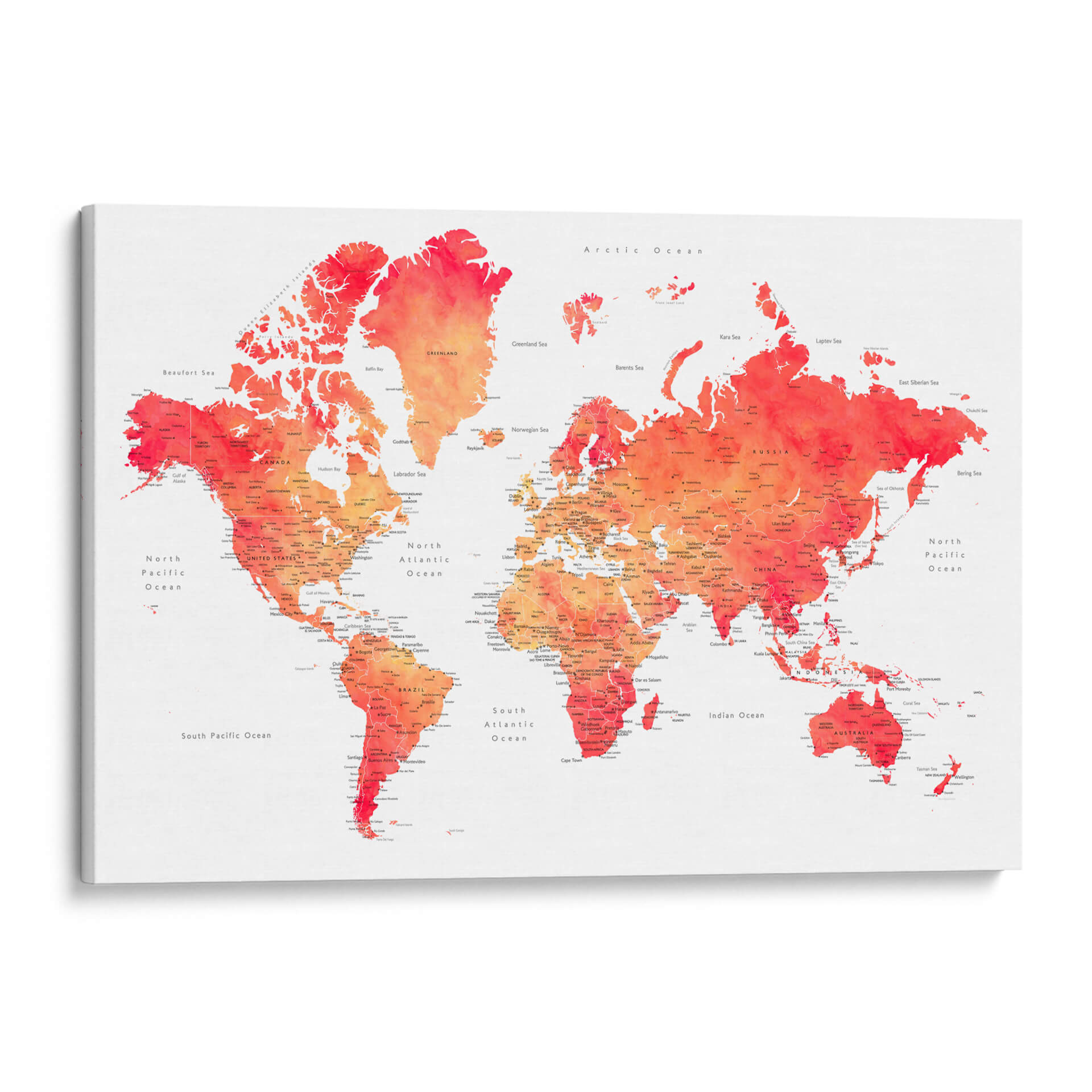 Embárcate en un viaje visual con nuestro cautivador cuadro decorativo del mapa mundial en acuarela, una obra vibrante que fusiona la geografía con el arte contemporáneo. Esta pieza presenta el mundo entero representado con delicados trazos de acuarela, donde los continentes y océanos cobran vida a través de una paleta de colores que transita desde cálidos naranjas y rojos intensos hasta suaves tonos rosados y amarillos. La técnica de acuarela imparte una sensación de fluidez y ligereza, haciendo que la familiaridad de la geografía se sienta fresca y artística. Cada país y ciudad está sutilmente etiquetado, ofreciendo un toque de detalle para los curiosos observadores, mientras que el fondo blanco roto proporciona un contraste limpio que realza la intensidad de los colores. Ideal para inspirar el deseo de explorar o simplemente para añadir un toque de color y sofisticación a cualquier espacio, este mapa decorativo es perfecto para salas de estar, oficinas o cualquier lugar donde se busque un punto focal intelectual y estético. Transforma tu pared en una ventana al mundo con esta interpretación artística y moderna de la cartografía.