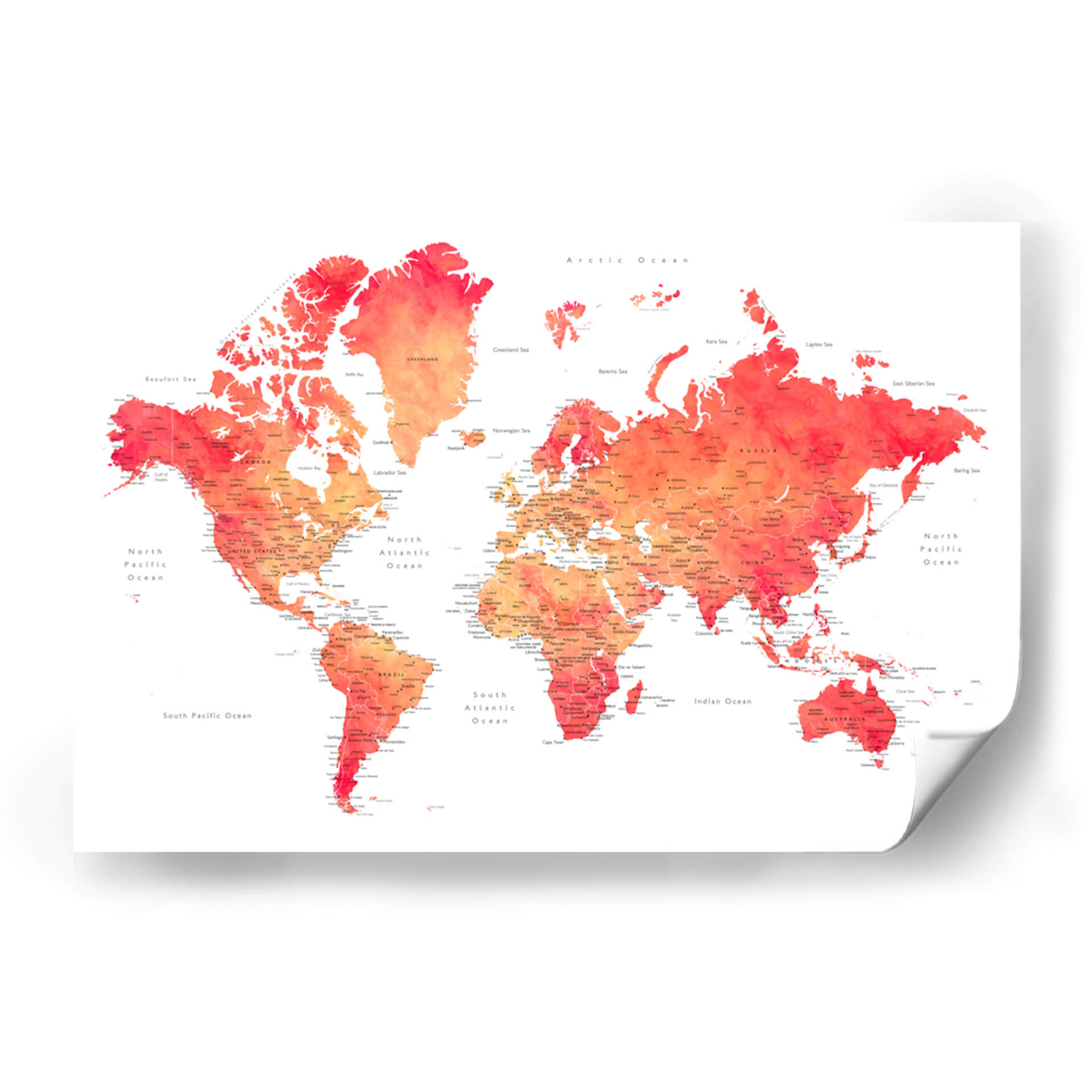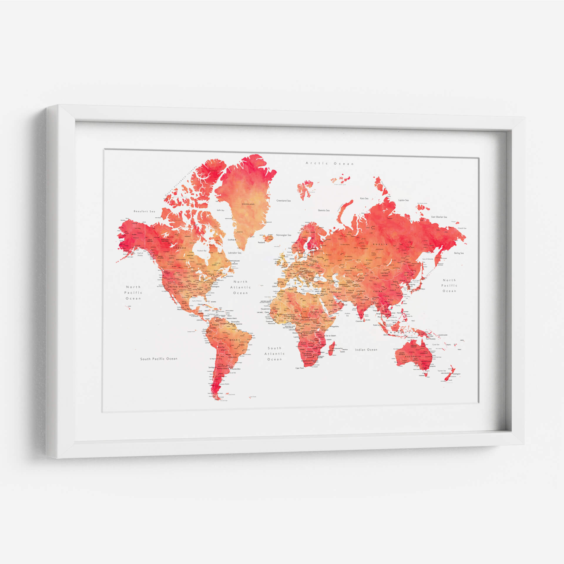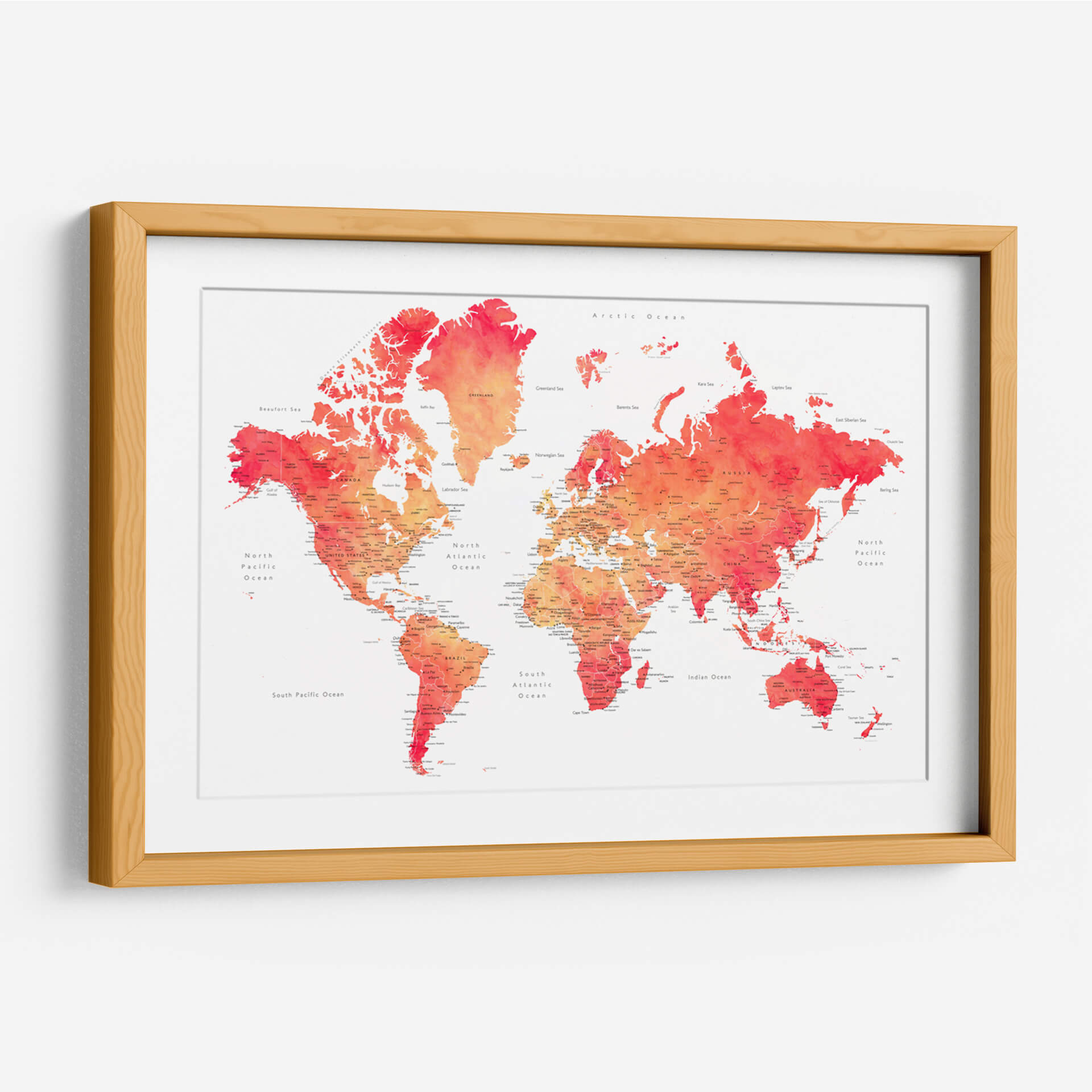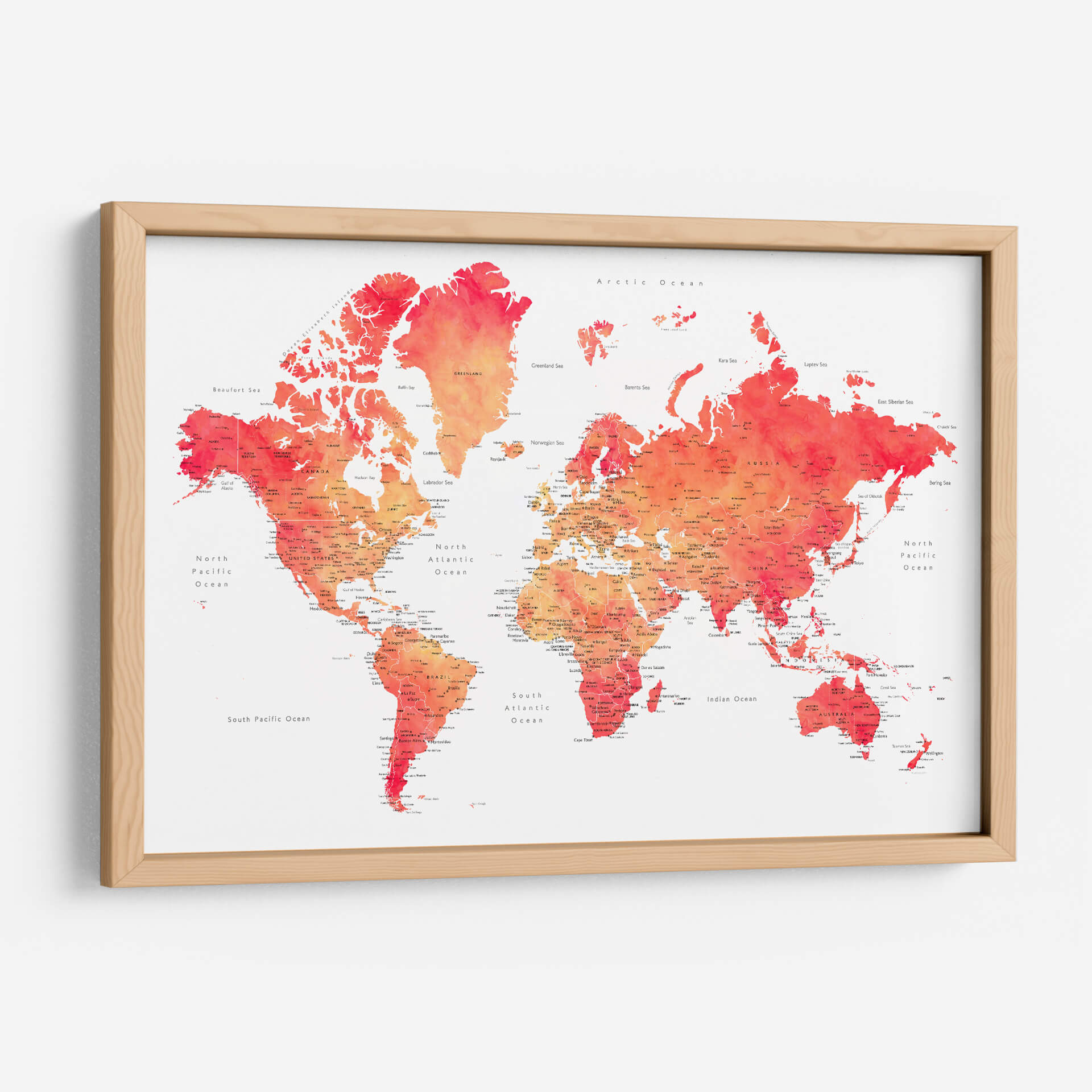 Embárcate en un viaje visual con nuestro cautivador cuadro decorativo del mapa mundial en acuarela, una obra vibrante que fusiona la geografía con el arte contemporáneo. Esta pieza presenta el mundo entero representado con delicados trazos de acuarela, donde los continentes y océanos cobran vida a través de una paleta de colores que transita desde cálidos naranjas y rojos intensos hasta suaves tonos rosados y amarillos. La técnica de acuarela imparte una sensación de fluidez y ligereza, haciendo que la familiaridad de la geografía se sienta fresca y artística. Cada país y ciudad está sutilmente etiquetado, ofreciendo un toque de detalle para los curiosos observadores, mientras que el fondo blanco roto proporciona un contraste limpio que realza la intensidad de los colores. Ideal para inspirar el deseo de explorar o simplemente para añadir un toque de color y sofisticación a cualquier espacio, este mapa decorativo es perfecto para salas de estar, oficinas o cualquier lugar donde se busque un punto focal intelectual y estético. Transforma tu pared en una ventana al mundo con esta interpretación artística y moderna de la cartografía.