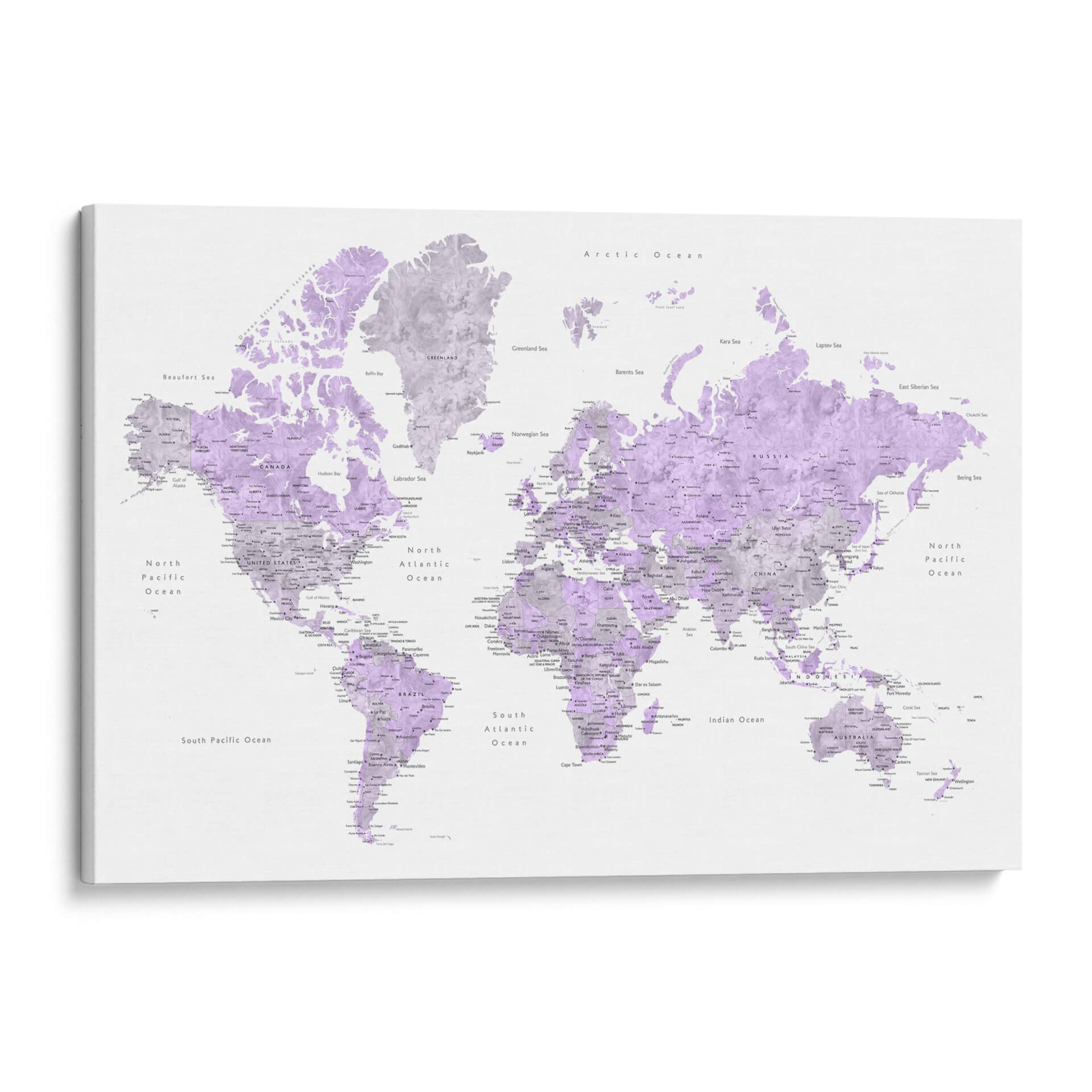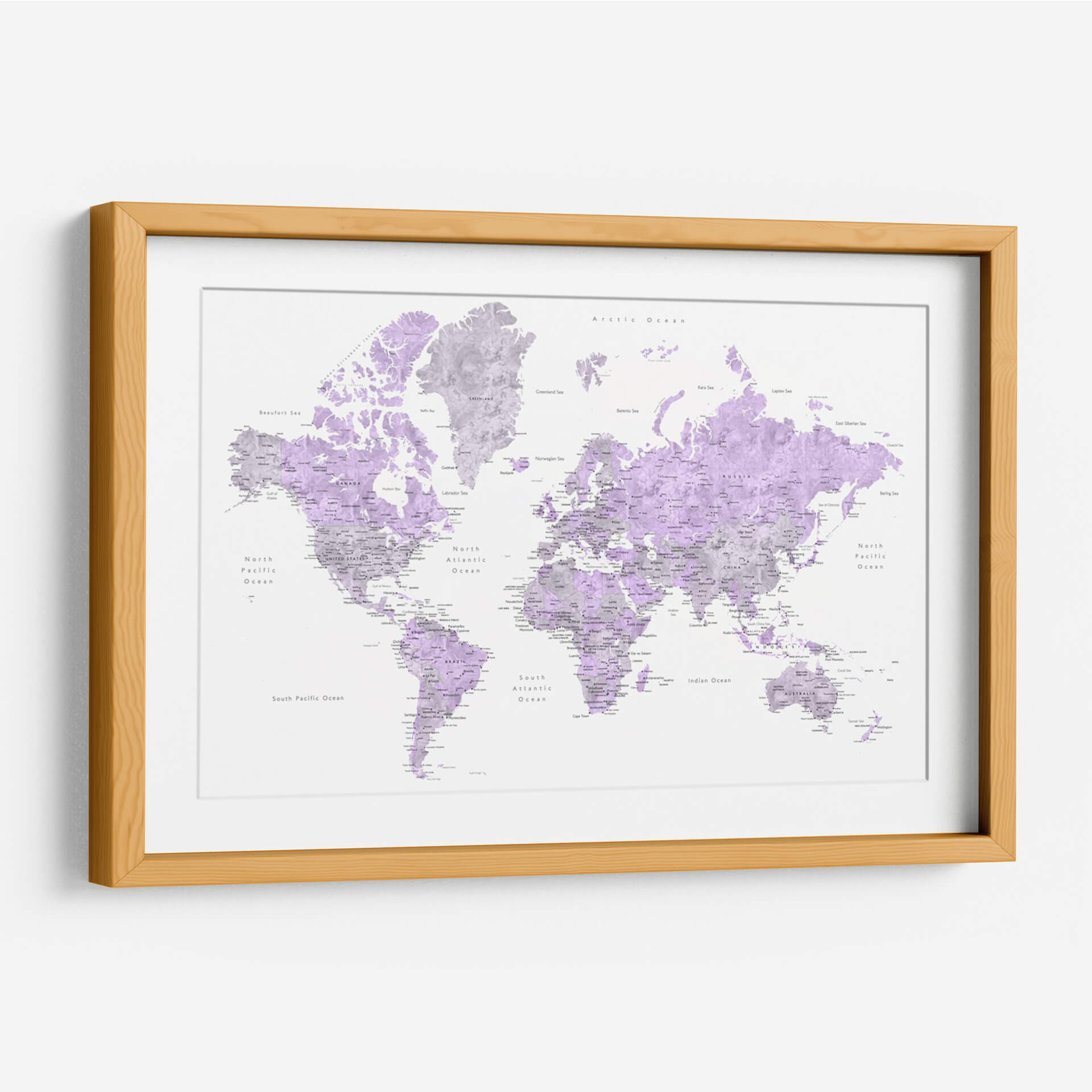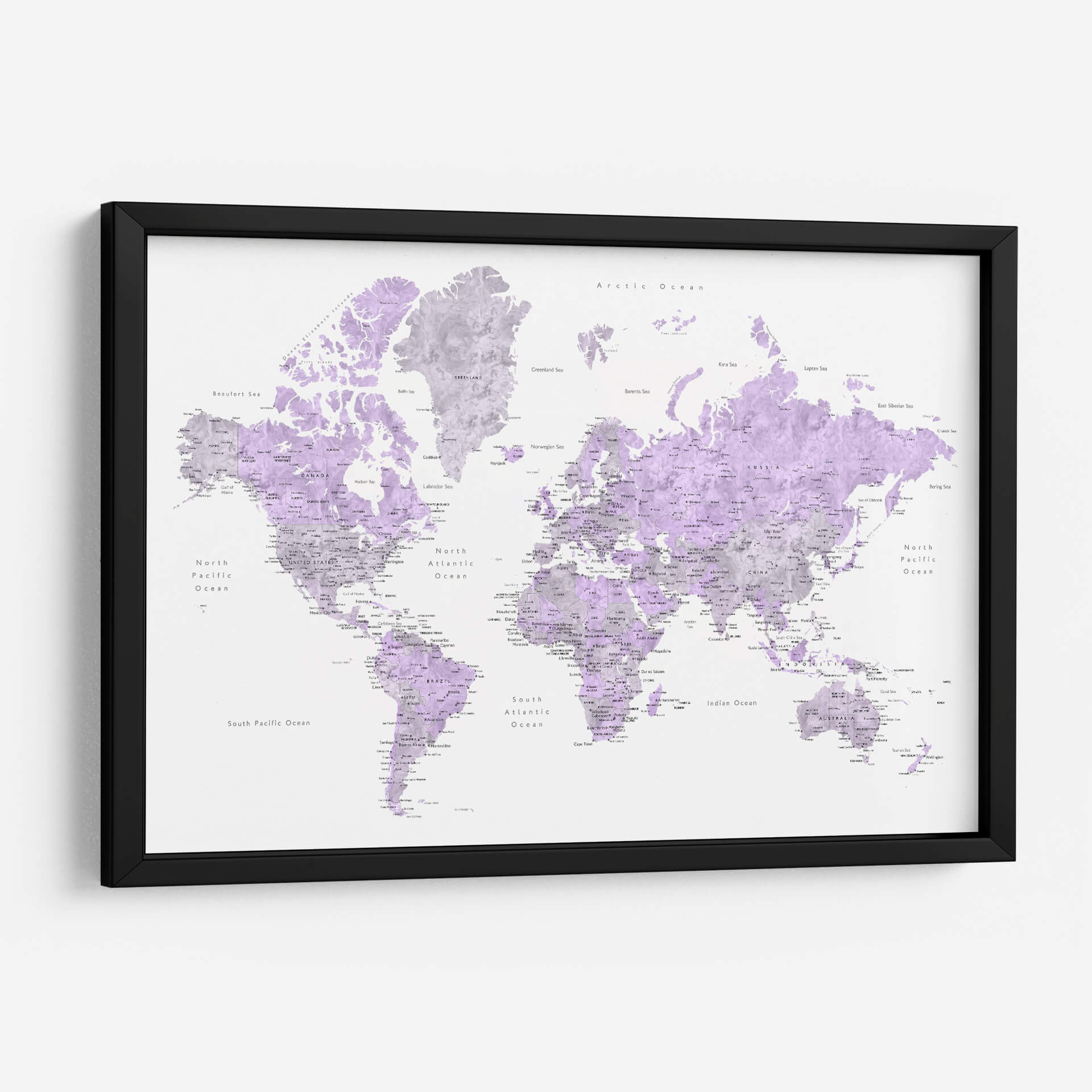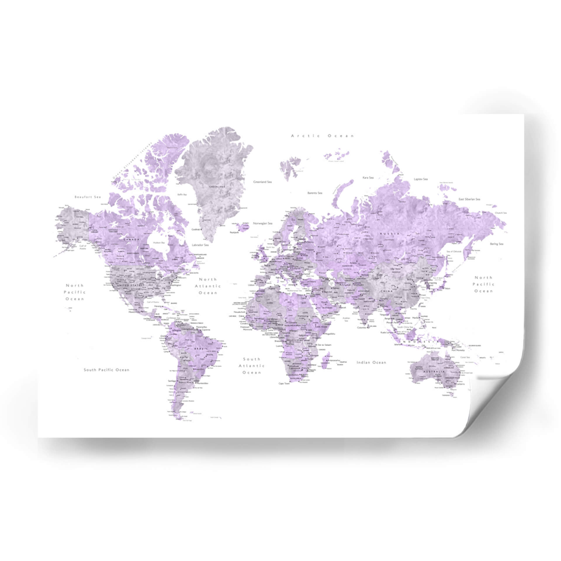Transforma tu espacio con este cautivador cuadro decorativo de mapa mundial en acuarela, una pieza que evoca el espíritu de la exploración y la conexión global. La obra, titulada "Mapa mundial en acuarela con ciudades Tanya" del artista Rosana Laiz Blursbyai, presenta una interpretación artística única del planeta, donde los continentes y océanos se despliegan en una delicada paleta de tonos lila y grises suaves. Cada ciudad está sutilmente marcada, invitando a la contemplación de viajes pasados o futuros y añadiendo un toque de sofisticación a cualquier decoración. La técnica de acuarela aporta una fluidez y una profundidad sutil, creando una atmósfera de calma y serenidad. Este mapa mundial es ideal para inspirar conversaciones y añadir un punto de interés visual a tu hogar u oficina, ya sea en un estudio moderno, una sala de estar acogedora o un dormitorio tranquilo. Su diseño versátil se integra fácilmente con diversos estilos decorativos, desde el minimalista hasta el contemporáneo, convirtiéndolo en una elección perfecta para los amantes de la geografía, los viajeros y aquellos que buscan una pieza de arte con significado y estilo.