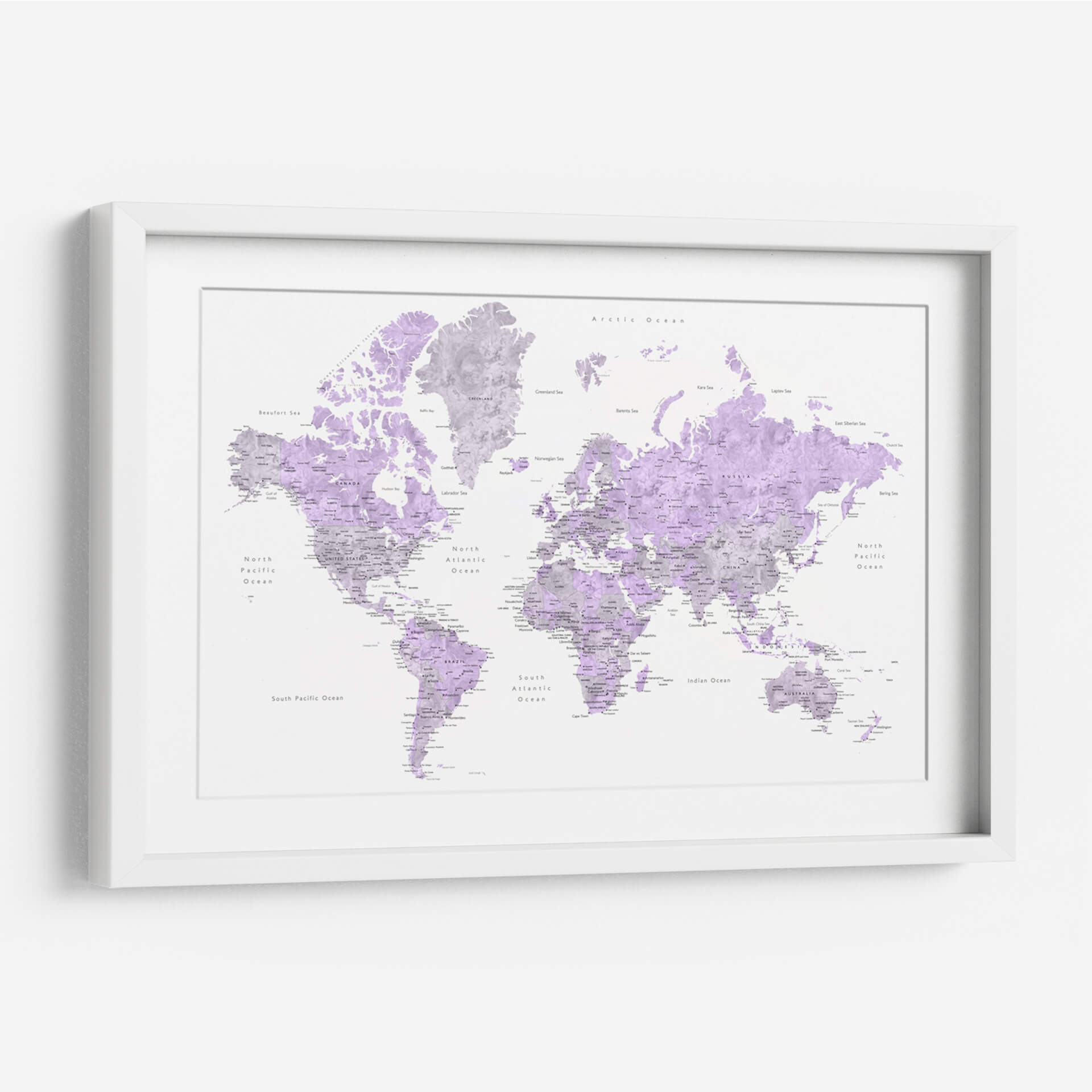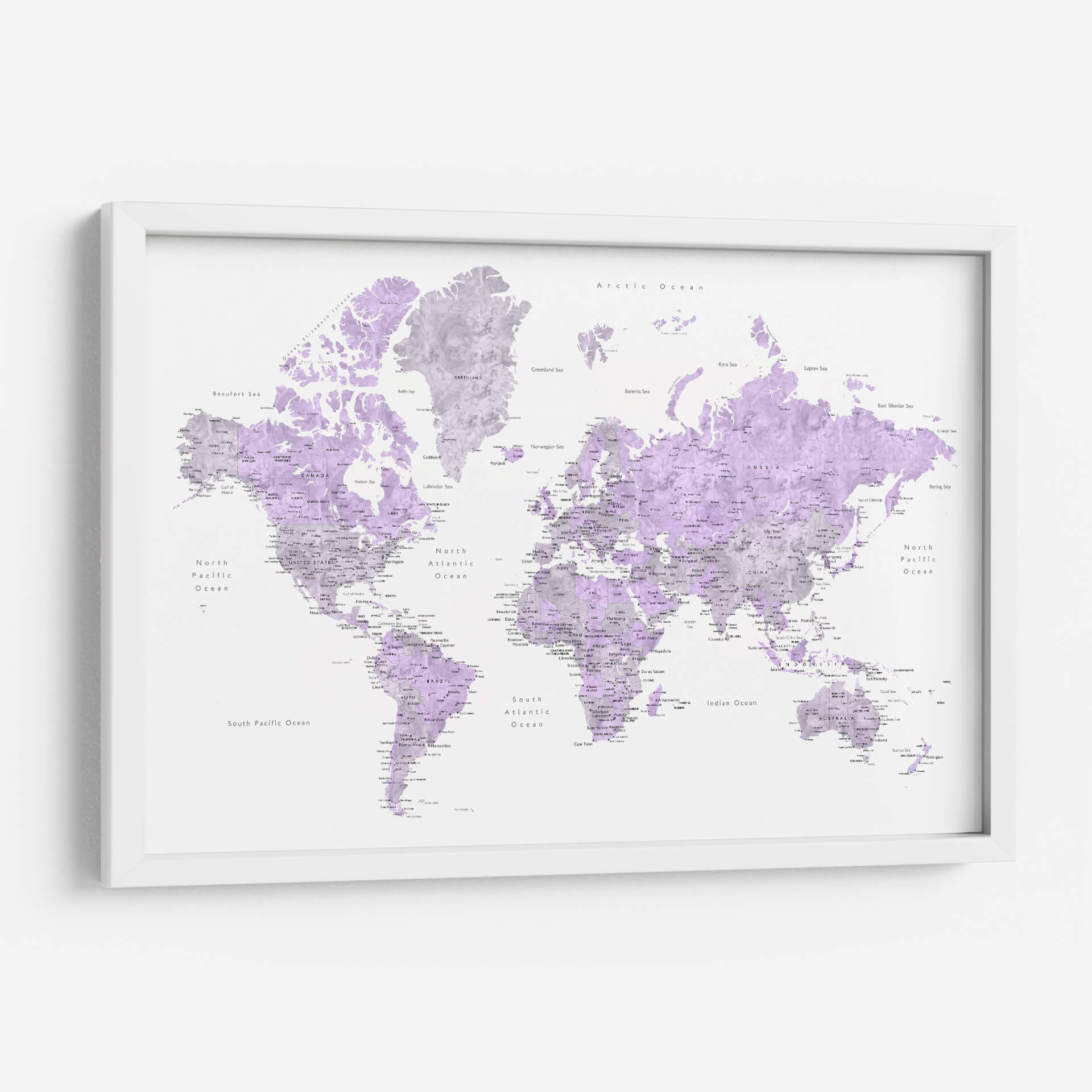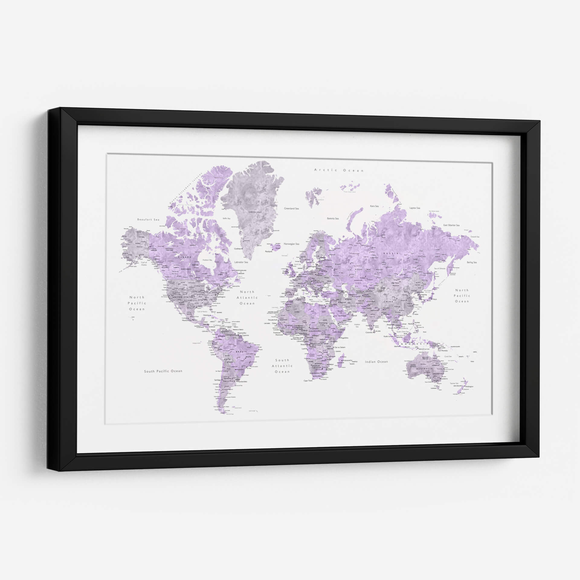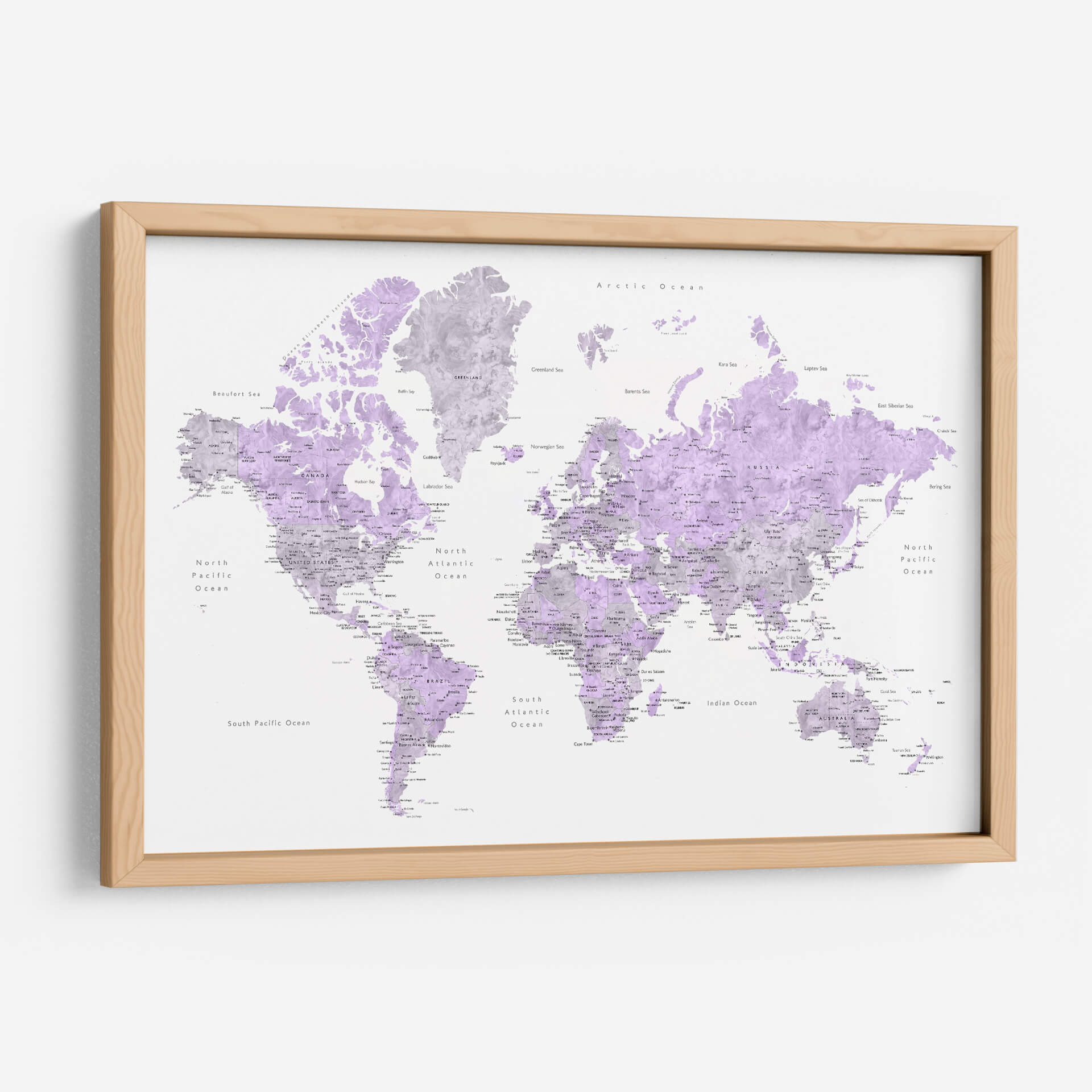 Transforma tu espacio con este cautivador cuadro decorativo de mapa mundial en acuarela, una pieza que evoca el espíritu de la exploración y la conexión global. La obra, titulada "Mapa mundial en acuarela con ciudades Tanya" del artista Rosana Laiz Blursbyai, presenta una interpretación artística única del planeta, donde los continentes y océanos se despliegan en una delicada paleta de tonos lila y grises suaves. Cada ciudad está sutilmente marcada, invitando a la contemplación de viajes pasados o futuros y añadiendo un toque de sofisticación a cualquier decoración. La técnica de acuarela aporta una fluidez y una profundidad sutil, creando una atmósfera de calma y serenidad. Este mapa mundial es ideal para inspirar conversaciones y añadir un punto de interés visual a tu hogar u oficina, ya sea en un estudio moderno, una sala de estar acogedora o un dormitorio tranquilo. Su diseño versátil se integra fácilmente con diversos estilos decorativos, desde el minimalista hasta el contemporáneo, convirtiéndolo en una elección perfecta para los amantes de la geografía, los viajeros y aquellos que buscan una pieza de arte con significado y estilo.