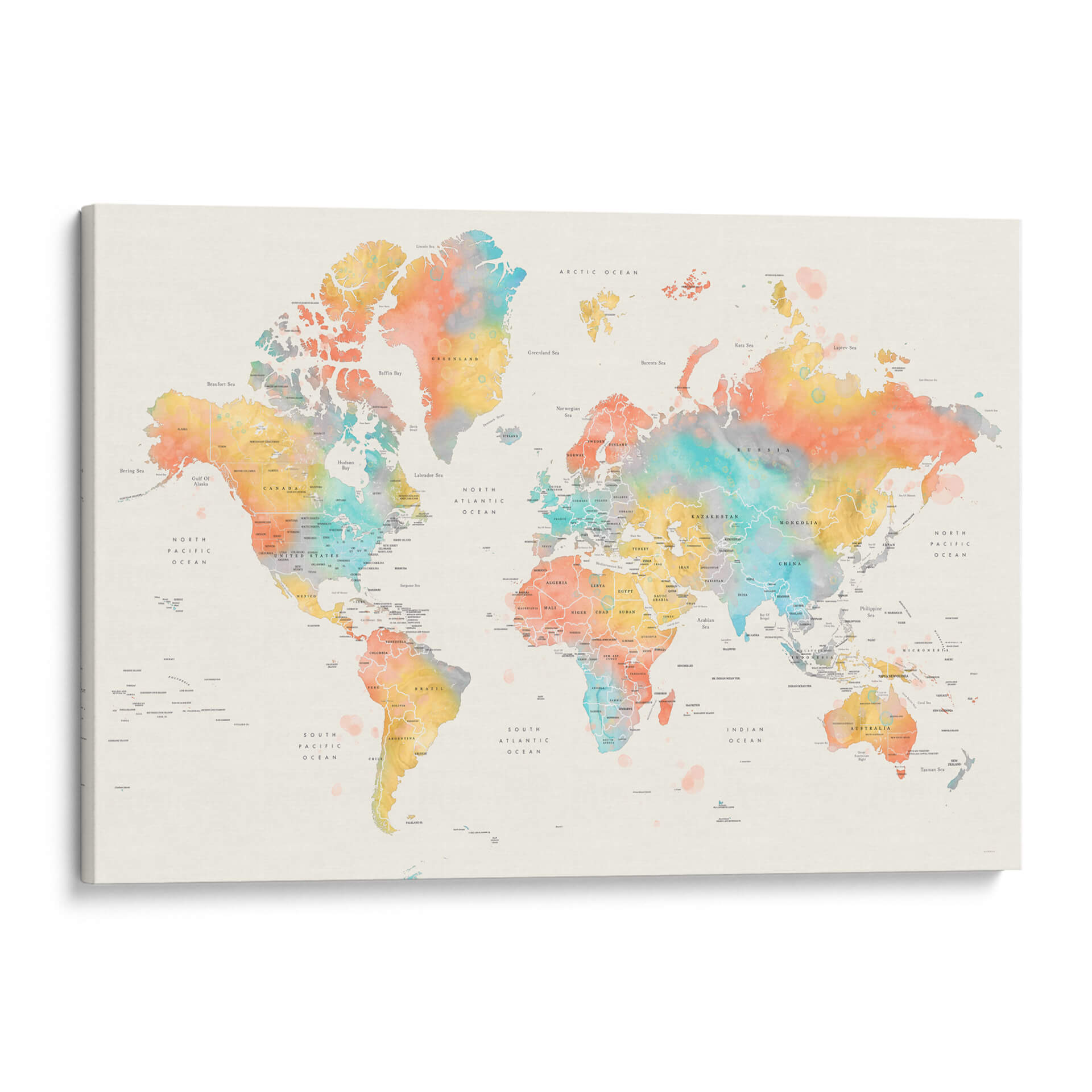 Transforma tu espacio con este cautivador mapa mundial en acuarela, una obra de arte que combina la geografía con una vibrante expresión artística. Cada país está representado con delicadas pinceladas de acuarela, creando un efecto etéreo y dinámico. La paleta de colores, que transita suavemente entre tonos cálidos como el coral y el amarillo, y fríos como el azul y el verde, aporta una sensación de armonía y vitalidad. La técnica de acuarela difuminada evoca una sensación de fluidez y movimiento, como si el mundo mismo estuviera vivo. Ideal para aulas, oficinas o salas de estar modernas, este cuadro decorativo es una invitación a la exploración y al conocimiento. Su estilo contemporáneo y su diseño geográfico lo convierten en una pieza focal que estimula la conversación y la imaginación, aportando un toque de sofisticación y cultura a cualquier ambiente. Es una pieza inspiradora para soñadores, viajeros y amantes del diseño que buscan rodearse de belleza y conocimiento.