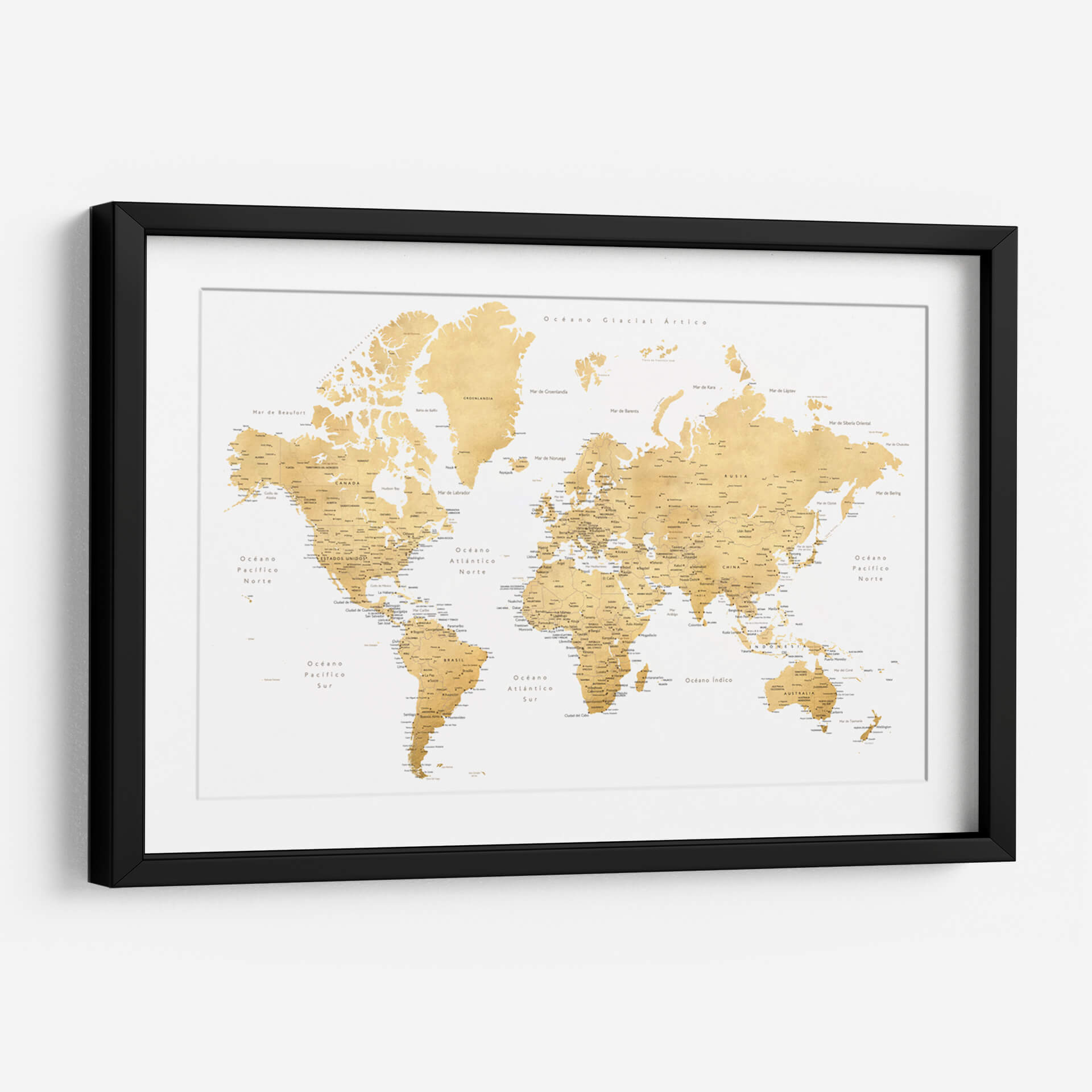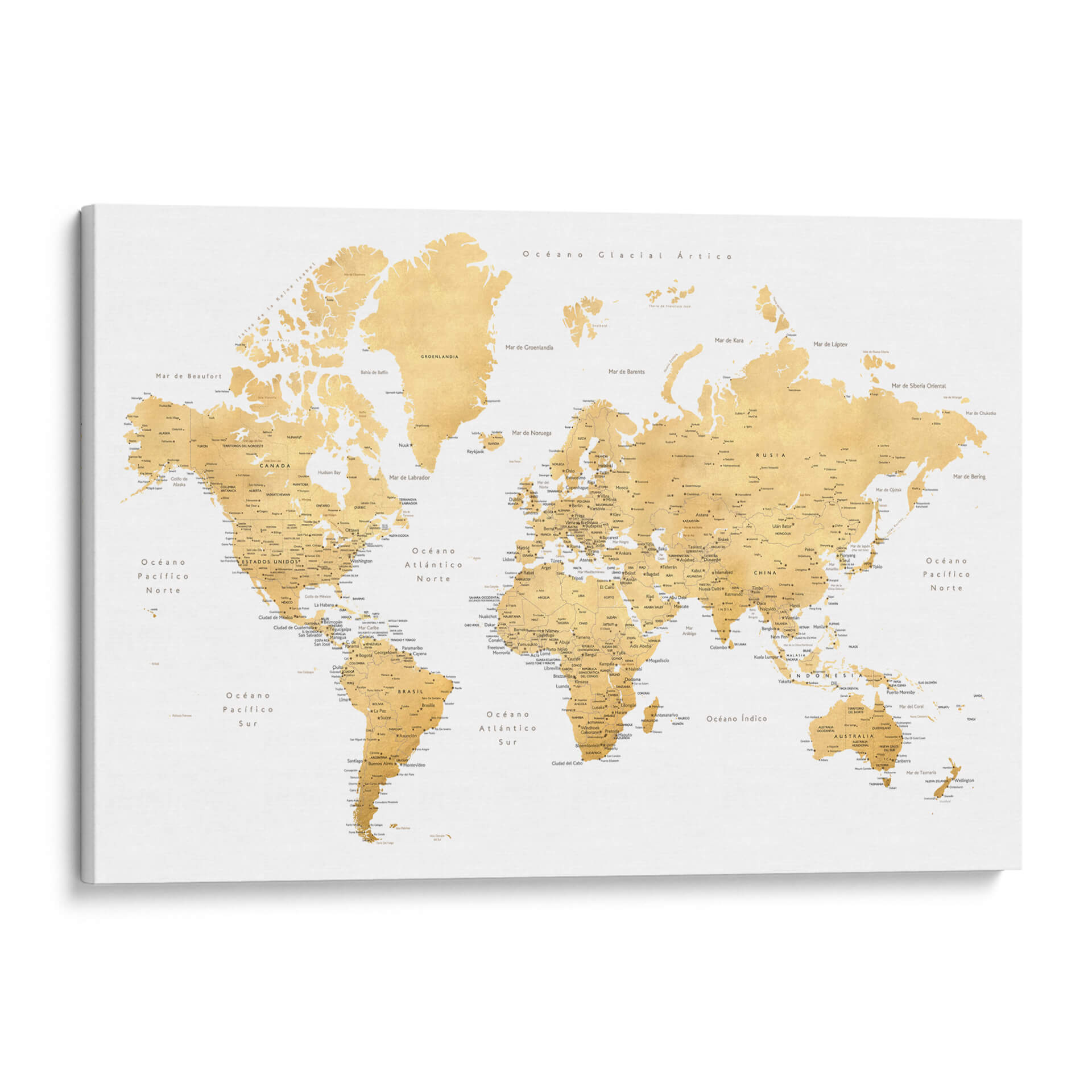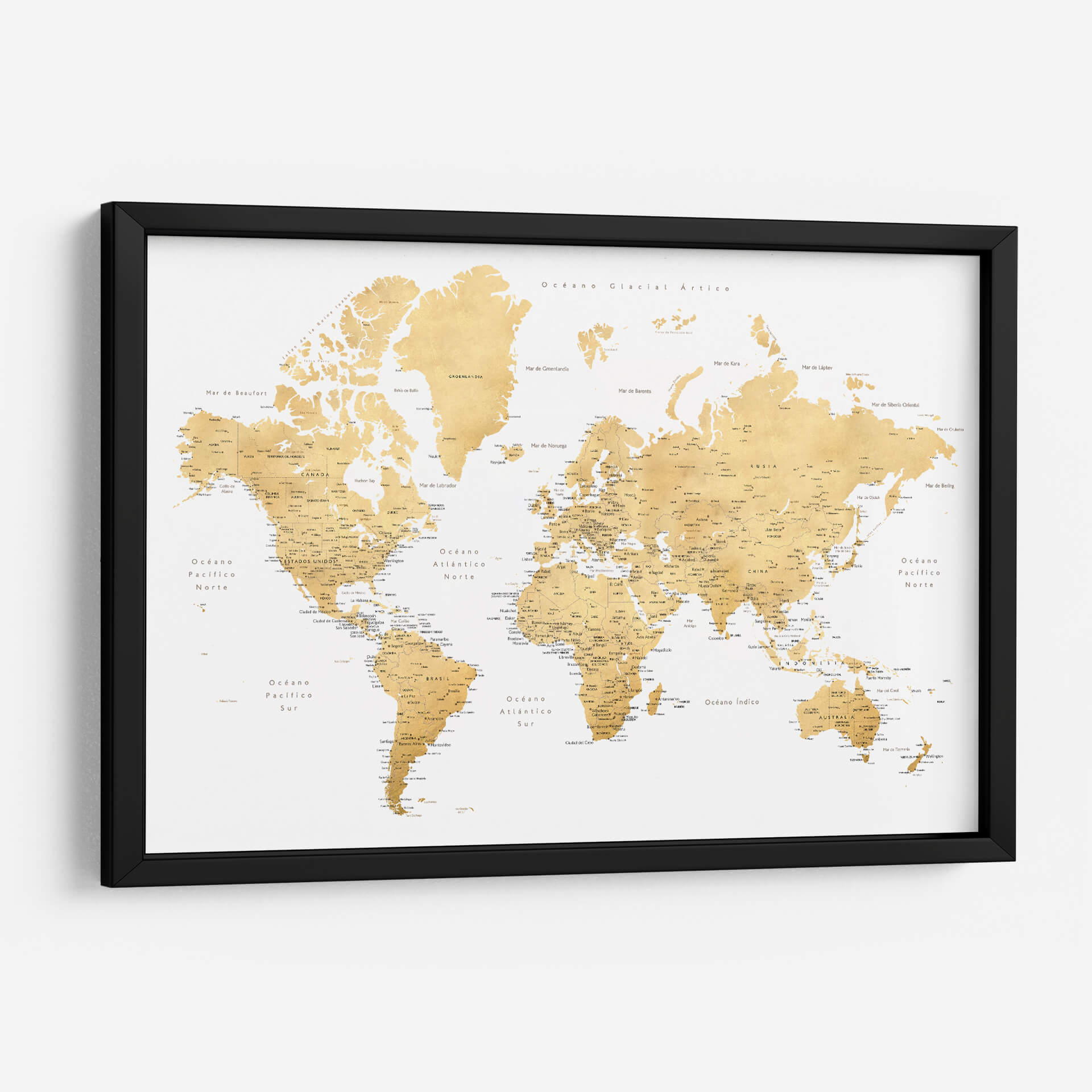 Embárcate en un viaje visual alrededor del globo con este exquisito cuadro decorativo de mapa mundial, titulado 'Mapa mundial en español Rossie' por Rosana Laiz Blursbyai. Esta pieza captura la esencia de la exploración y el descubrimiento con una paleta de colores cálidos y dorados que evoca un sentido de sofisticación y calidez. El diseño, inspirado en mapas clásicos pero con un toque contemporáneo, presenta la geografía mundial de manera clara y detallada, con nombres de países, océanos y ciudades principales en español. La composición equilibrada y la textura sutil de la obra la convierten en un punto focal elegante para cualquier estancia, ya sea una oficina en casa, un estudio o una sala de estar moderna. Ideal para los amantes de la geografía, los viajeros empedernidos o cualquiera que busque añadir un elemento de inspiración y conocimiento a su decoración. Este mapa decorativo no solo embellece tu espacio, sino que también invita a soñar con nuevas aventuras y a conectar con el mundo. Su diseño atemporal y su rica ejecución artística aseguran que será una adición apreciada y comentada en tu hogar u oficina durante años.