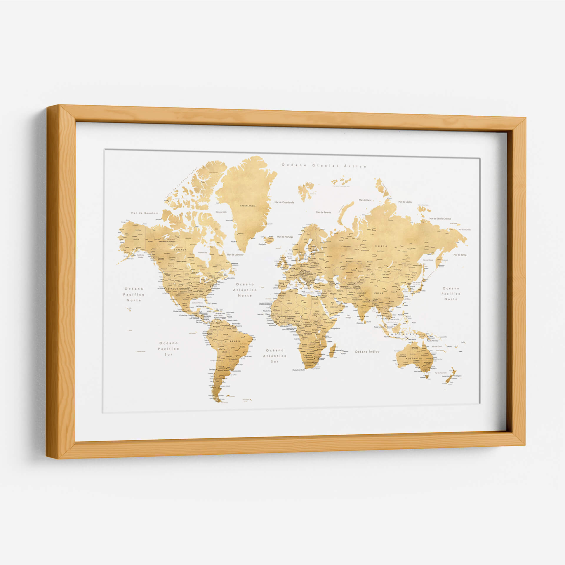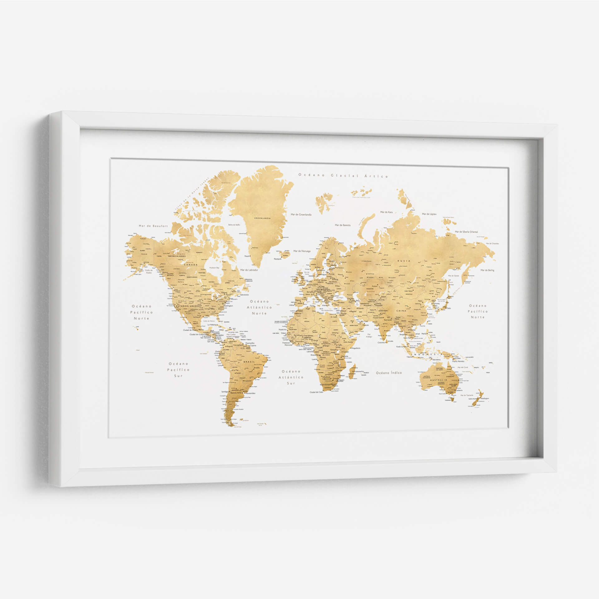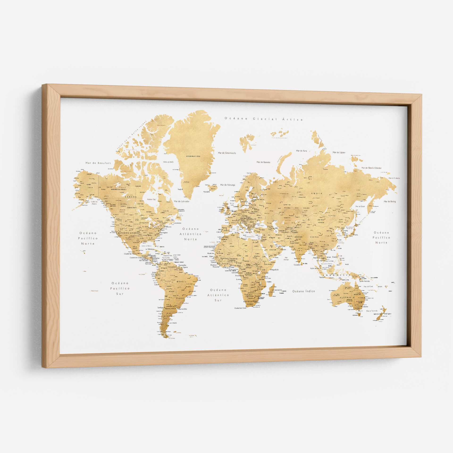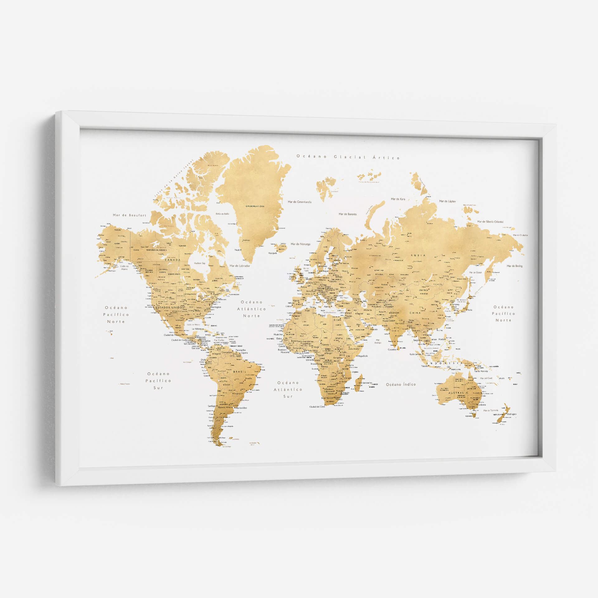 Embárcate en un viaje visual alrededor del globo con este exquisito cuadro decorativo de mapa mundial, titulado 'Mapa mundial en español Rossie' por Rosana Laiz Blursbyai. Esta pieza captura la esencia de la exploración y el descubrimiento con una paleta de colores cálidos y dorados que evoca un sentido de sofisticación y calidez. El diseño, inspirado en mapas clásicos pero con un toque contemporáneo, presenta la geografía mundial de manera clara y detallada, con nombres de países, océanos y ciudades principales en español. La composición equilibrada y la textura sutil de la obra la convierten en un punto focal elegante para cualquier estancia, ya sea una oficina en casa, un estudio o una sala de estar moderna. Ideal para los amantes de la geografía, los viajeros empedernidos o cualquiera que busque añadir un elemento de inspiración y conocimiento a su decoración. Este mapa decorativo no solo embellece tu espacio, sino que también invita a soñar con nuevas aventuras y a conectar con el mundo. Su diseño atemporal y su rica ejecución artística aseguran que será una adición apreciada y comentada en tu hogar u oficina durante años.