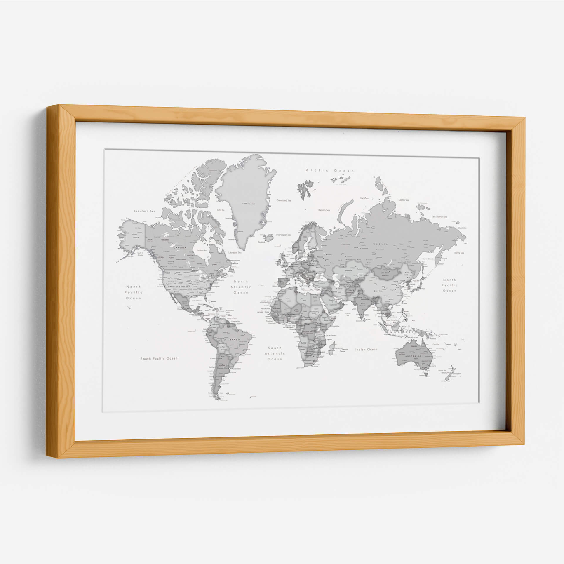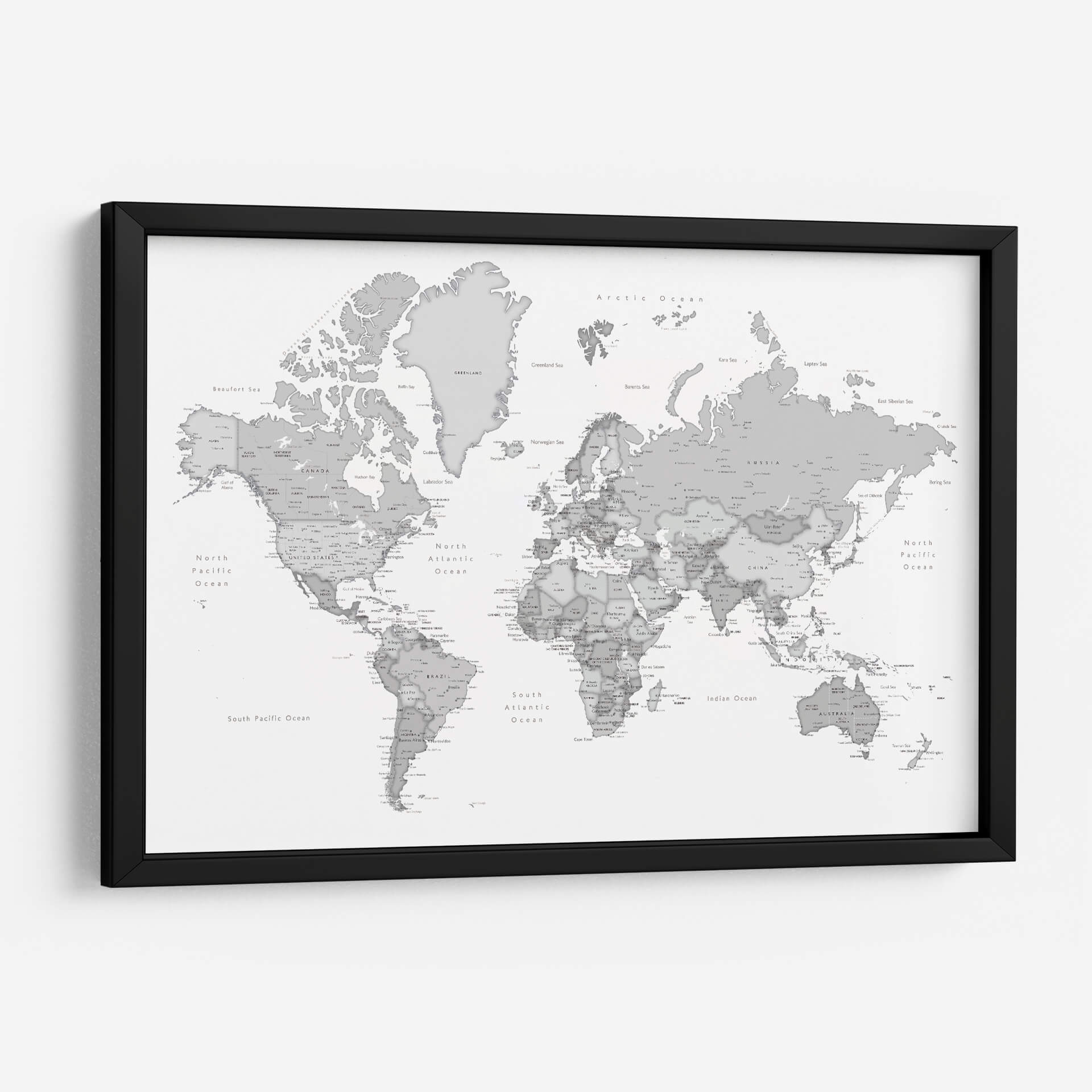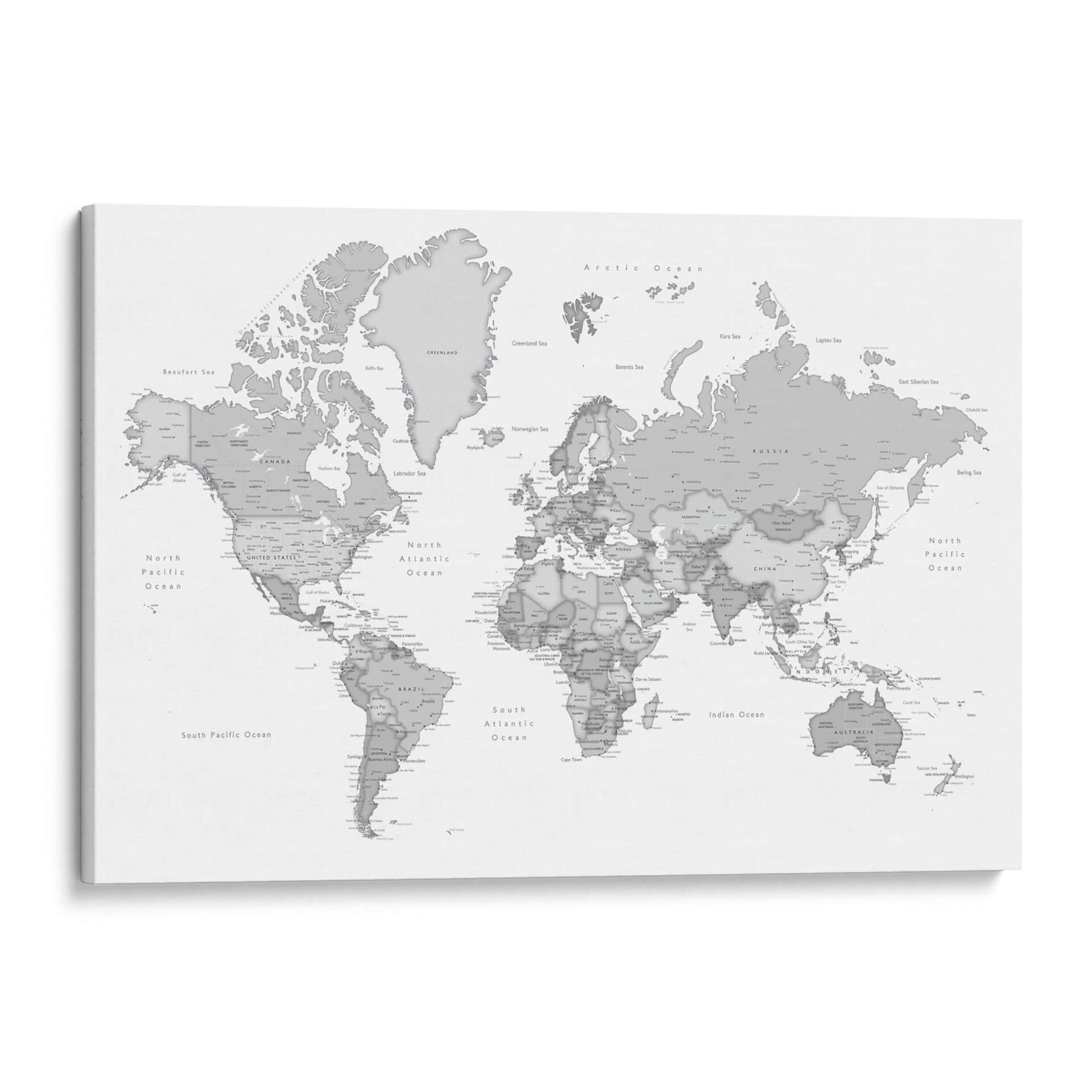 Sumérgete en la exploración global con este cautivador cuadro decorativo de mapa mundi en escala de grises. La obra de Rosana Laiz Blursbyai presenta una representación detallada y estilizada de nuestro planeta, destacando ciudades y continentes con una elegancia sutil. Los tonos neutros de gris, que van desde el blanco roto hasta el carbón profundo, crean una atmósfera de sofisticación y calma, perfecta para complementar cualquier esquema de decoración, desde la más moderna hasta la más clásica. Cada ciudad nombrada en este mapa se convierte en un punto de interés, invitando a la reflexión sobre viajes, geografía y la interconexión global. Este lienzo no es solo una pieza decorativa, sino una ventana al mundo, ideal para oficinas, estudios o salas de estar donde se valora el conocimiento y el diseño depurado. Añade un toque de inspiración cosmopolita y un punto focal intelectual a tus espacios con esta representación artística única del mundo.