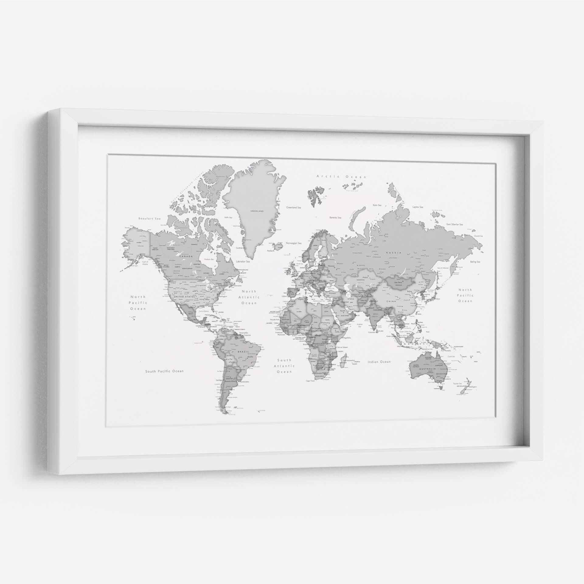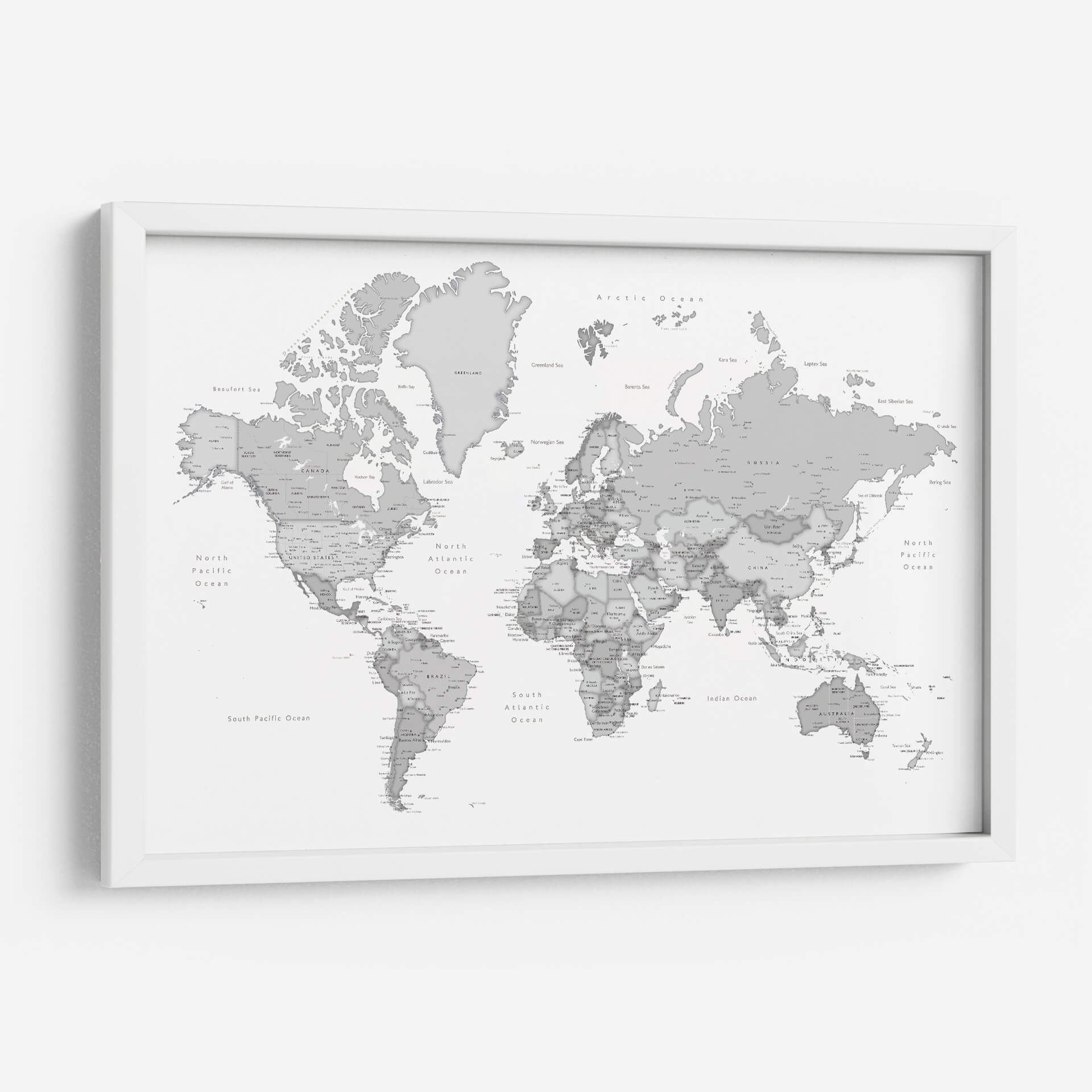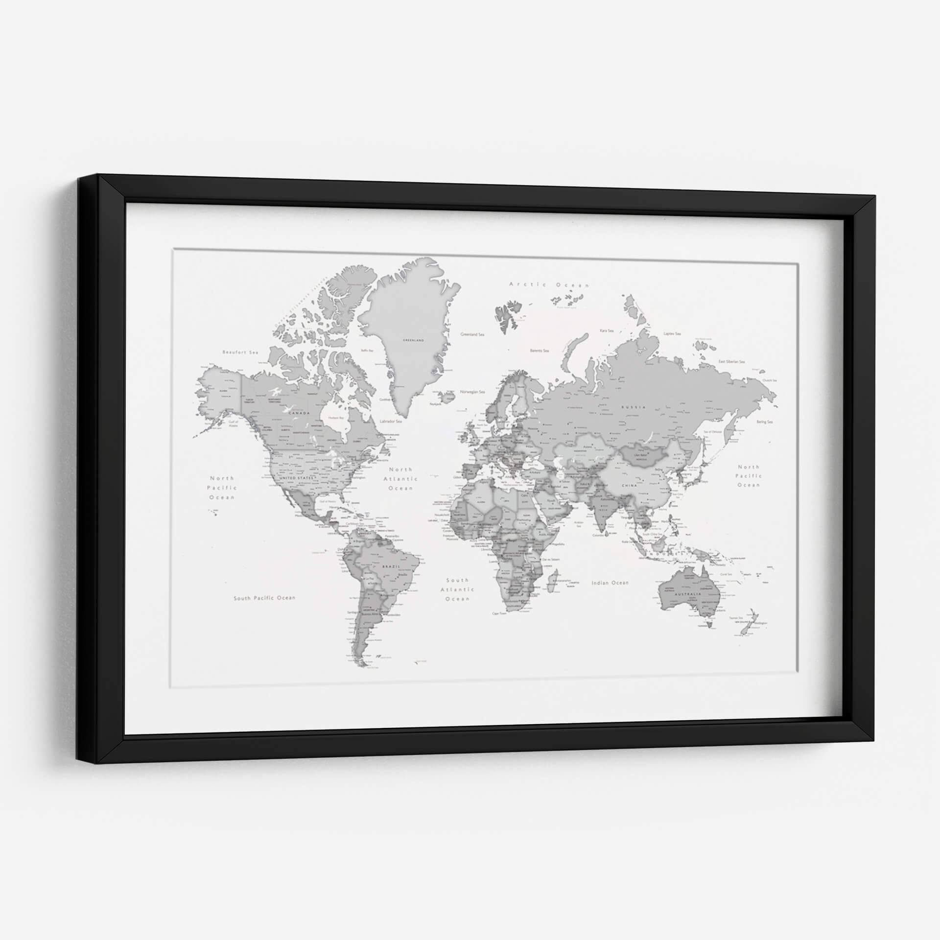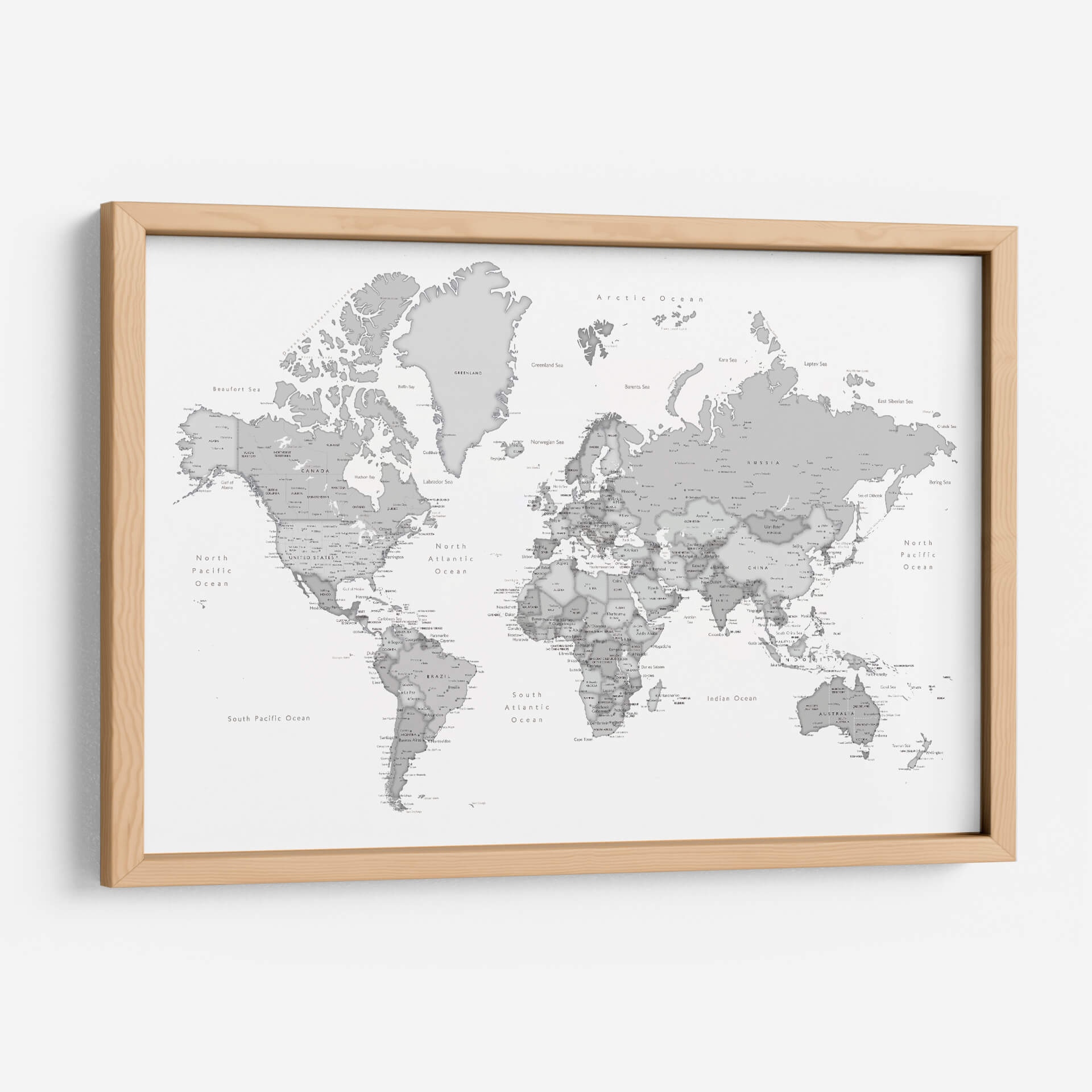 Sumérgete en la exploración global con este cautivador cuadro decorativo de mapa mundi en escala de grises. La obra de Rosana Laiz Blursbyai presenta una representación detallada y estilizada de nuestro planeta, destacando ciudades y continentes con una elegancia sutil. Los tonos neutros de gris, que van desde el blanco roto hasta el carbón profundo, crean una atmósfera de sofisticación y calma, perfecta para complementar cualquier esquema de decoración, desde la más moderna hasta la más clásica. Cada ciudad nombrada en este mapa se convierte en un punto de interés, invitando a la reflexión sobre viajes, geografía y la interconexión global. Este lienzo no es solo una pieza decorativa, sino una ventana al mundo, ideal para oficinas, estudios o salas de estar donde se valora el conocimiento y el diseño depurado. Añade un toque de inspiración cosmopolita y un punto focal intelectual a tus espacios con esta representación artística única del mundo.
